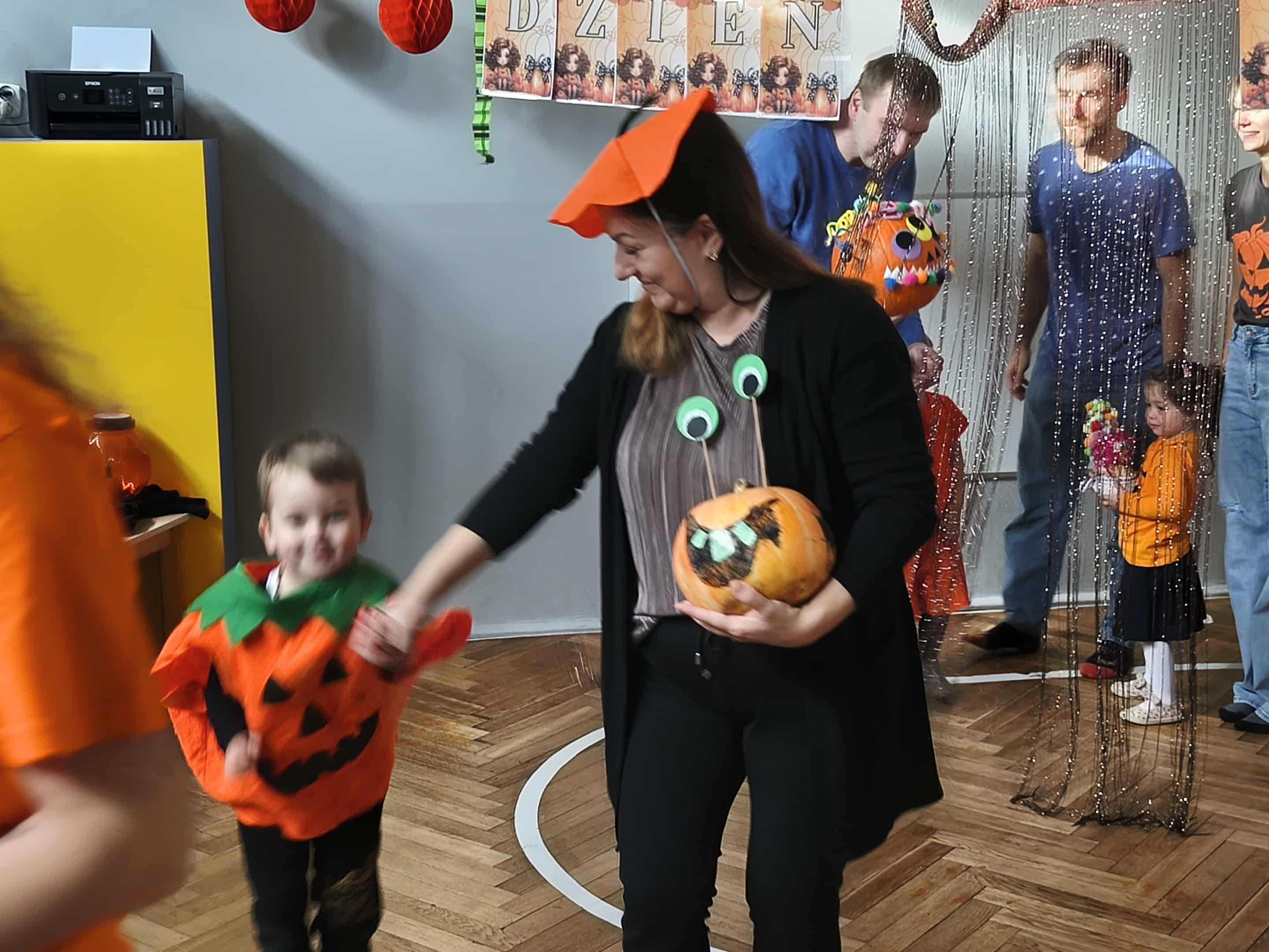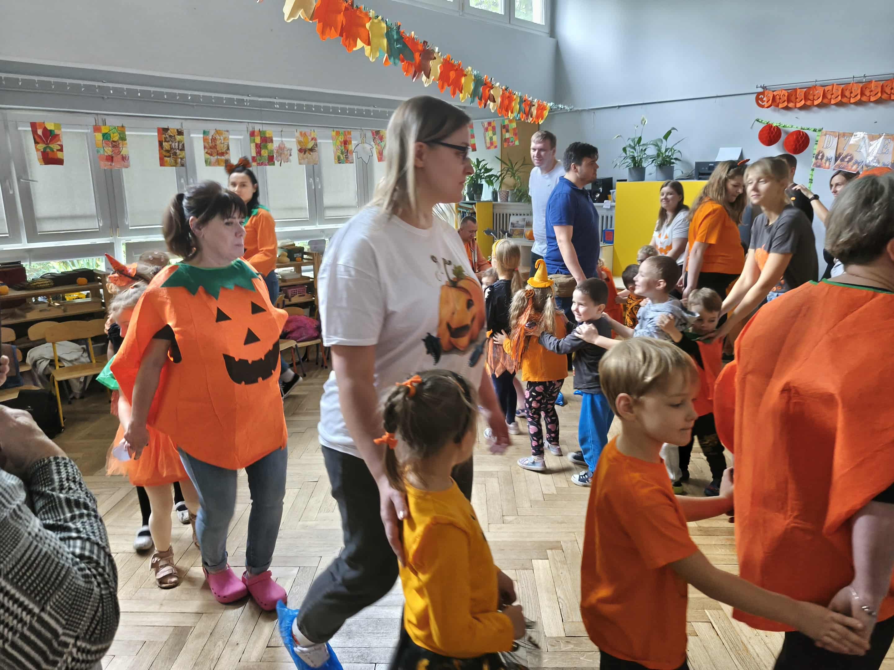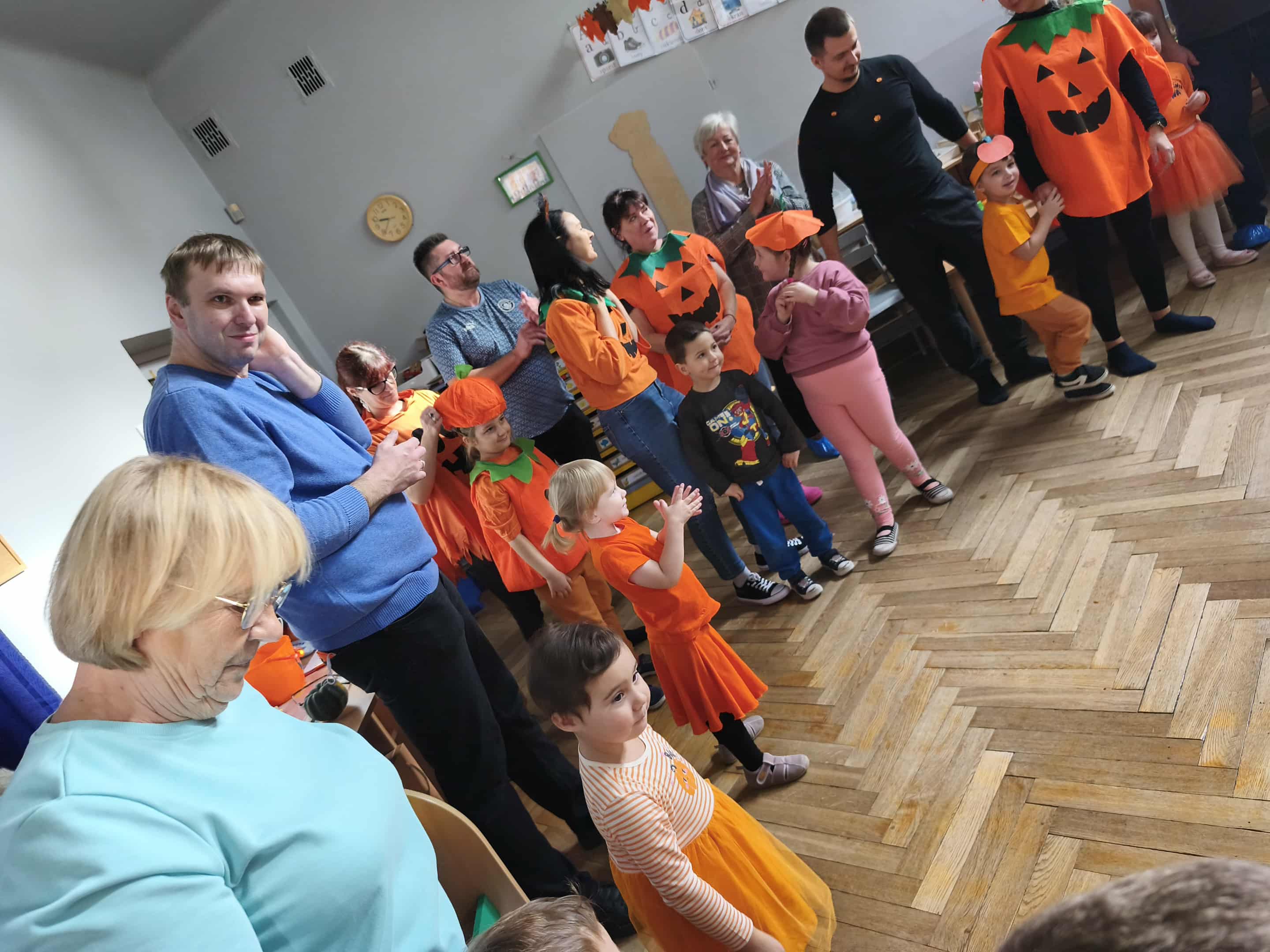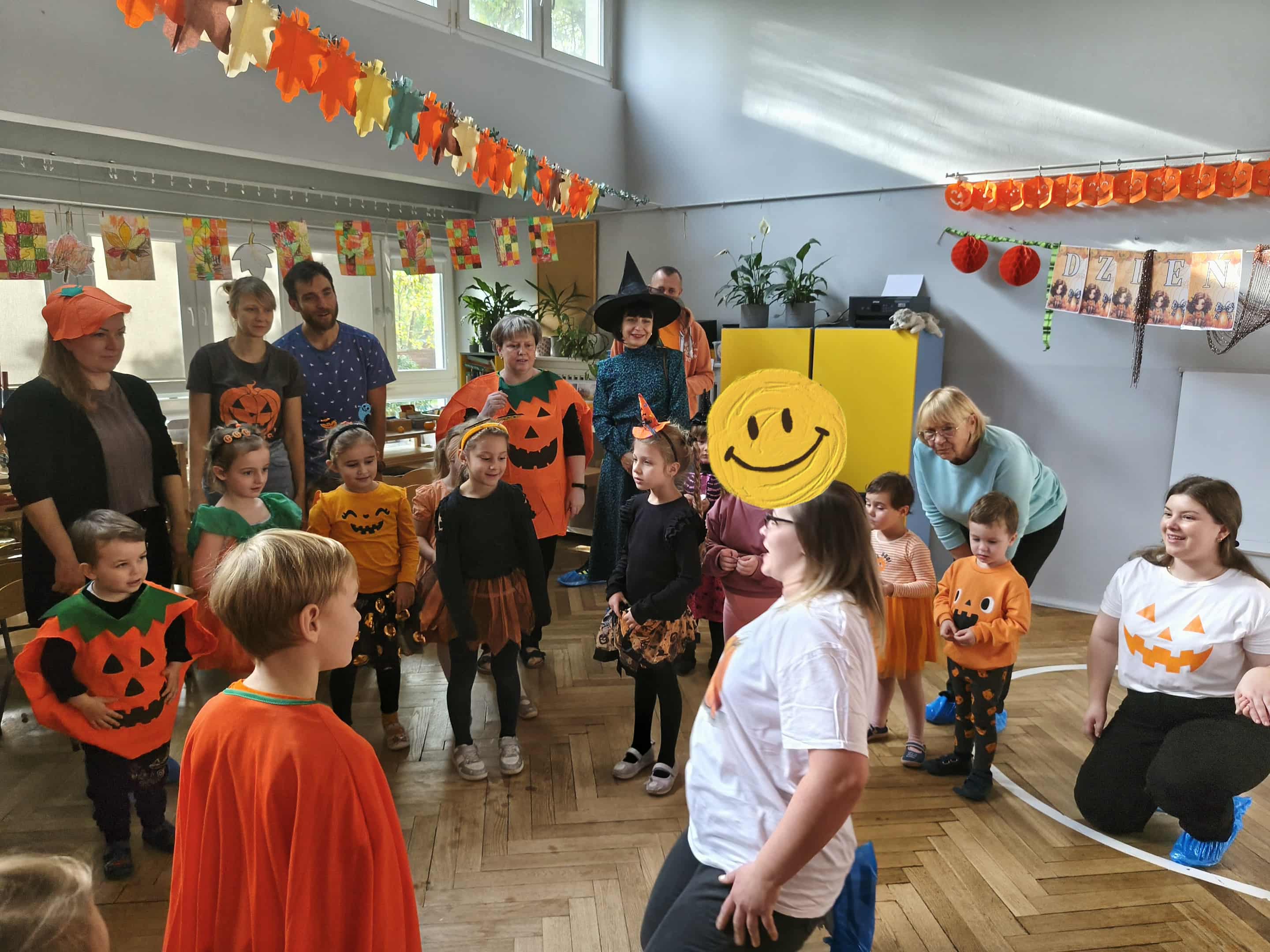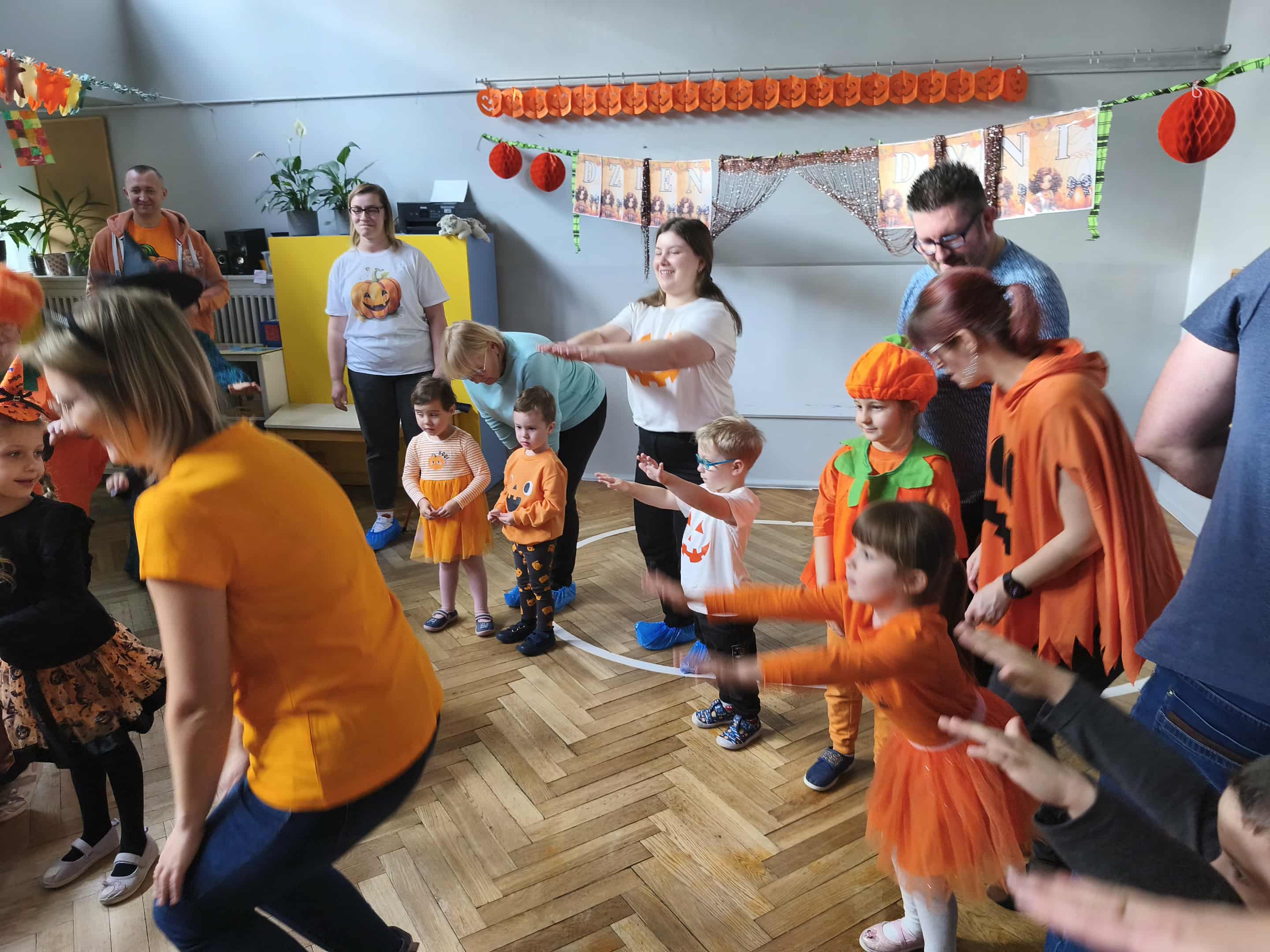 „Cukierek, albo psikus”, „Przeliczamy pestki dyni”, „W ogrodzie stała skrzynia”, itp.. Wszyscy braliśmy udział także w zabawie „Dyniowy pociąg”, który zakończył naszą imprezę. Nie widać było u nikogo smutku, wręcz przeciwnie – każdy był uśmiechnięty i czekał na kolejne zabawy.