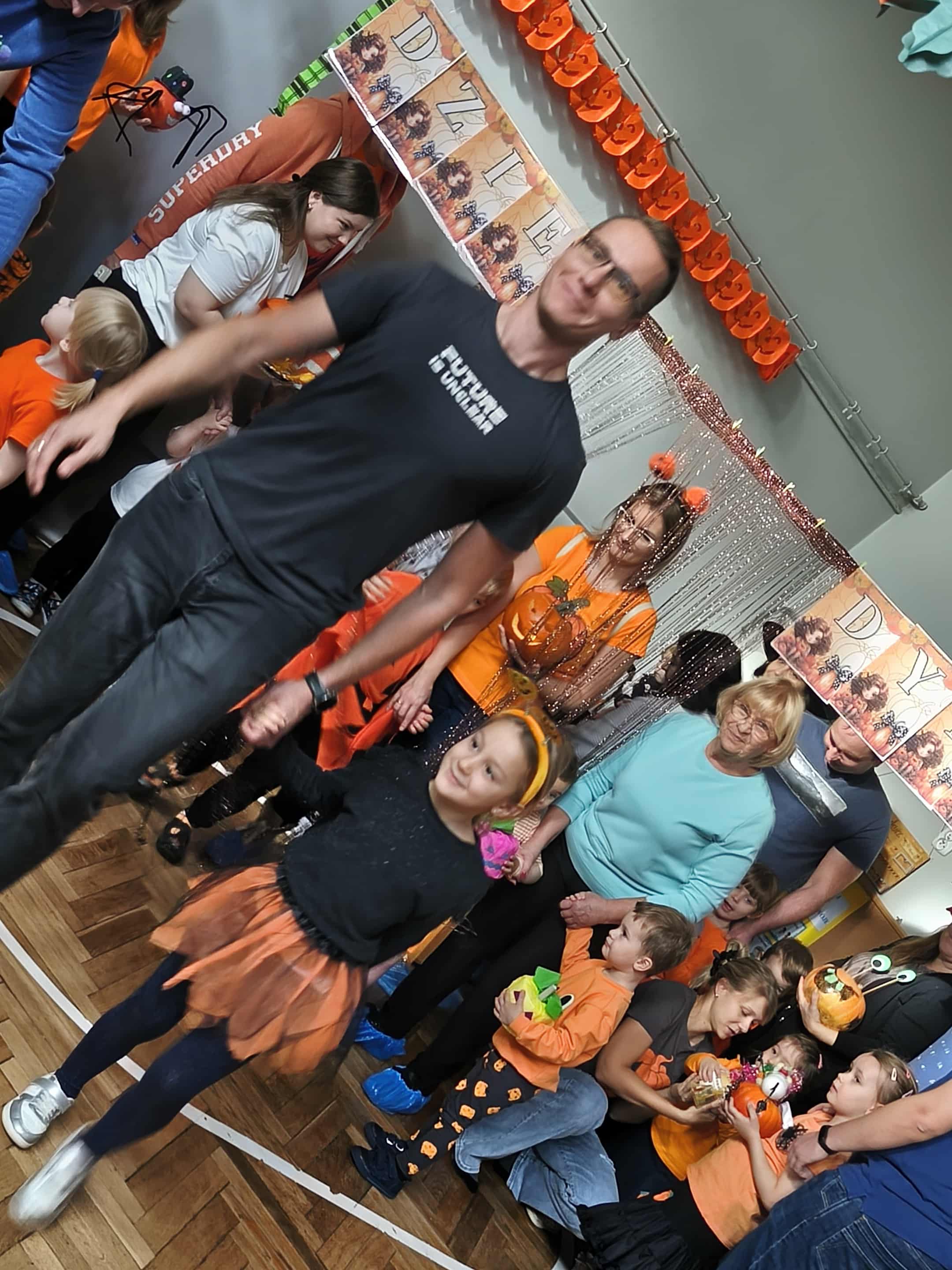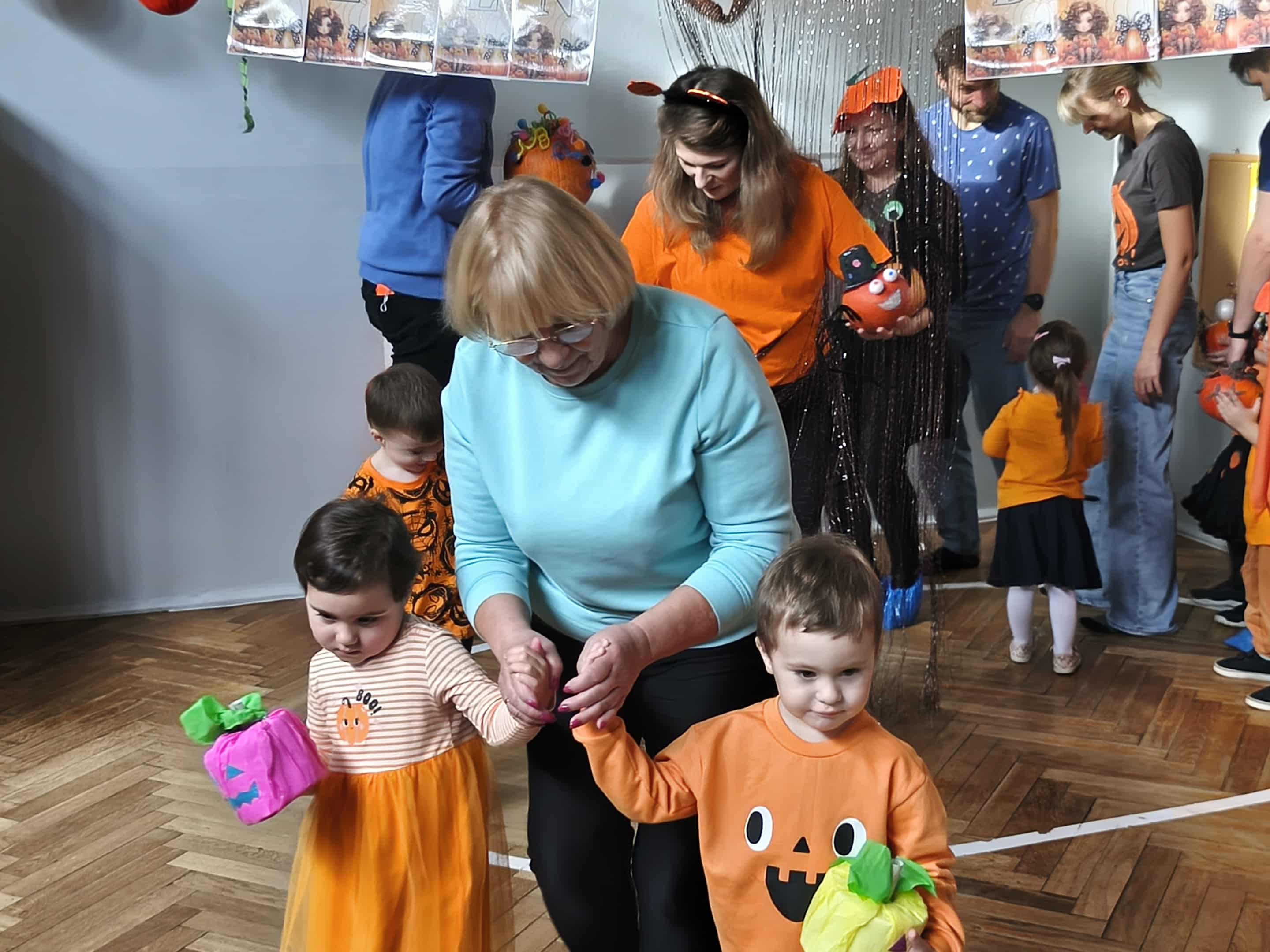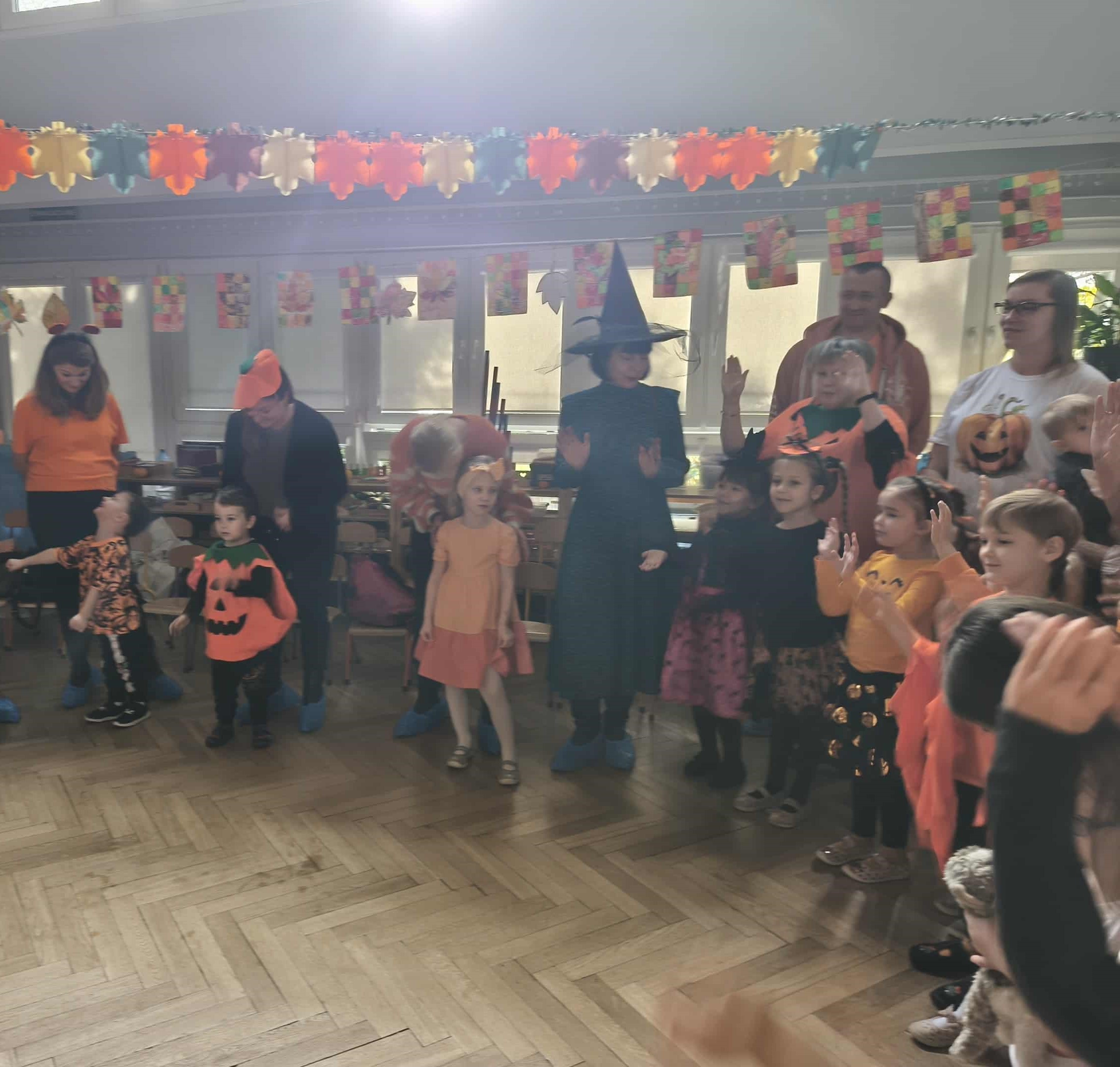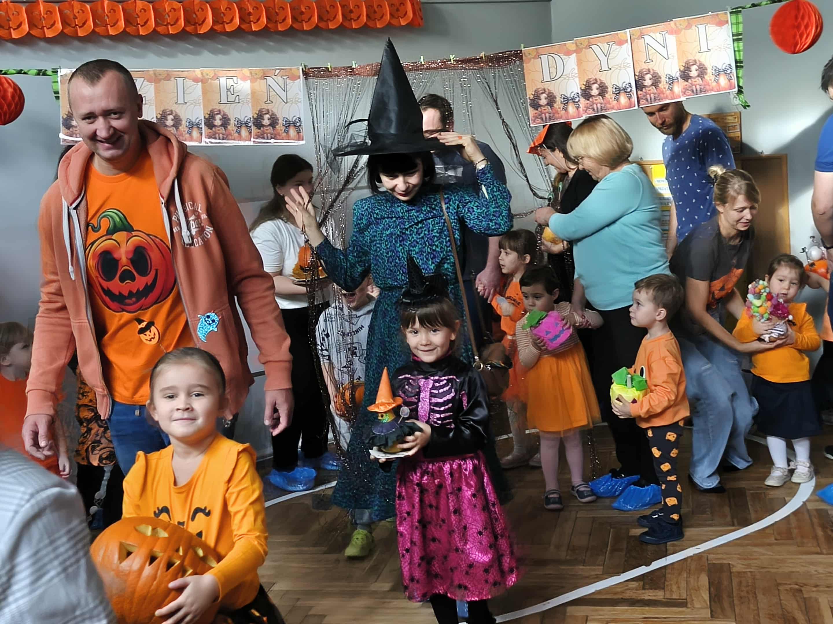 „Cukierek, albo psikus”, „Przeliczamy pestki dyni”, „W ogrodzie stała skrzynia”, itp.. Wszyscy braliśmy udział także w zabawie „Dyniowy pociąg”, który zakończył naszą imprezę. Nie widać było u nikogo smutku, wręcz przeciwnie – każdy był uśmiechnięty i czekał na kolejne zabawy.
