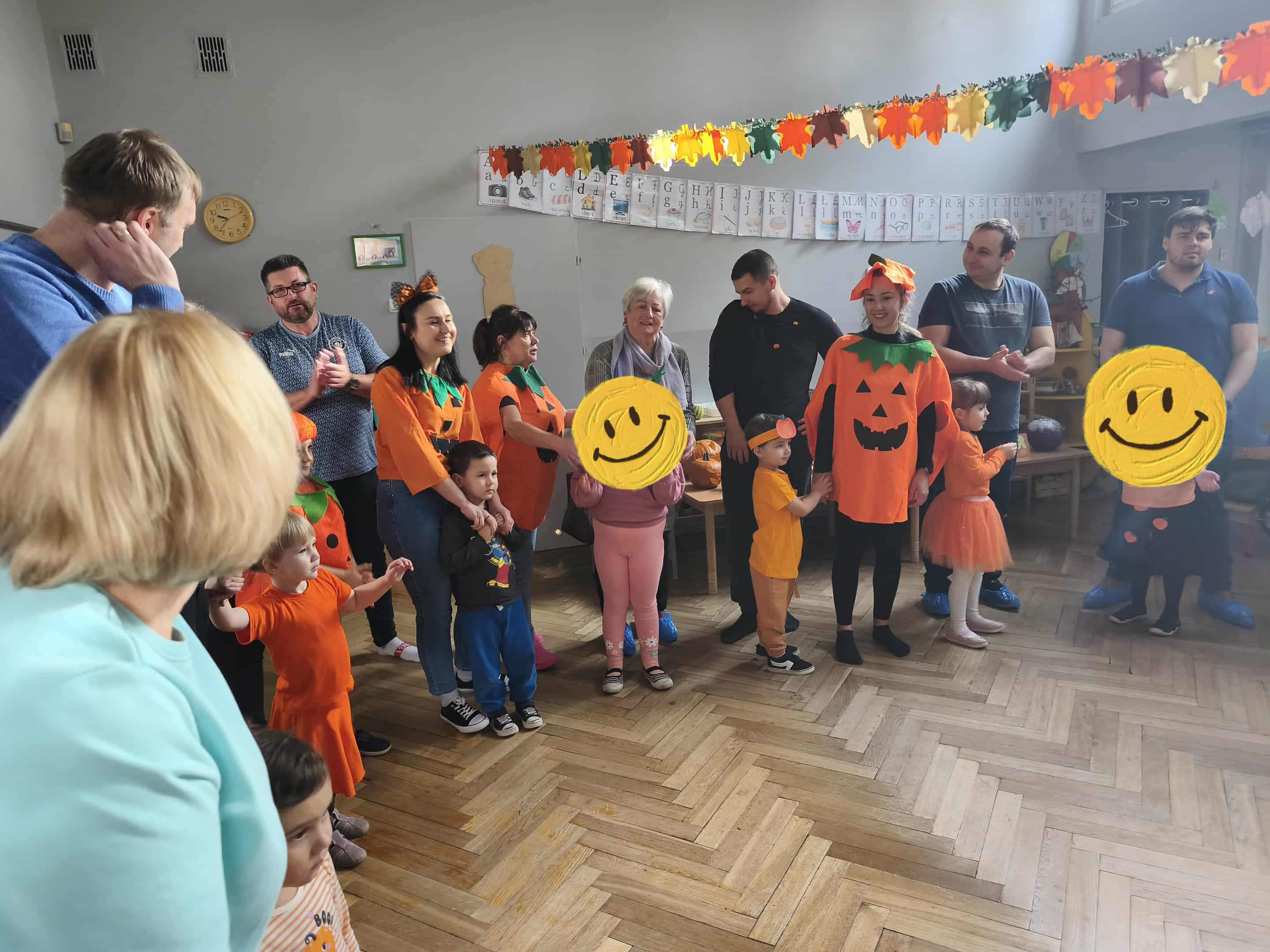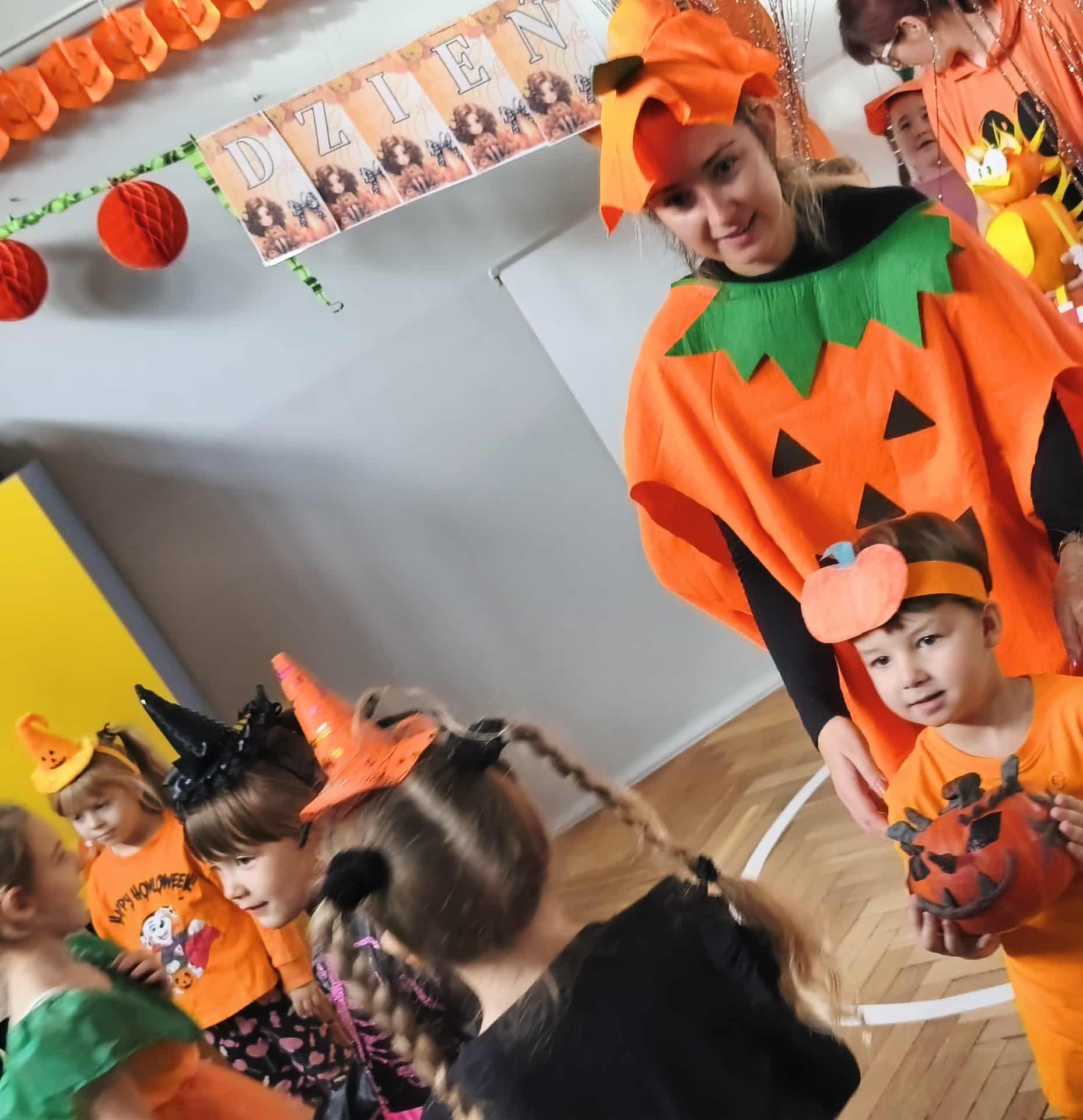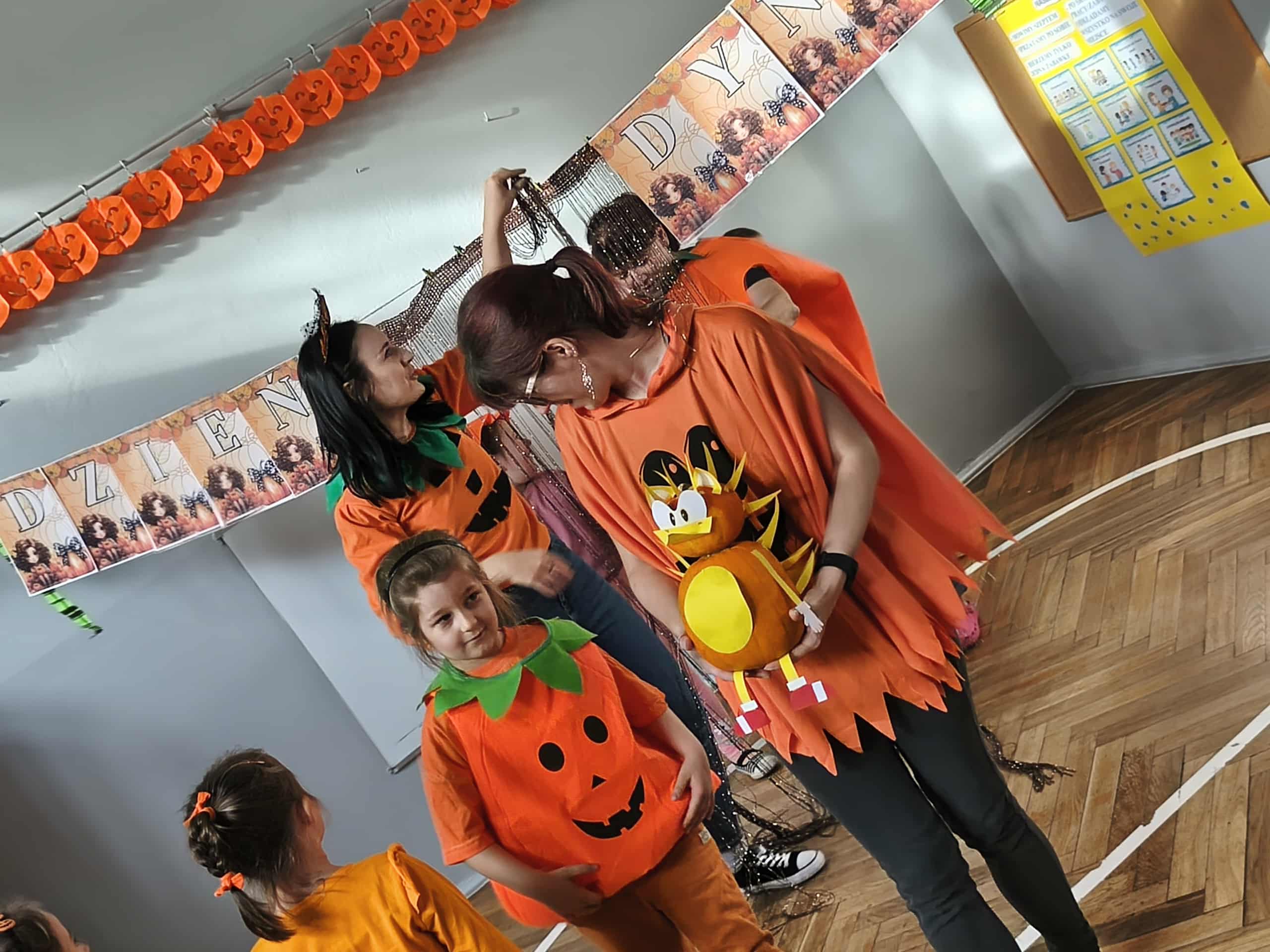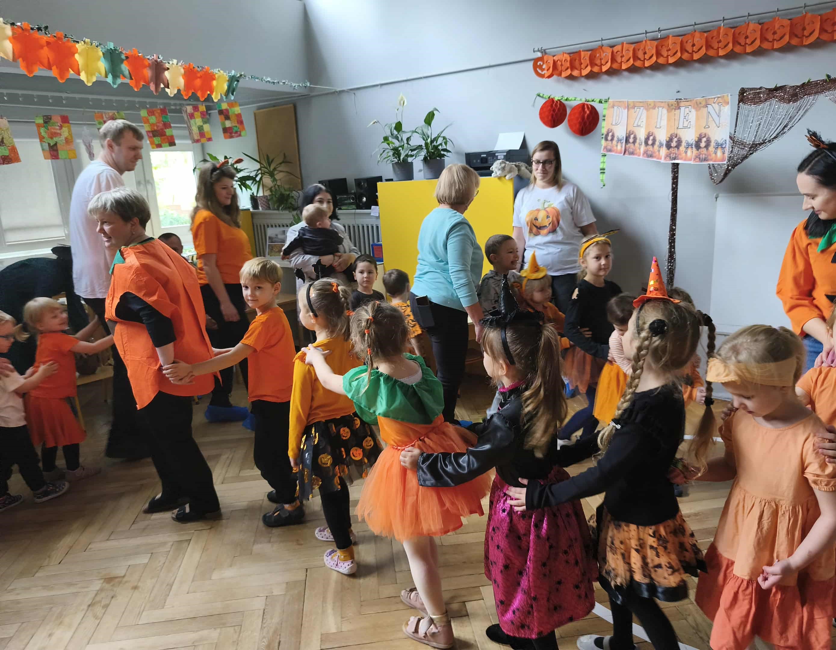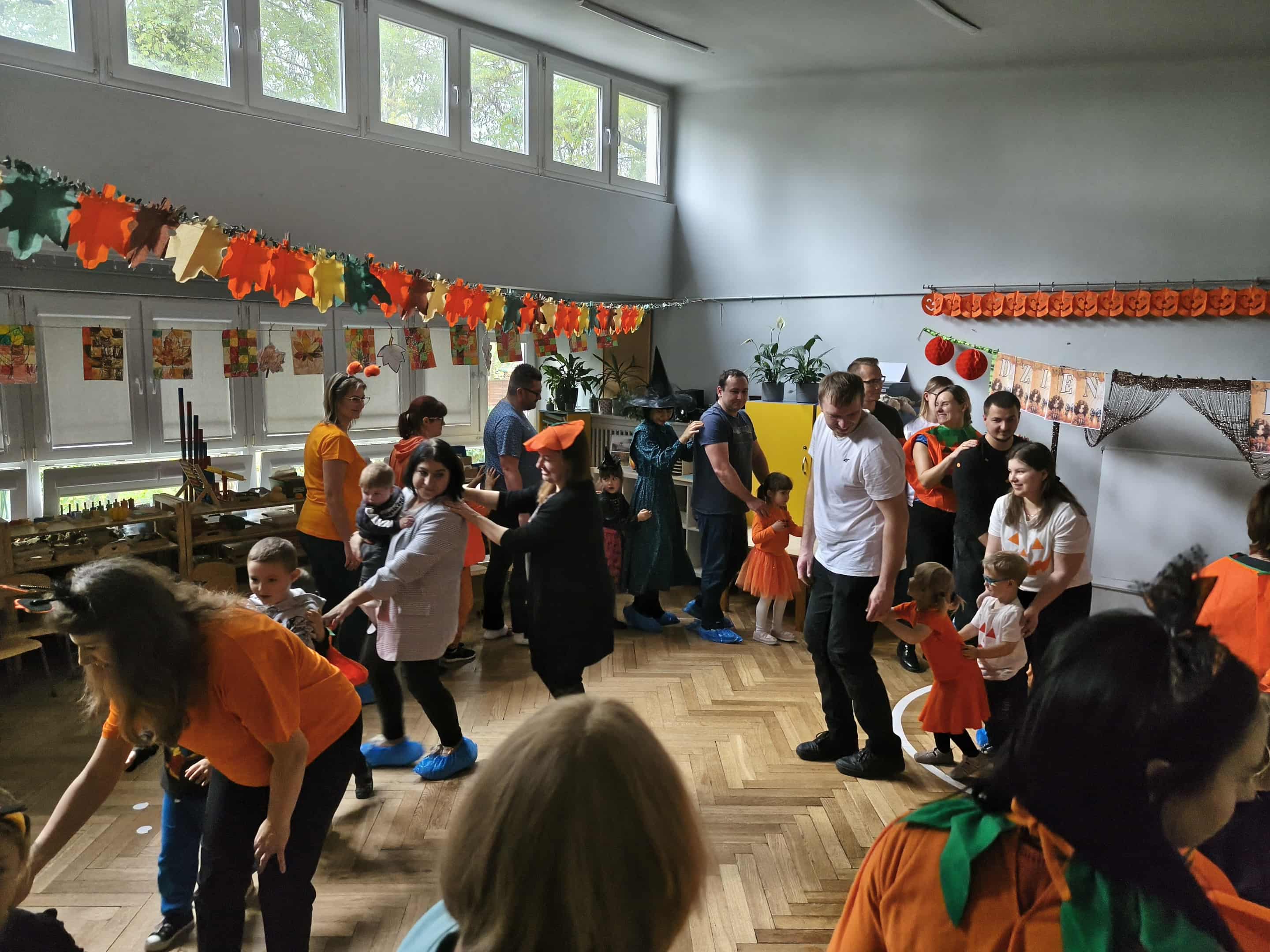 „Cukierek, albo psikus”, „Przeliczamy pestki dyni”, „W ogrodzie stała skrzynia”, itp.. Wszyscy braliśmy udział także w zabawie „Dyniowy pociąg”, który zakończył naszą imprezę. Nie widać było u nikogo smutku, wręcz przeciwnie – każdy był uśmiechnięty i czekał na kolejne zabawy.
