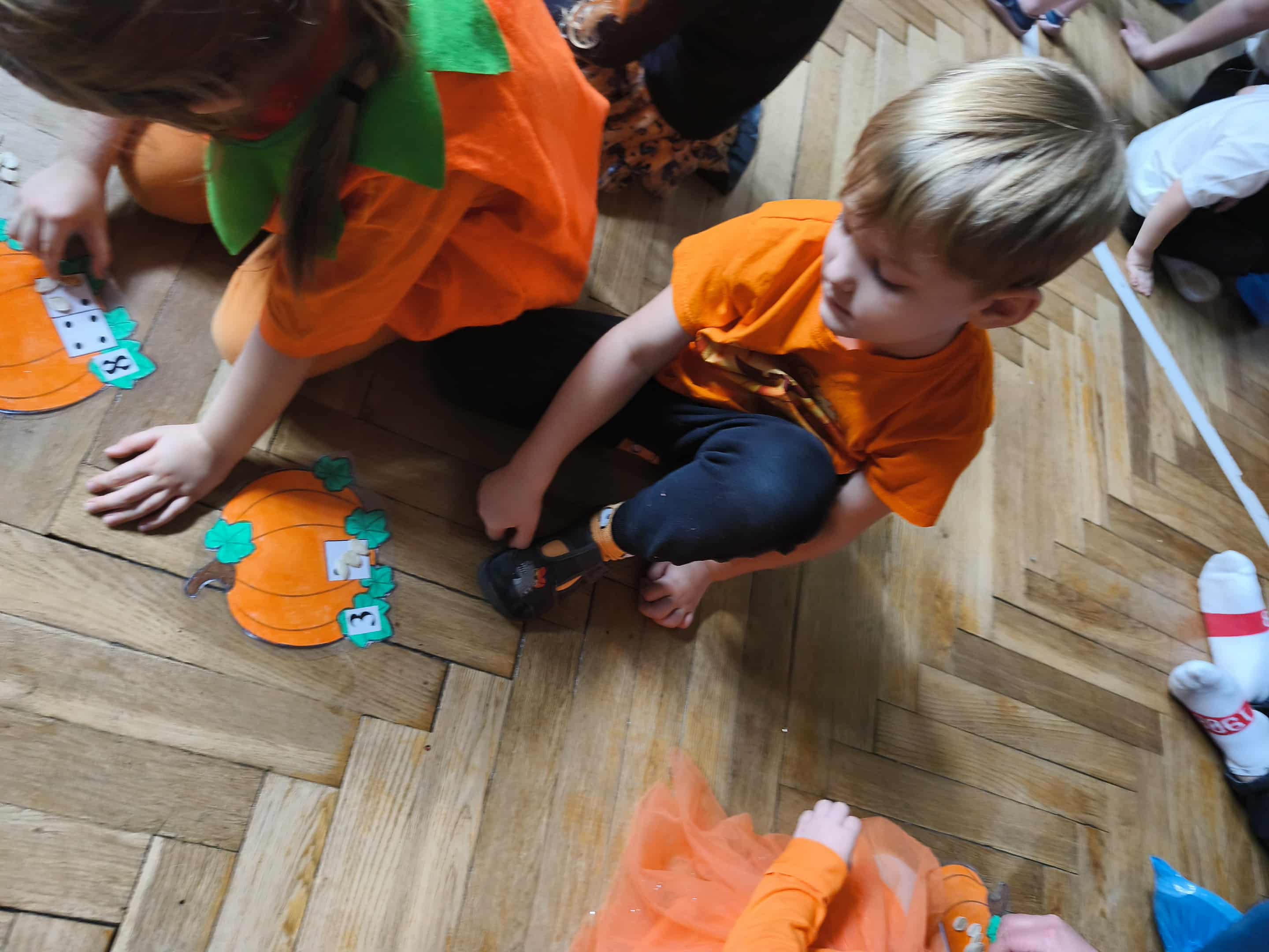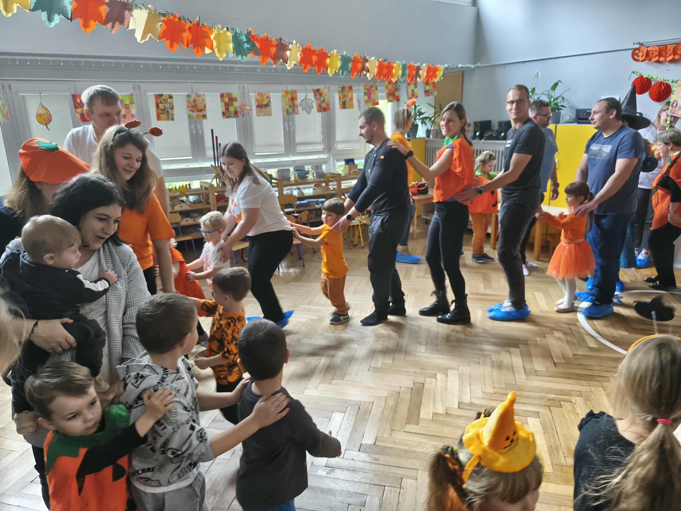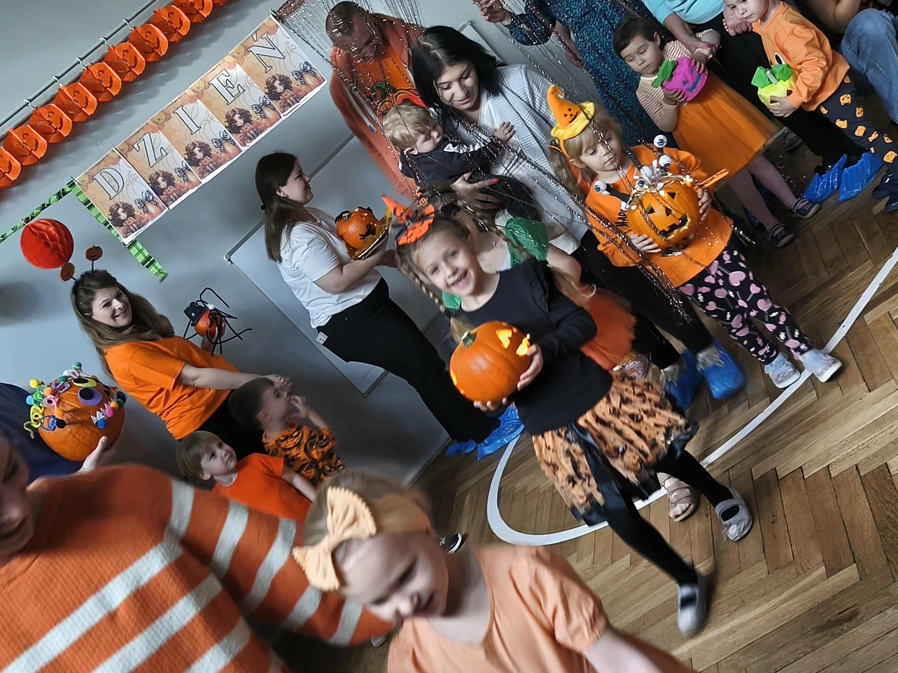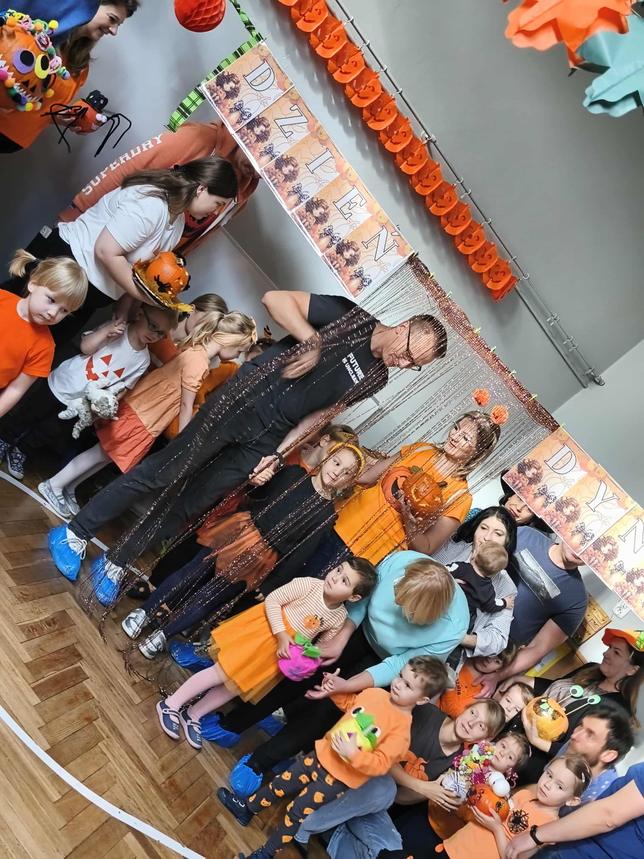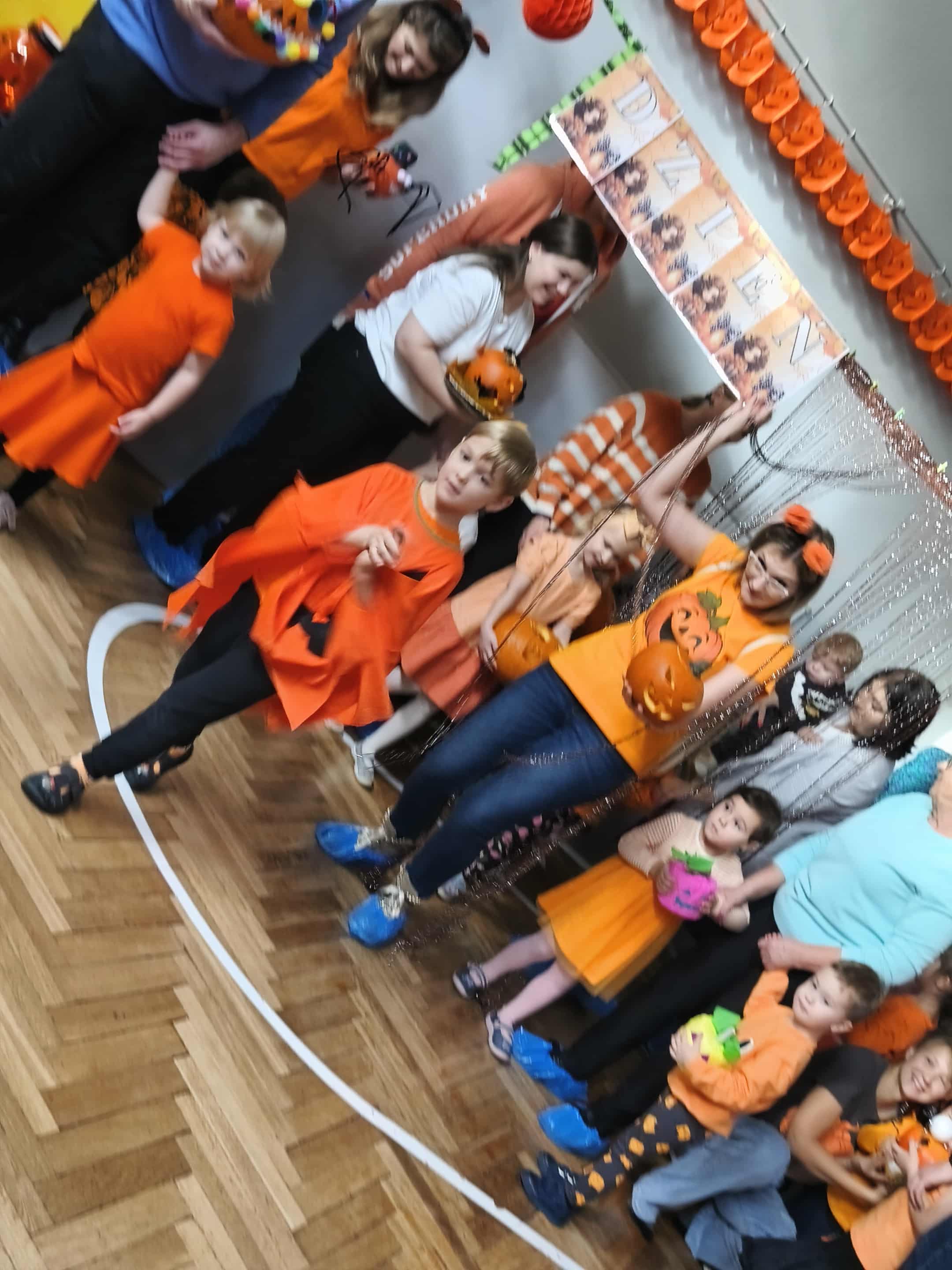 „Cukierek, albo psikus”, „Przeliczamy pestki dyni”, „W ogrodzie stała skrzynia”, itp.. Wszyscy braliśmy udział także w zabawie „Dyniowy pociąg”, który zakończył naszą imprezę. Nie widać było u nikogo smutku, wręcz przeciwnie – każdy był uśmiechnięty i czekał na kolejne zabawy.