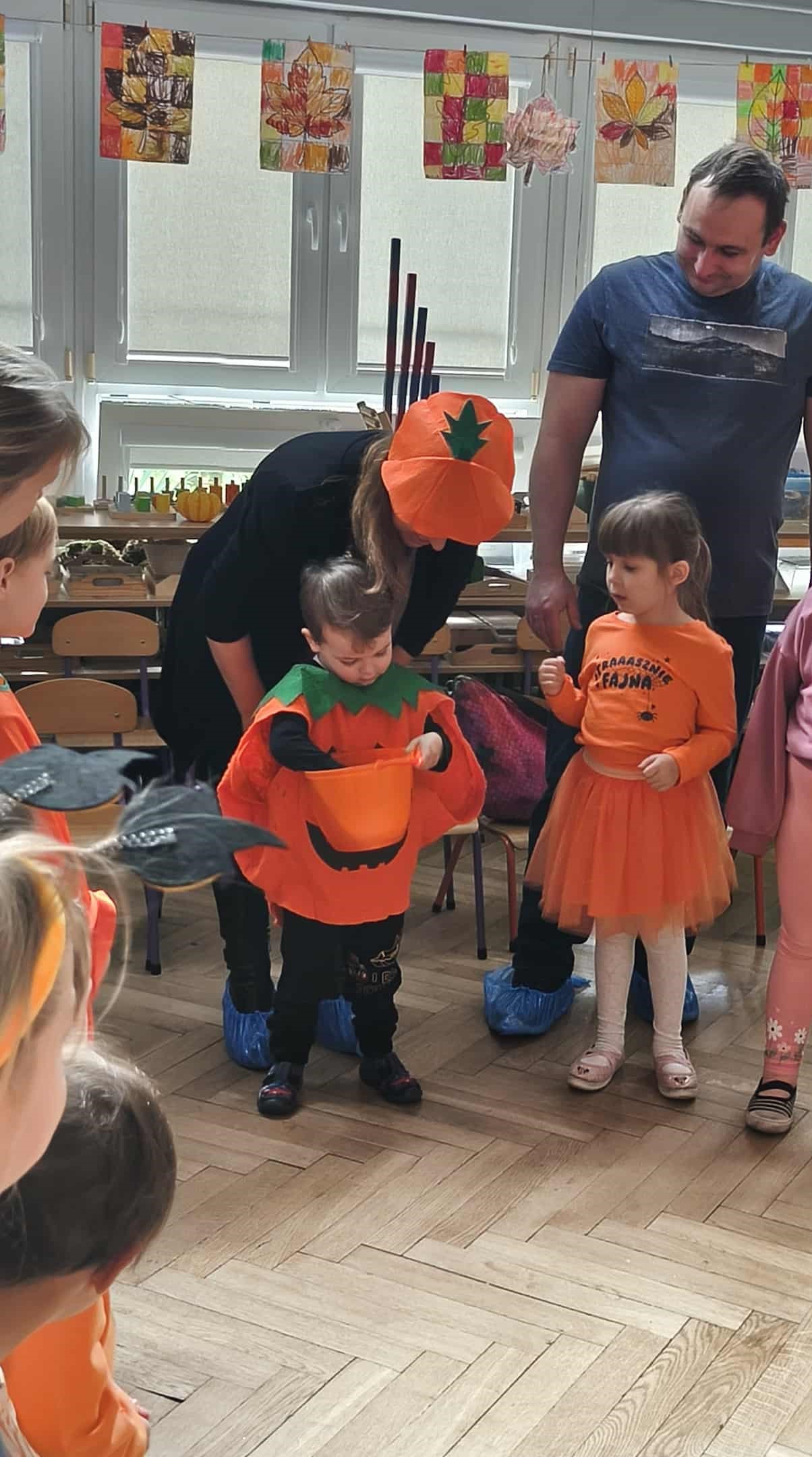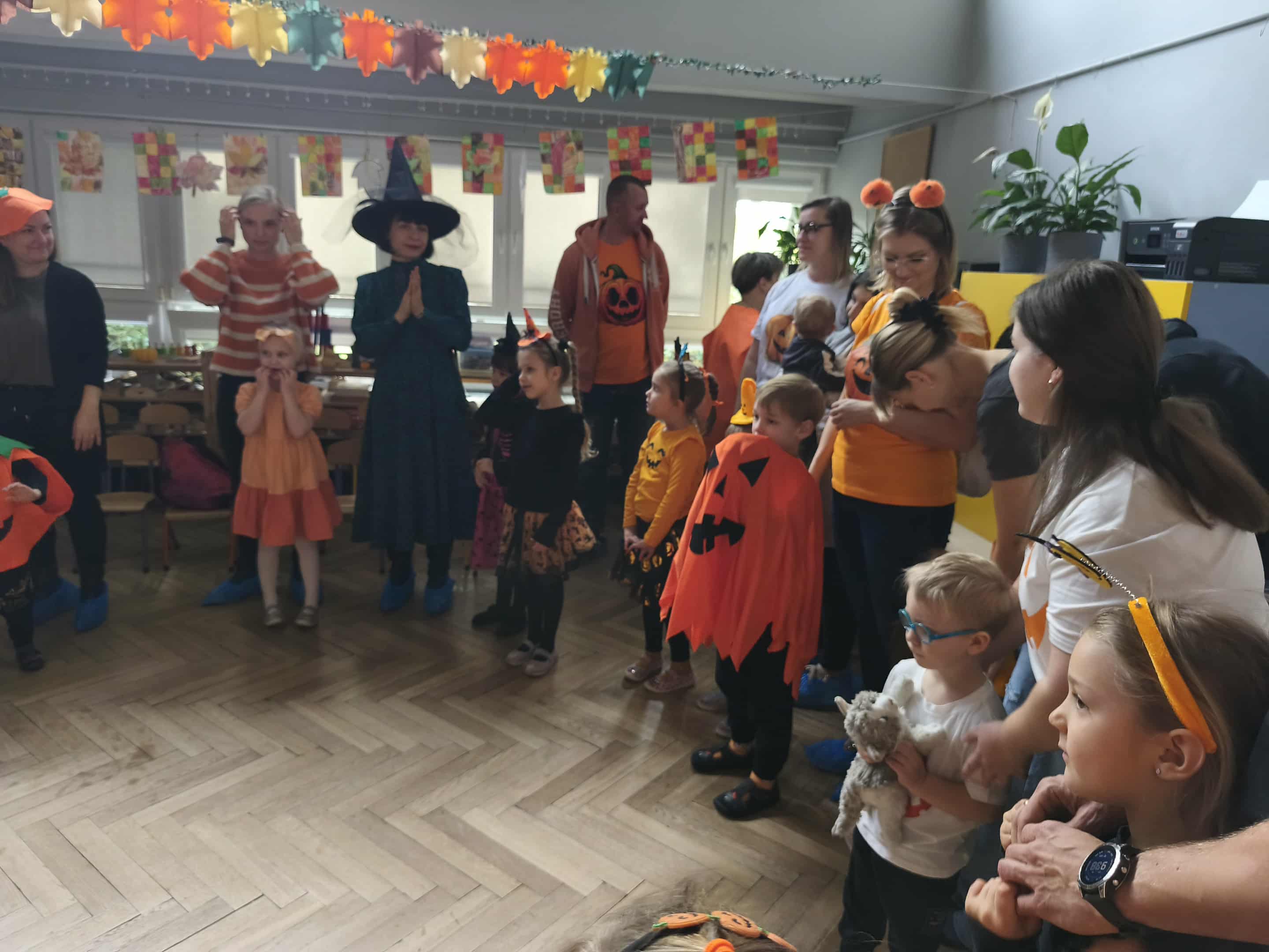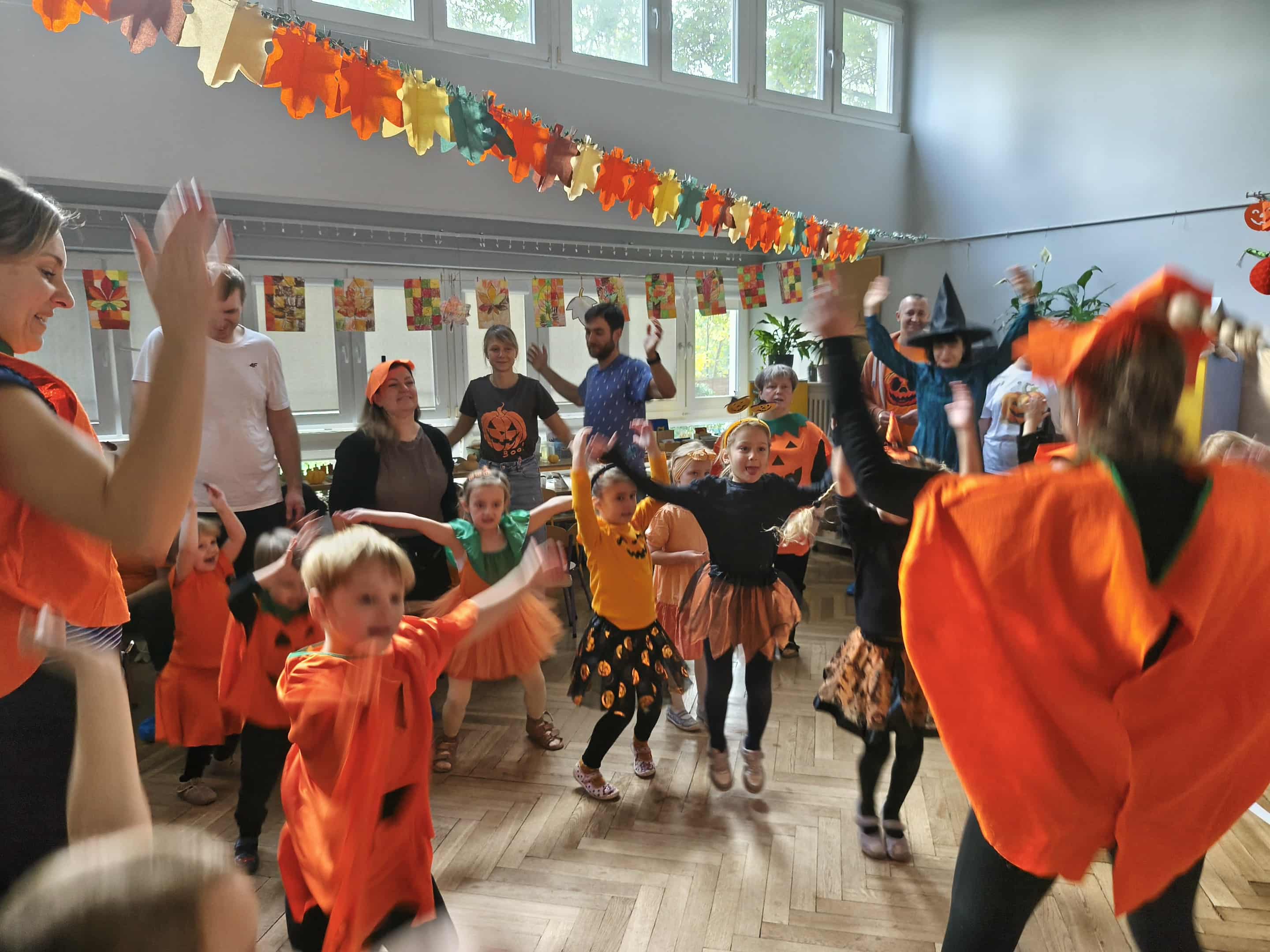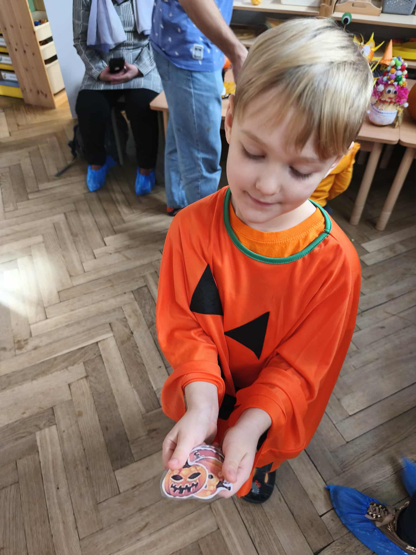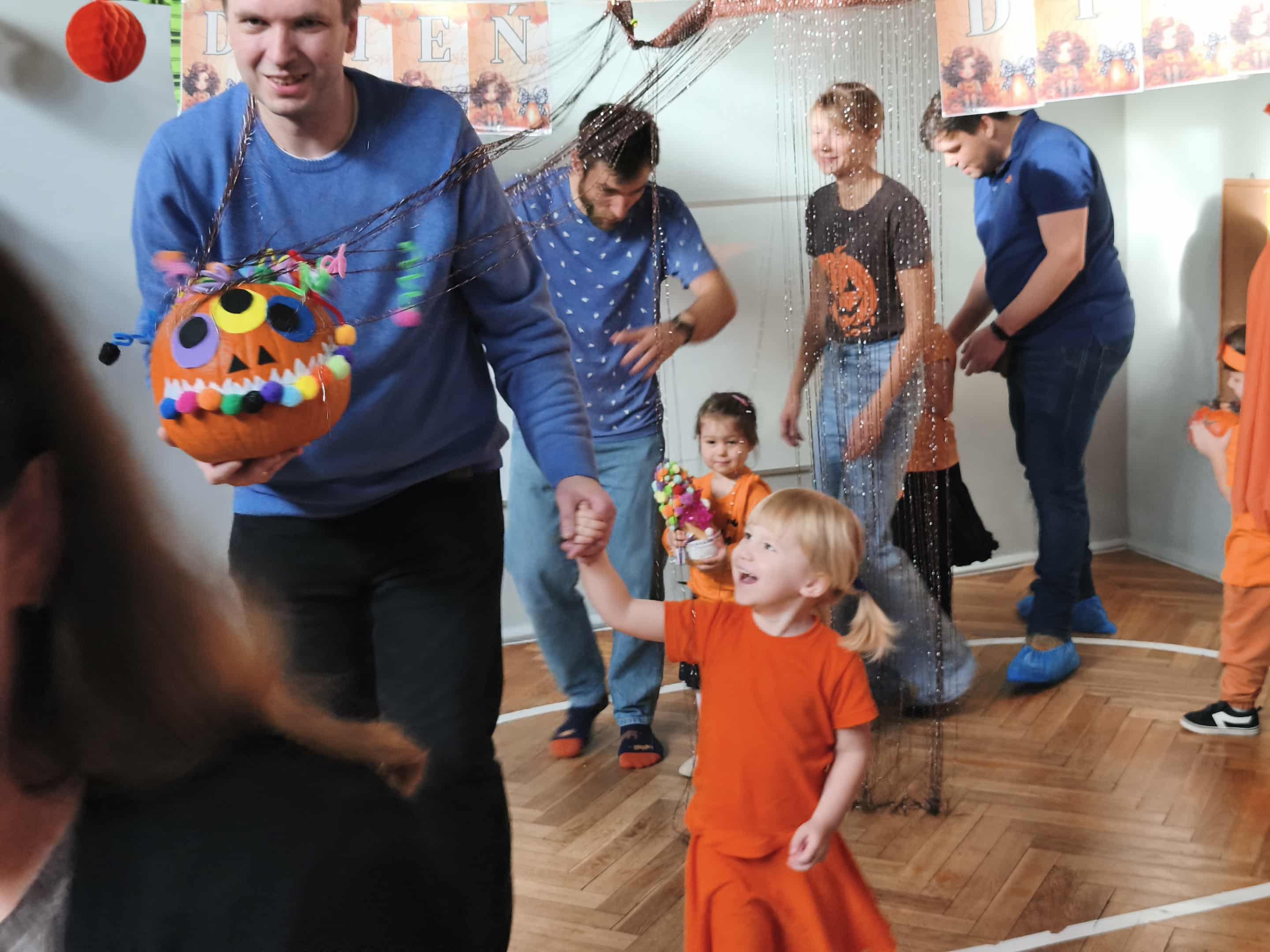 „Cukierek, albo psikus”, „Przeliczamy pestki dyni”, „W ogrodzie stała skrzynia”, itp.. Wszyscy braliśmy udział także w zabawie „Dyniowy pociąg”, który zakończył naszą imprezę. Nie widać było u nikogo smutku, wręcz przeciwnie – każdy był uśmiechnięty i czekał na kolejne zabawy.