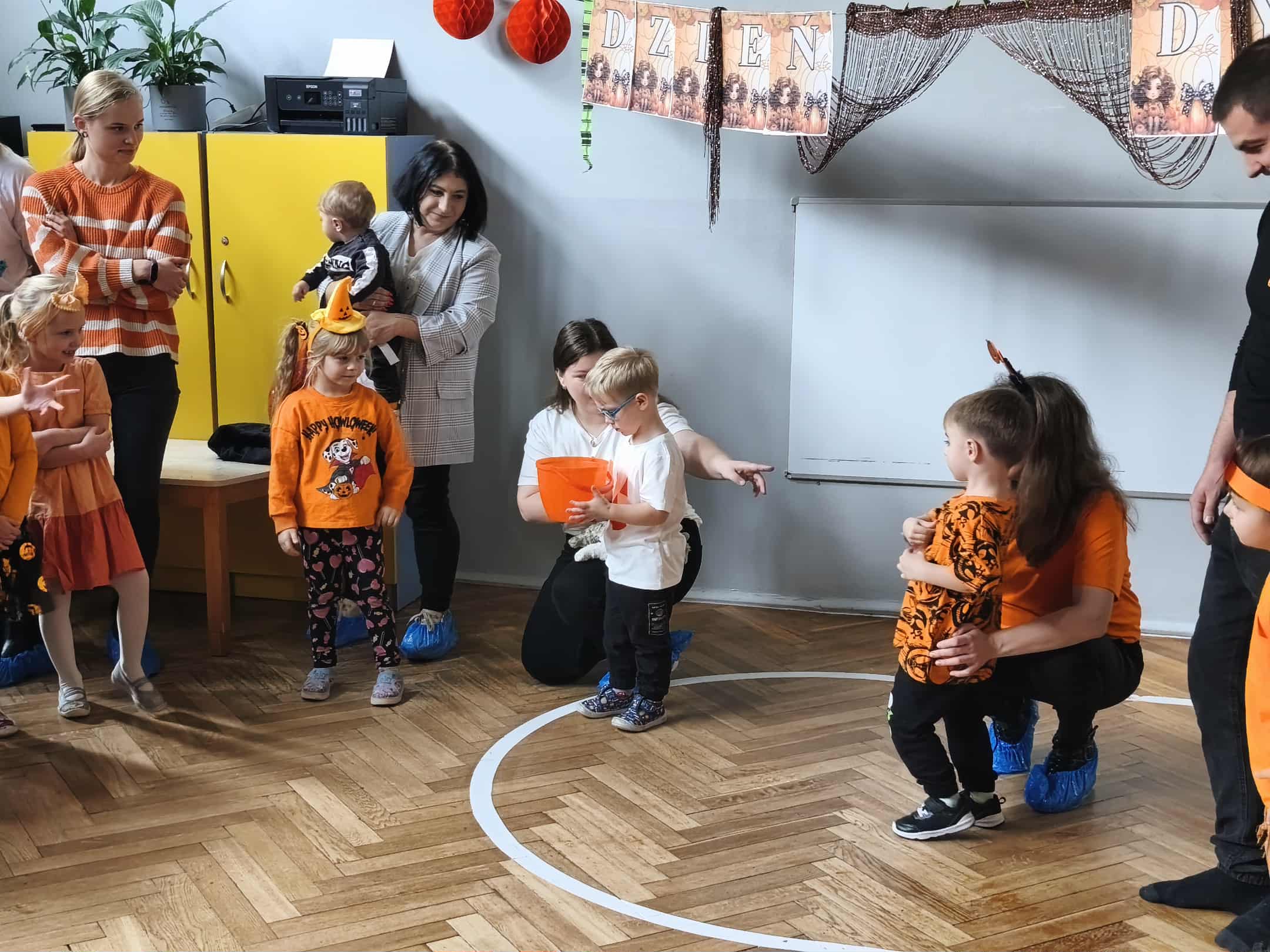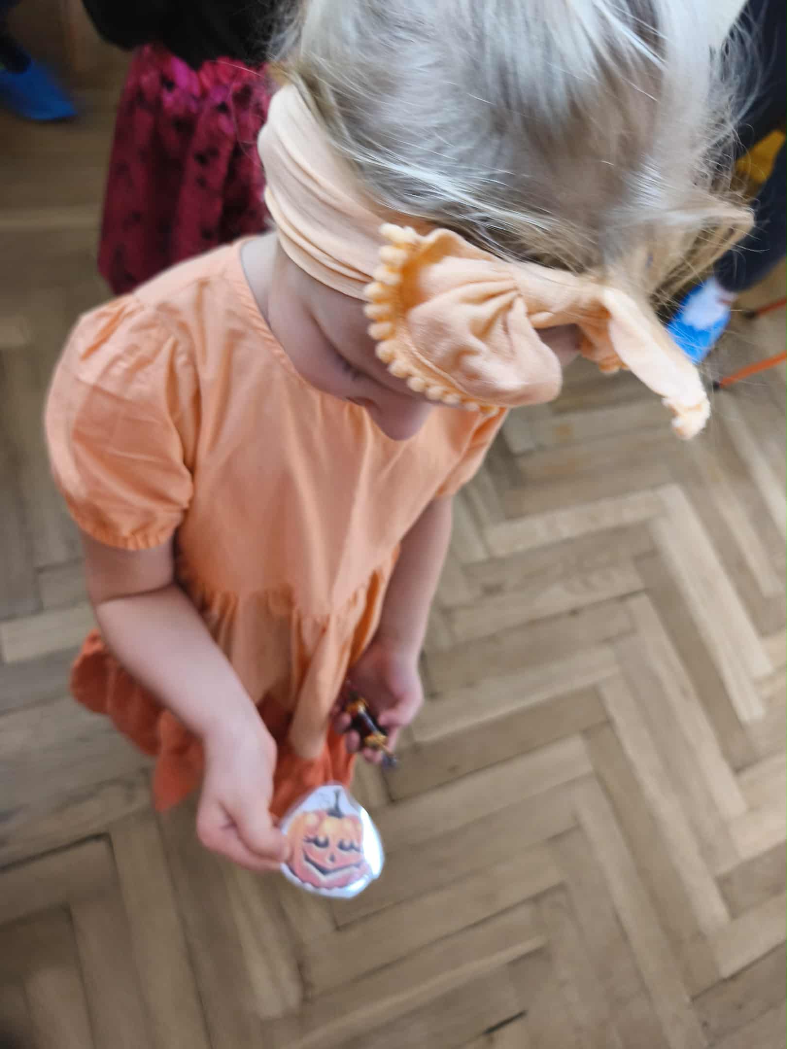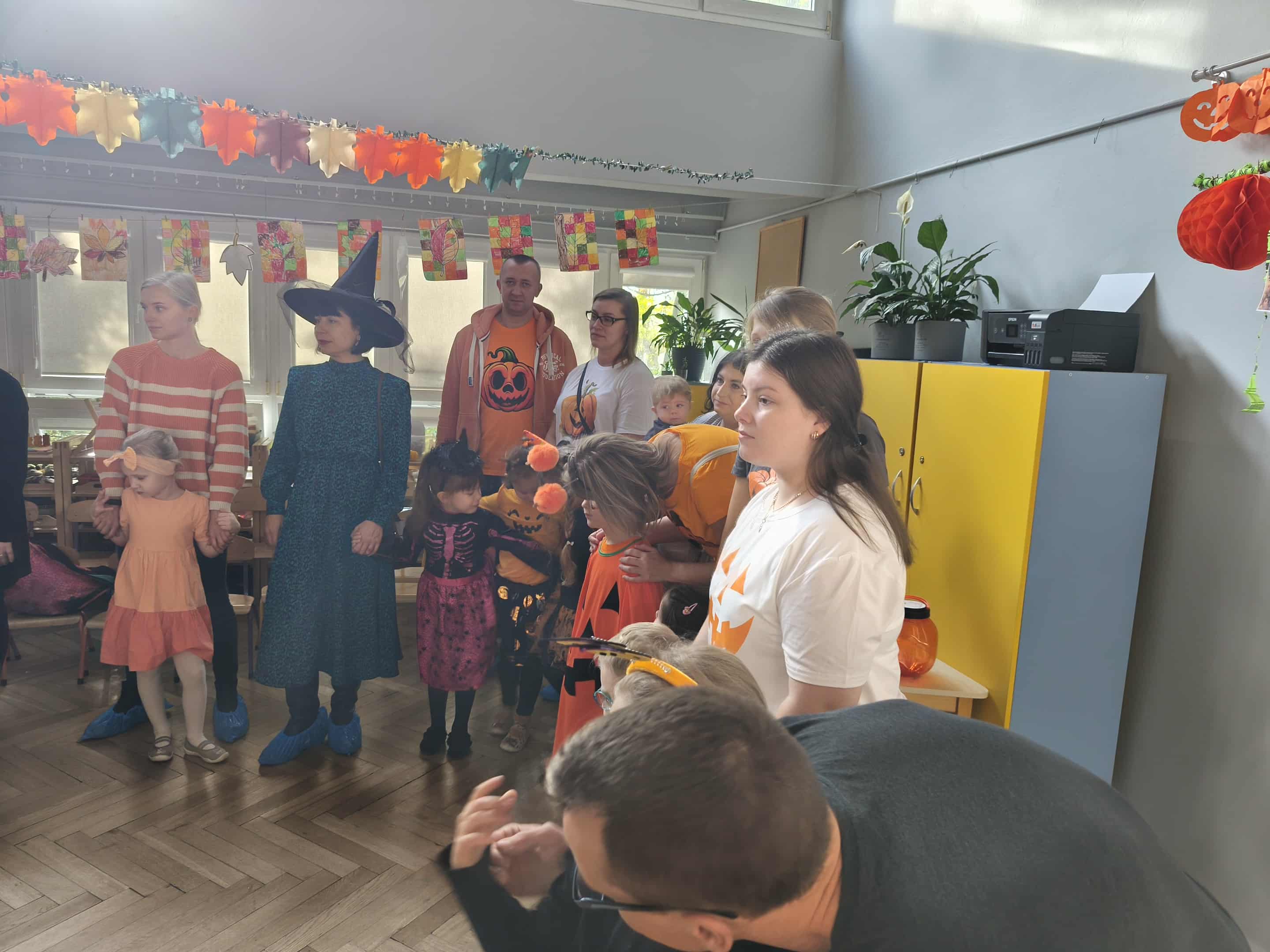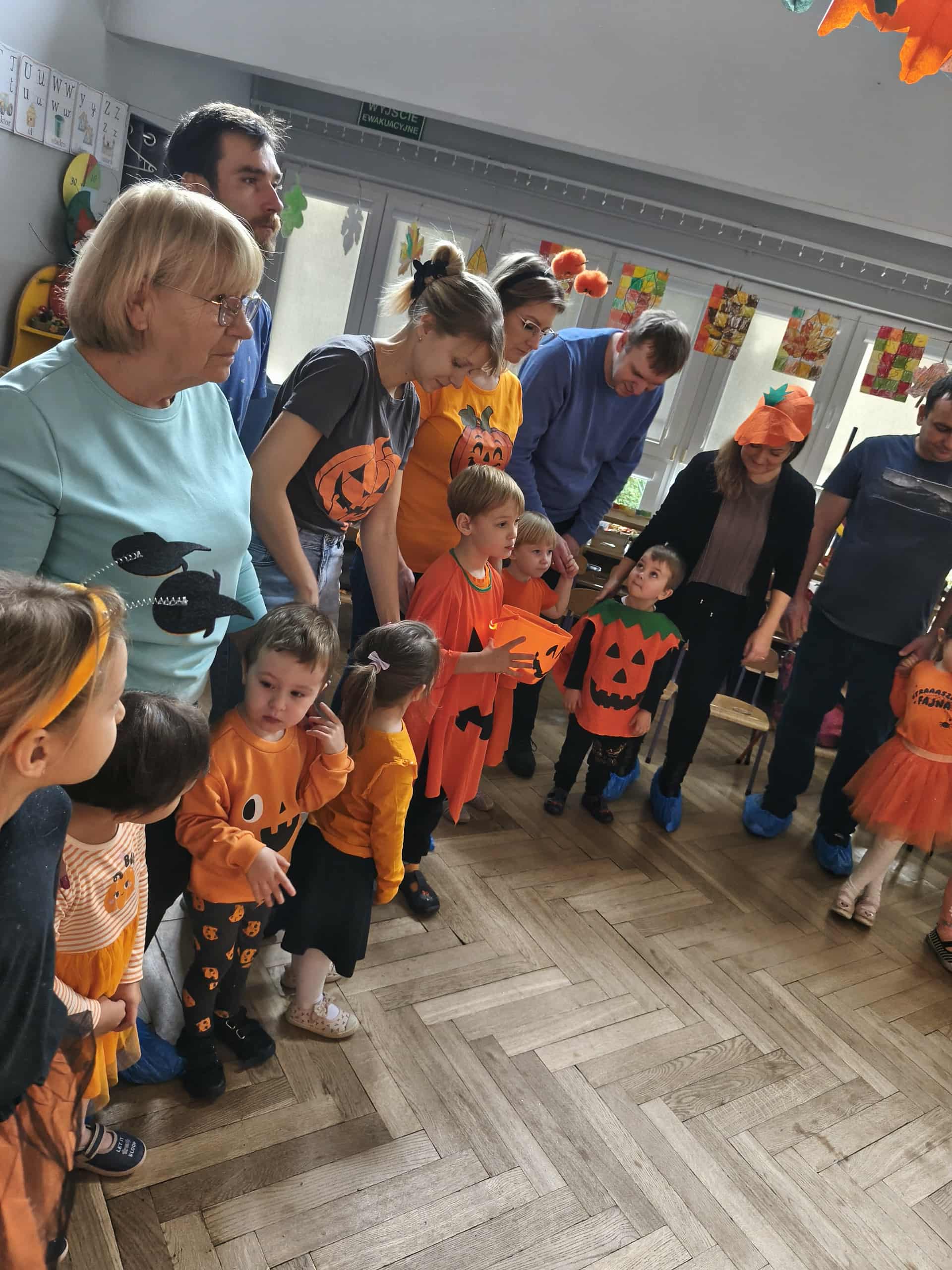 „Cukierek, albo psikus”, „Przeliczamy pestki dyni”, „W ogrodzie stała skrzynia”, itp.. Wszyscy braliśmy udział także w zabawie „Dyniowy pociąg”, który zakończył naszą imprezę. Nie widać było u nikogo smutku, wręcz przeciwnie – każdy był uśmiechnięty i czekał na kolejne zabawy.