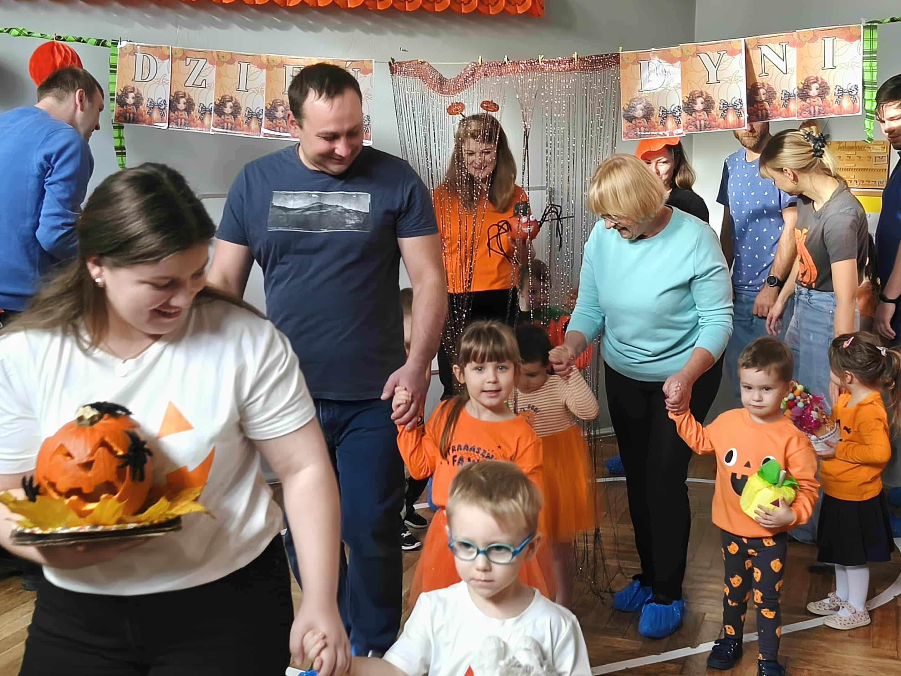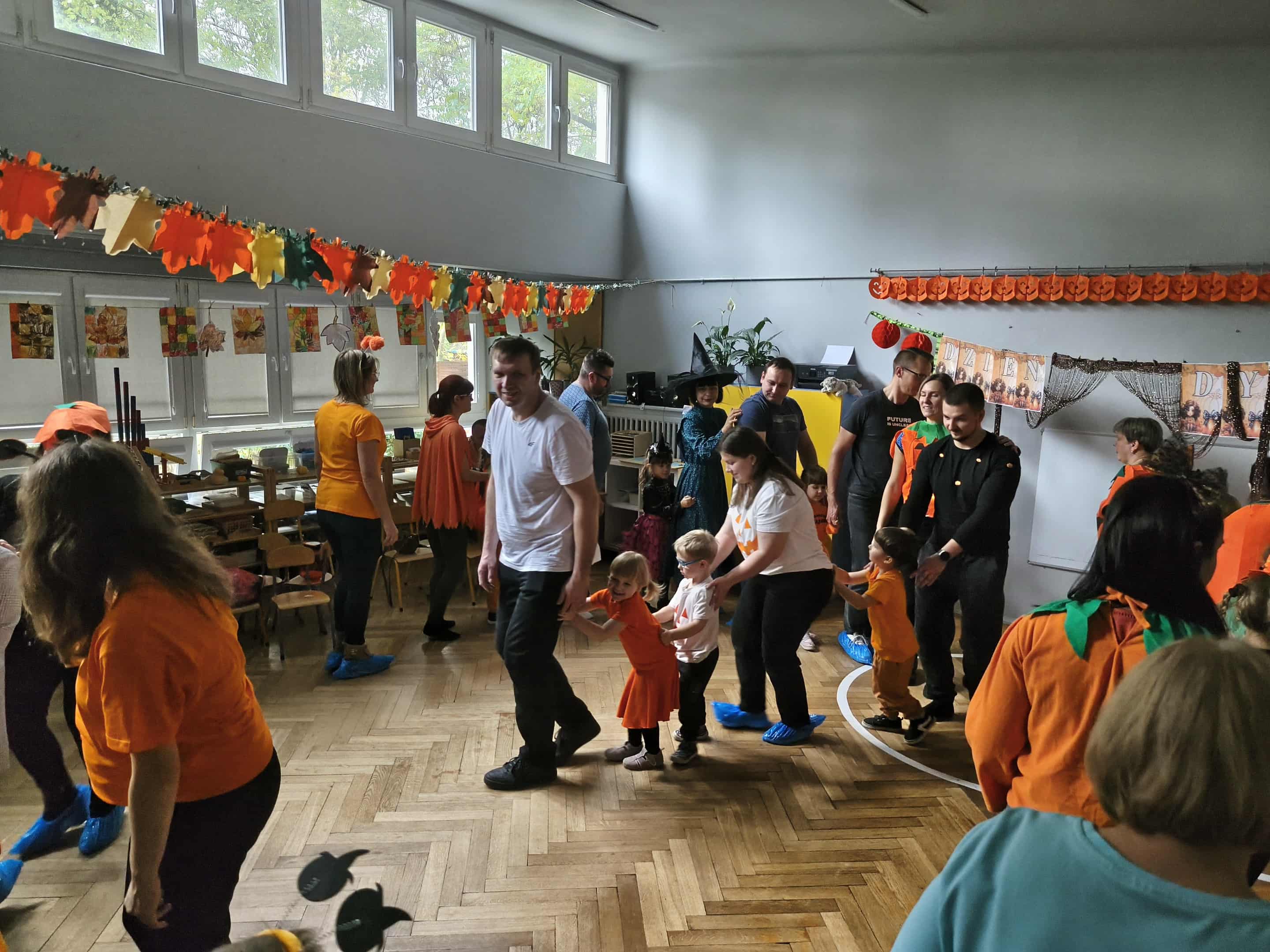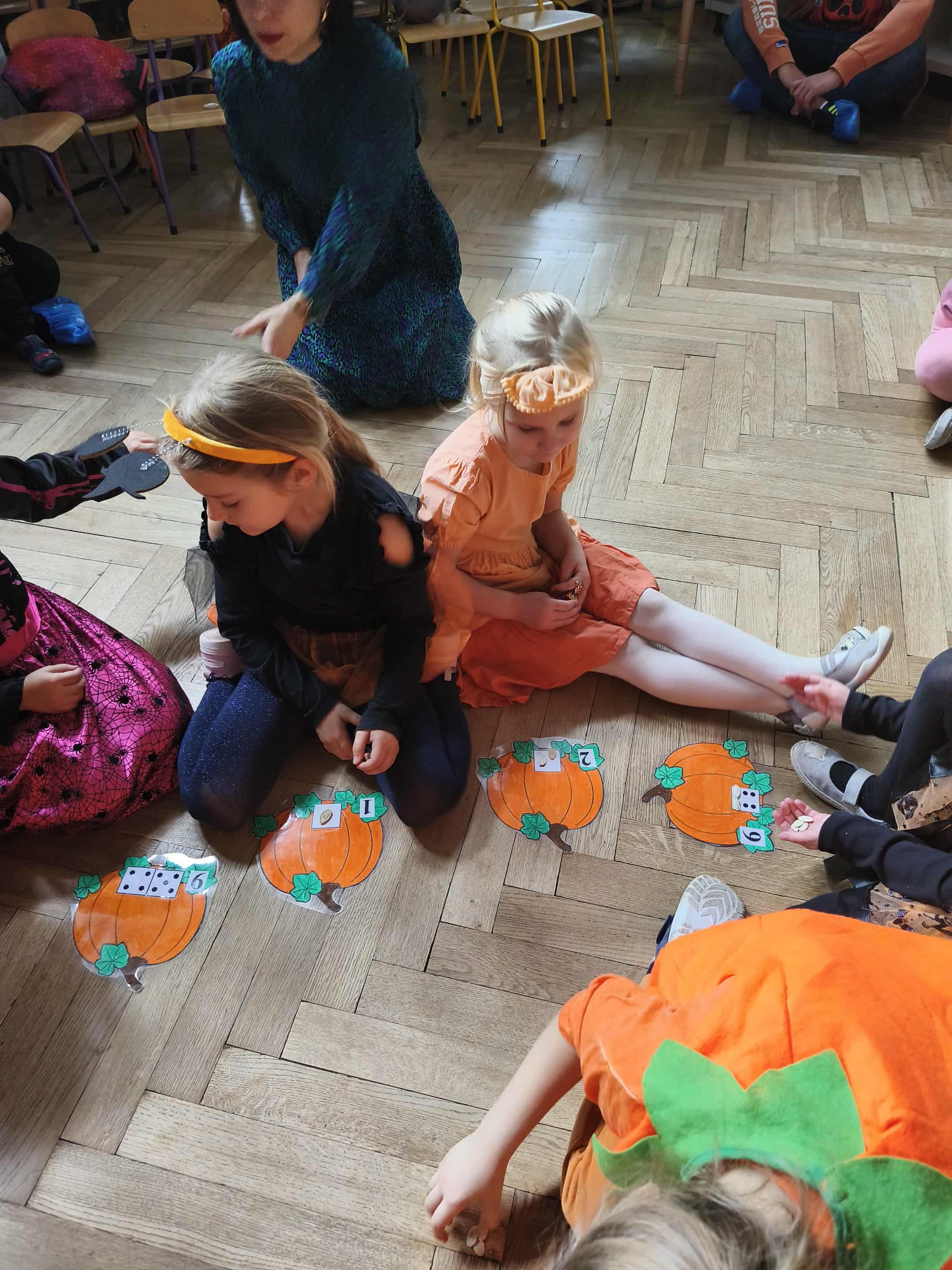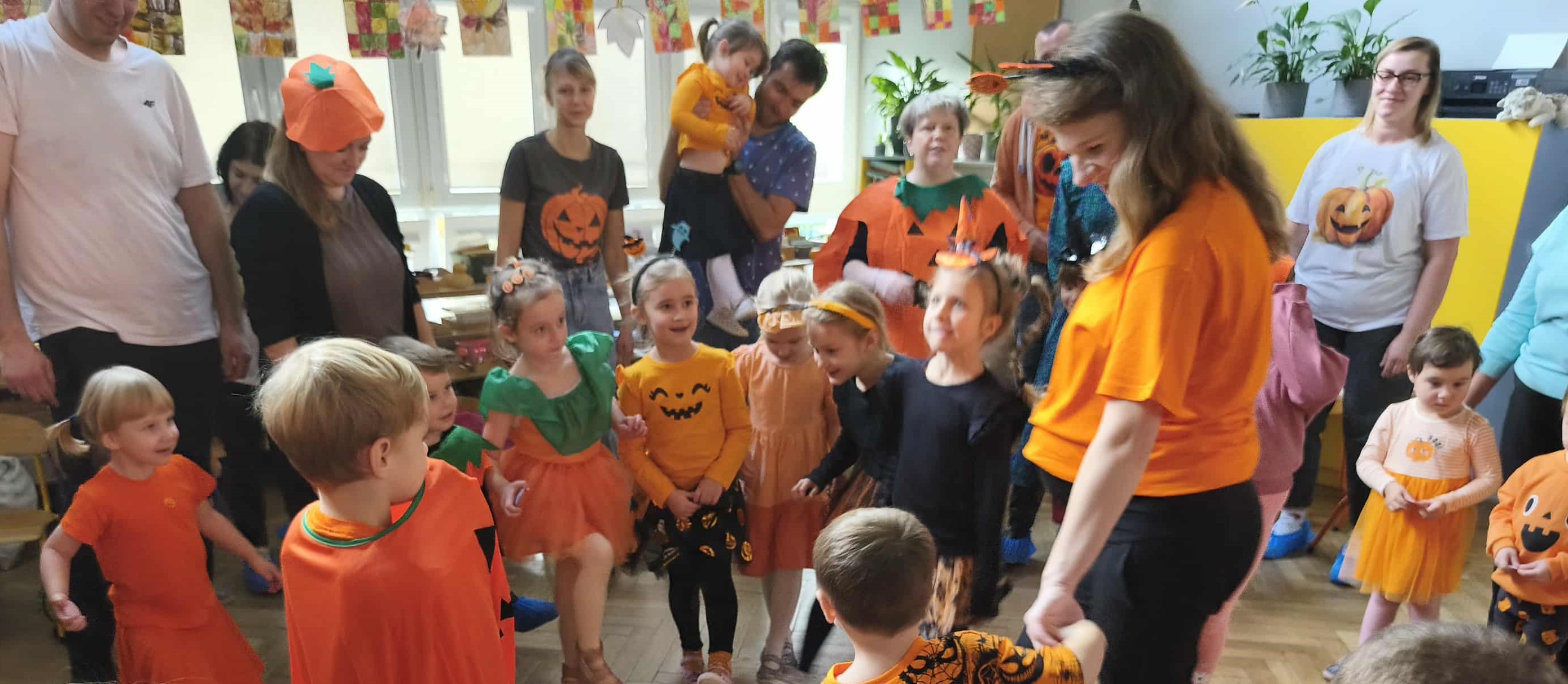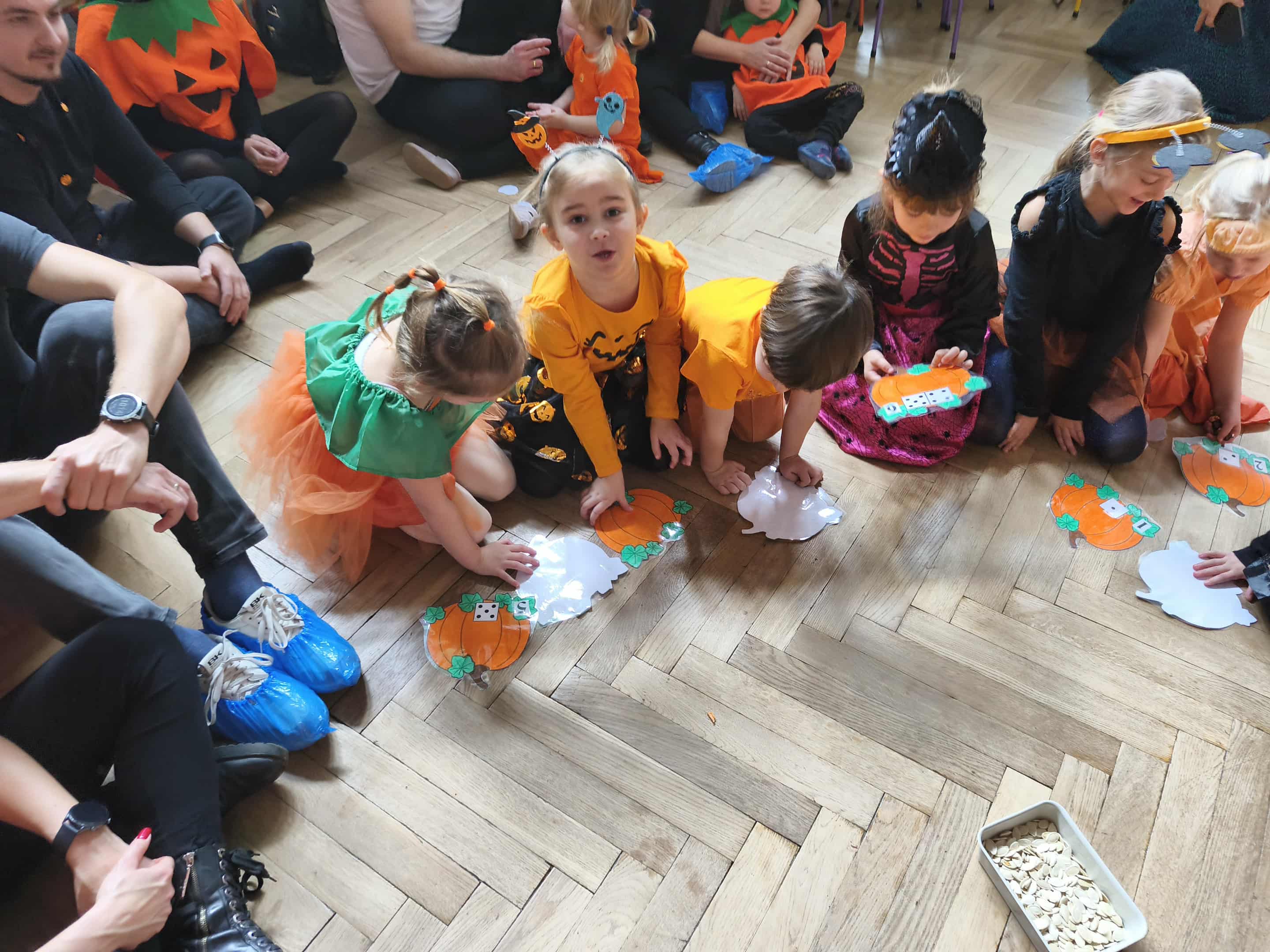 „Cukierek, albo psikus”, „Przeliczamy pestki dyni”, „W ogrodzie stała skrzynia”, itp.. Wszyscy braliśmy udział także w zabawie „Dyniowy pociąg”, który zakończył naszą imprezę. Nie widać było u nikogo smutku, wręcz przeciwnie – każdy był uśmiechnięty i czekał na kolejne zabawy.