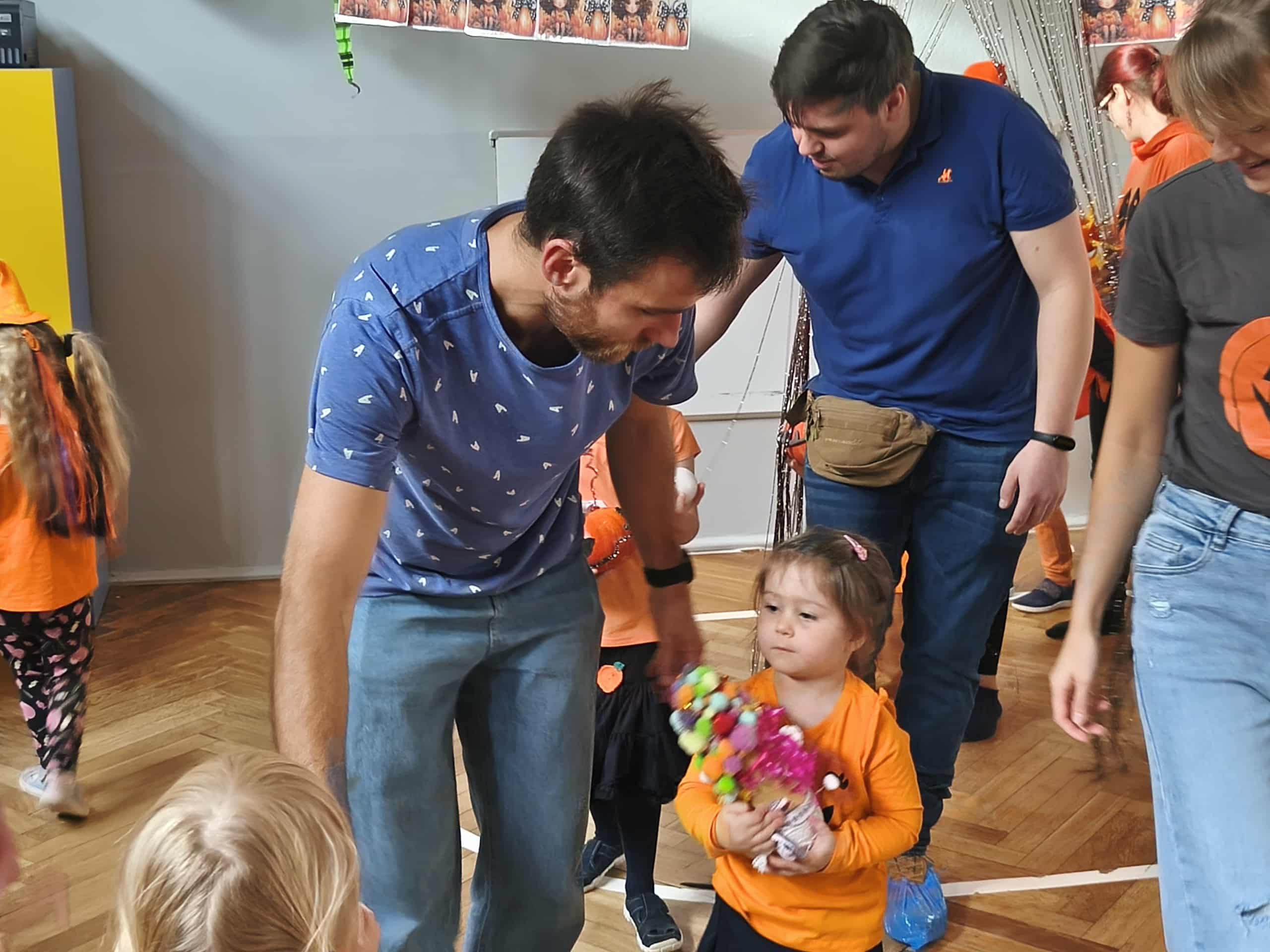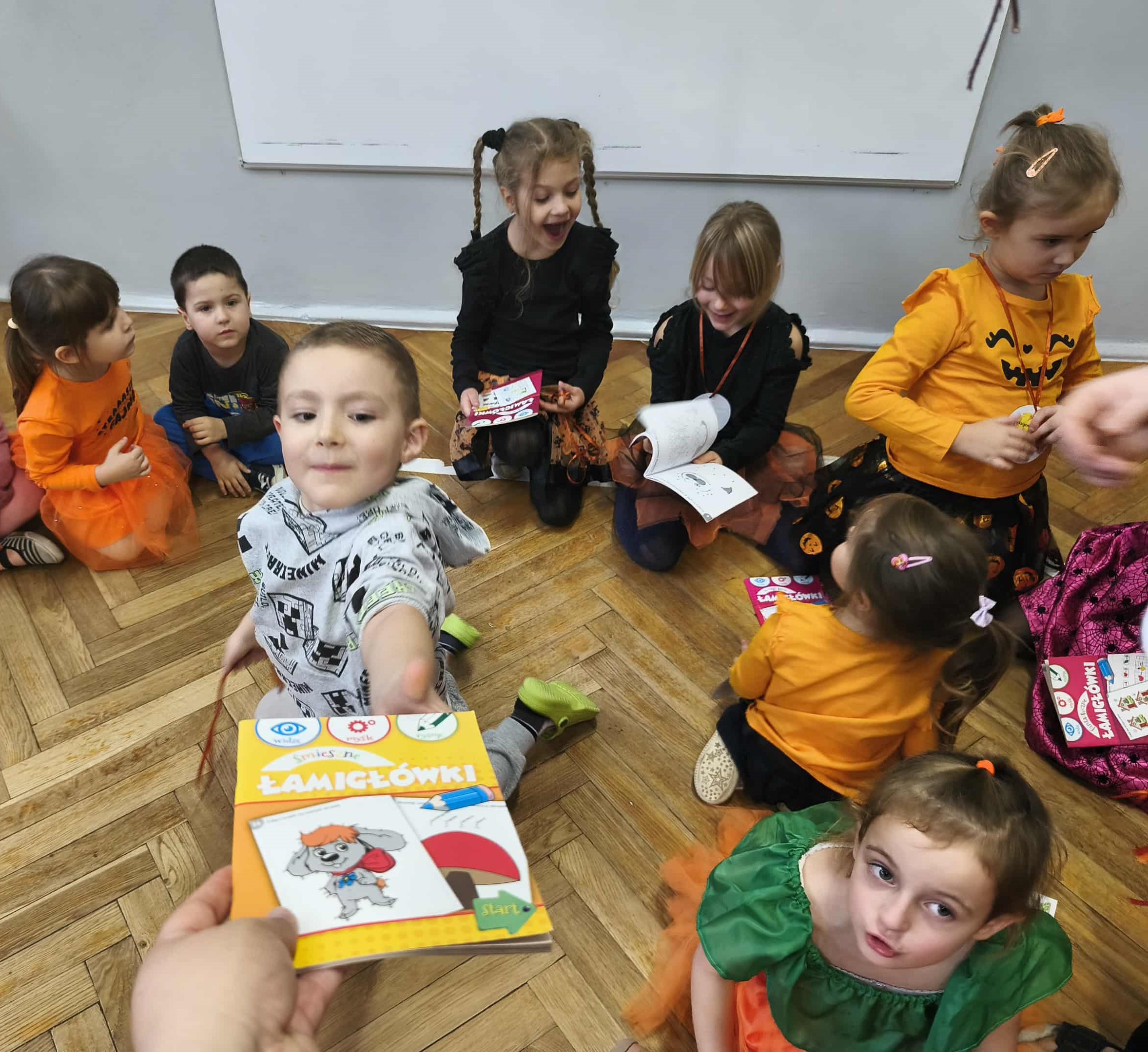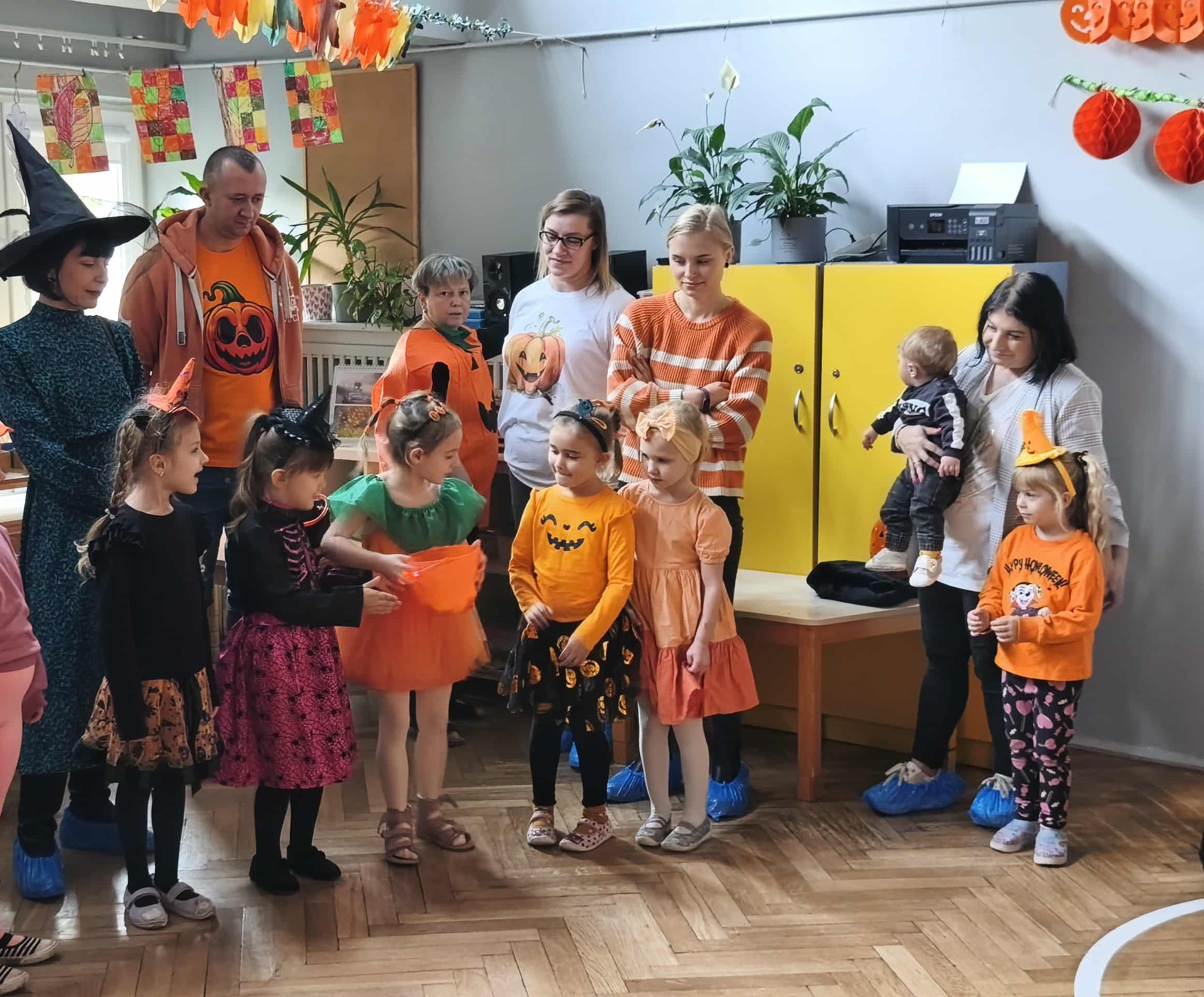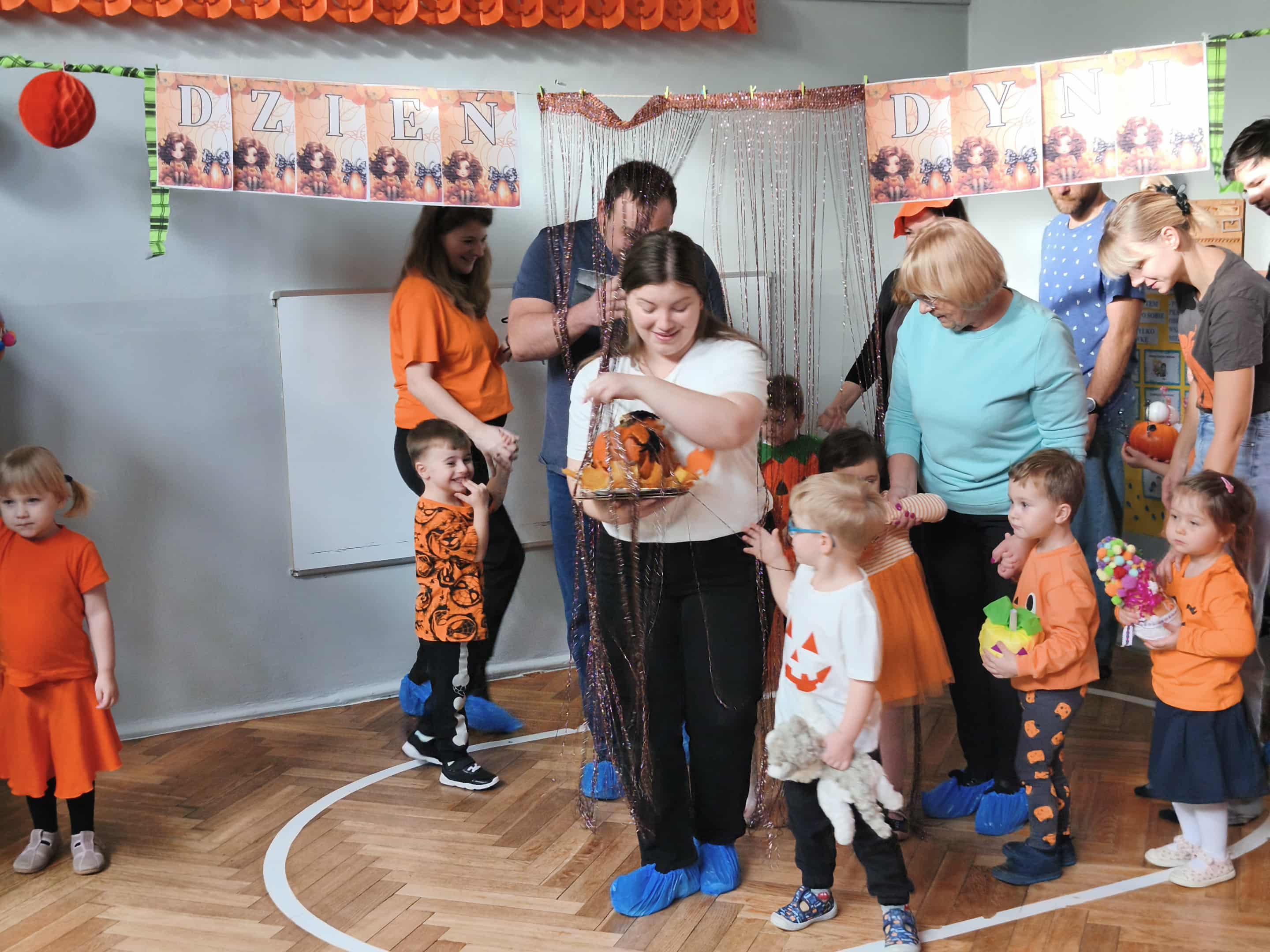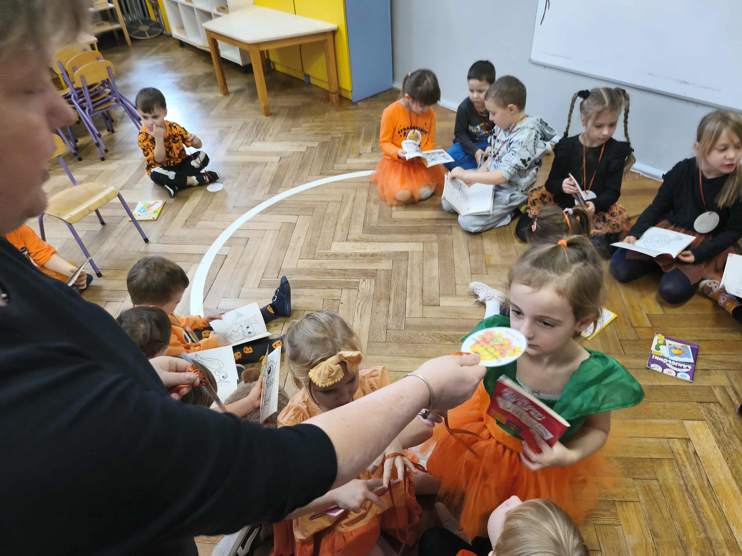 „Cukierek, albo psikus”, „Przeliczamy pestki dyni”, „W ogrodzie stała skrzynia”, itp.. Wszyscy braliśmy udział także w zabawie „Dyniowy pociąg”, który zakończył naszą imprezę. Nie widać było u nikogo smutku, wręcz przeciwnie – każdy był uśmiechnięty i czekał na kolejne zabawy.