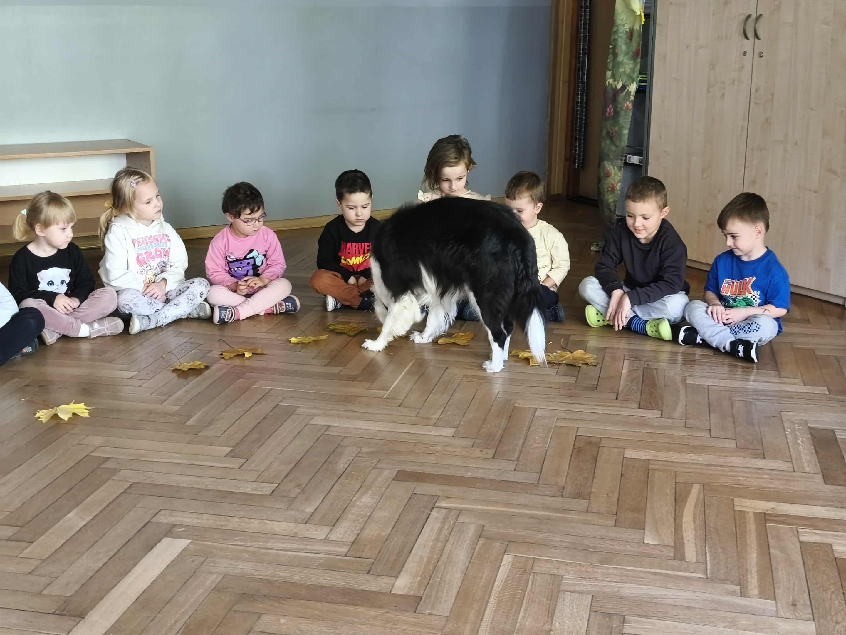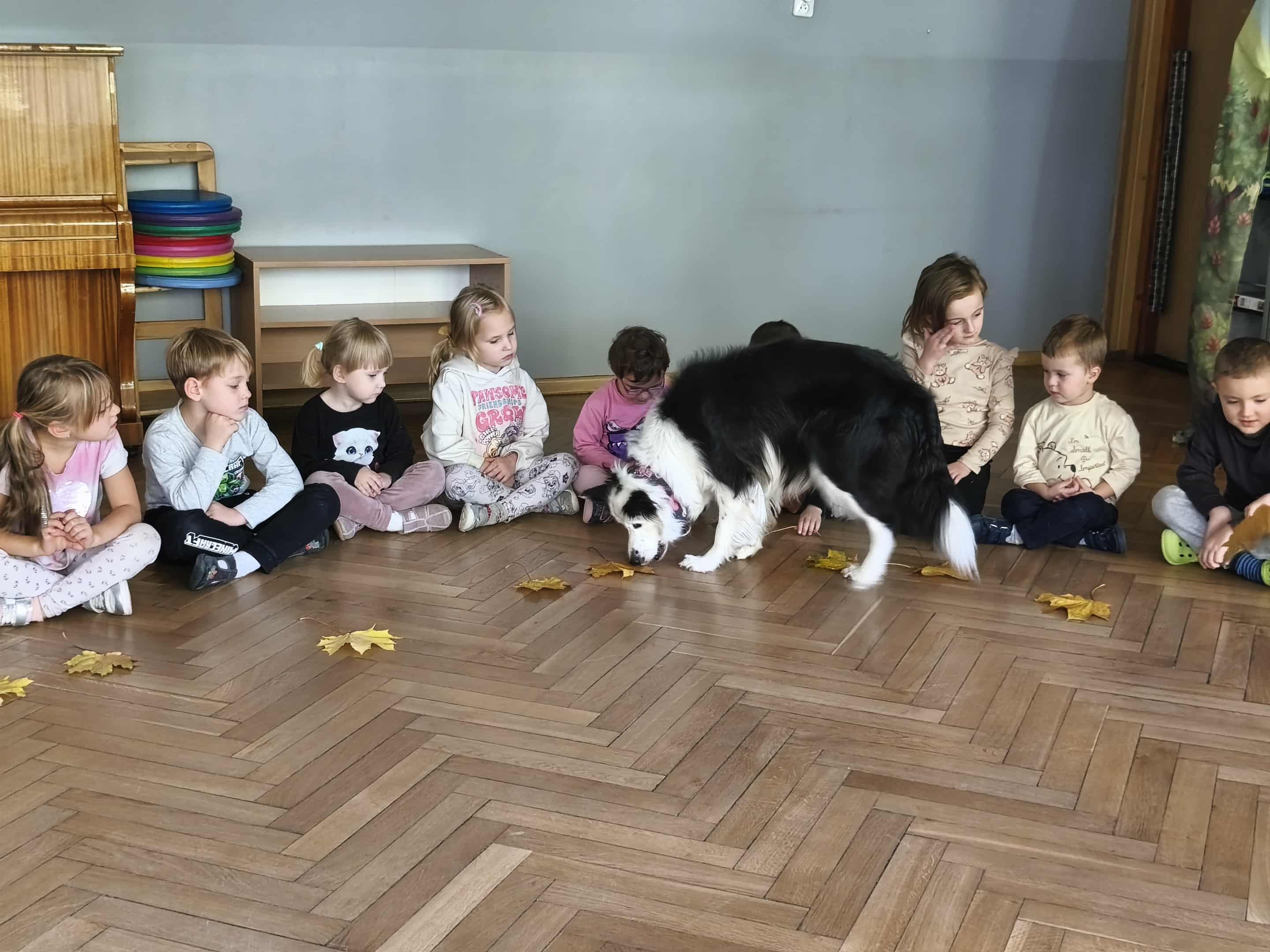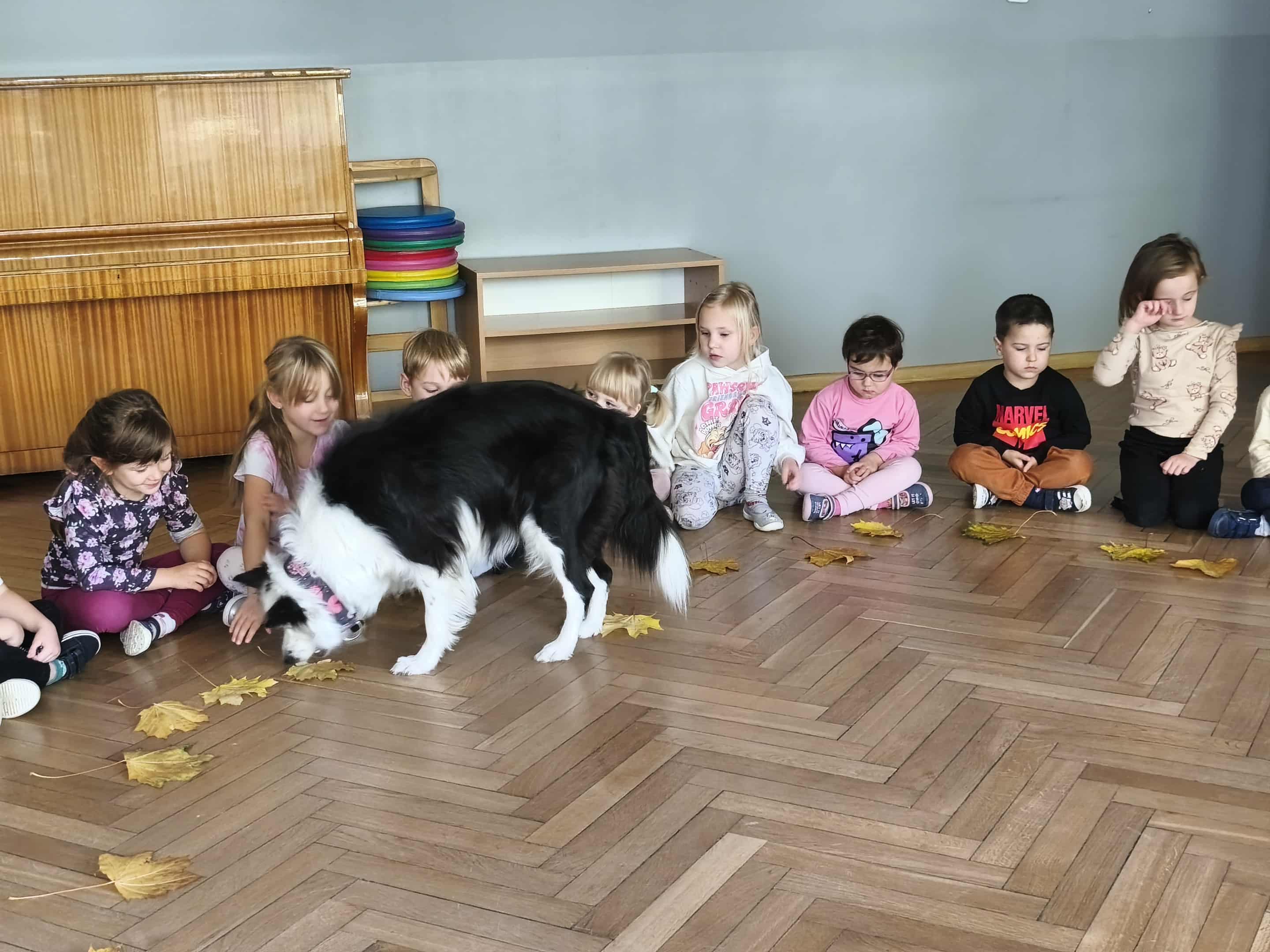 Dzisiejszego dnia na zajęciach odwiedziła na Lily, która na początku miała za zadanie wyszukać pod liściem ukrytego smakołyka. Następnie dowiedzieliśmy się, jak ważne mają zadania psy ratownicy, m.in: poszukują osób pod zawalonymi budynkami, ratują osoby tonące, pomagają osobom niewidomym. Na zakończenie Lily pokazała nam, jak Ona poszukuje swojego ulubionego przytulaka "Jeżyka".