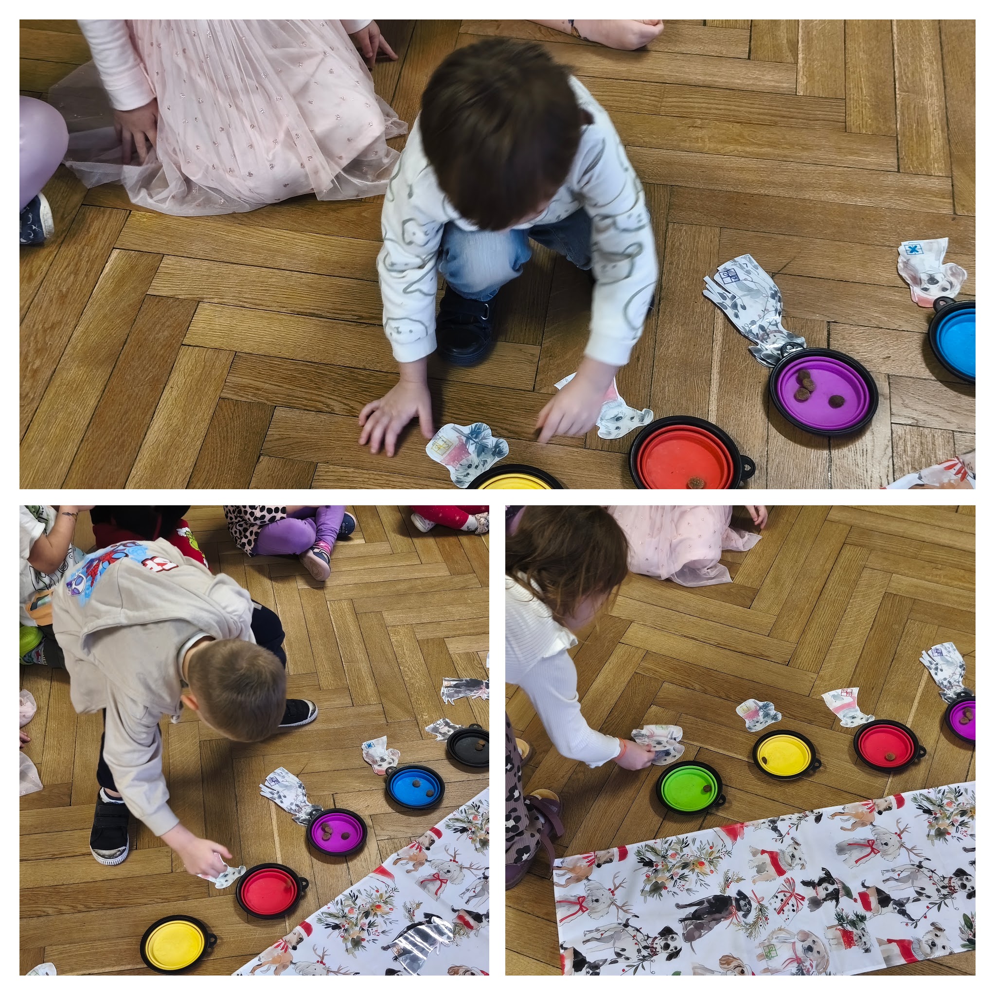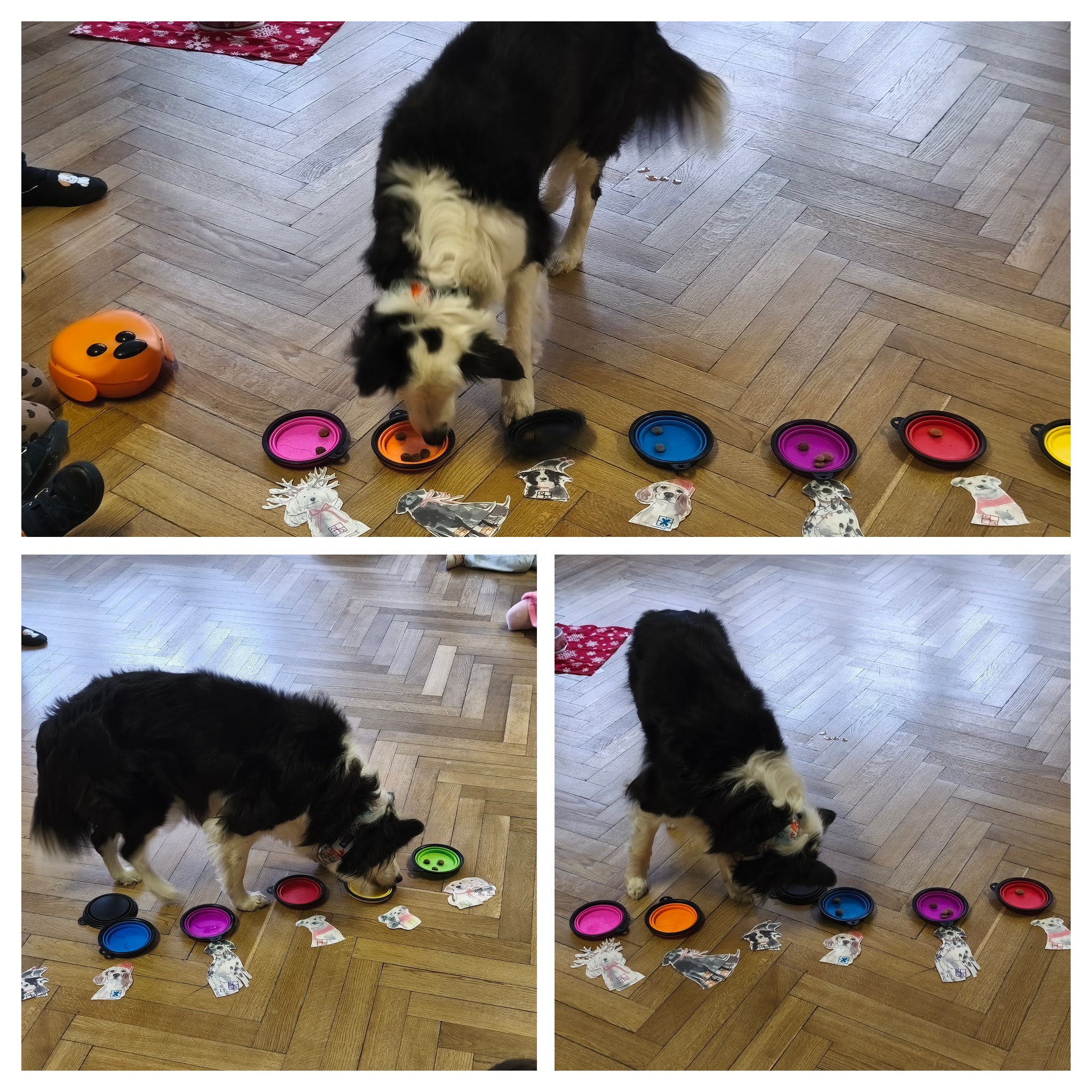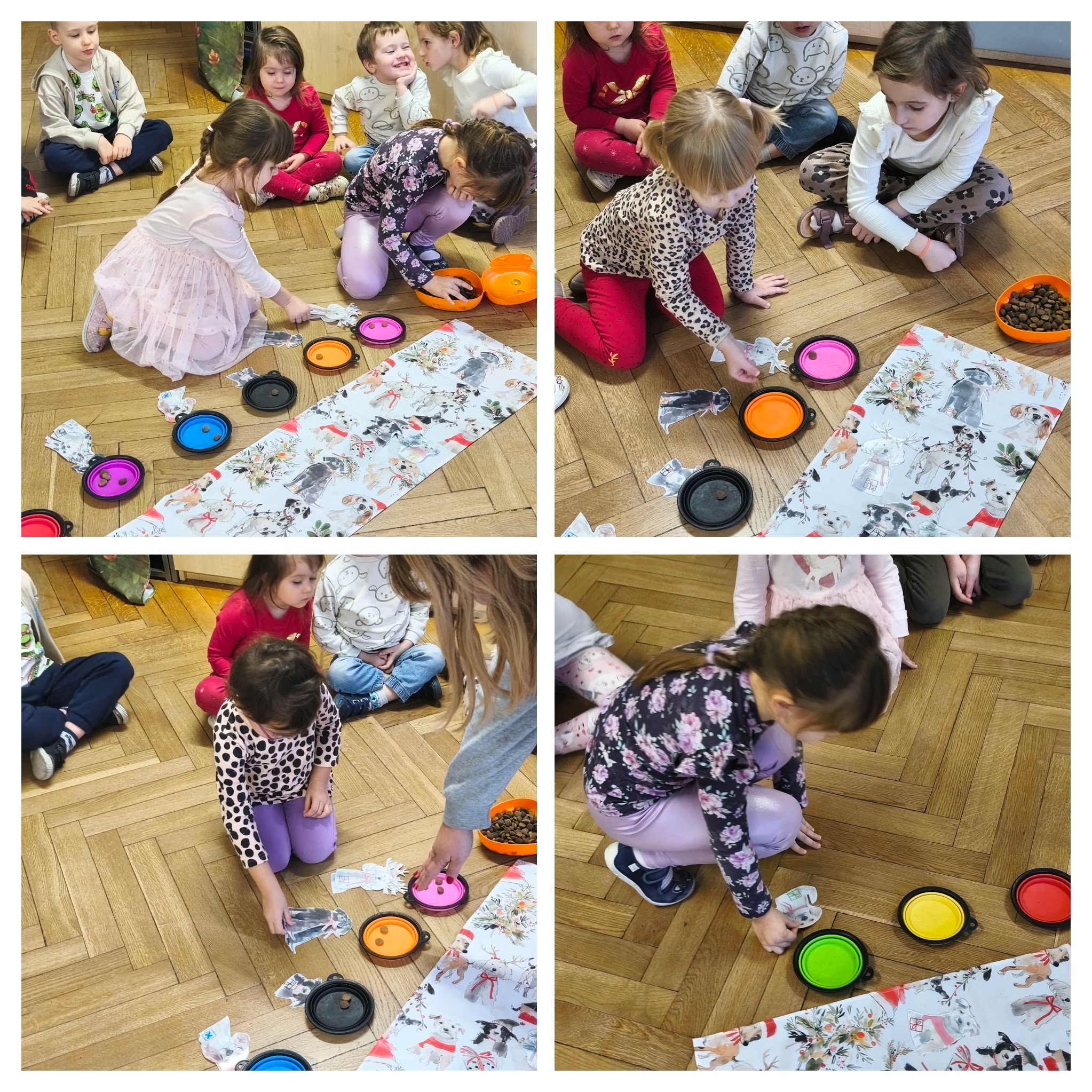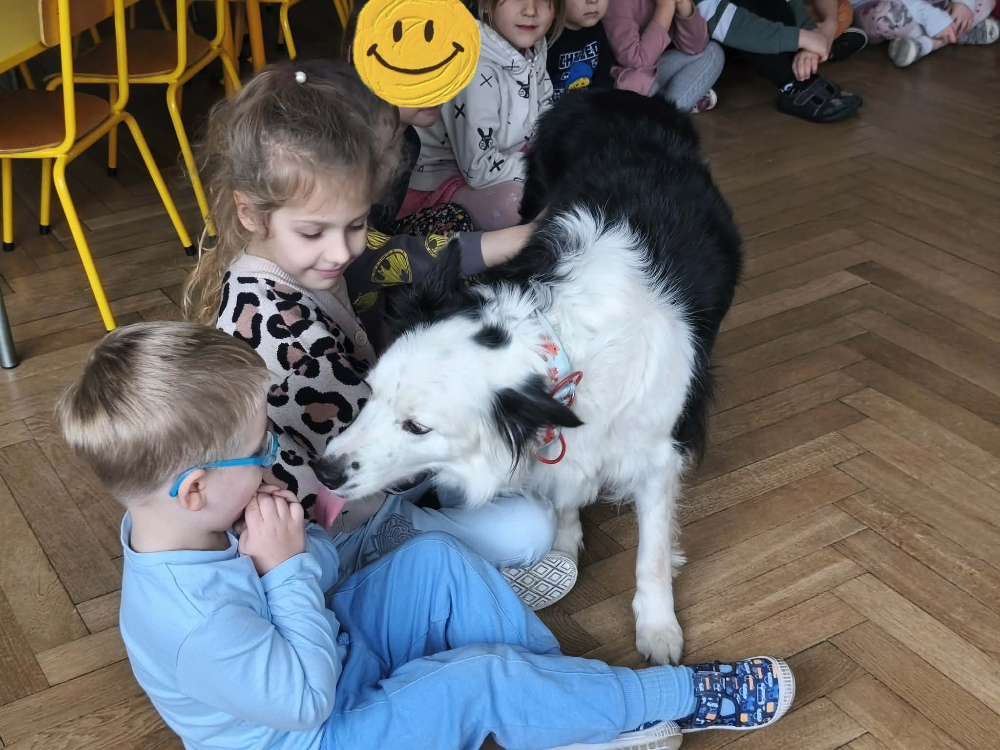 Dzisiejszego dnia odwiedziła nas Lily. Jak zawsze mogliśmy ją delikatnie pogłaskać, a Ona czasami odwzajemniała się buziakiem. Lily i Pani Beatka przygotowały dla nas świąteczną zabawę, która ćwiczyła naszą spostrzegawczość, utrwalała nazwy kolorów. Na zakończenie Lily "powróżyła" nam swoim głosem, ile dostaniemy prezentów w Wigilijną Noc. Mamy nadzieję, że szczeknięcia Lily się sprawdzą i dzieci dostaną mnóstwo prezentów.