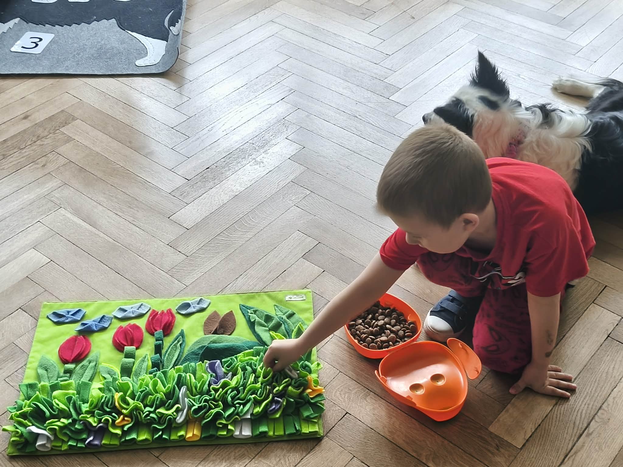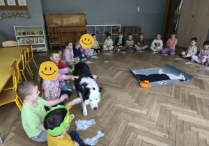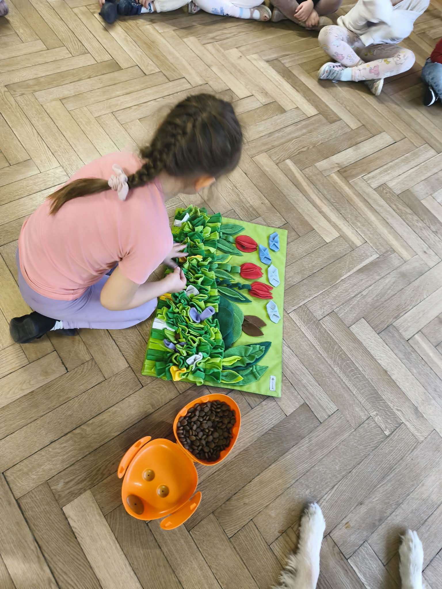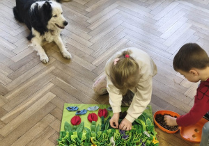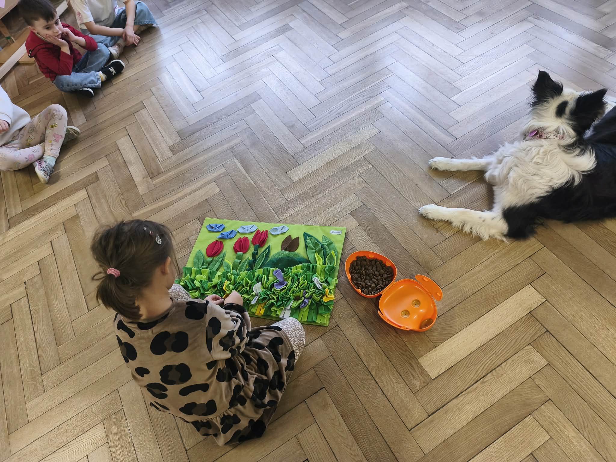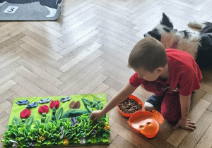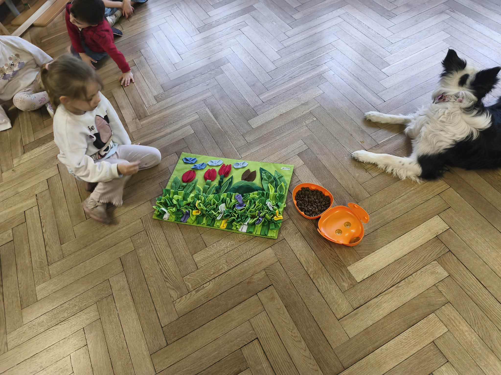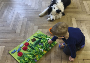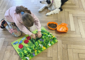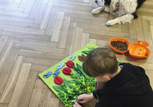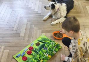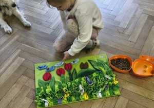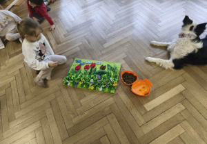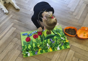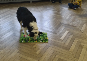 Na zakończenie zadbaliśmy o potrzeby Lily. Dzieci przygotowały dla niej wyzwanie w postaci wiosennej maty węchowej – każdy przedszkolak schował w niej smakołyk, a nasza czworonożna przyjaciółka z radością przystąpiła do ich poszukiwania.