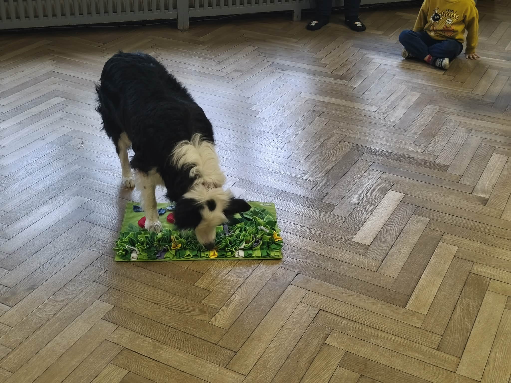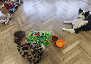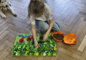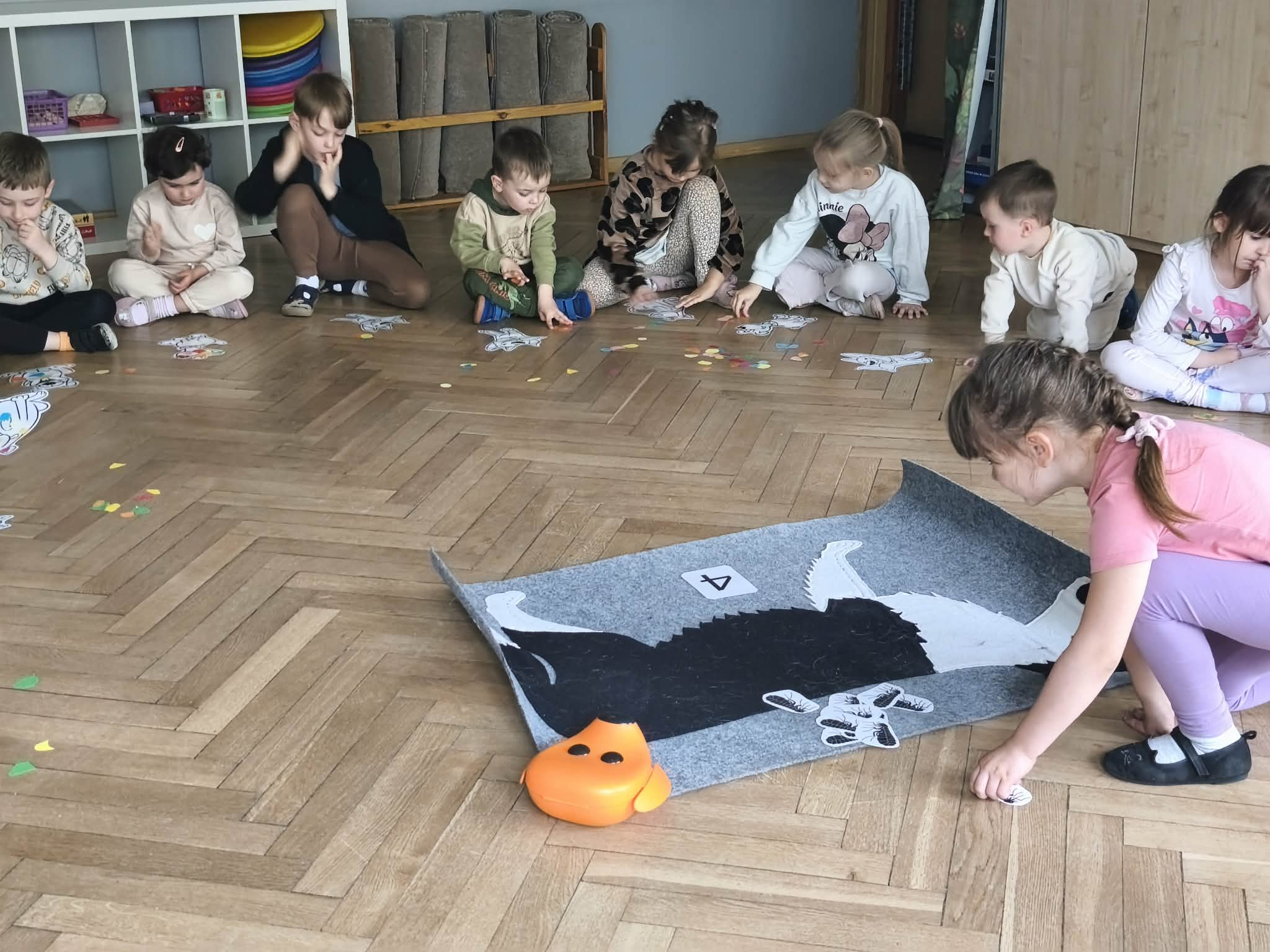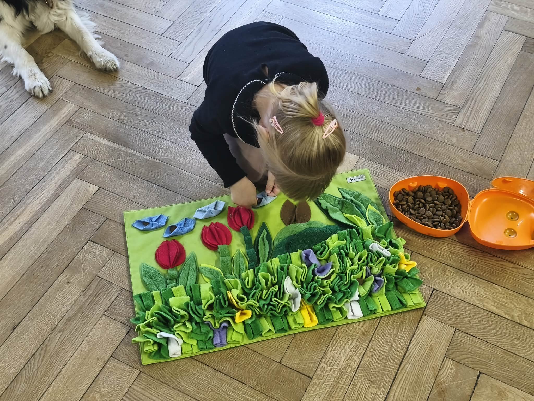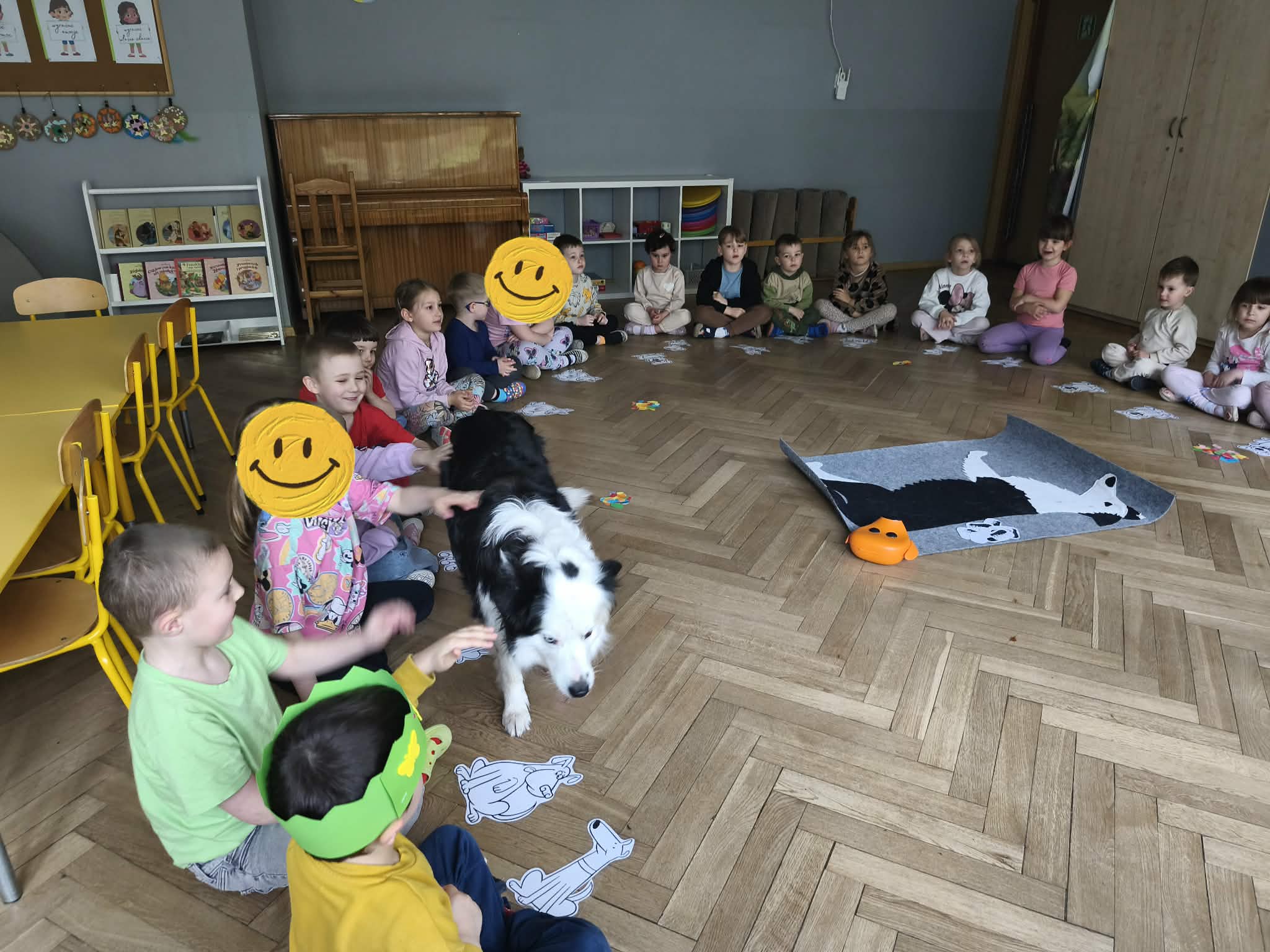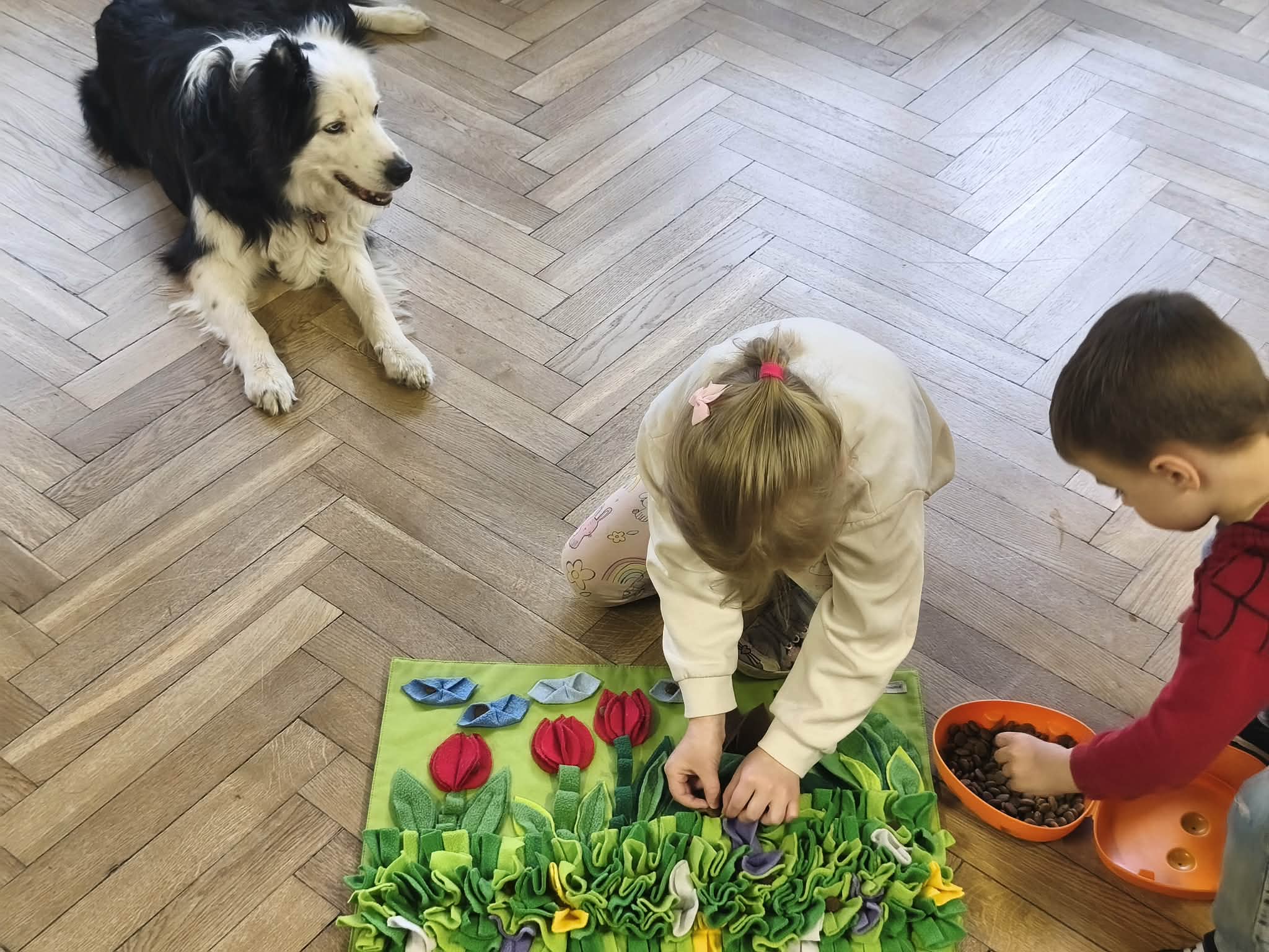Na zakończenie zadbaliśmy o potrzeby Lily. Dzieci przygotowały dla niej wyzwanie w postaci wiosennej maty węchowej – każdy przedszkolak schował w niej smakołyk, a nasza czworonożna przyjaciółka z radością przystąpiła do ich poszukiwania.