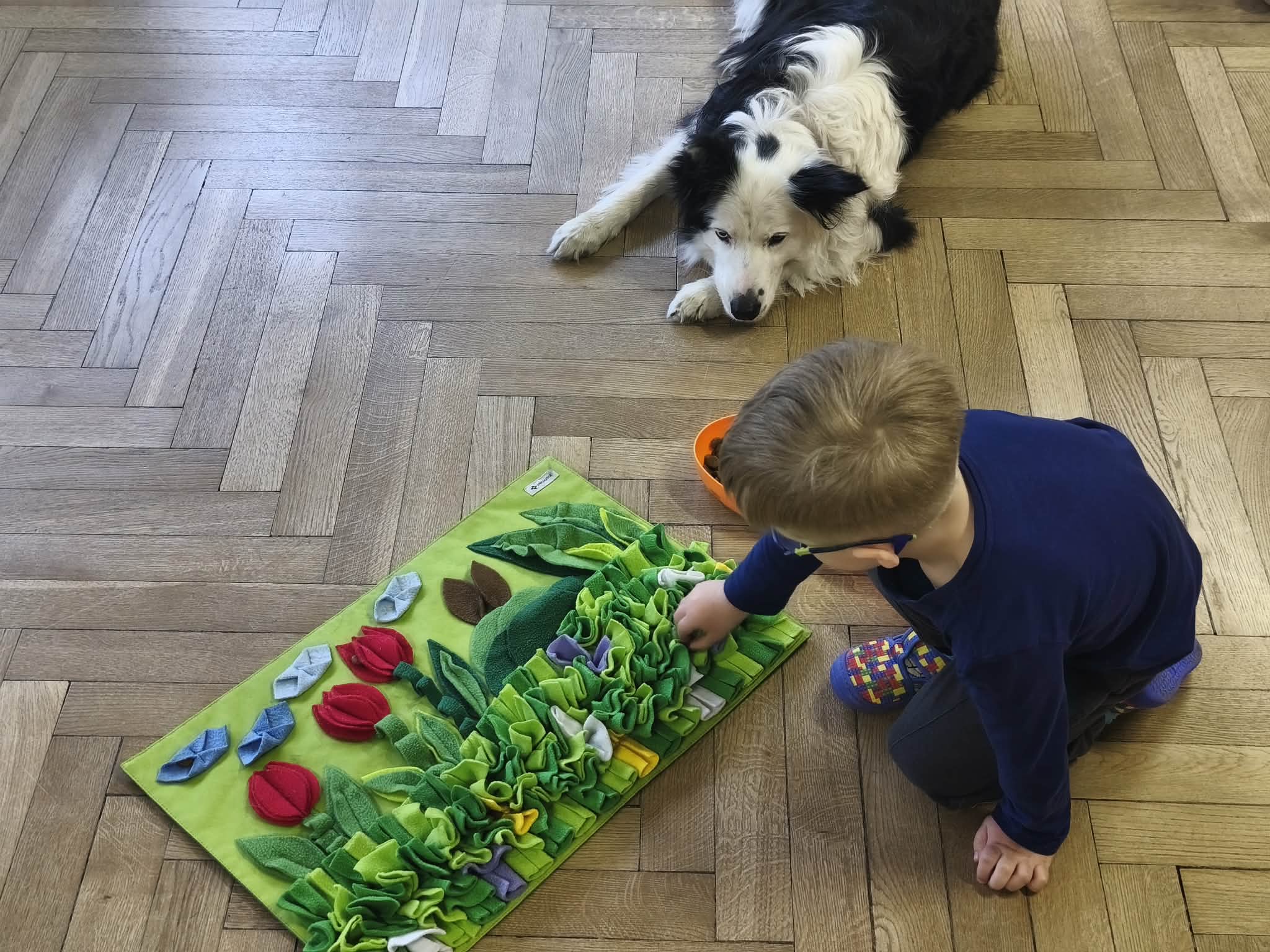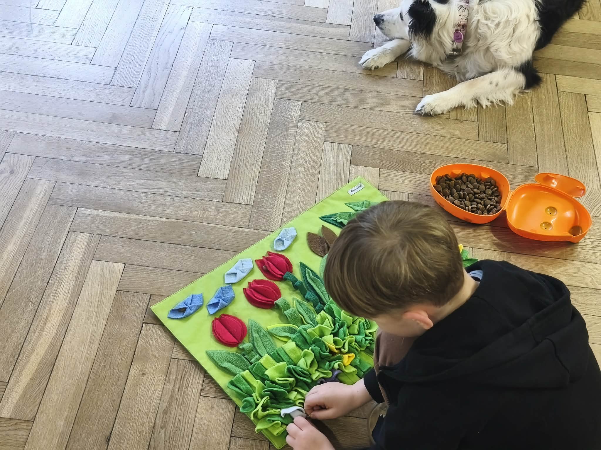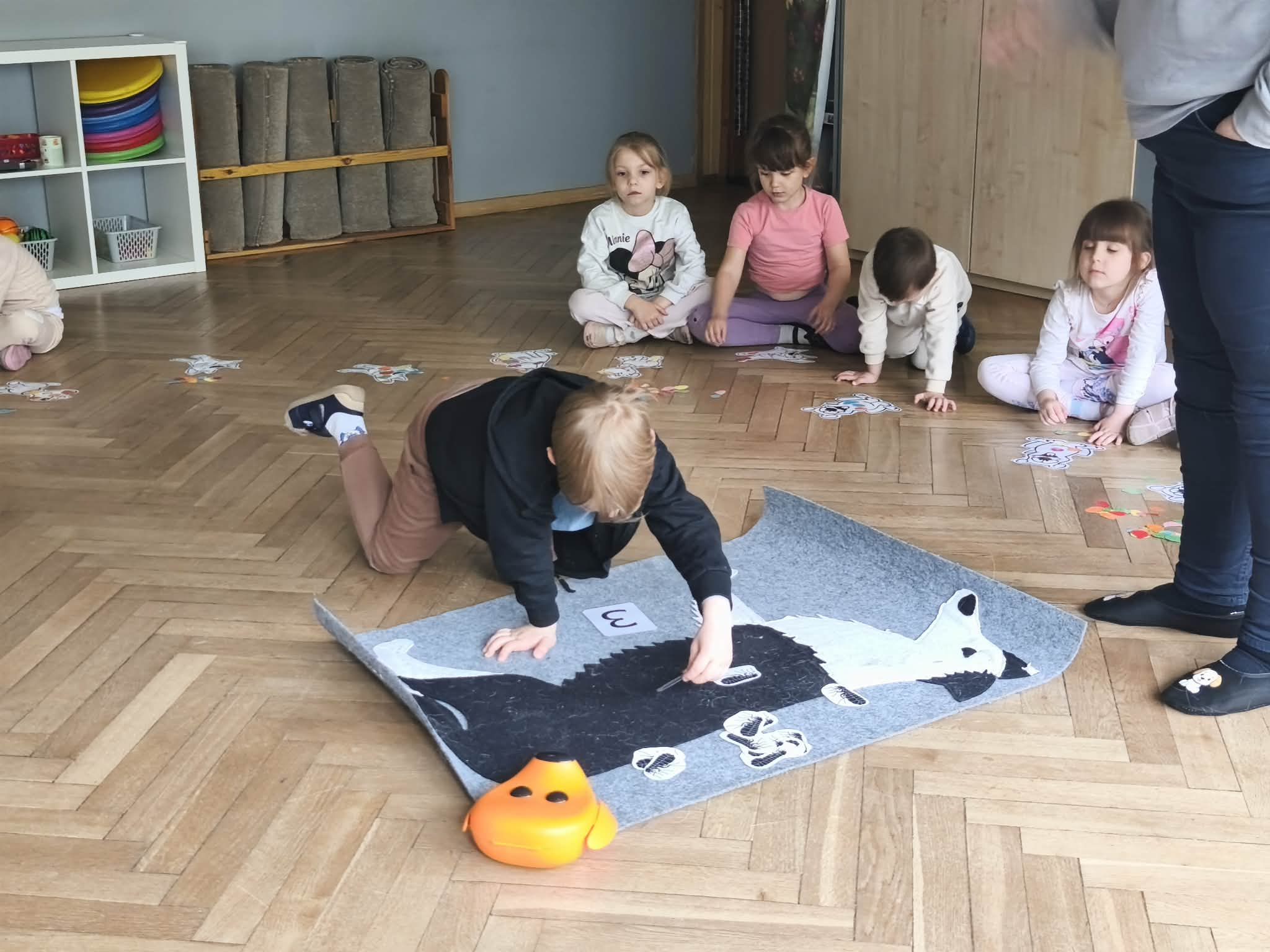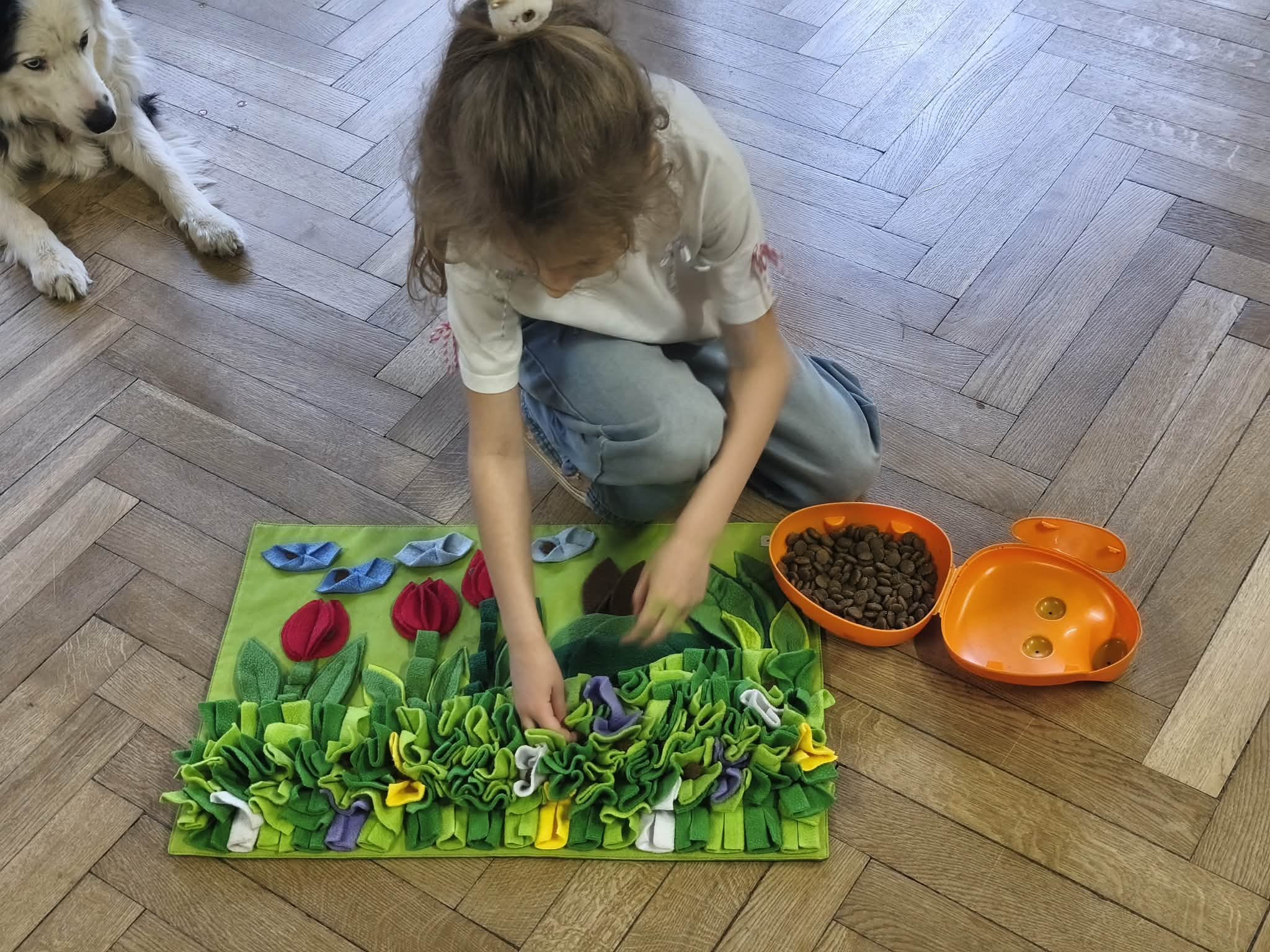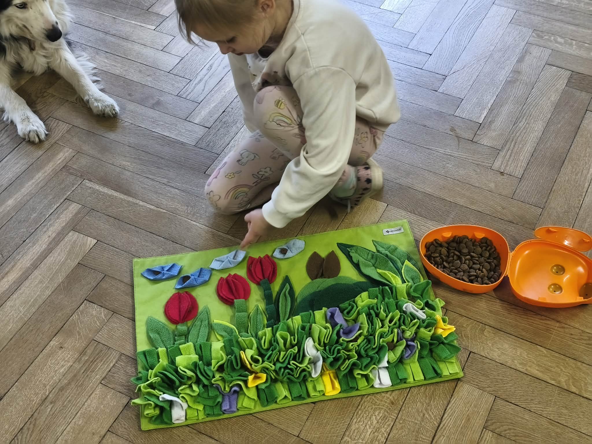 Na zakończenie zadbaliśmy o potrzeby Lily. Dzieci przygotowały dla niej wyzwanie w postaci wiosennej maty węchowej – każdy przedszkolak schował w niej smakołyk, a nasza czworonożna przyjaciółka z radością przystąpiła do ich poszukiwania.