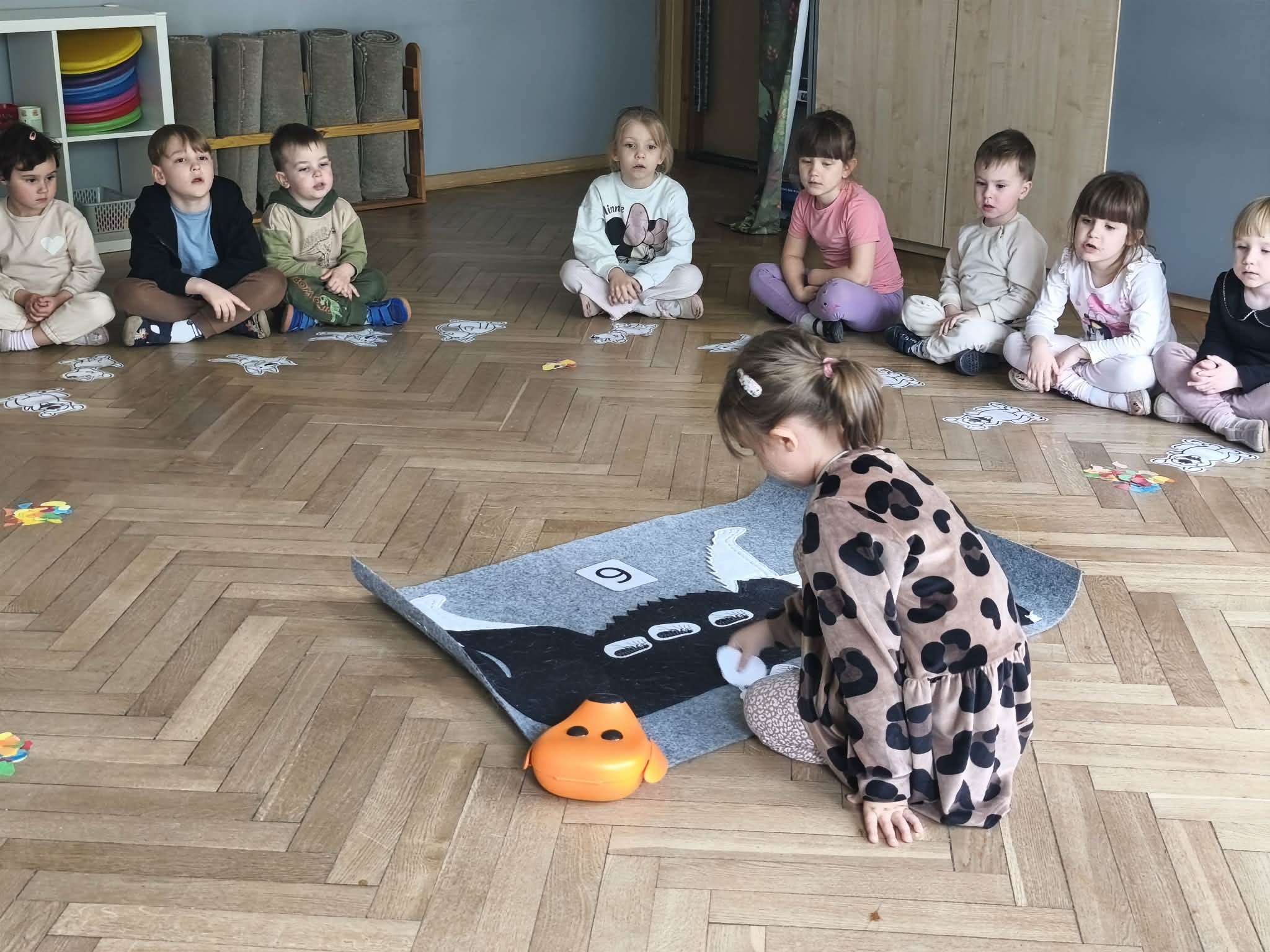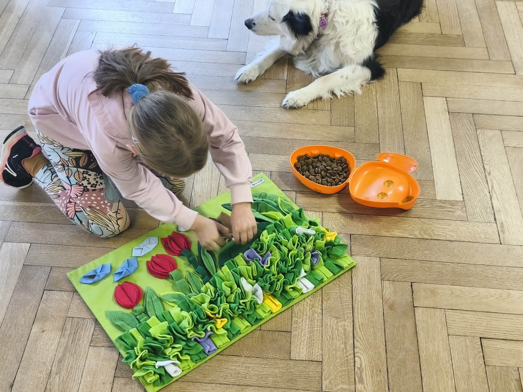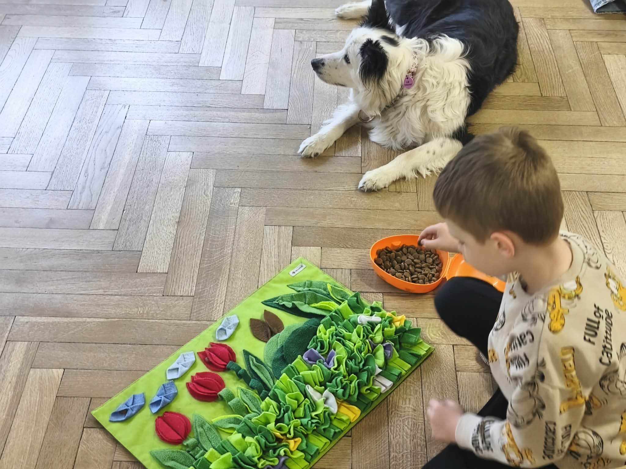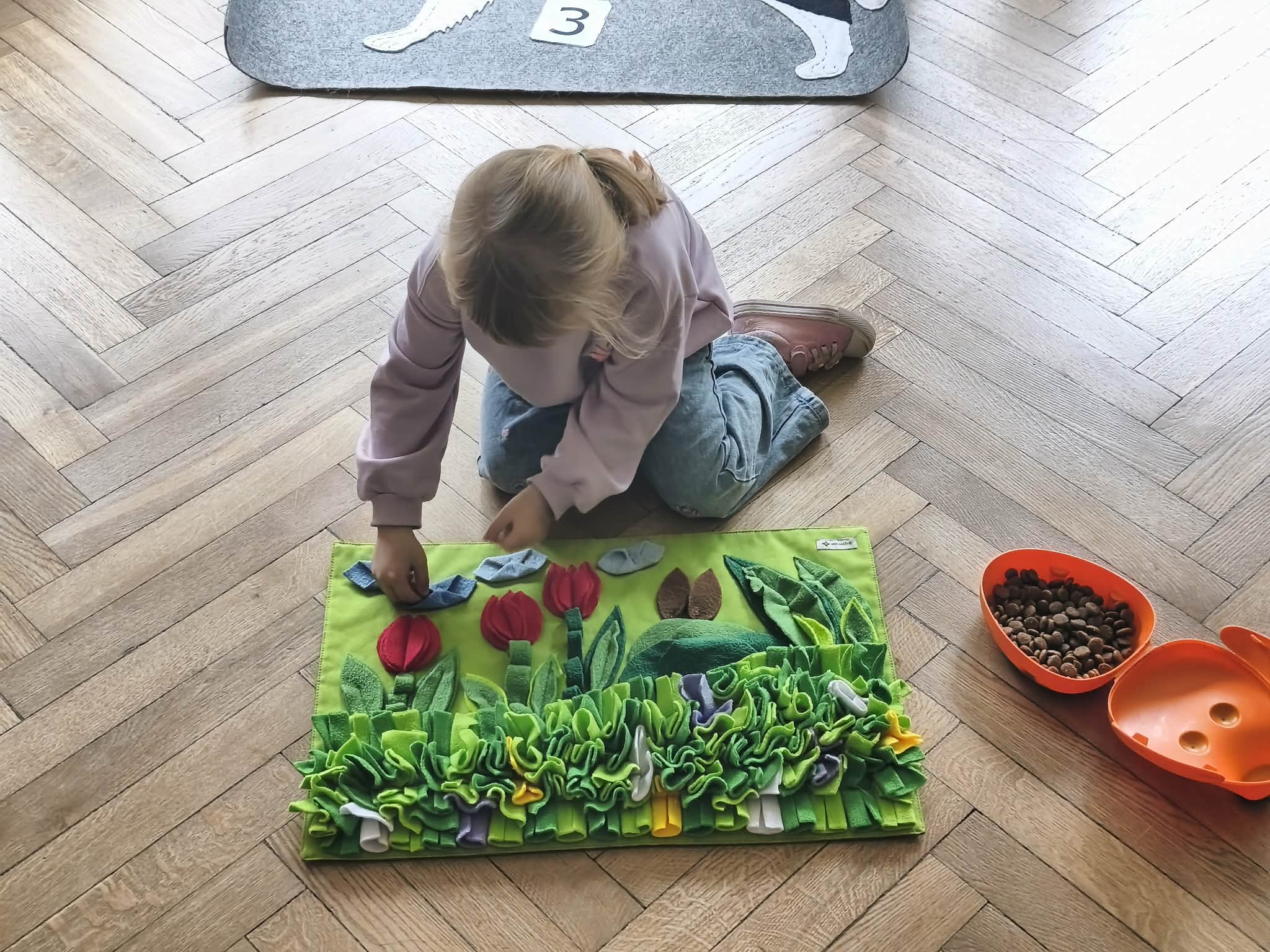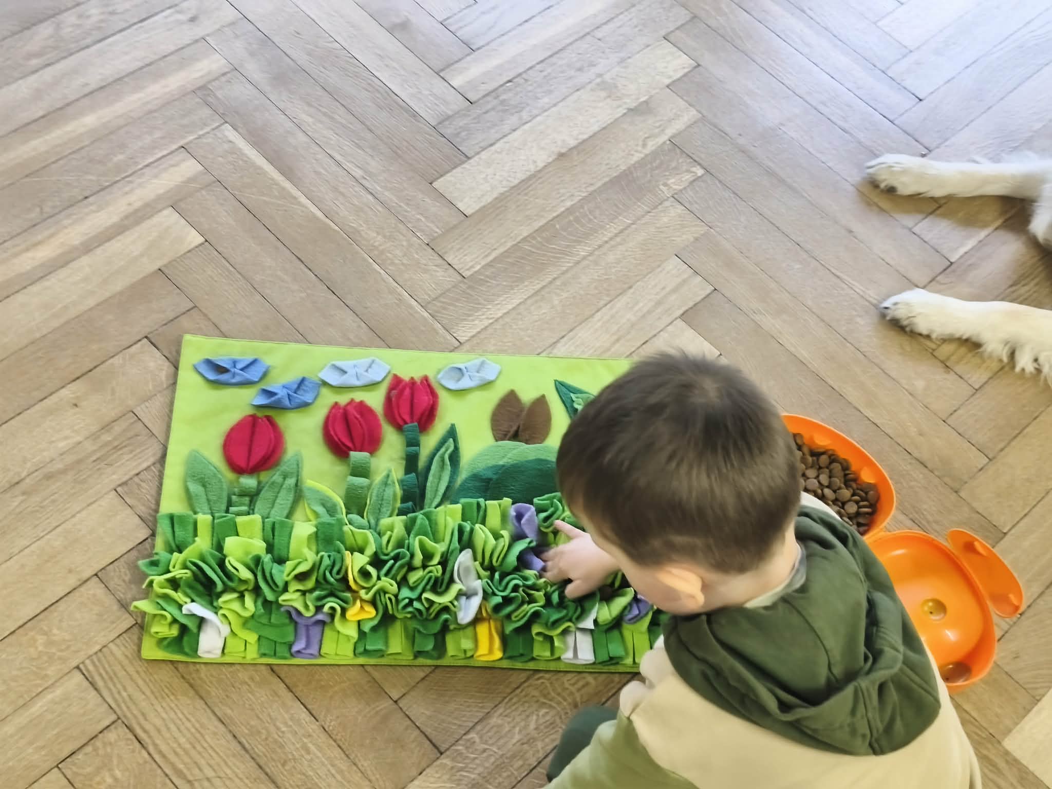 Na zakończenie zadbaliśmy o potrzeby Lily. Dzieci przygotowały dla niej wyzwanie w postaci wiosennej maty węchowej – każdy przedszkolak schował w niej smakołyk, a nasza czworonożna przyjaciółka z radością przystąpiła do ich poszukiwania.