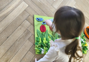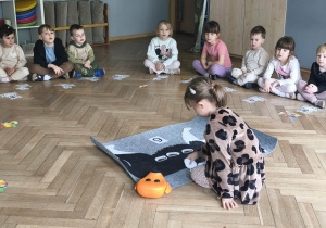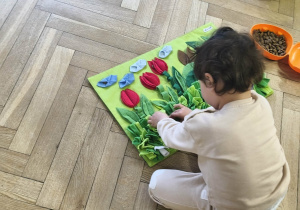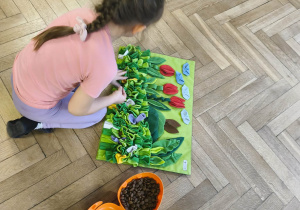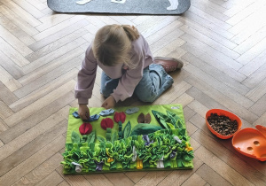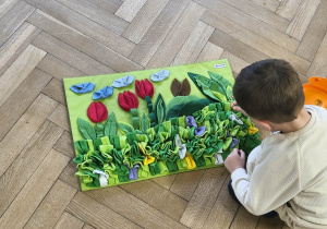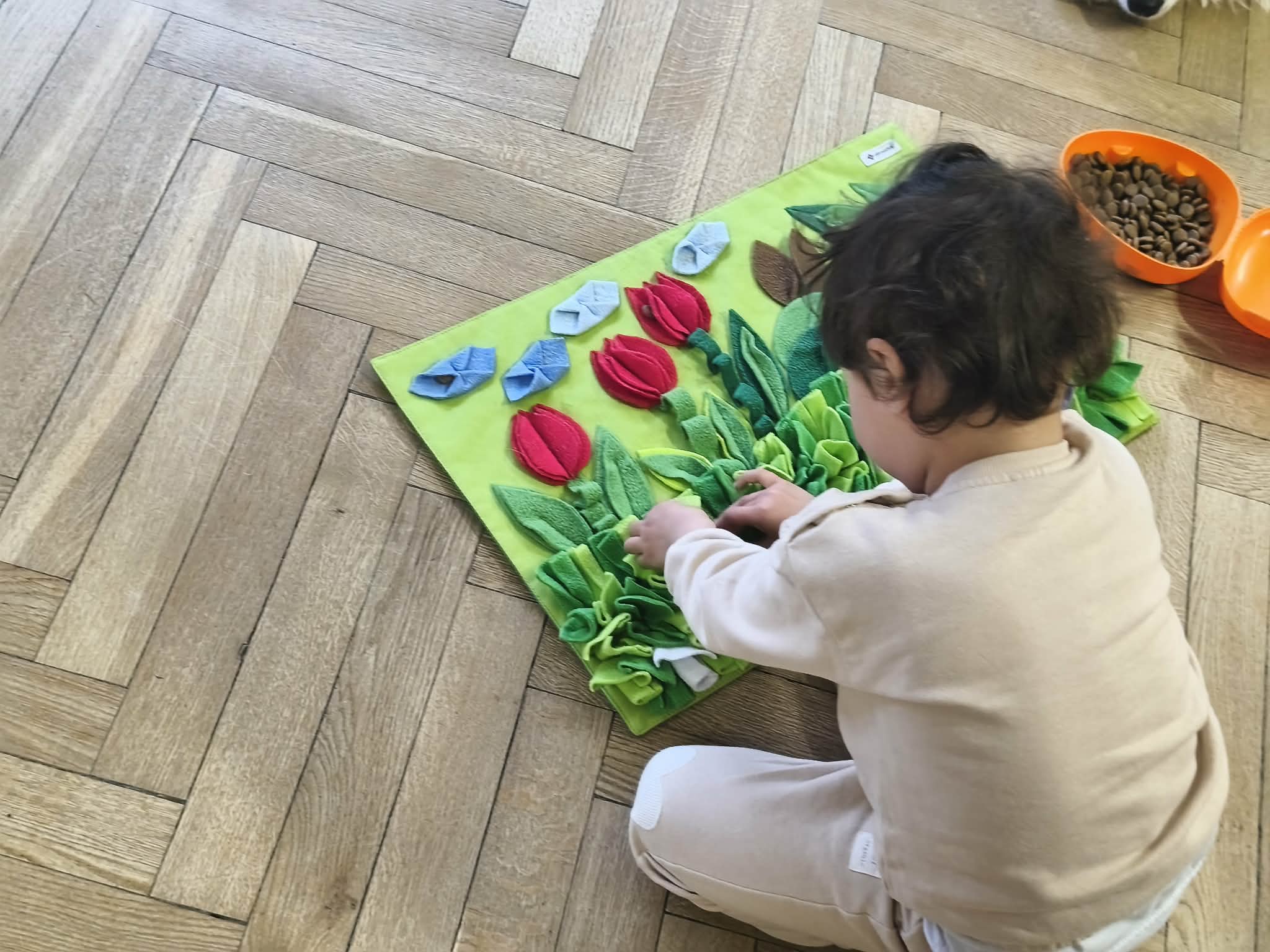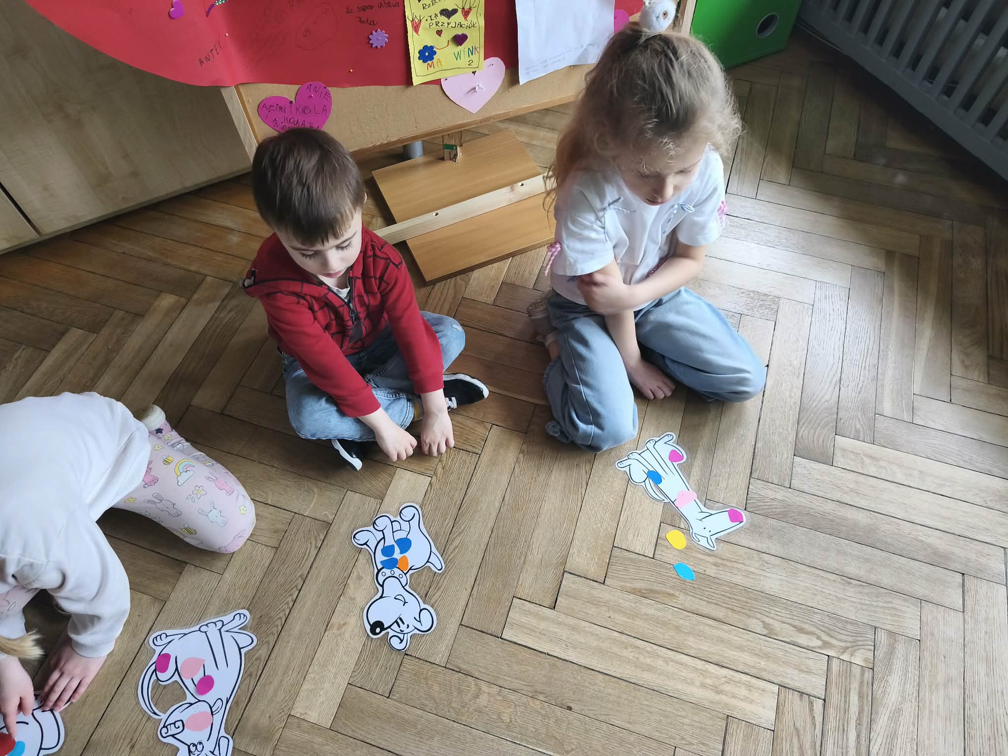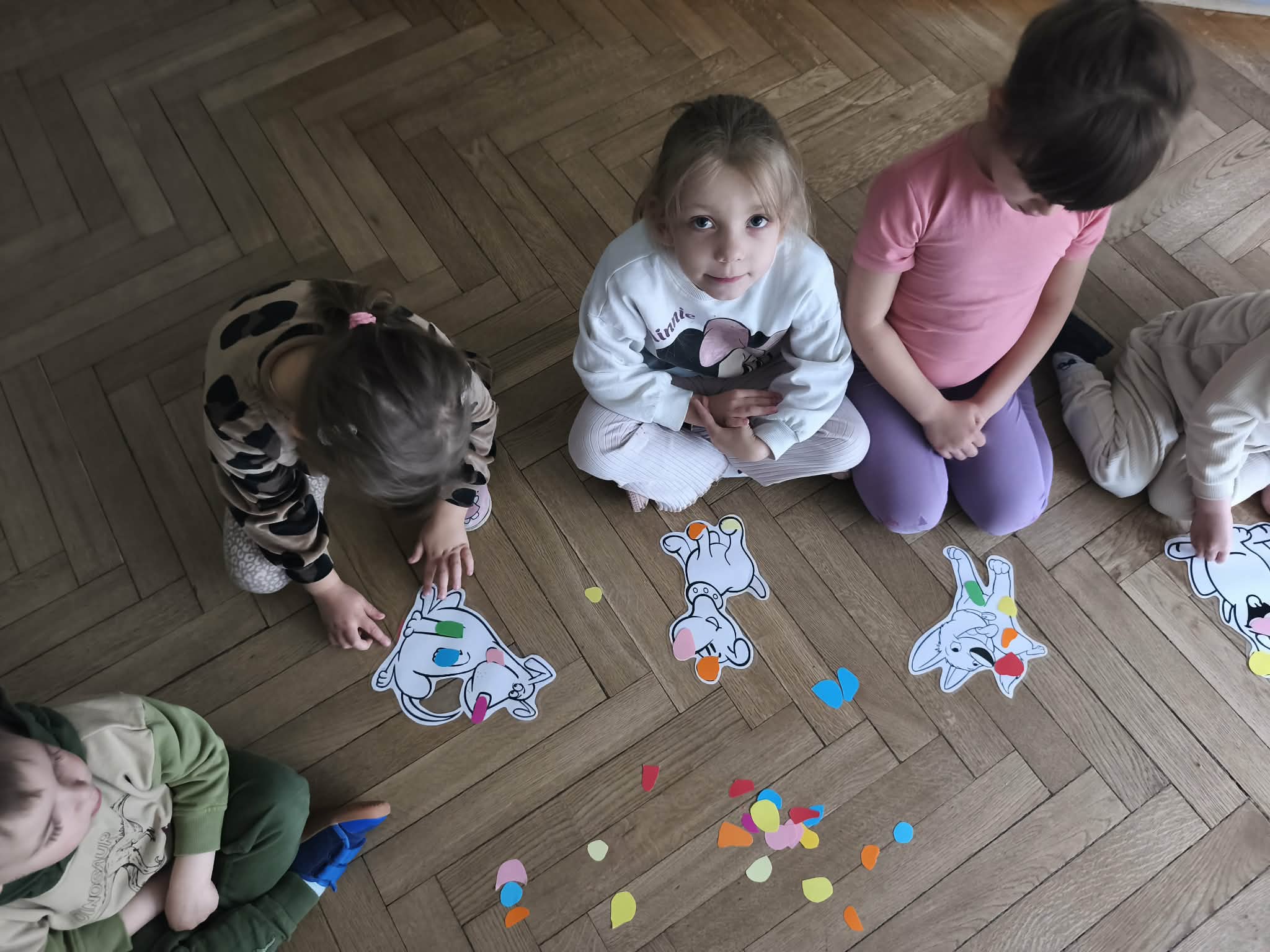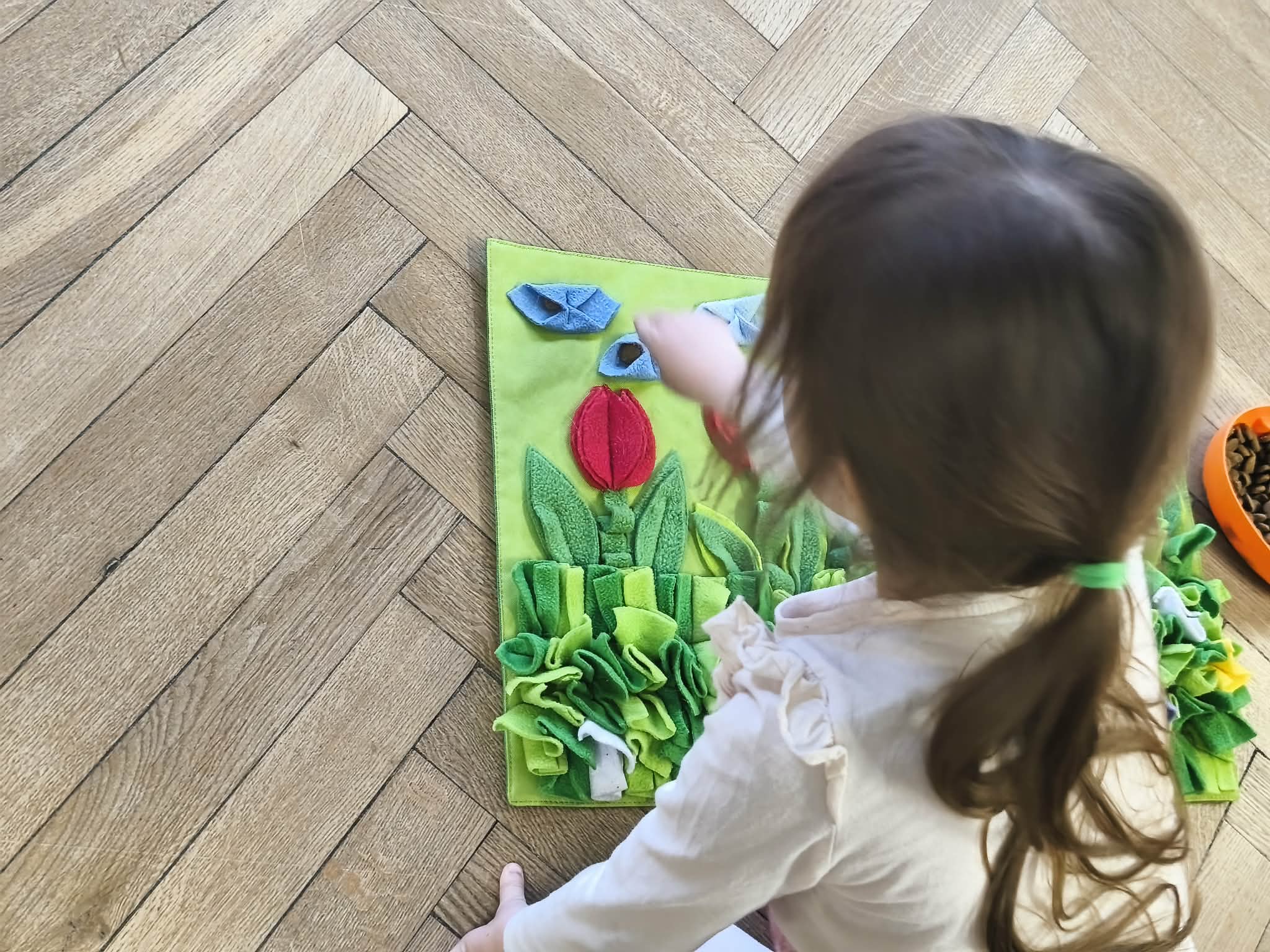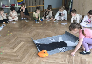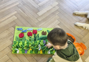 Na zakończenie zadbaliśmy o potrzeby Lily. Dzieci przygotowały dla niej wyzwanie w postaci wiosennej maty węchowej – każdy przedszkolak schował w niej smakołyk, a nasza czworonożna przyjaciółka z radością przystąpiła do ich poszukiwania.