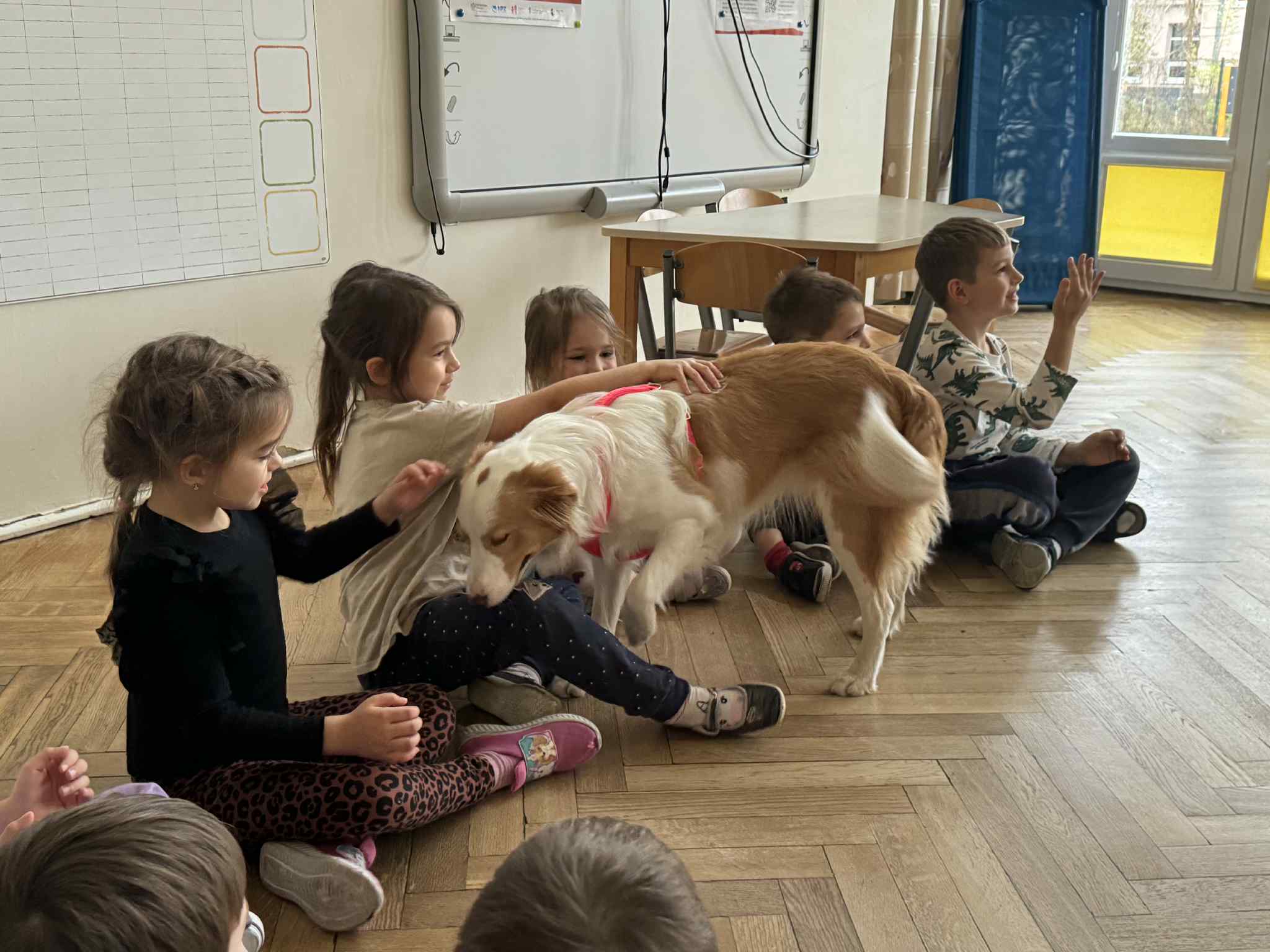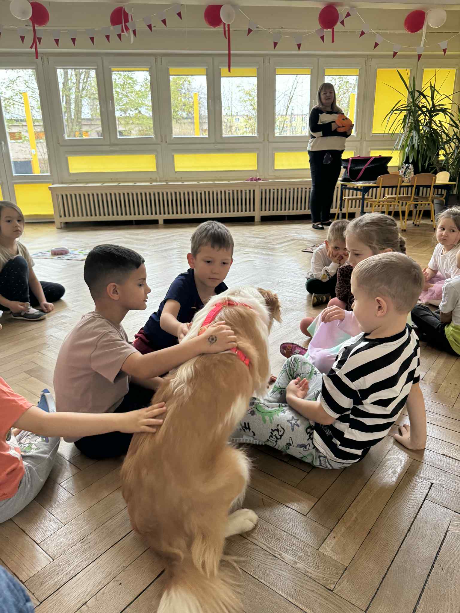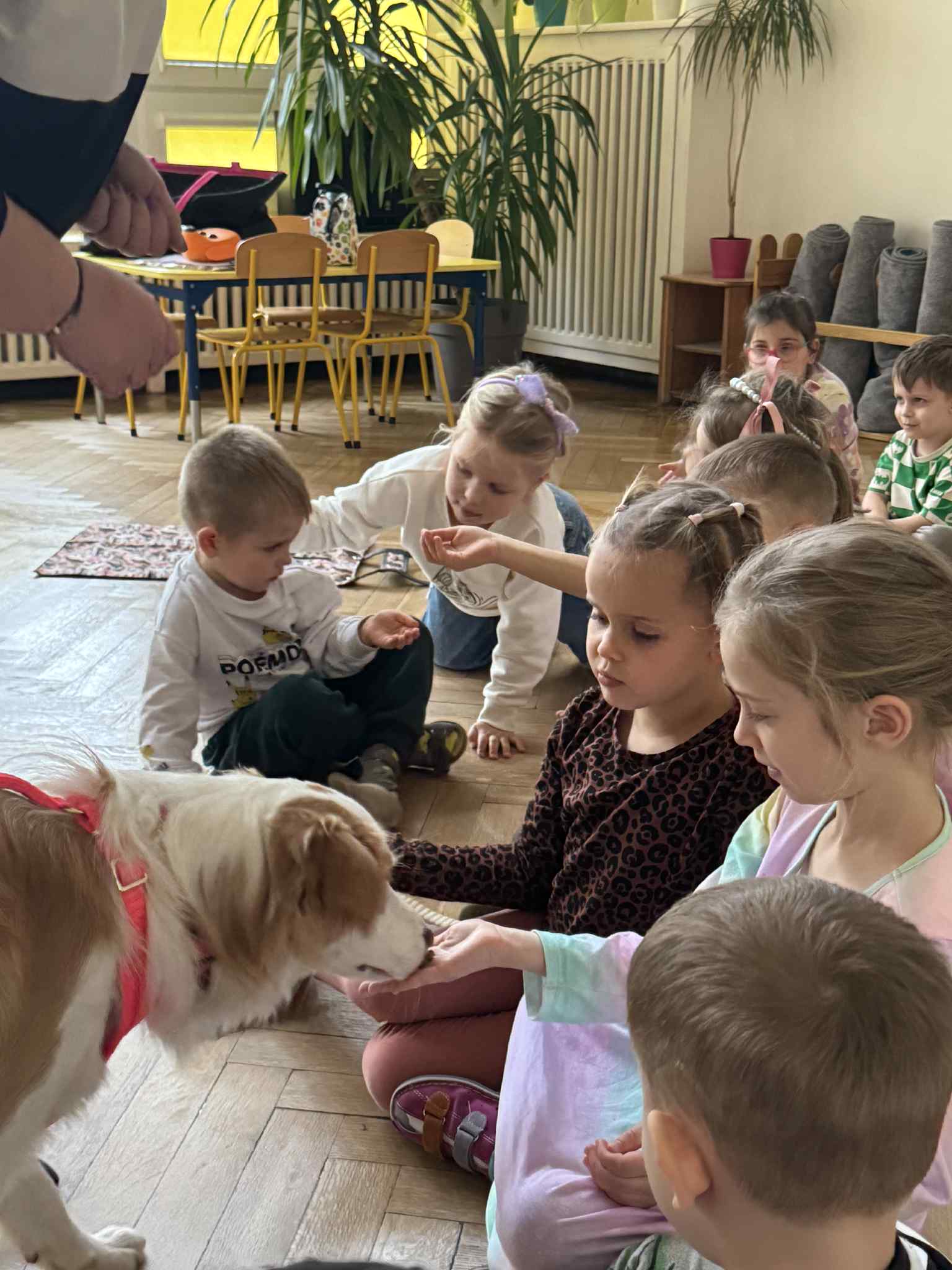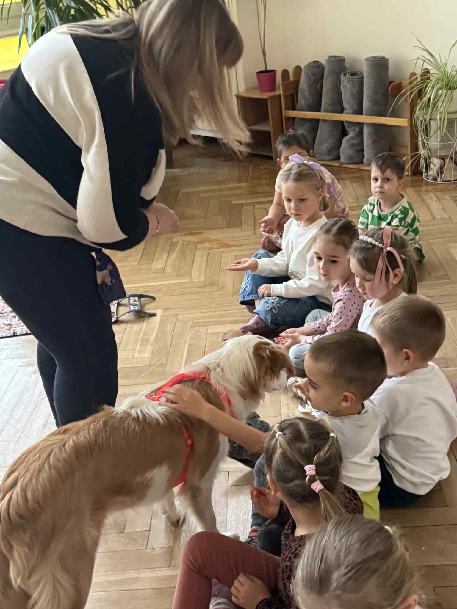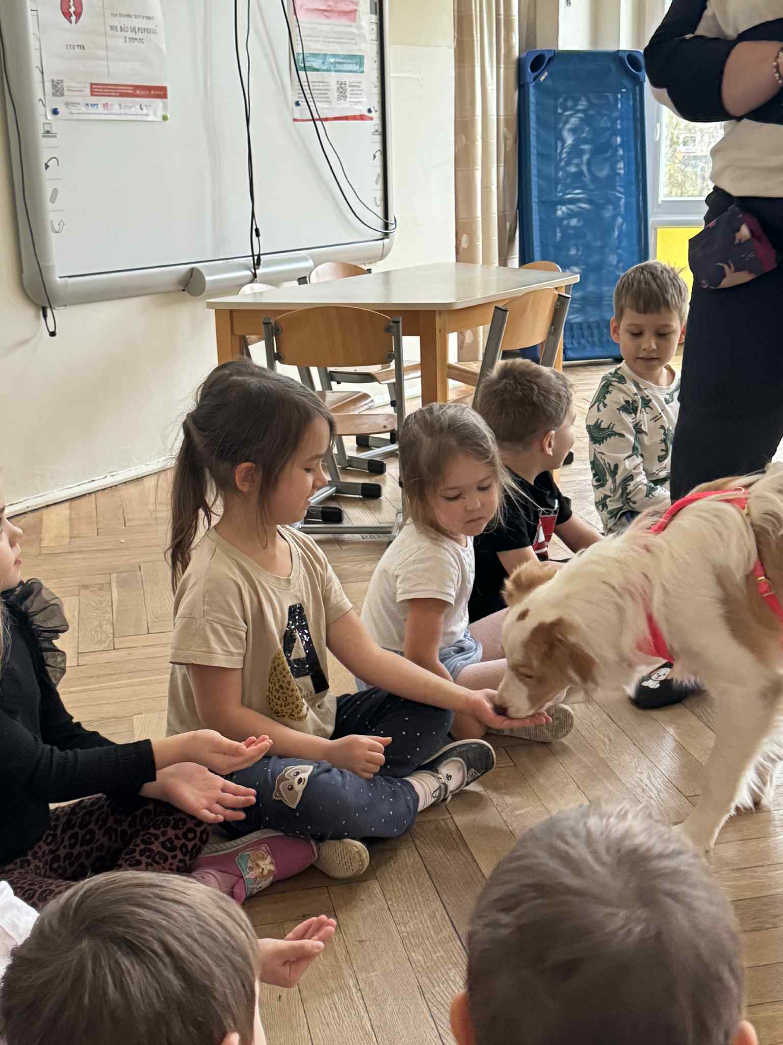 Dziś odbyły się kolejne zajęcia dogoterapii. I tu spotkała nas niespodzianka- dziś odwiedziła nas Bibi. Była jak przedszkolak- pełna radości i energii. Nie zabrakło sztuczek, dawania przysmaków i głaskania. Dzieci rozmawiały o częściach ciała psa i zaznaczały je na planszy.
