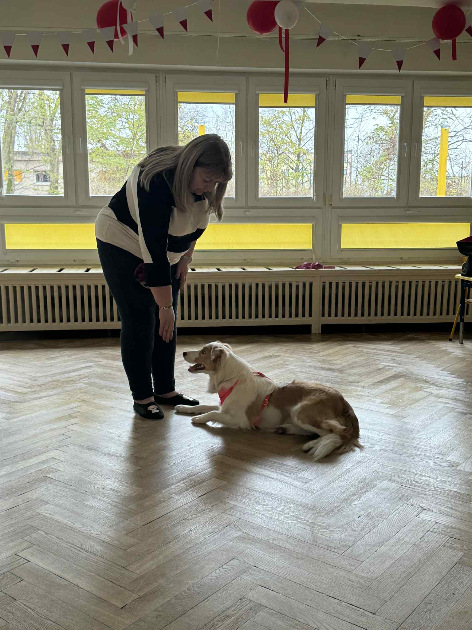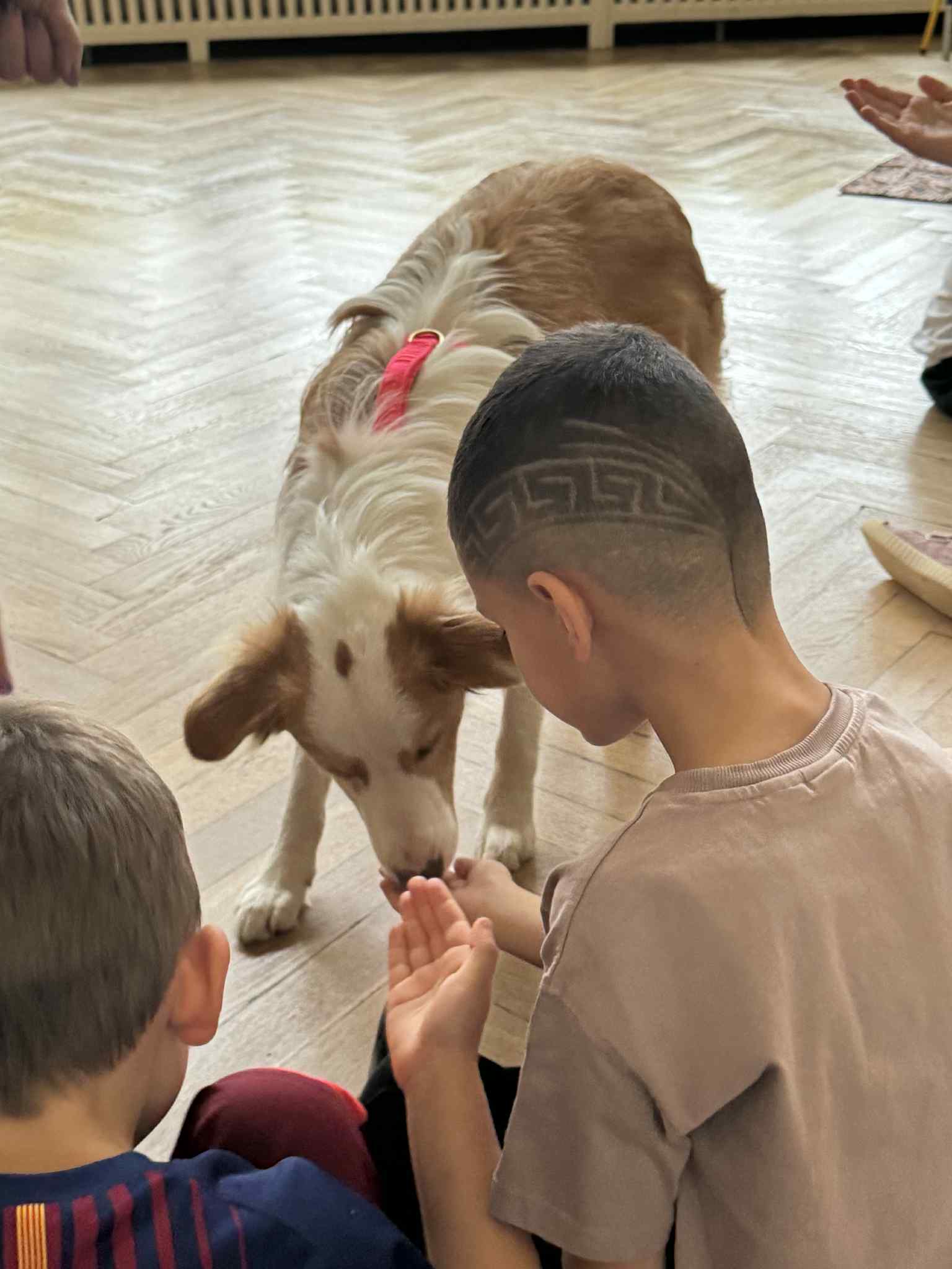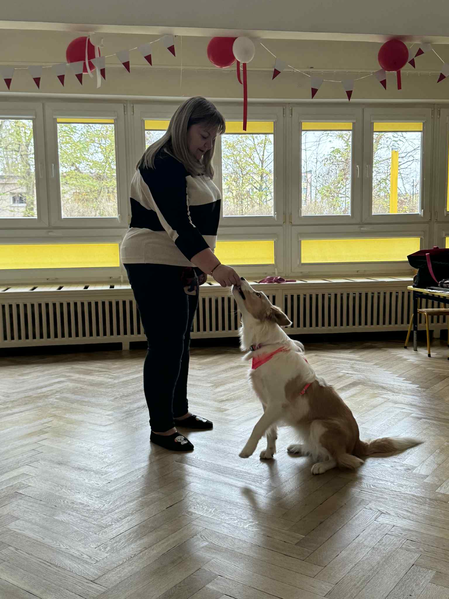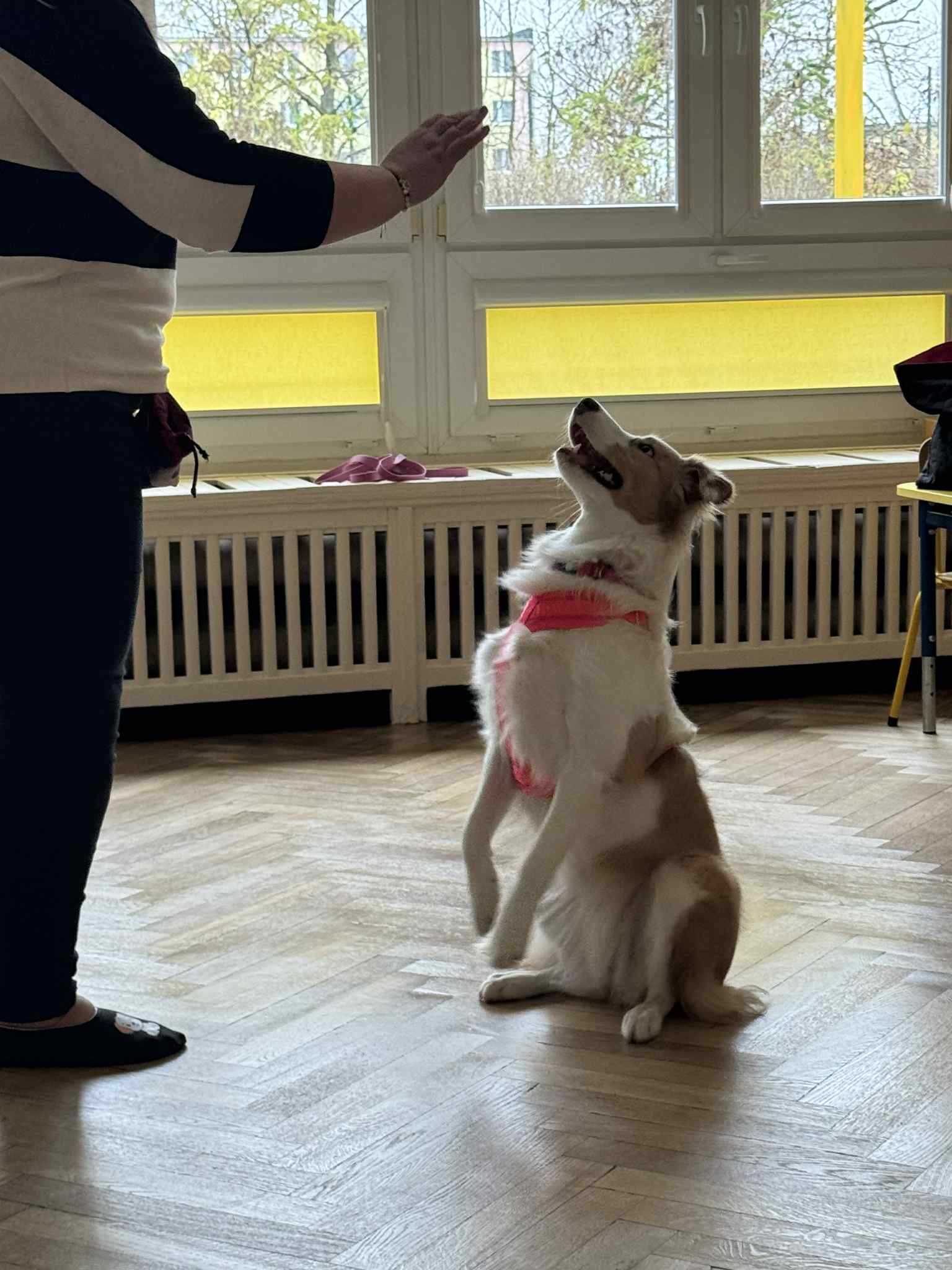 Dziś odbyły się kolejne zajęcia dogoterapii. I tu spotkała nas niespodzianka- dziś odwiedziła nas Bibi. Była jak przedszkolak- pełna radości i energii. Nie zabrakło sztuczek, dawania przysmaków i głaskania. Dzieci rozmawiały o częściach ciała psa i zaznaczały je na planszy.