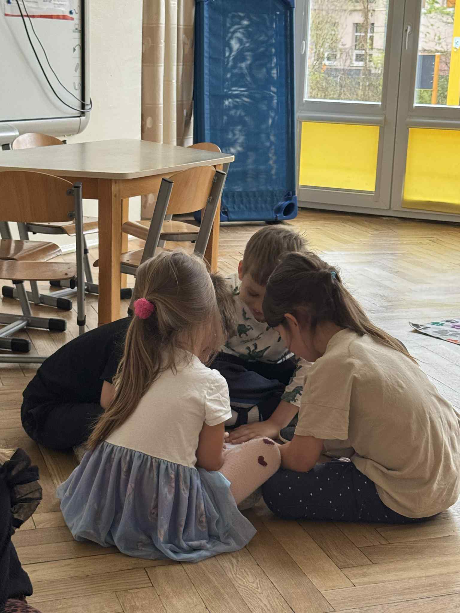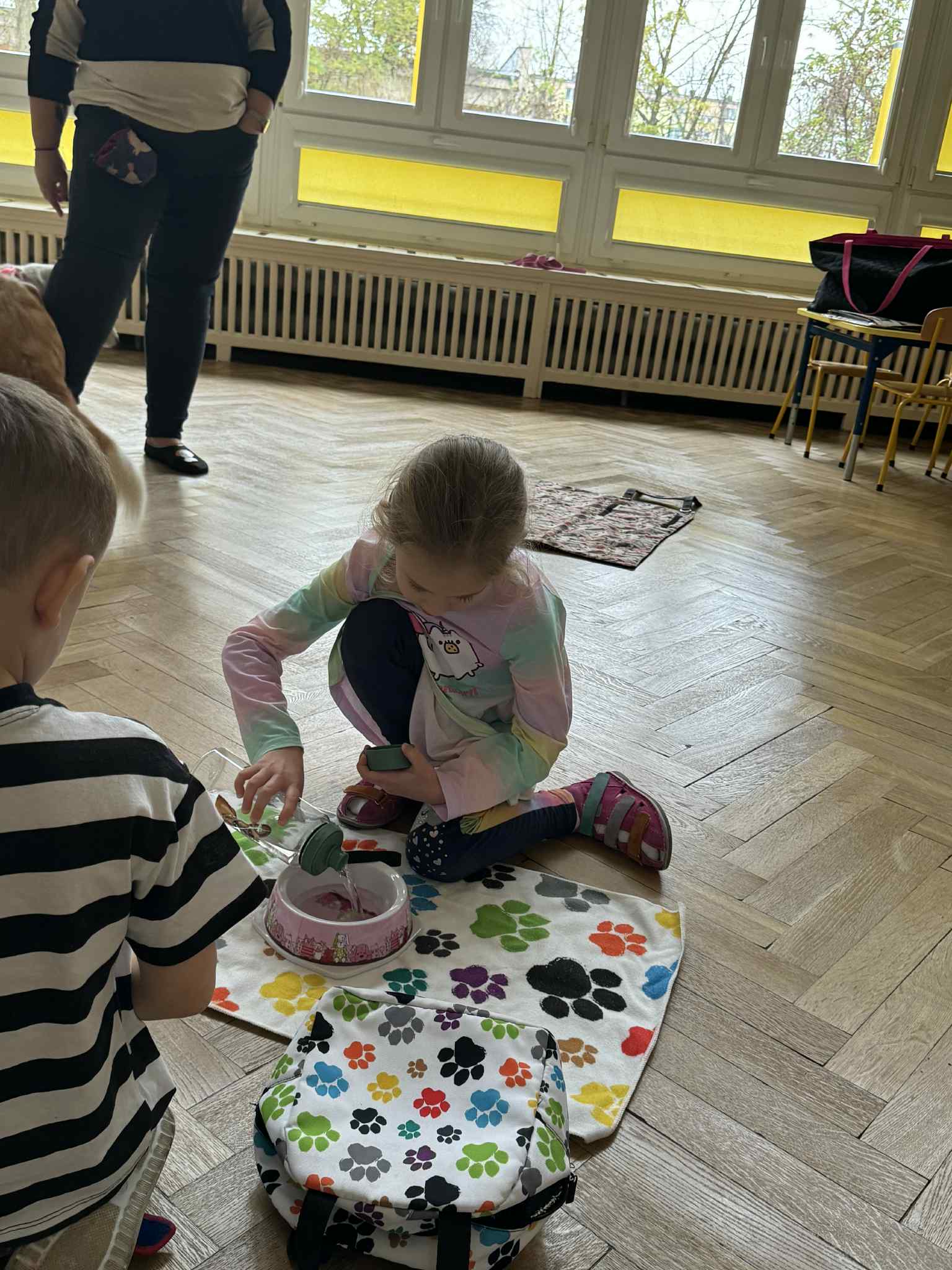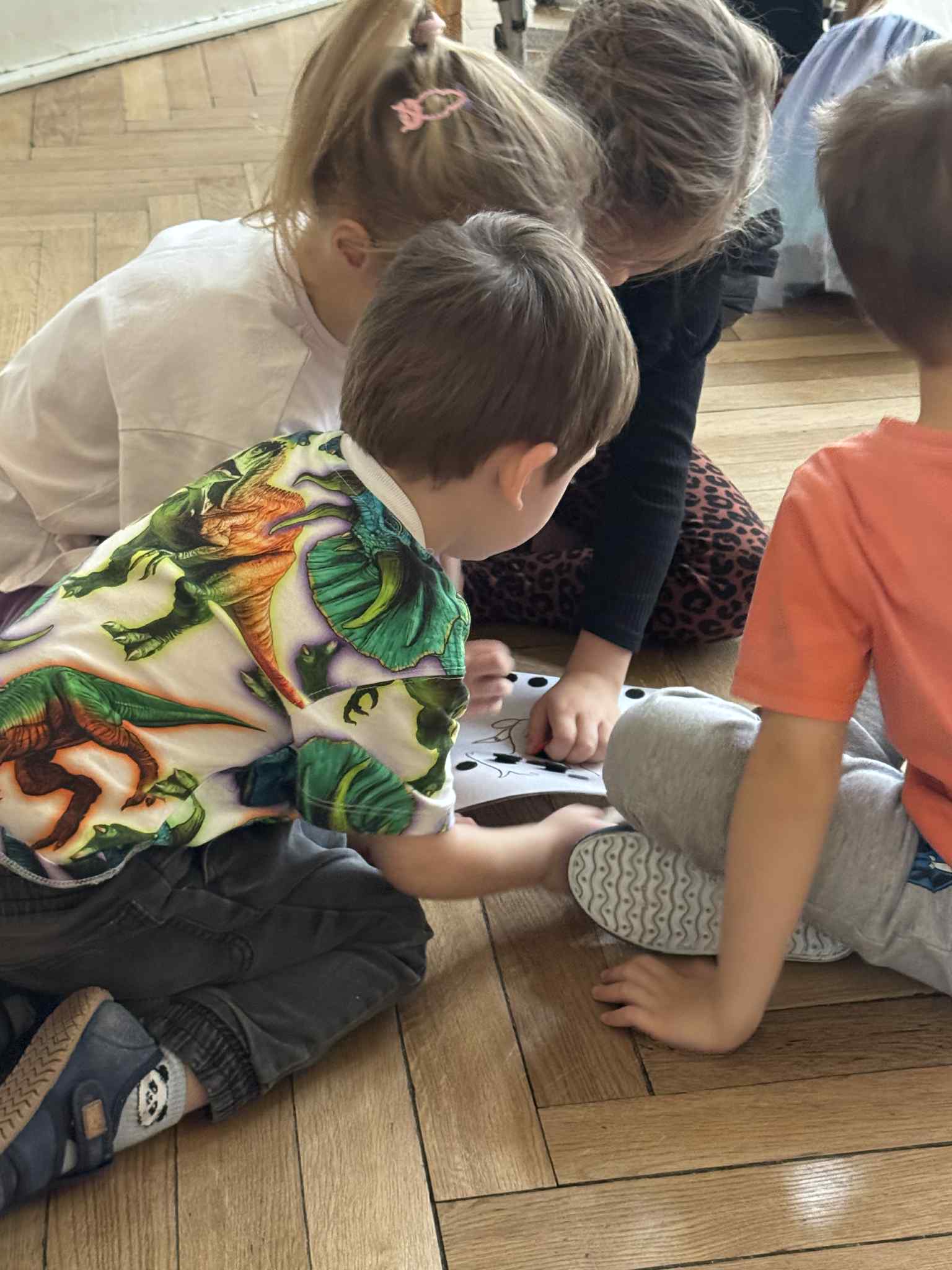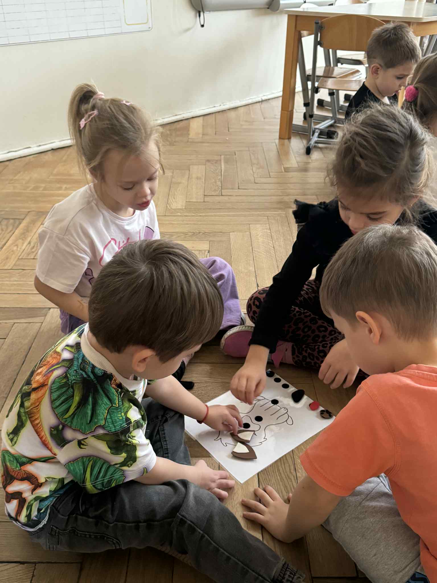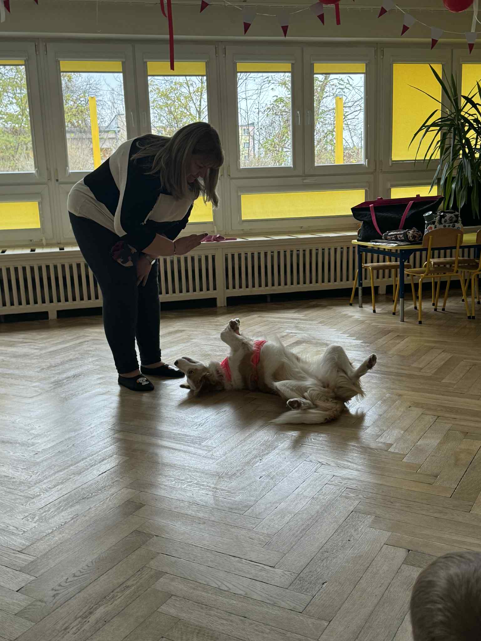 Dziś odbyły się kolejne zajęcia dogoterapii. I tu spotkała nas niespodzianka- dziś odwiedziła nas Bibi. Była jak przedszkolak- pełna radości i energii. Nie zabrakło sztuczek, dawania przysmaków i głaskania. Dzieci rozmawiały o częściach ciała psa i zaznaczały je na planszy.