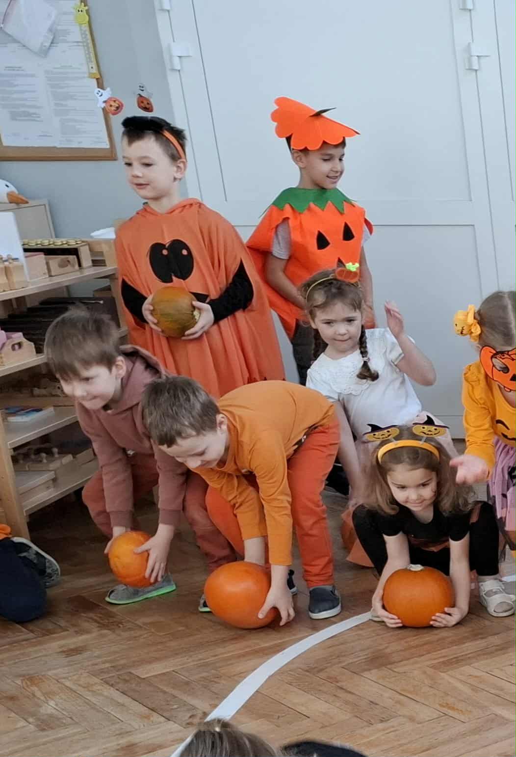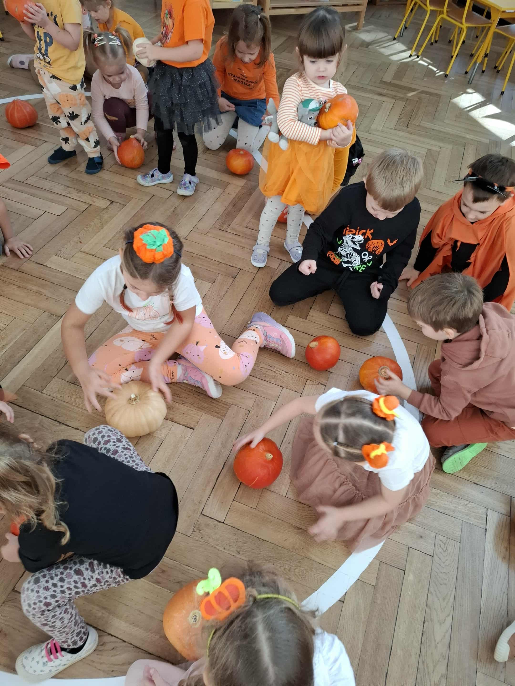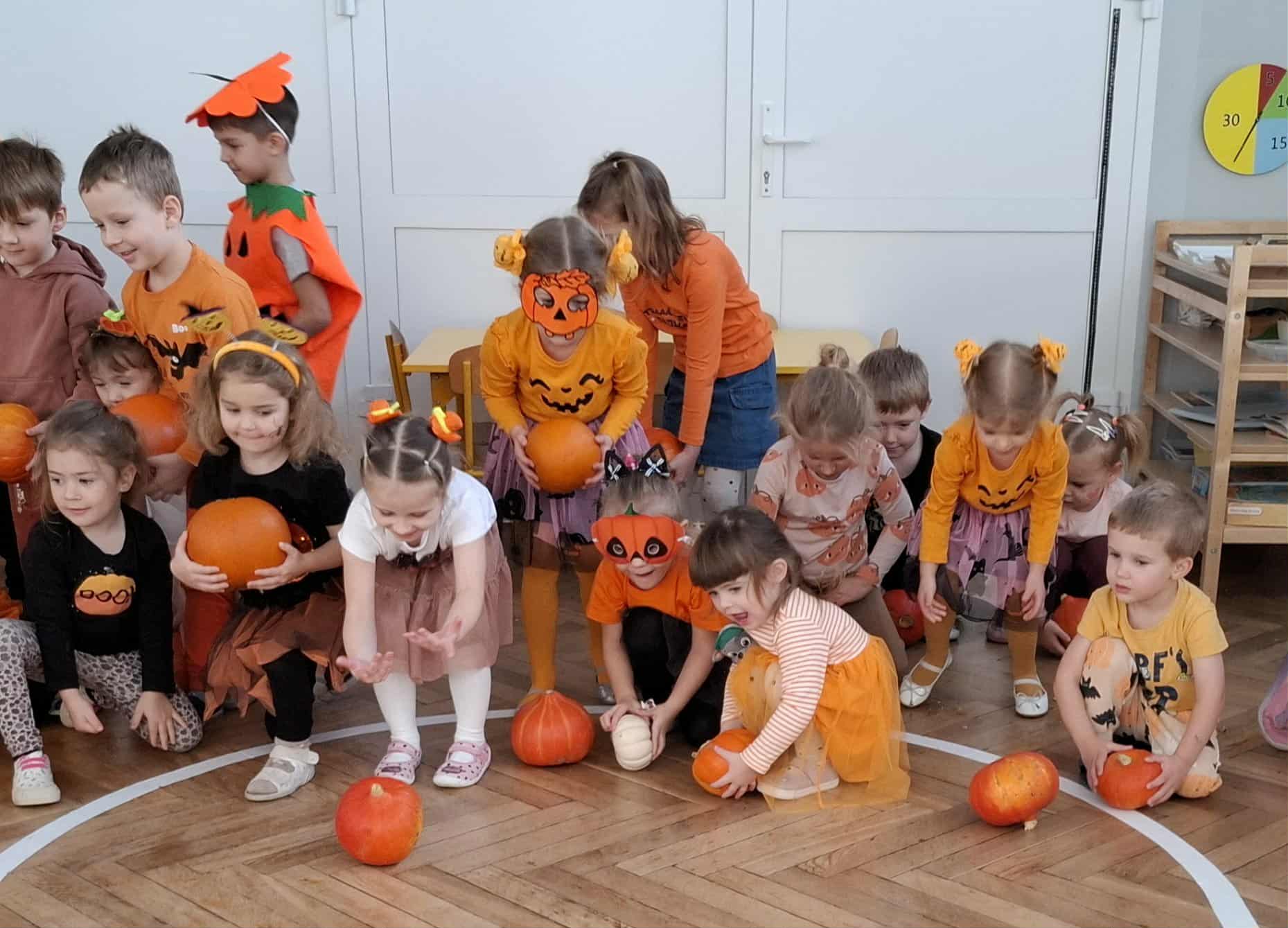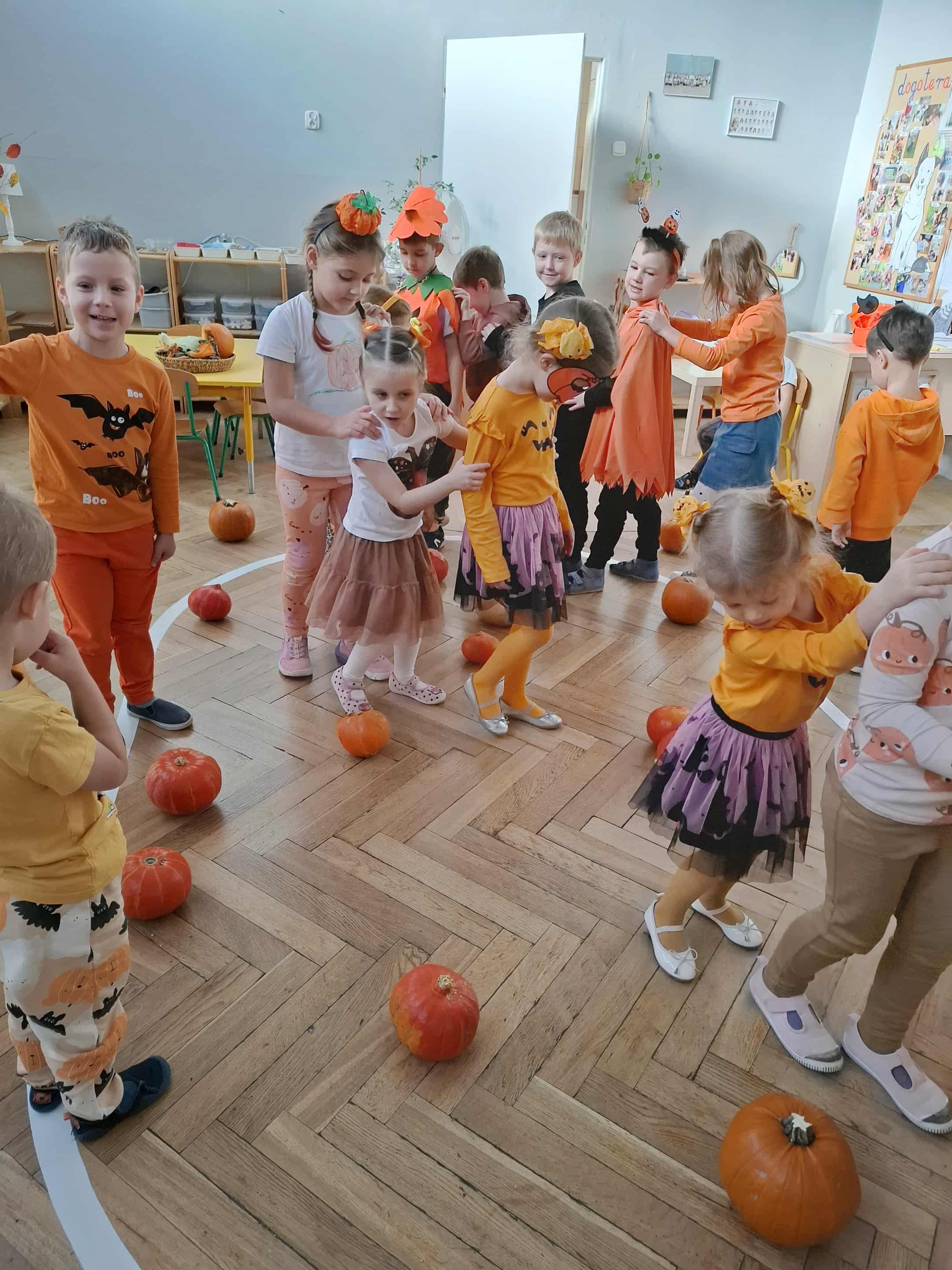 W piątek zrobiło się jak w dyniowym królestwie! Dzieci w pomarańczowych strojach i dyniowych przebraniach zamieniły salę w pole pełne radosnych… warzyw! Okazało się, że dynia to nie tylko pyszne jedzonko, ale też super zabawka – świetnie się toczy, kręci, może udawać pachołek do toru przeszkód, a nawet bęben, na którym grają tylko prawdziwi dyniowi muzycy! Nasza Amelka przygotował dla wszystkich dyniową niespodziankę i przyniosła dyniowe smakołyki - pychota. Pomarańczowa energia rozlała się po całym sali...