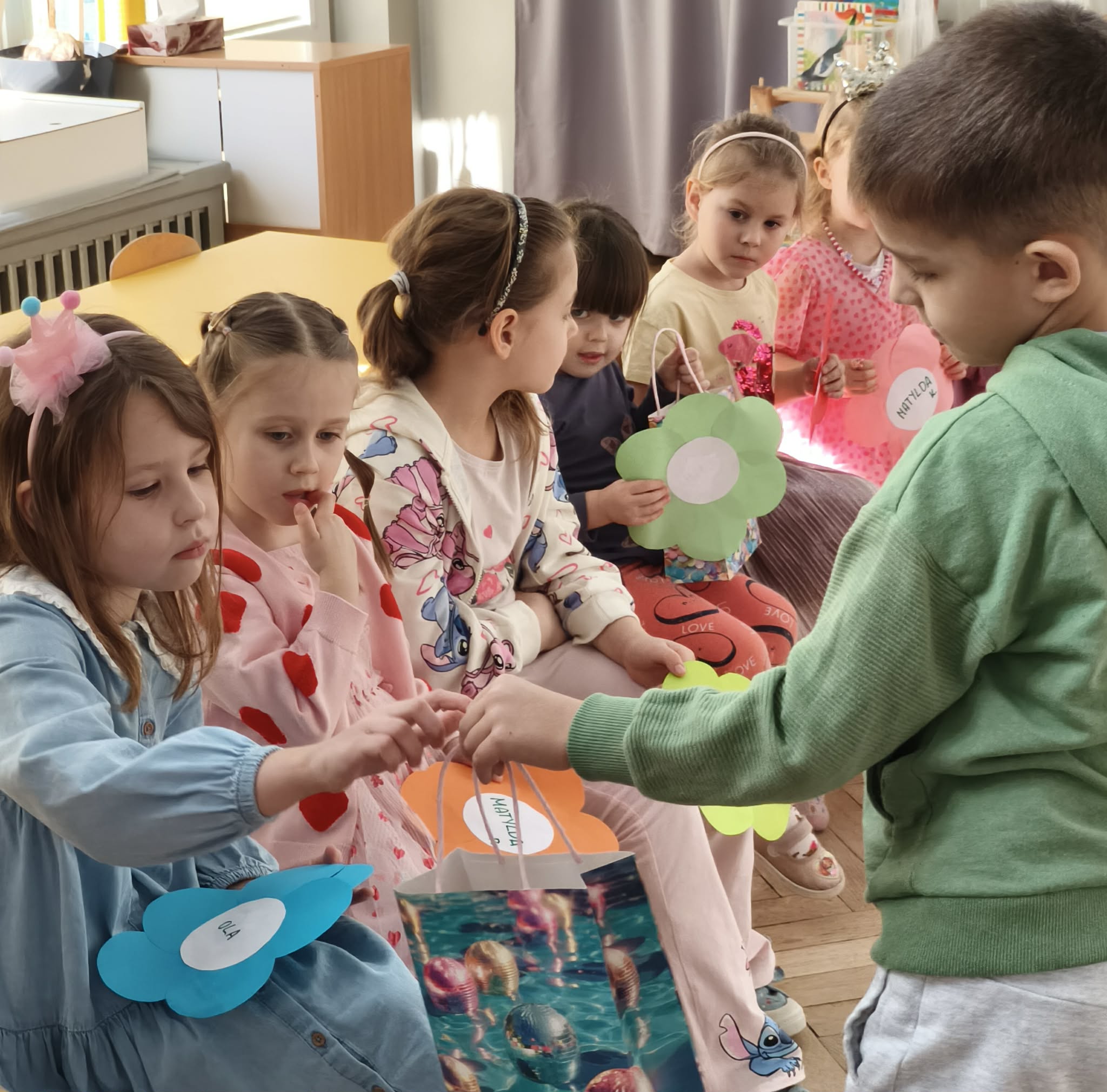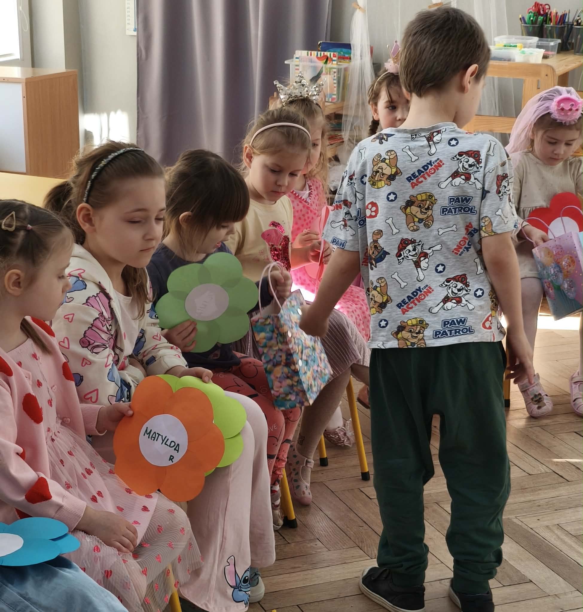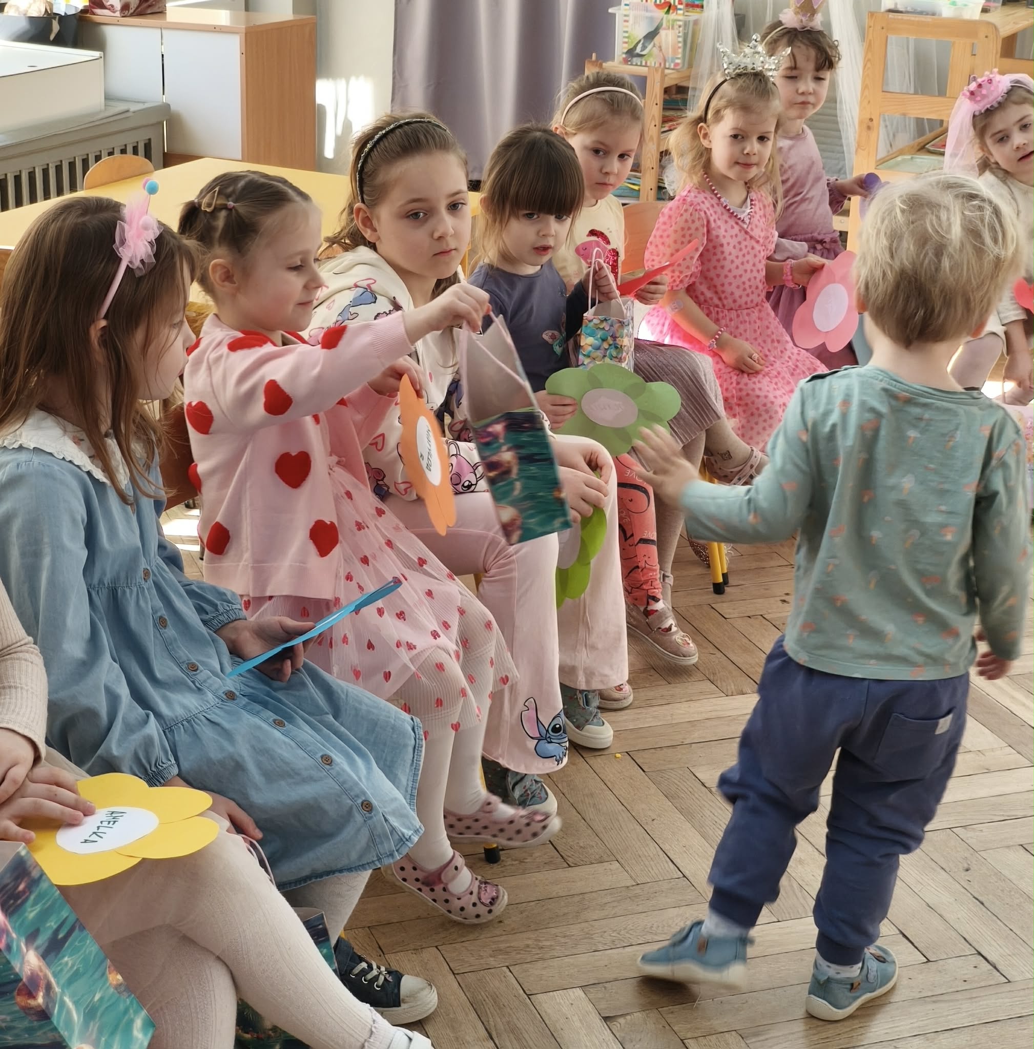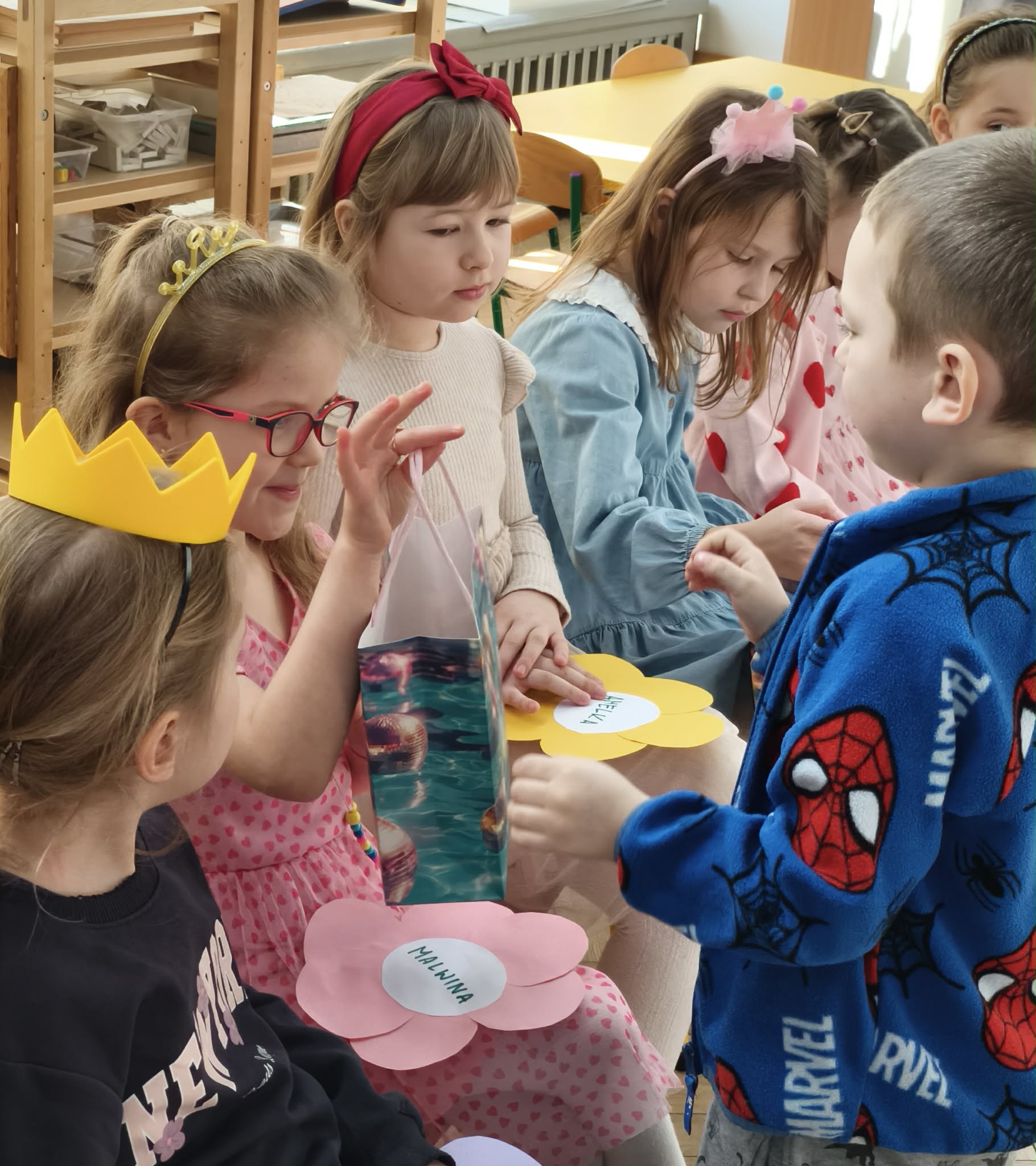 W dniu dzisiejszym obchodziliśmy Dzień Kobiet. Wszystkie nasze Królewny jak prawdziwe damy otrzymały od chłopców własnoręcznie wykonane kwiatki. Chłopcy również zamienili się w jubilerów i wykonywali bransoletki wg gustów dziewczynek. Nie obyło się również bez upominków, które wręczali chłopcy. W tym dniu praca z materiałem także odbywała się w parach damsko - męskich. Z pewnością był to wyjątkowy czas.