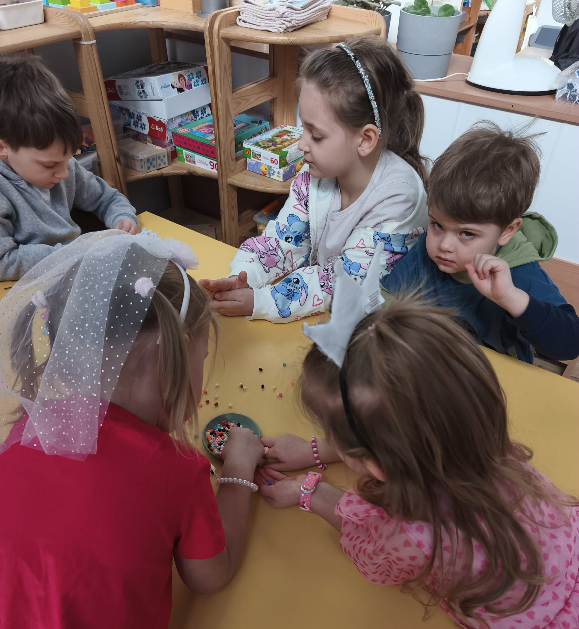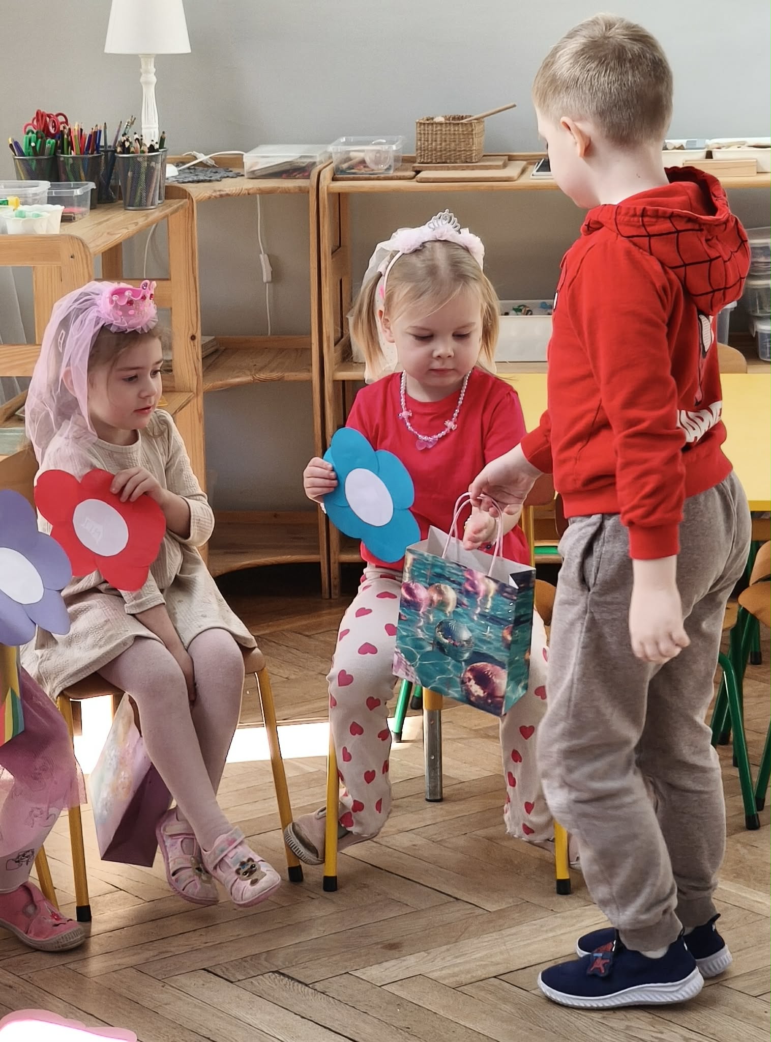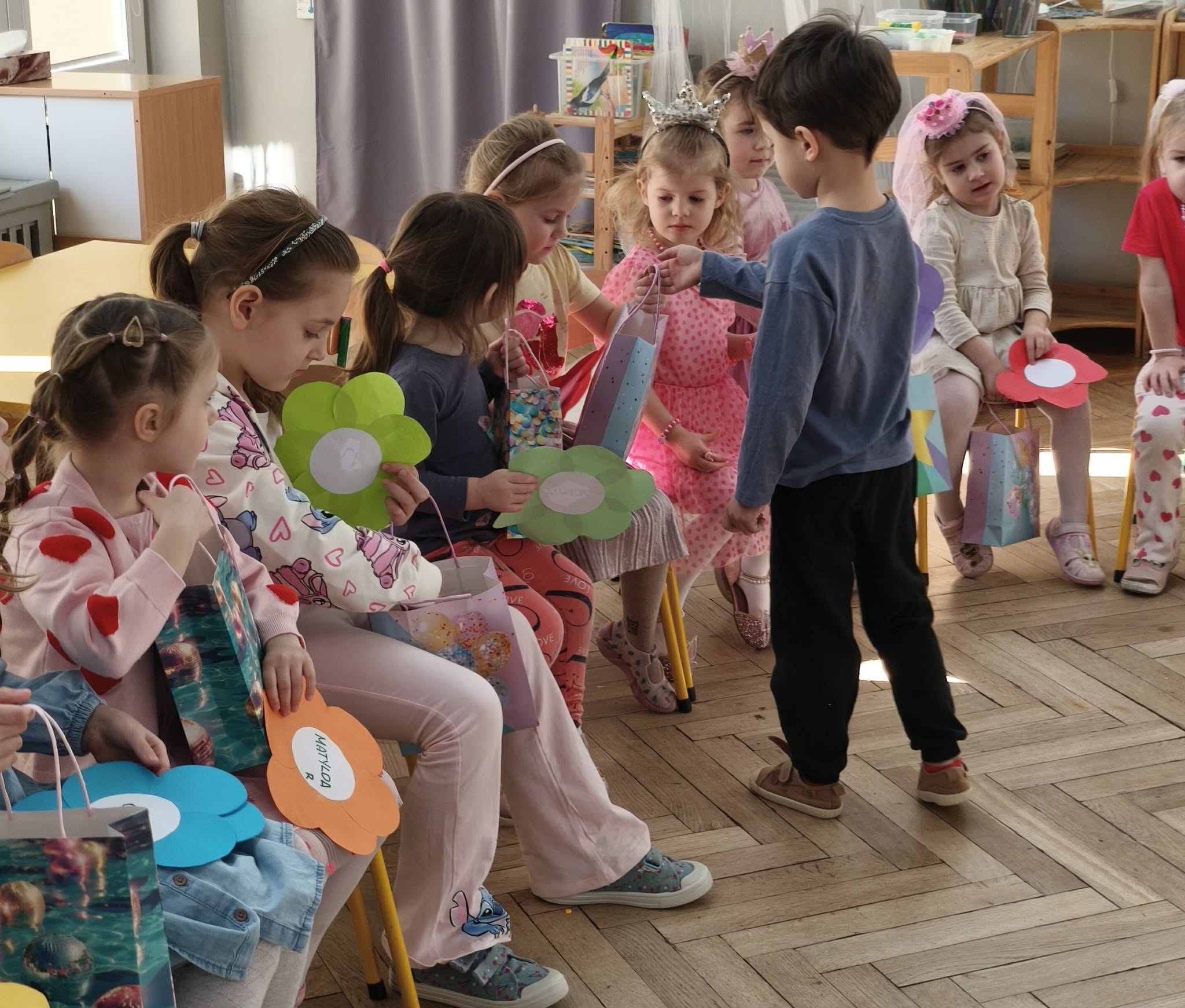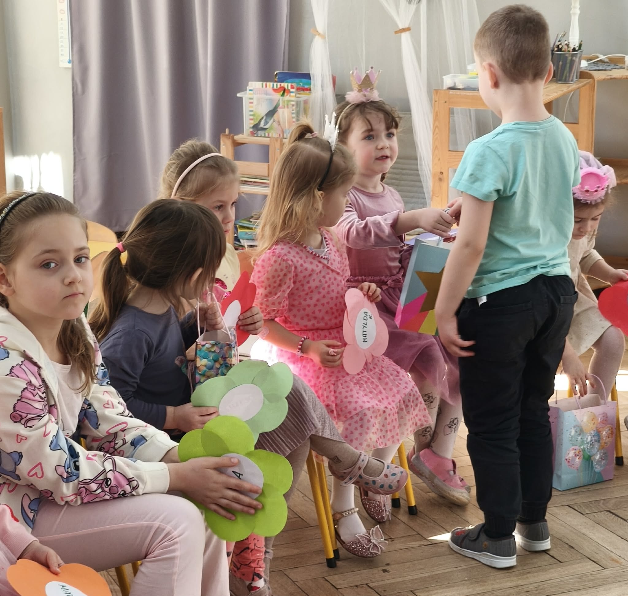W dniu dzisiejszym obchodziliśmy Dzień Kobiet. Wszystkie nasze Królewny jak prawdziwe damy otrzymały od chłopców własnoręcznie wykonane kwiatki. Chłopcy również zamienili się w jubilerów i wykonywali bransoletki wg gustów dziewczynek. Nie obyło się również bez upominków, które wręczali chłopcy. W tym dniu praca z materiałem także odbywała się w parach damsko - męskich. Z pewnością był to wyjątkowy czas.