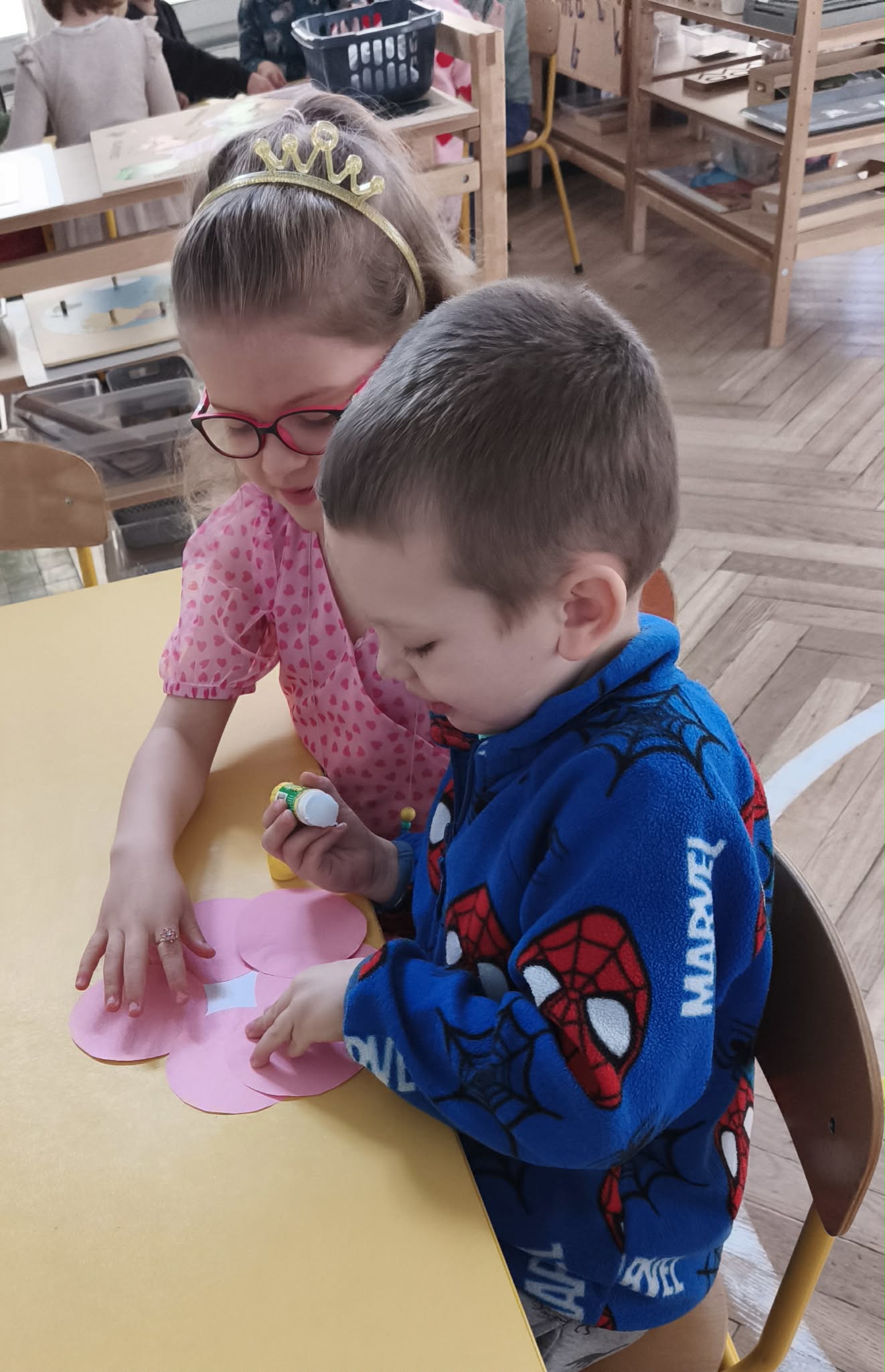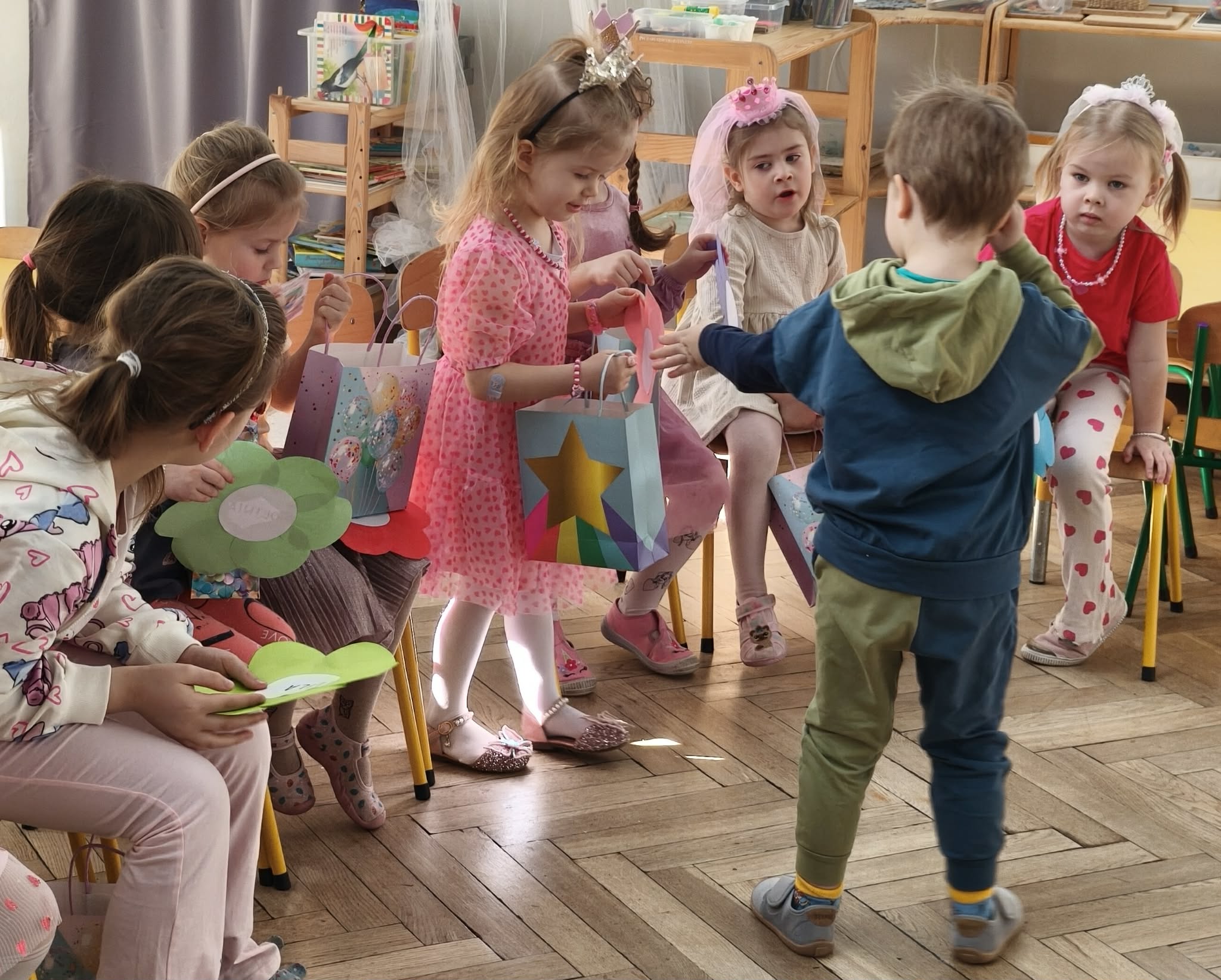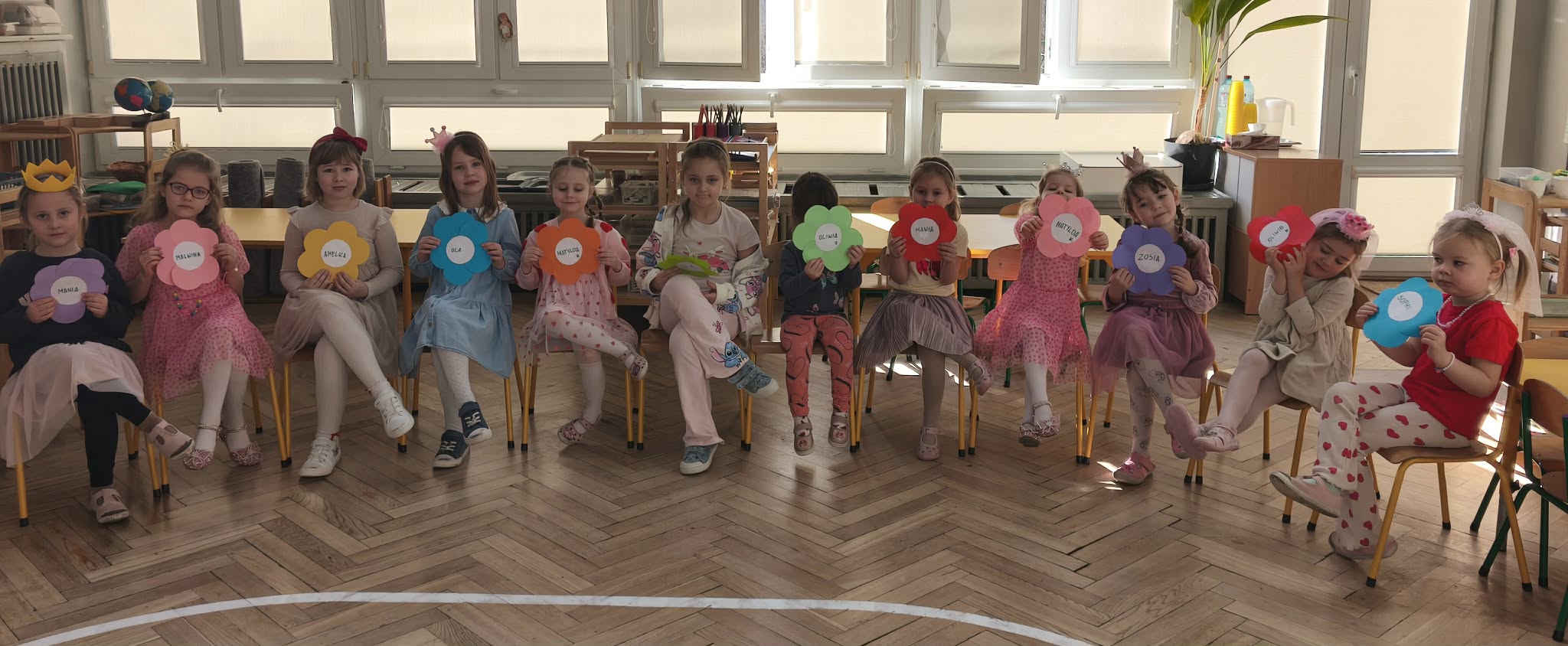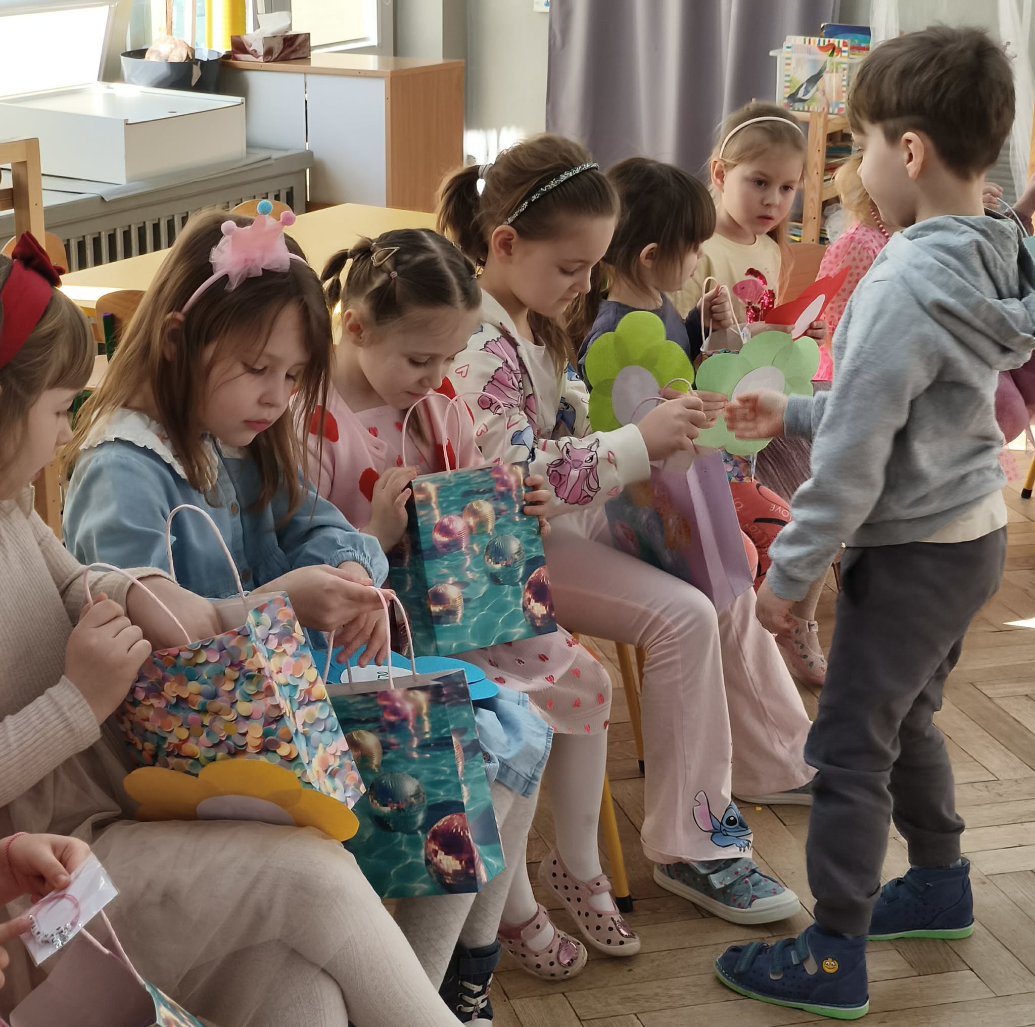 W dniu dzisiejszym obchodziliśmy Dzień Kobiet. Wszystkie nasze Królewny jak prawdziwe damy otrzymały od chłopców własnoręcznie wykonane kwiatki. Chłopcy również zamienili się w jubilerów i wykonywali bransoletki wg gustów dziewczynek. Nie obyło się również bez upominków, które wręczali chłopcy. W tym dniu praca z materiałem także odbywała się w parach damsko - męskich. Z pewnością był to wyjątkowy czas.