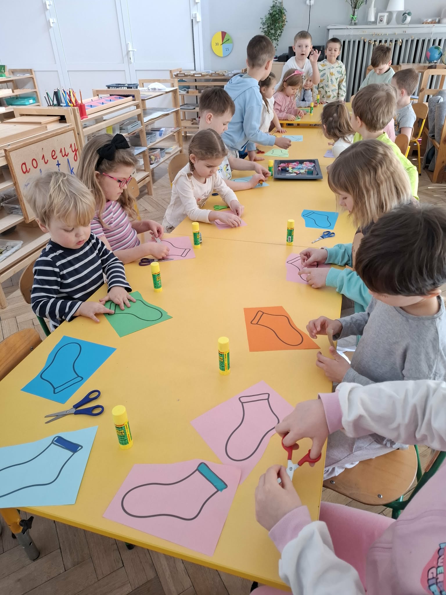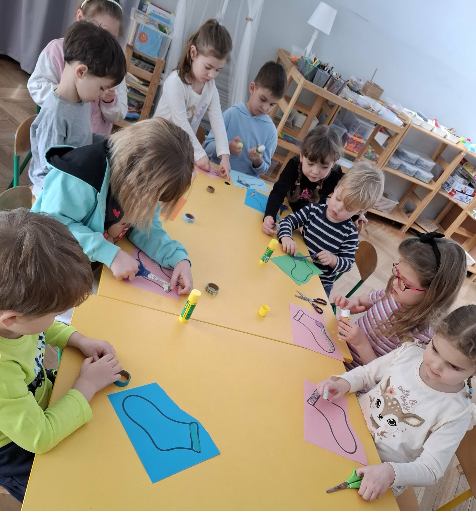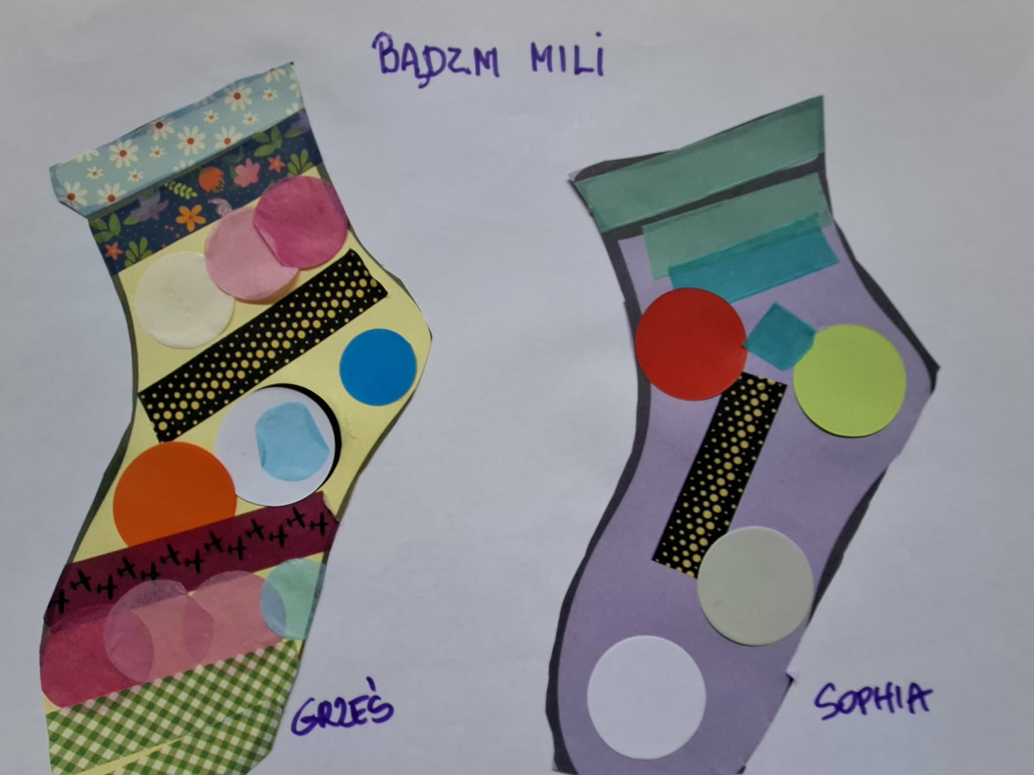 Szczególną częścią dnia była wspólna praca plastyczna – dzieci pracowały w parach (starszak z młodszym dzieckiem), projektując kolorowe skarpetki. Była to nie tylko świetna zabawa, ale również okazja do współpracy, budowania relacji, wspierania i wzajemnego uczenia się od siebie.