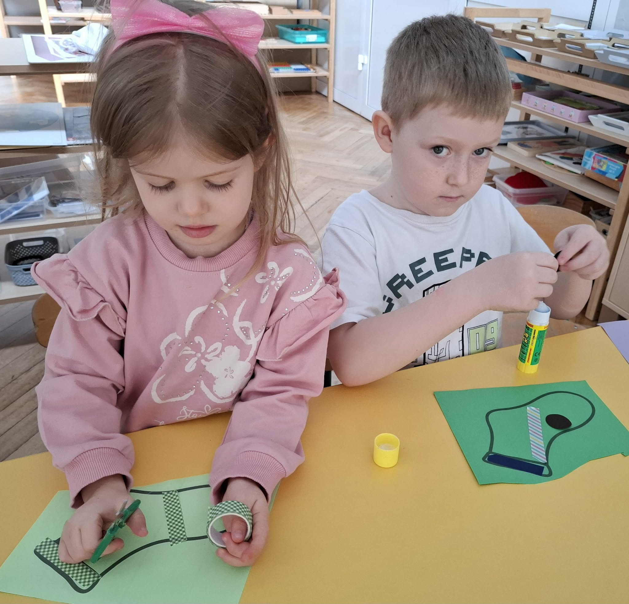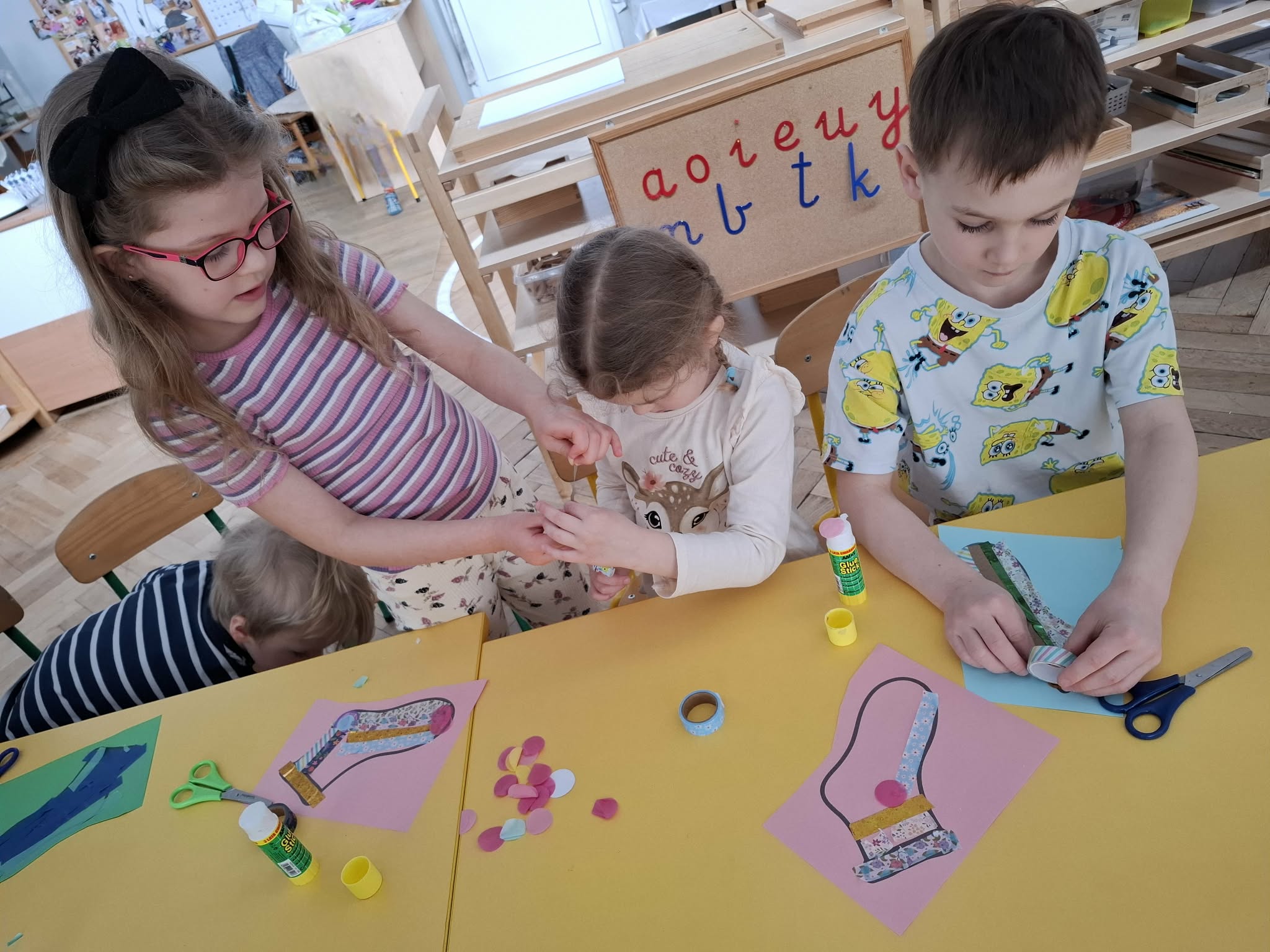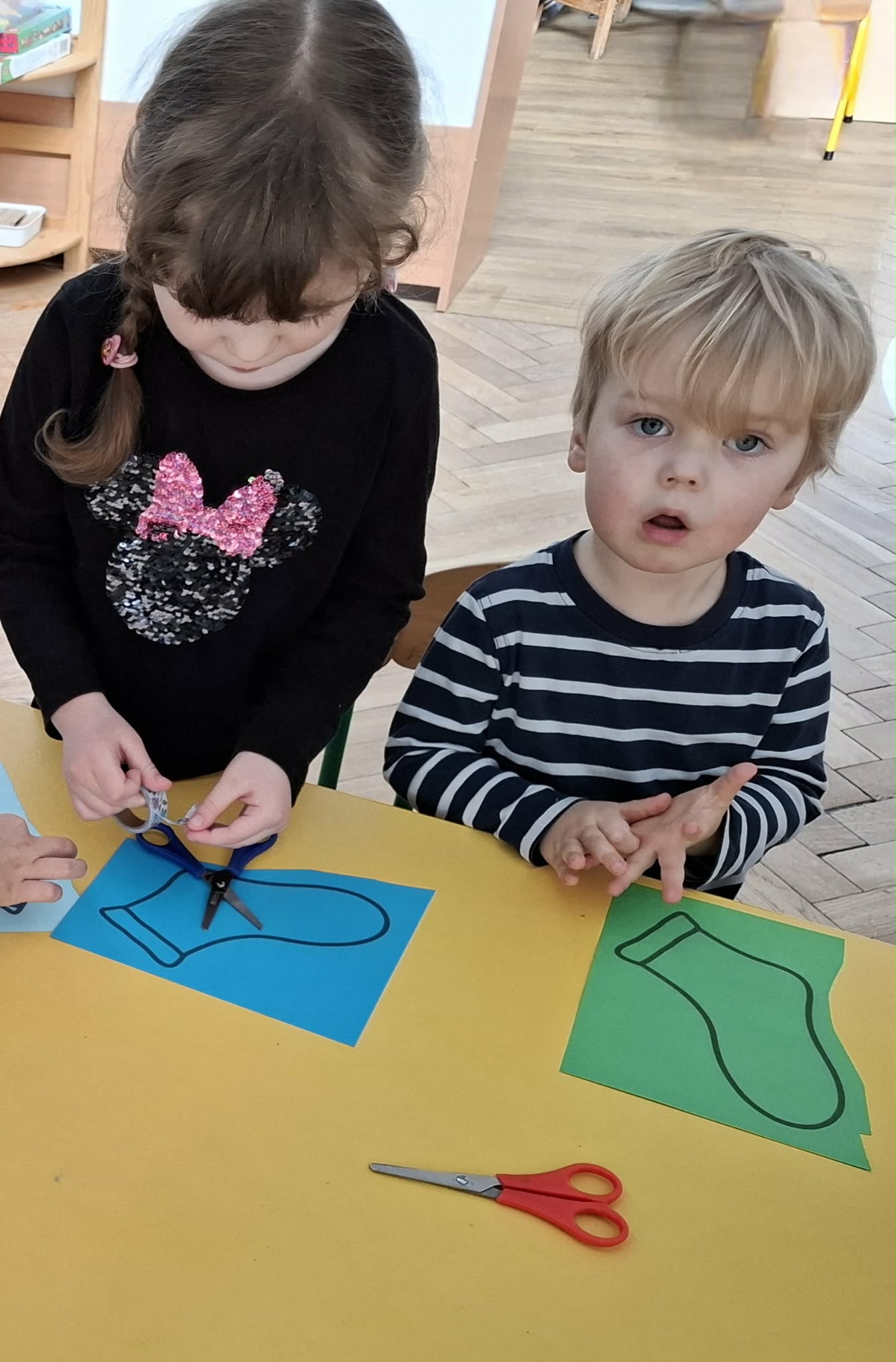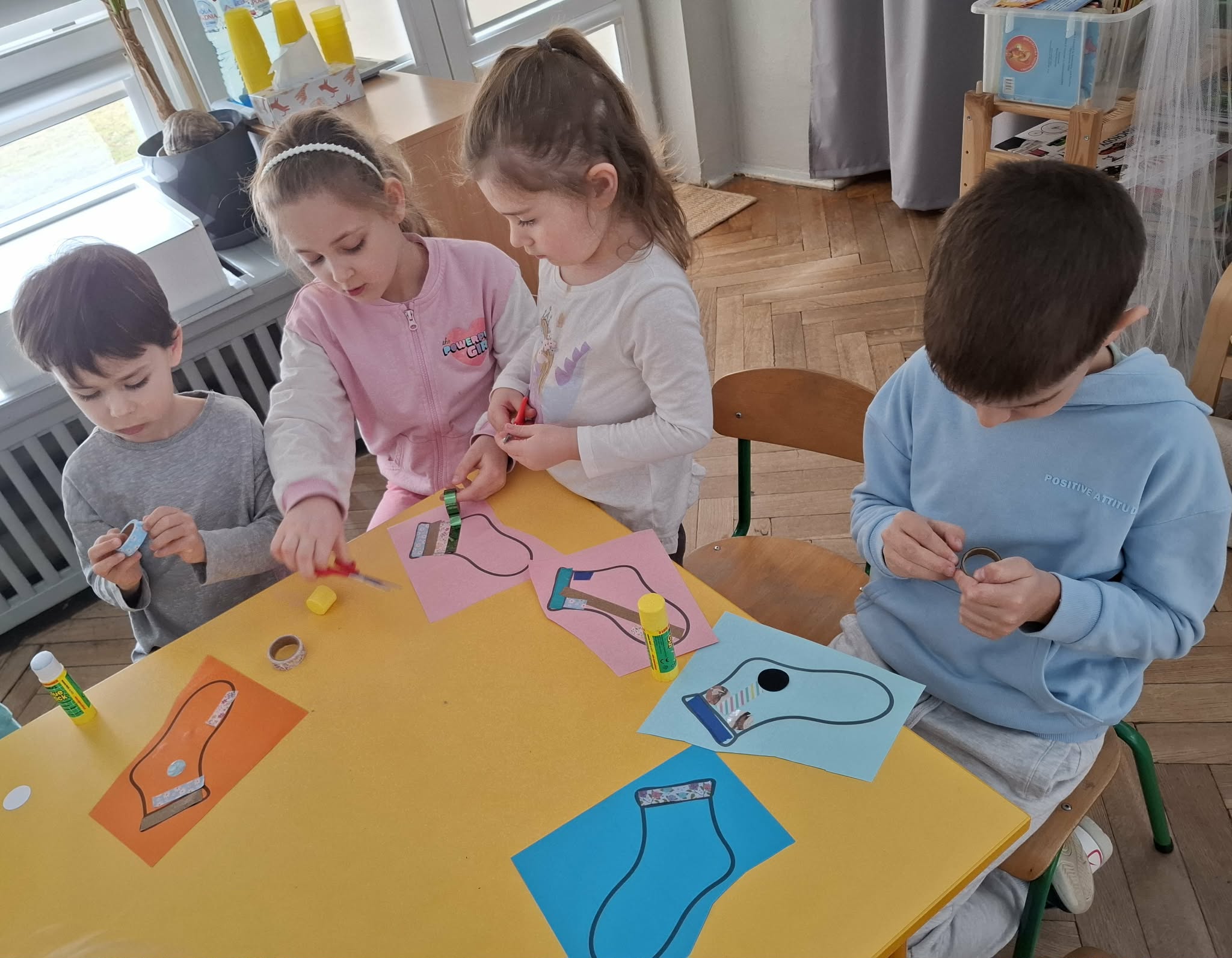 Szczególną częścią dnia była wspólna praca plastyczna – dzieci pracowały w parach (starszak z młodszym dzieckiem), projektując kolorowe skarpetki. Była to nie tylko świetna zabawa, ale również okazja do współpracy, budowania relacji, wspierania i wzajemnego uczenia się od siebie.
