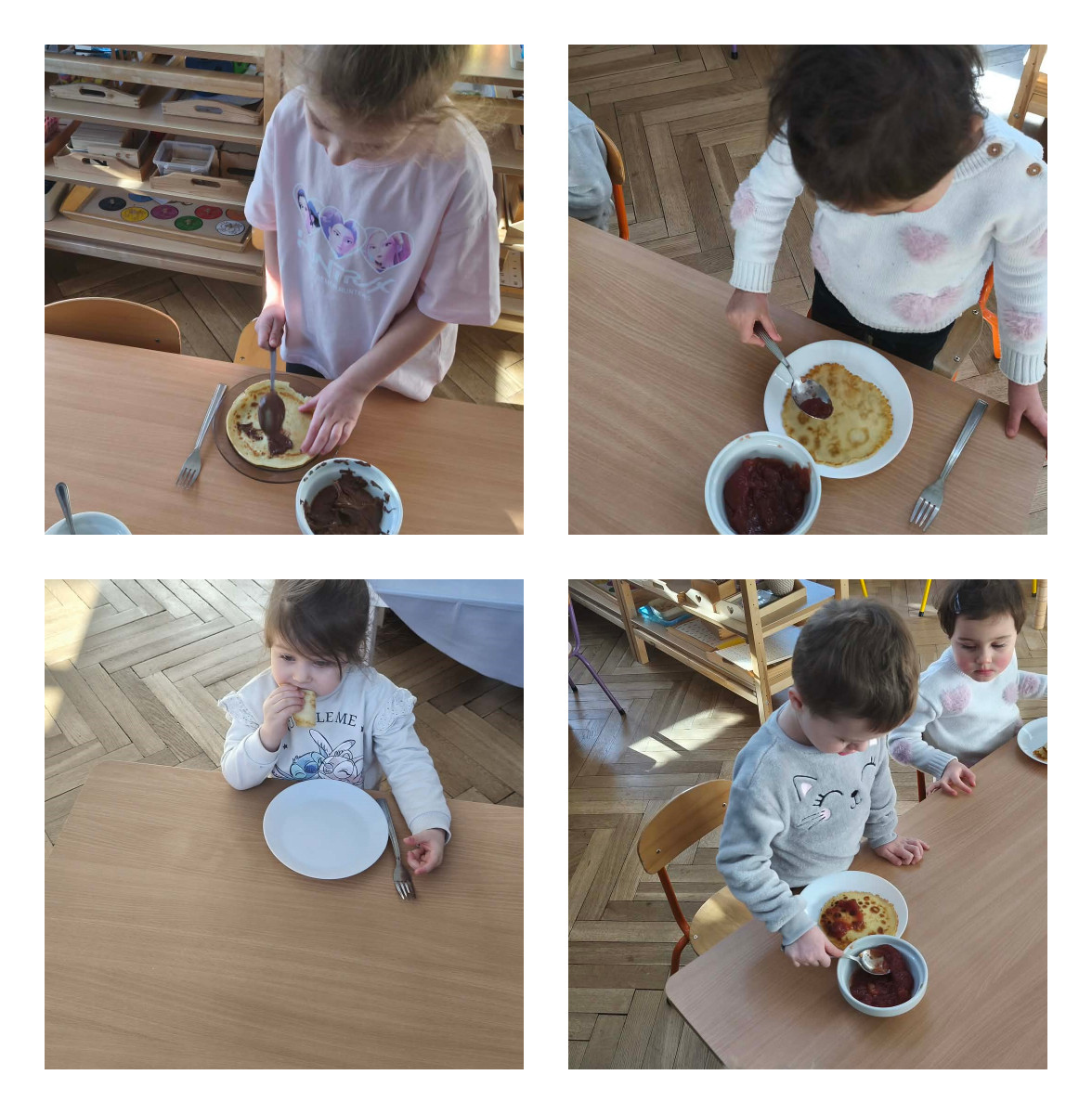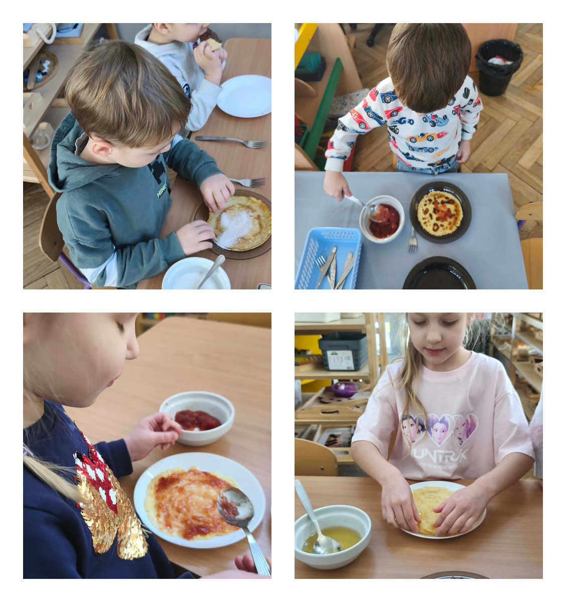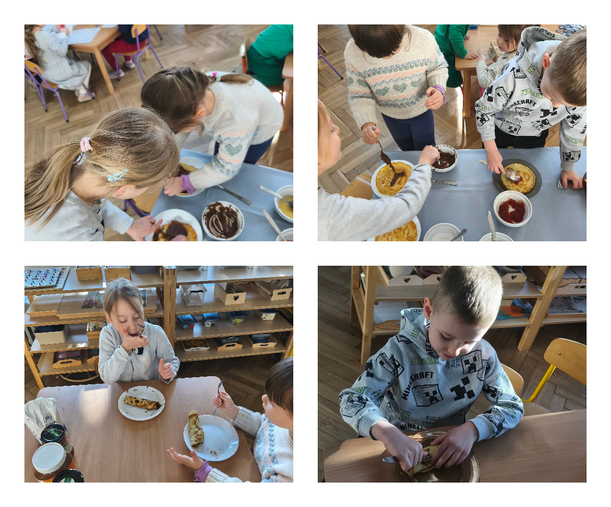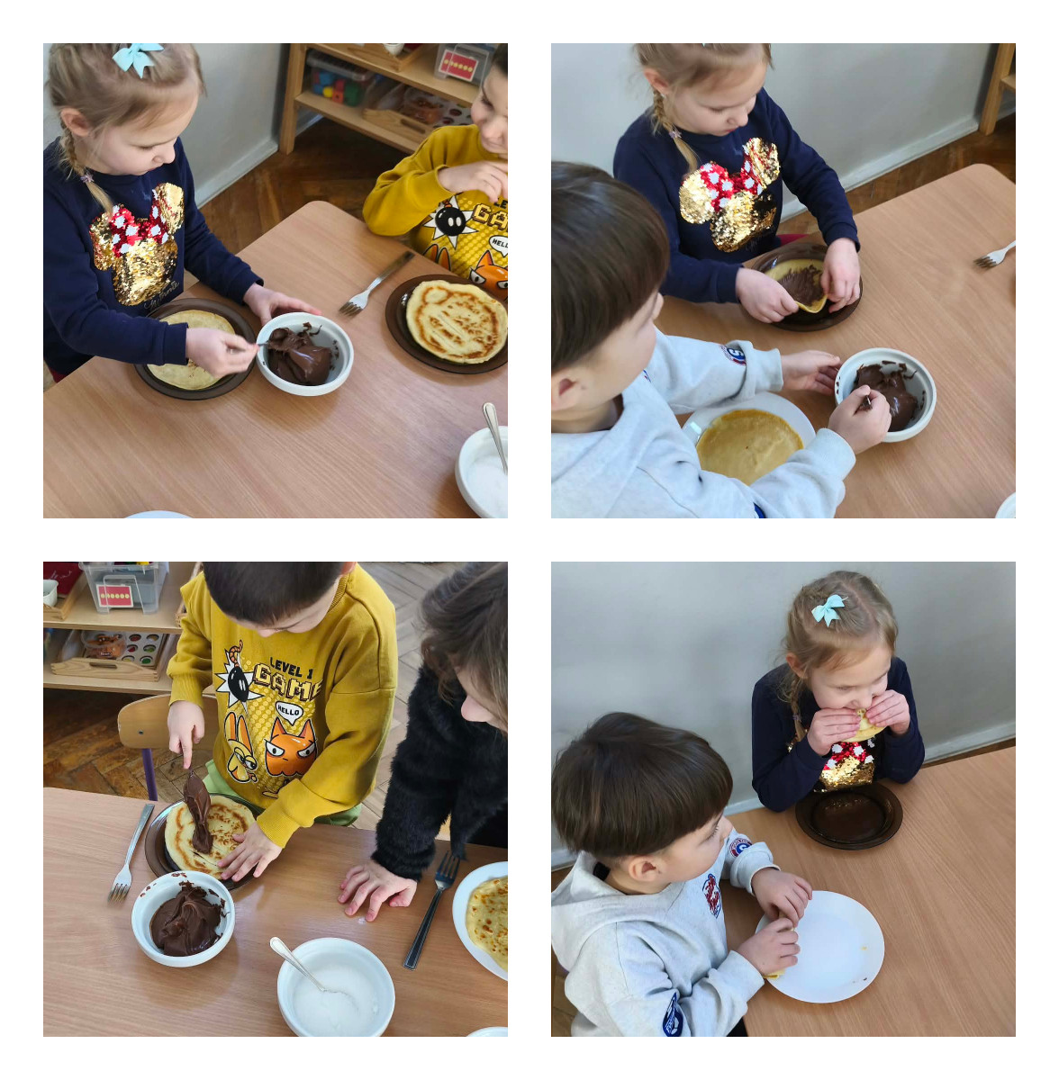 Dzieci miały również okazję wykazać się własną inwencją podczas przygotowywania deseru w postaci naleśników z ulubionymi dodatkami, tj. Kremem nutella, dżemem truskawkowym, cukrem i miodem. Zdecydowanie najprzyjemniejszym i najbardziej wyczekiwanym momentem całego dnia była degustacja samodzielnie skomponowanego deseru.
