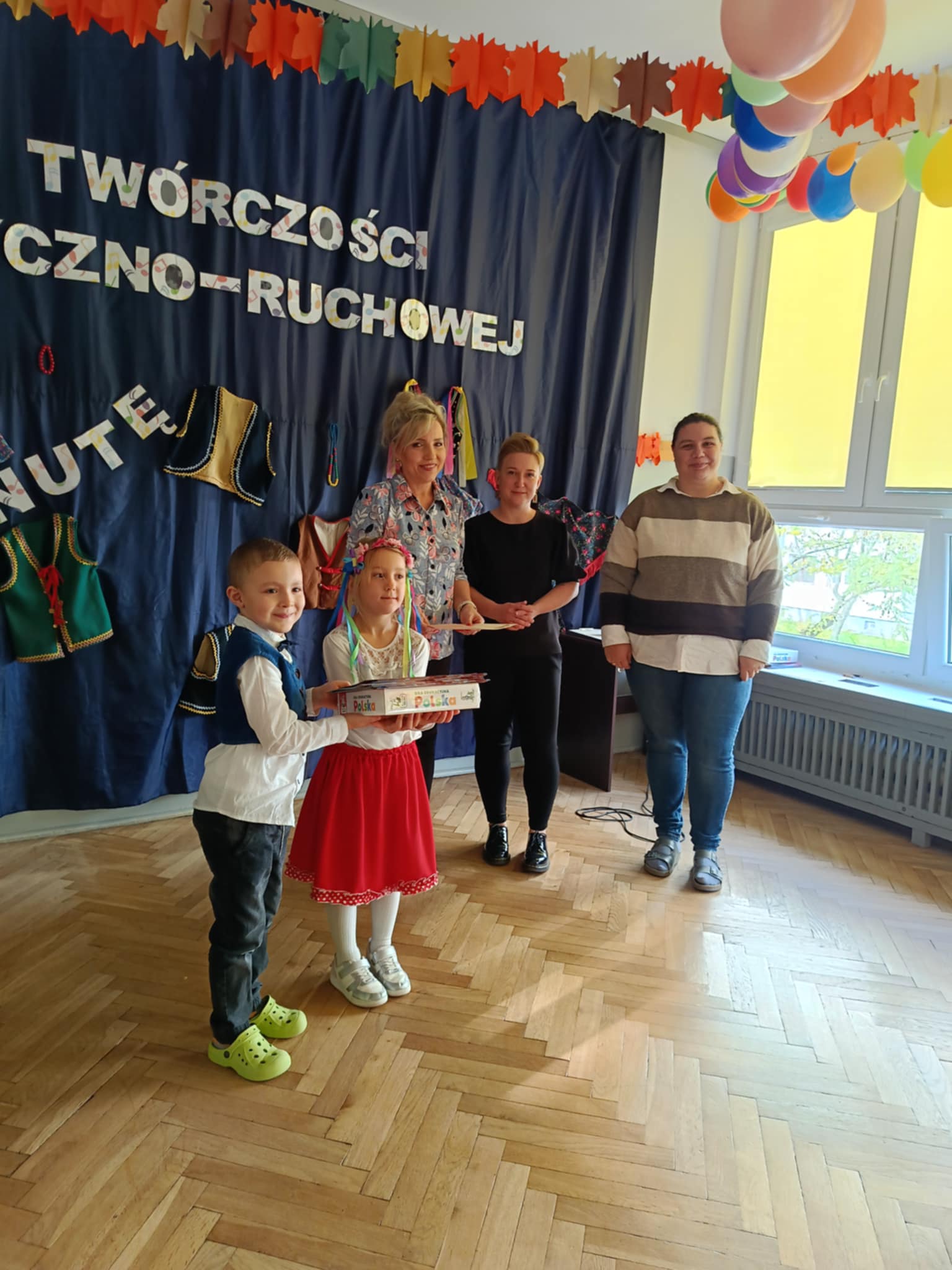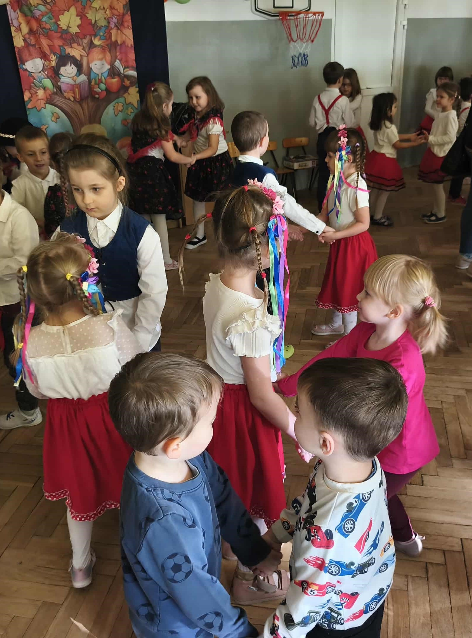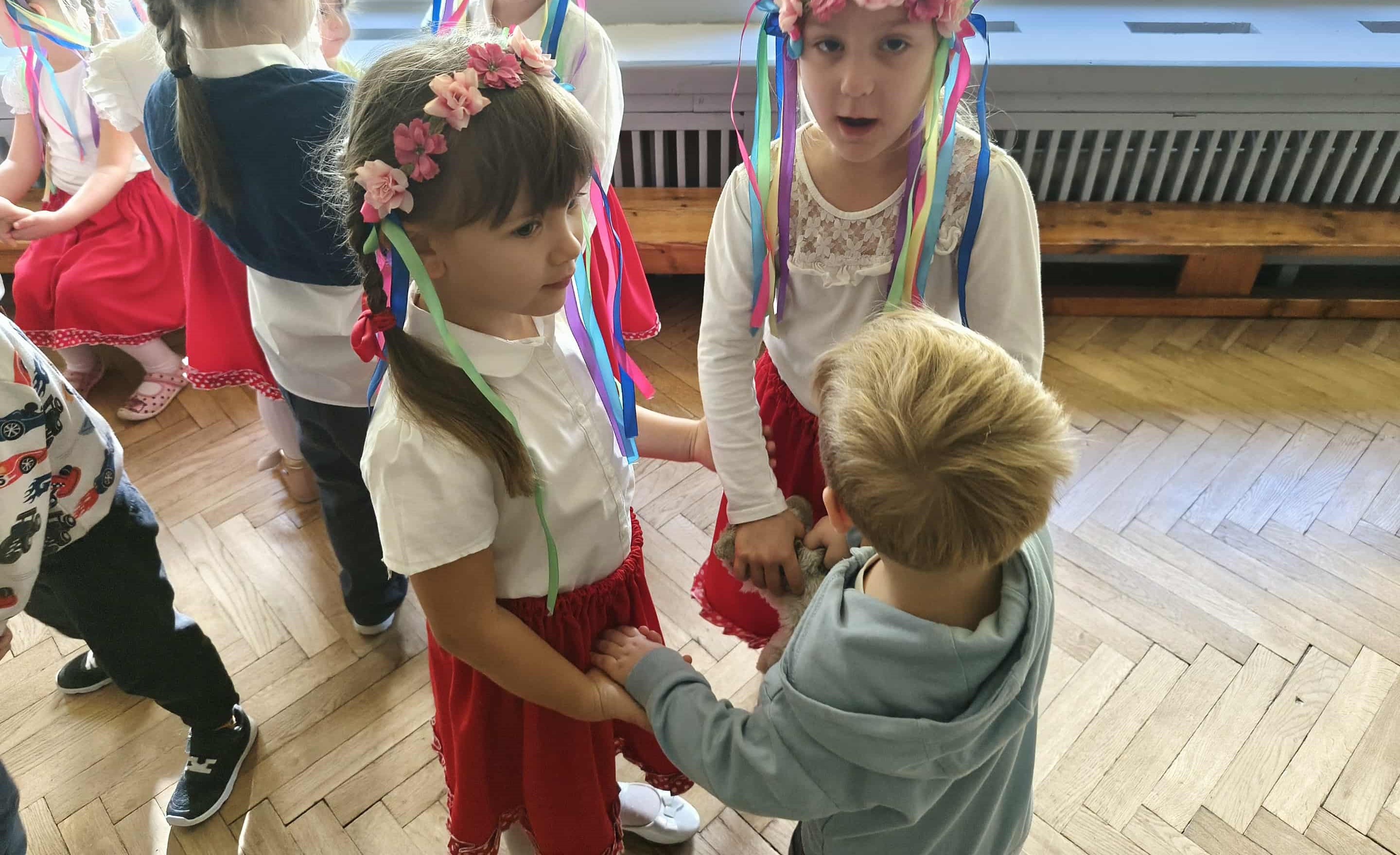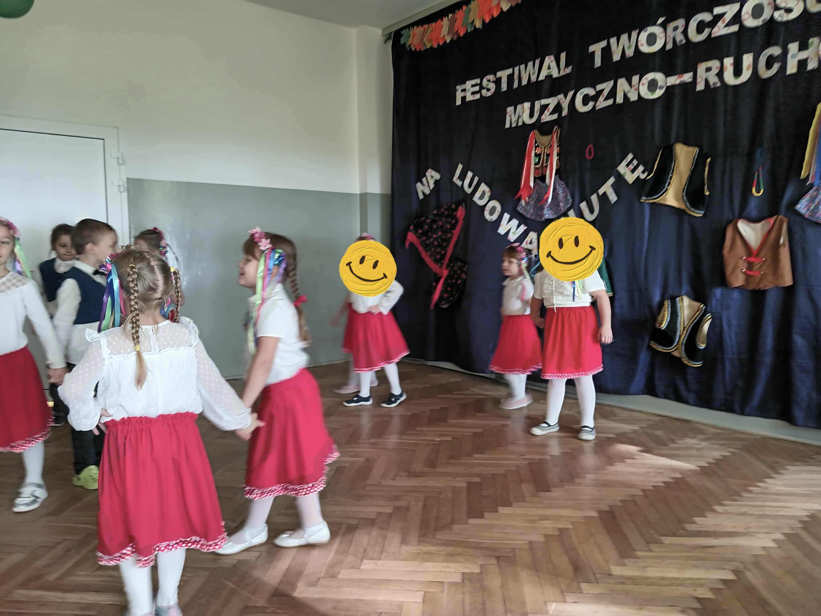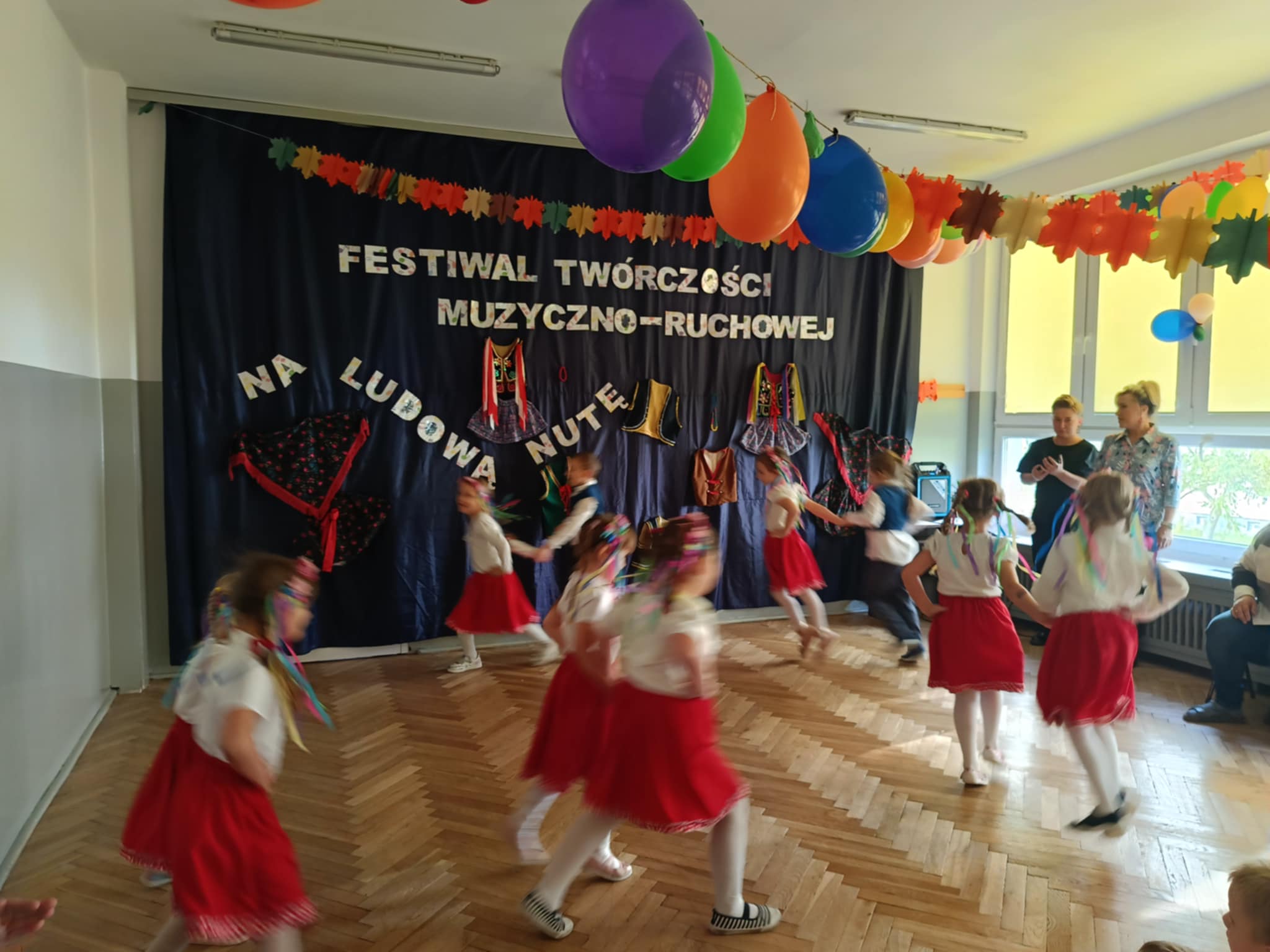 gdzie dzieci 5-6 letnie brały udział w Festiwalu muzyczno- ruchowym. Przełamując swój lęk przed wystąpieniami, zatańczyły „Krakowiaczka”. Wyszło im to bardzo ładnie, a oklasków od swoich kolegów z grupy i innych dzieci biorących udział w Festiwalu nie było końca.
