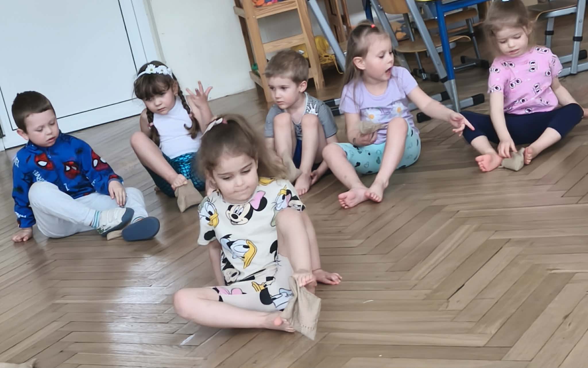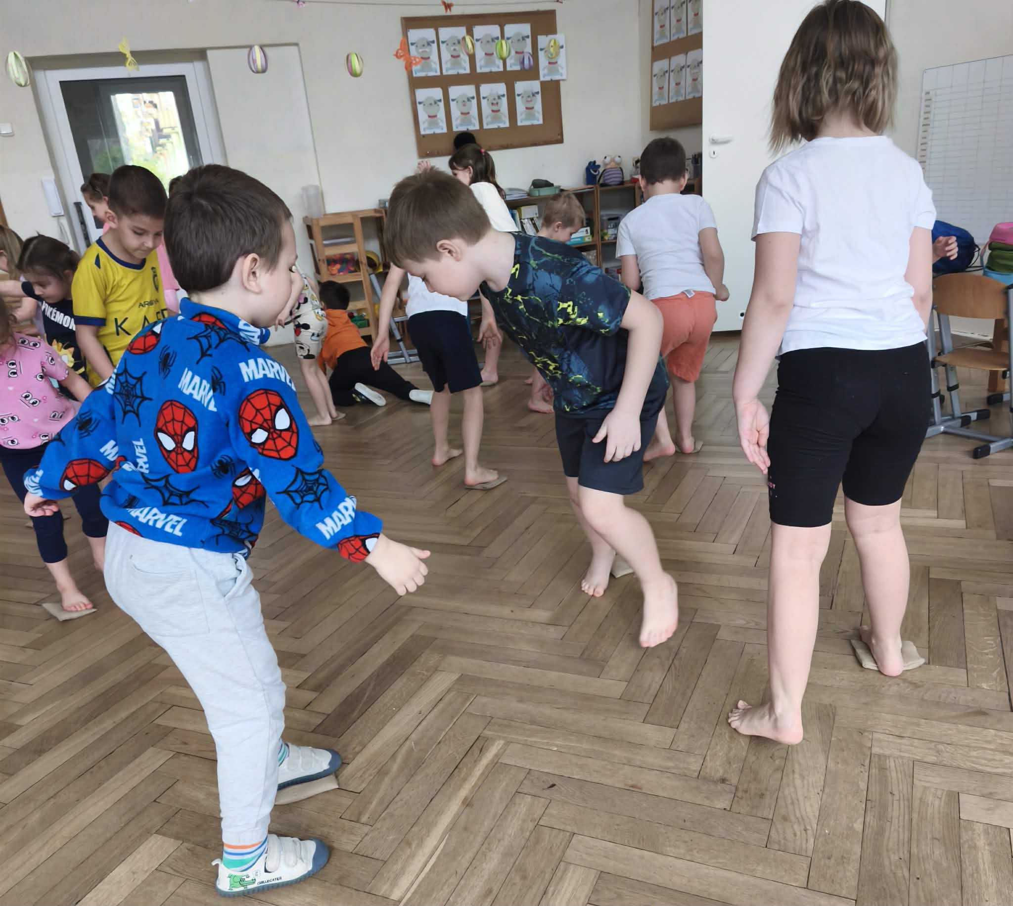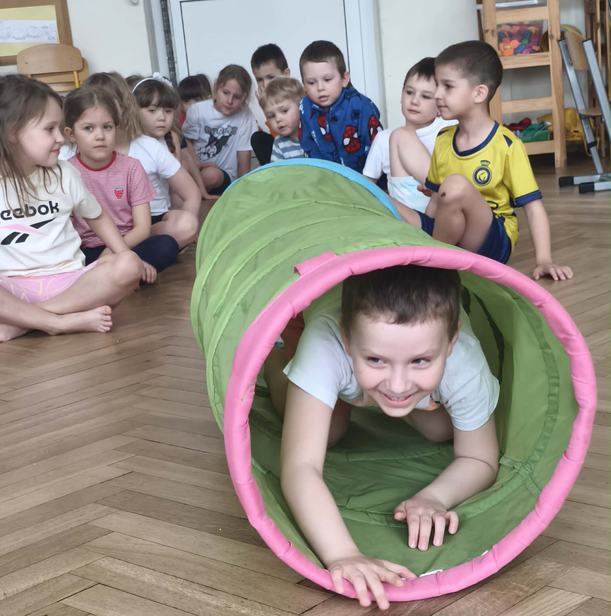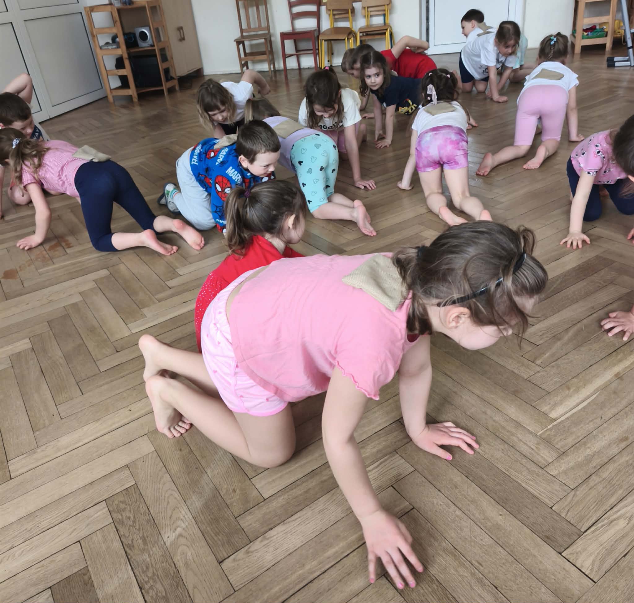 Wraz z nadejściem cieplejszej aury rozpoczęliśmy gimnastykę połączoną z doskonaleniem umiejętności zmiany odzieży. Ku naszemu zaskoczeniu dzieci zachęcone wizją udziału w zajęciach sportowych nie miały większego problemu by sprawnie się przebrać. Podczas zajęć prócz przestrzegania zasad i dyscypliny panującej na takich zajęciach, towarzyszył uśmiech i naturalna radość z podejmowania się również trudnych ćwiczeń. Ważnym elementem była współpraca młodszych i starszych dzieci co jest istotnym elementem naszej codziennej pracy.