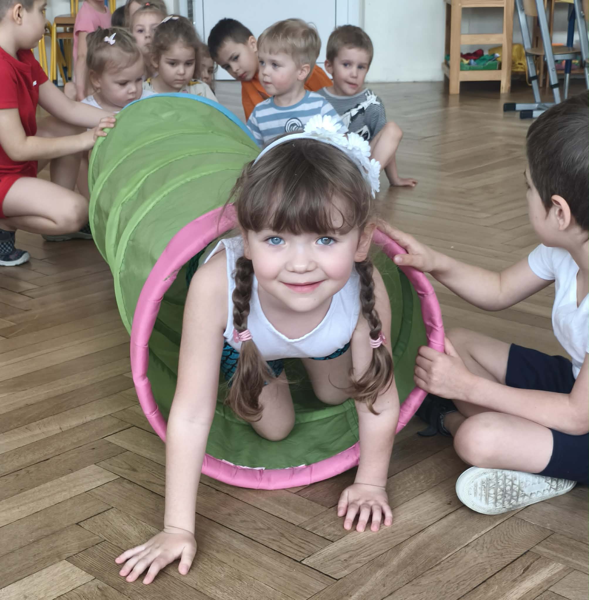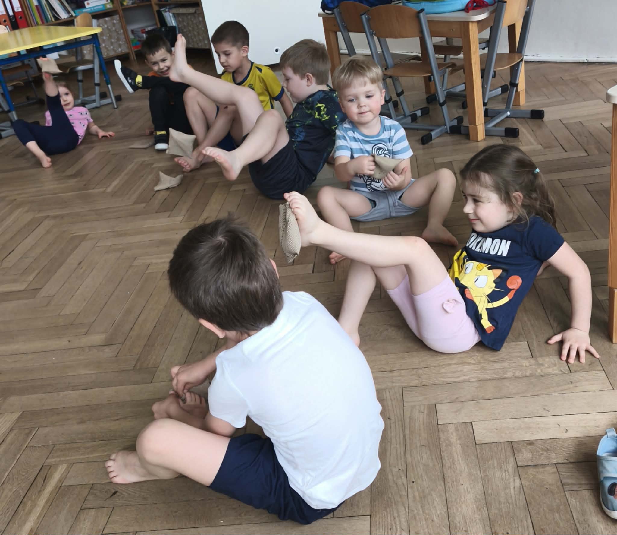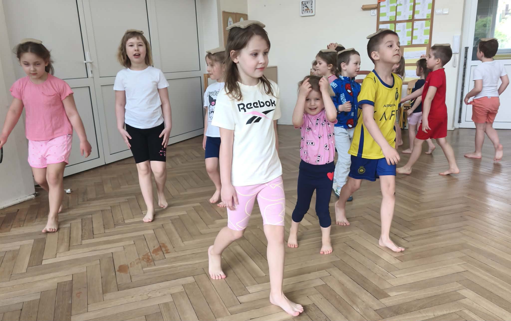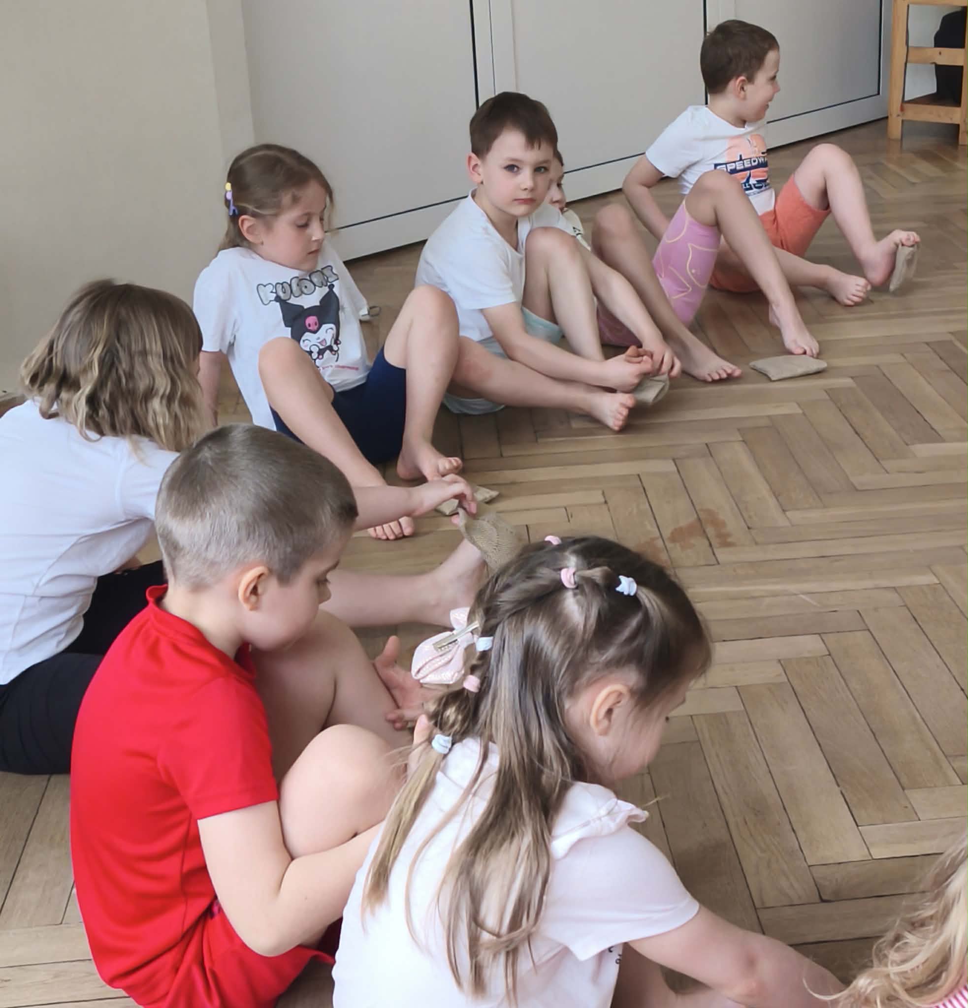Wraz z nadejściem cieplejszej aury rozpoczęliśmy gimnastykę połączoną z doskonaleniem umiejętności zmiany odzieży. Ku naszemu zaskoczeniu dzieci zachęcone wizją udziału w zajęciach sportowych nie miały większego problemu by sprawnie się przebrać. Podczas zajęć prócz przestrzegania zasad i dyscypliny panującej na takich zajęciach, towarzyszył uśmiech i naturalna radość z podejmowania się również trudnych ćwiczeń. Ważnym elementem była współpraca młodszych i starszych dzieci co jest istotnym elementem naszej codziennej pracy.