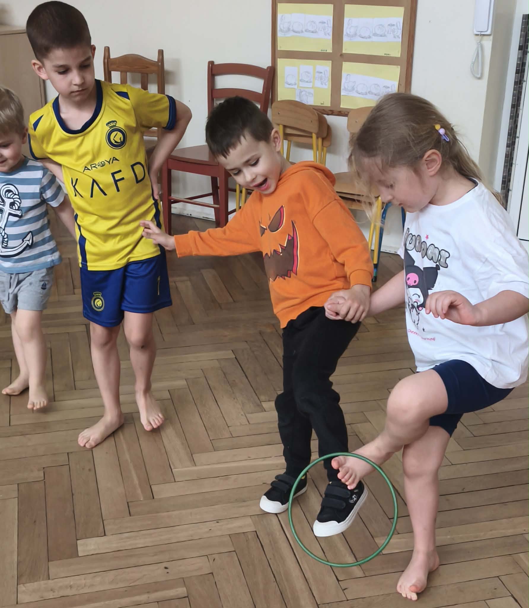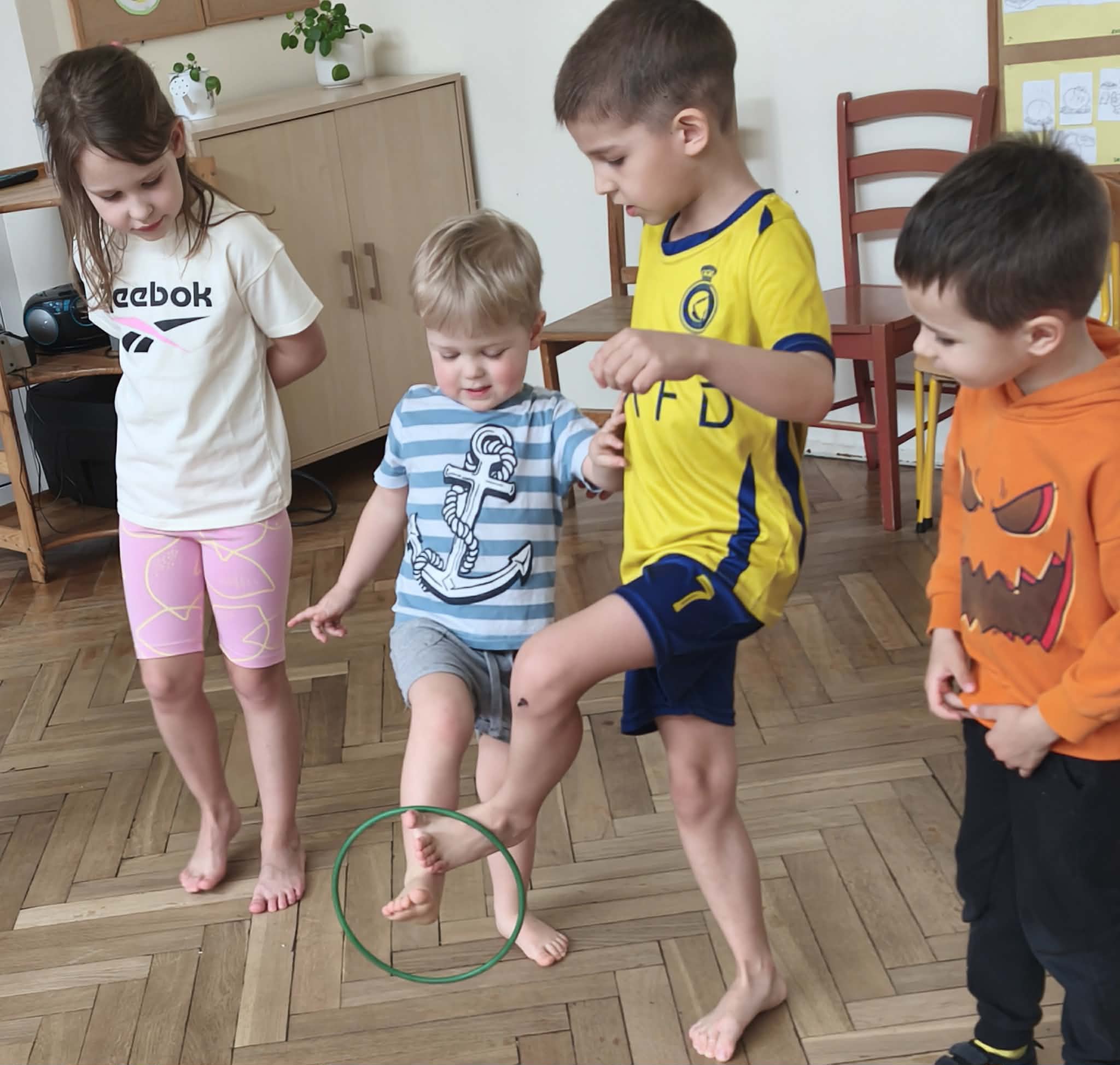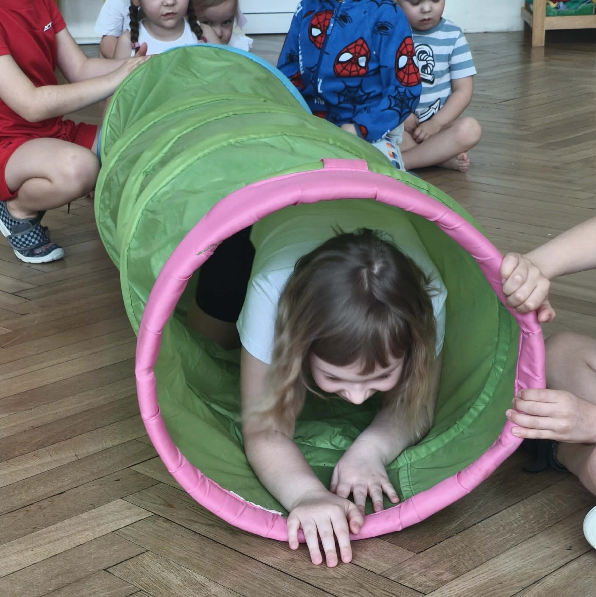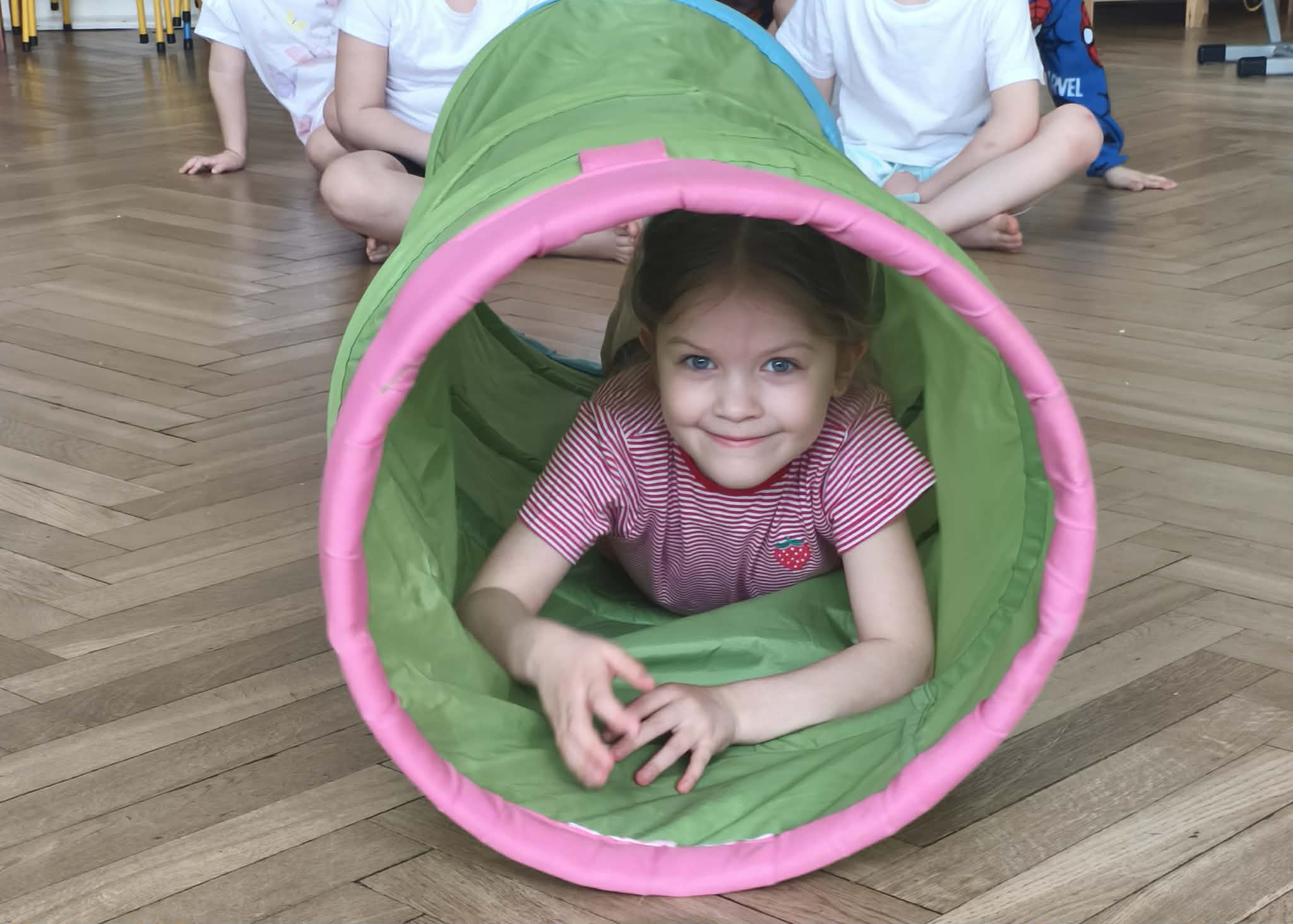 Wraz z nadejściem cieplejszej aury rozpoczęliśmy gimnastykę połączoną z doskonaleniem umiejętności zmiany odzieży. Ku naszemu zaskoczeniu dzieci zachęcone wizją udziału w zajęciach sportowych nie miały większego problemu by sprawnie się przebrać. Podczas zajęć prócz przestrzegania zasad i dyscypliny panującej na takich zajęciach, towarzyszył uśmiech i naturalna radość z podejmowania się również trudnych ćwiczeń. Ważnym elementem była współpraca młodszych i starszych dzieci co jest istotnym elementem naszej codziennej pracy.