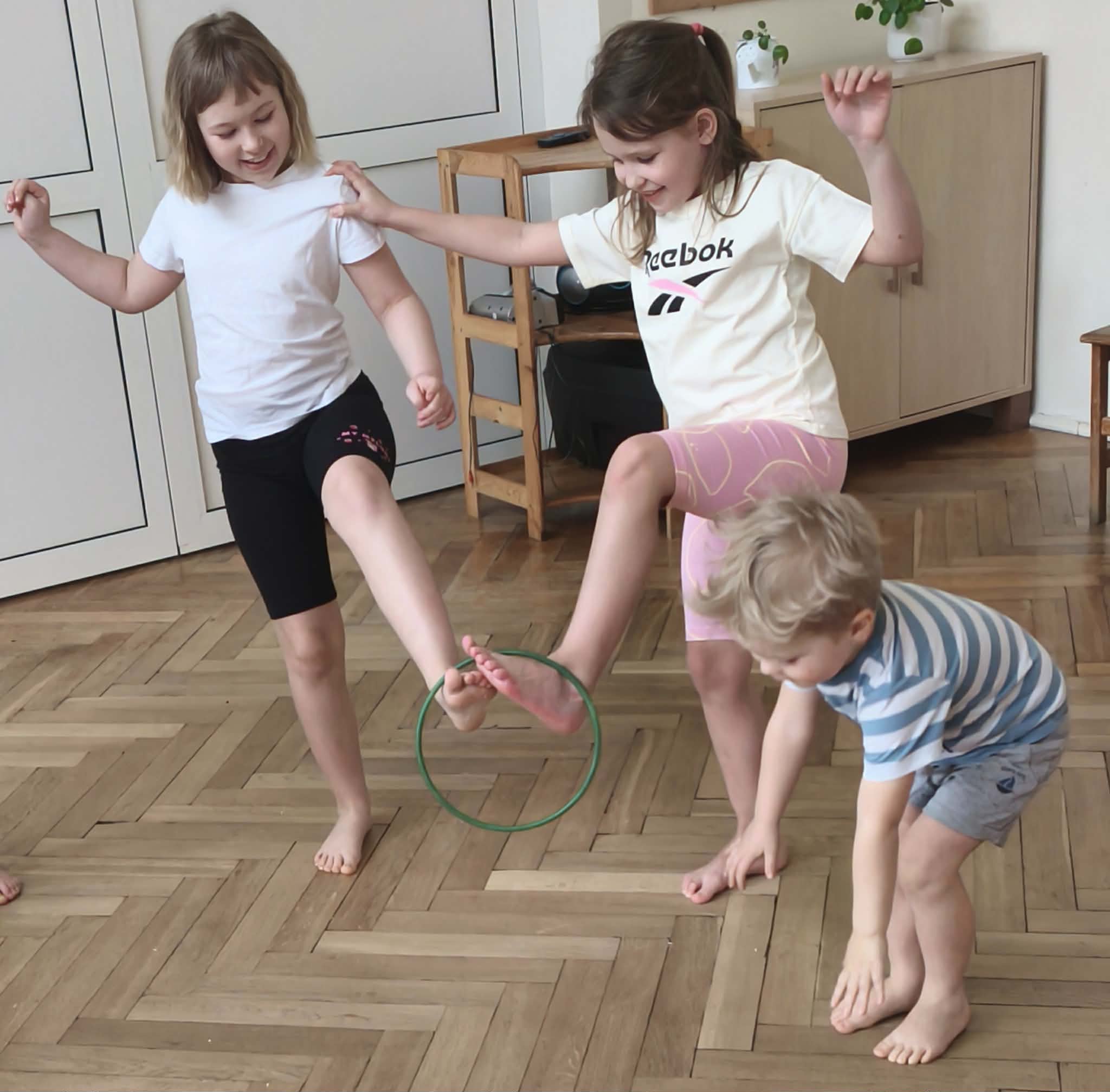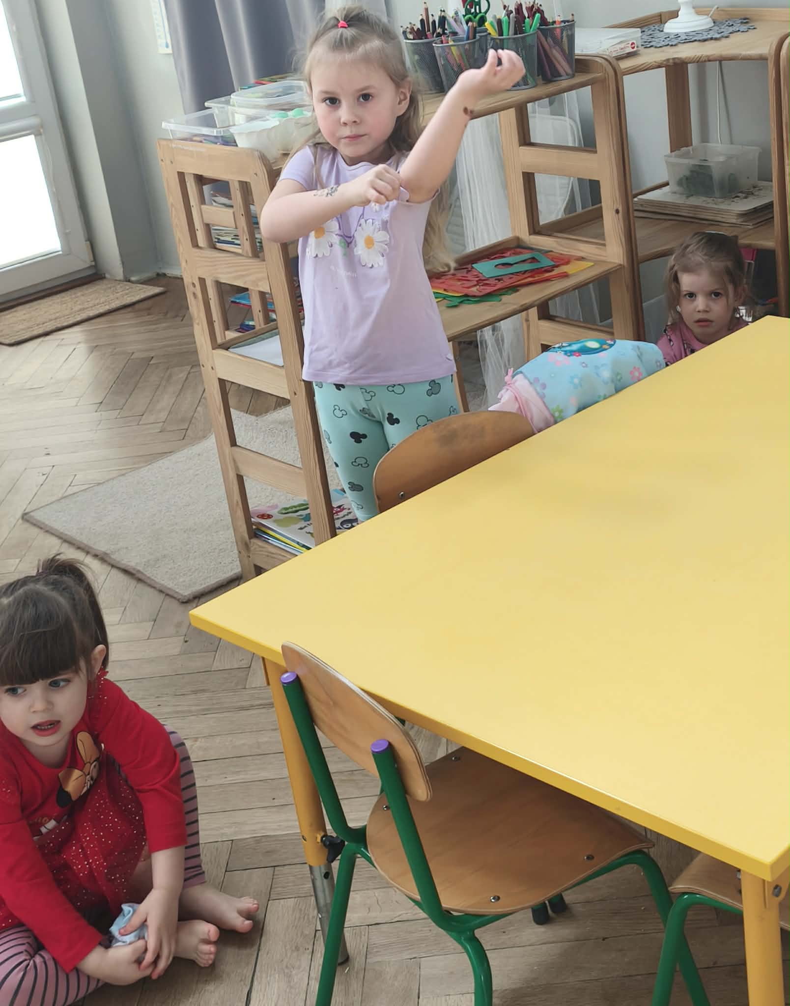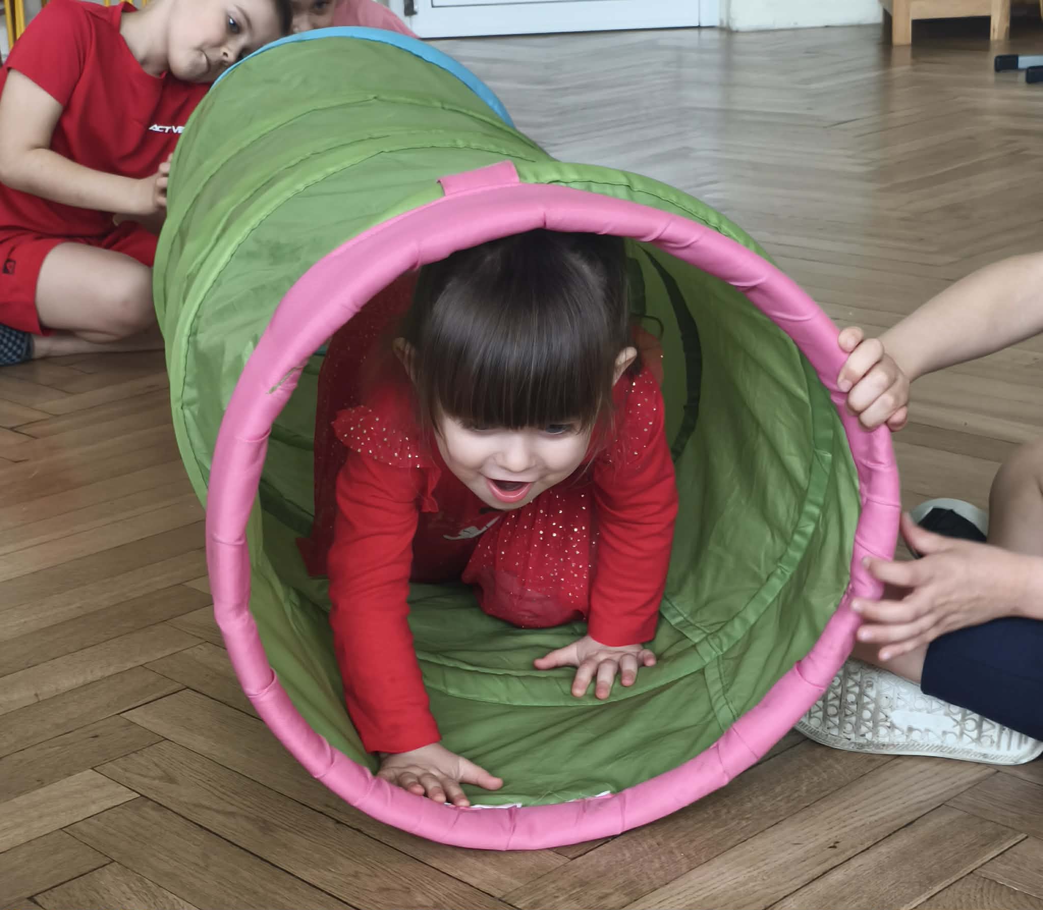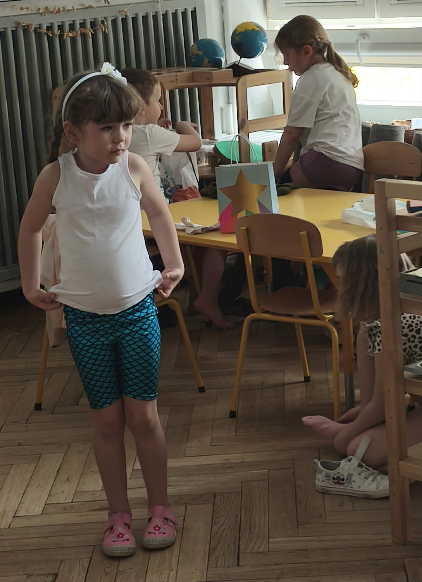 Wraz z nadejściem cieplejszej aury rozpoczęliśmy gimnastykę połączoną z doskonaleniem umiejętności zmiany odzieży. Ku naszemu zaskoczeniu dzieci zachęcone wizją udziału w zajęciach sportowych nie miały większego problemu by sprawnie się przebrać. Podczas zajęć prócz przestrzegania zasad i dyscypliny panującej na takich zajęciach, towarzyszył uśmiech i naturalna radość z podejmowania się również trudnych ćwiczeń. Ważnym elementem była współpraca młodszych i starszych dzieci co jest istotnym elementem naszej codziennej pracy.