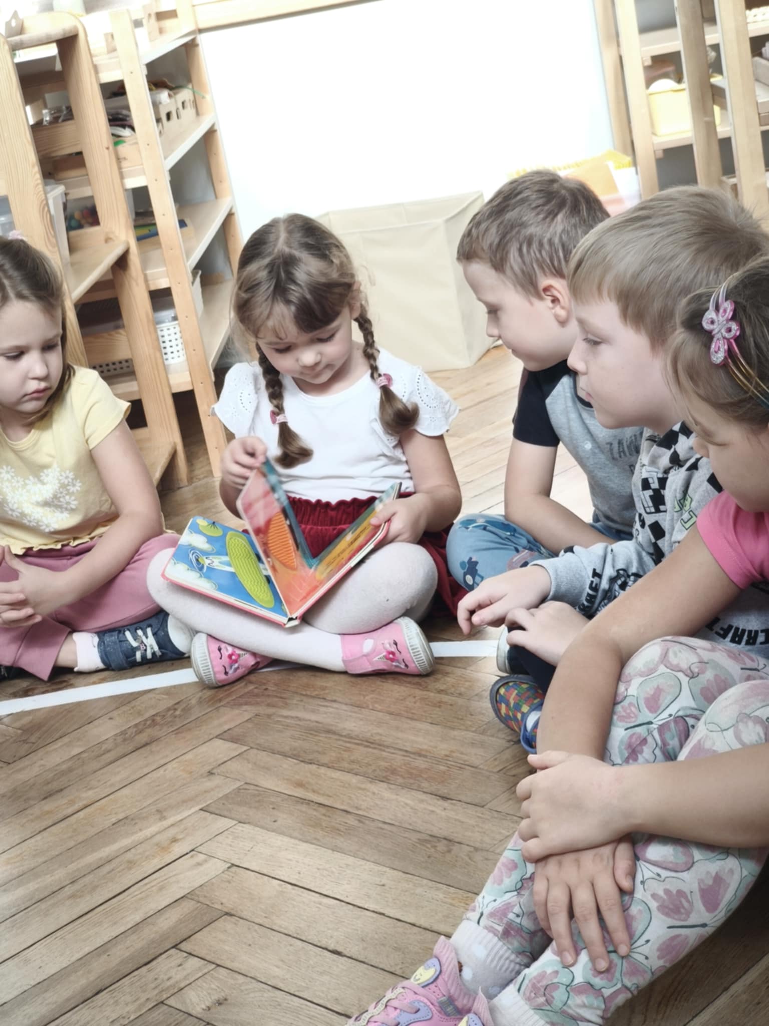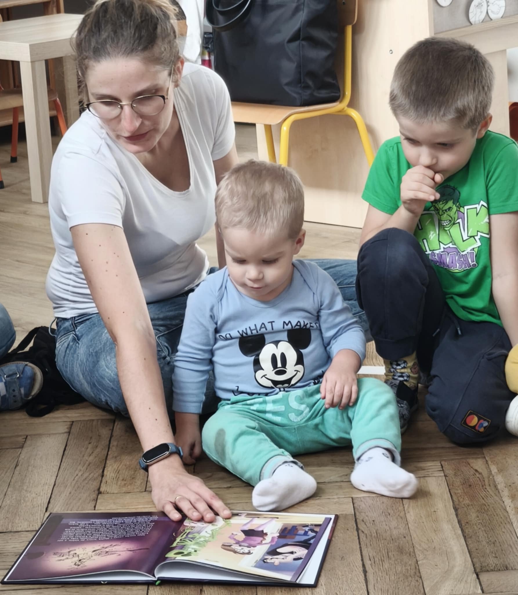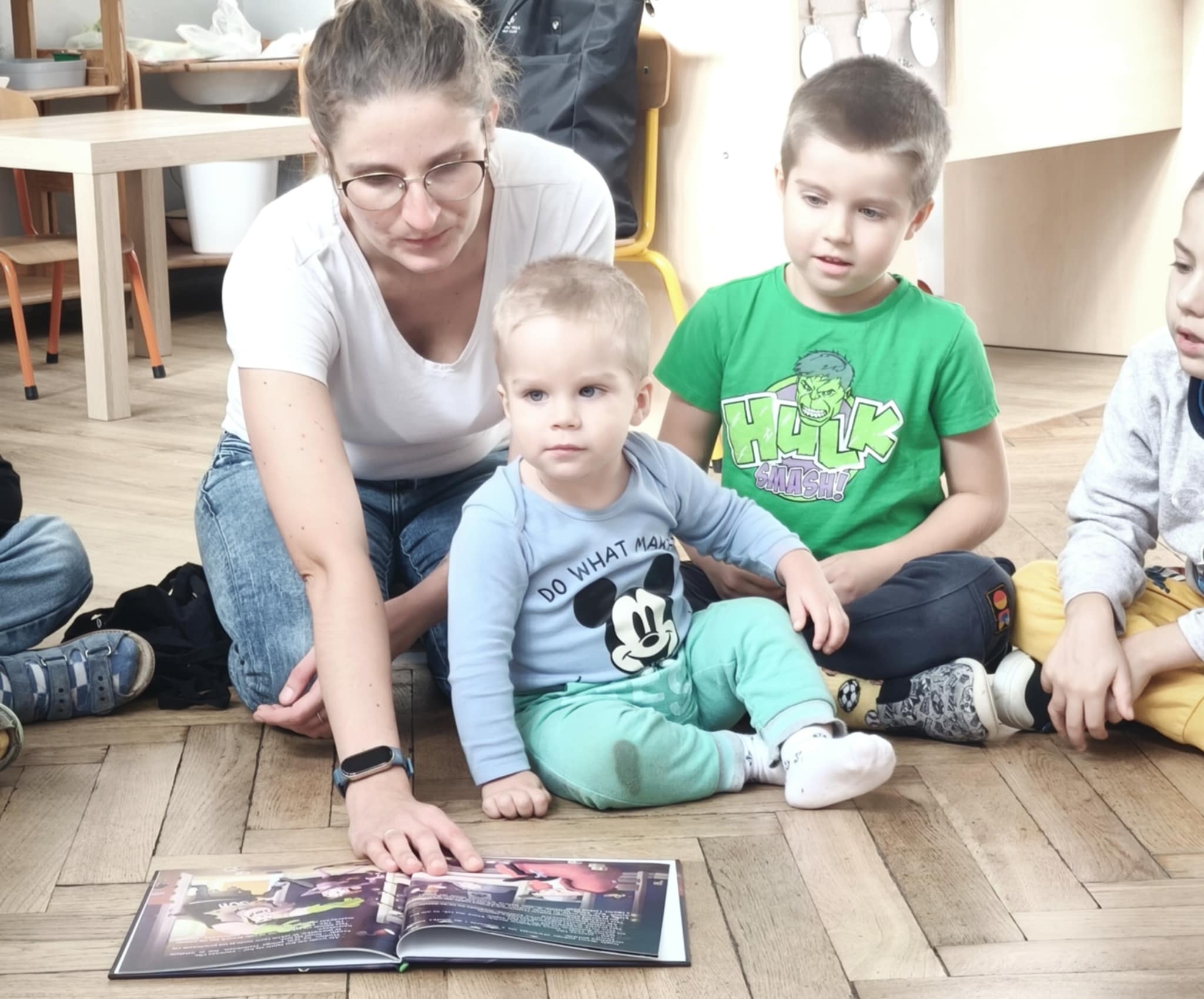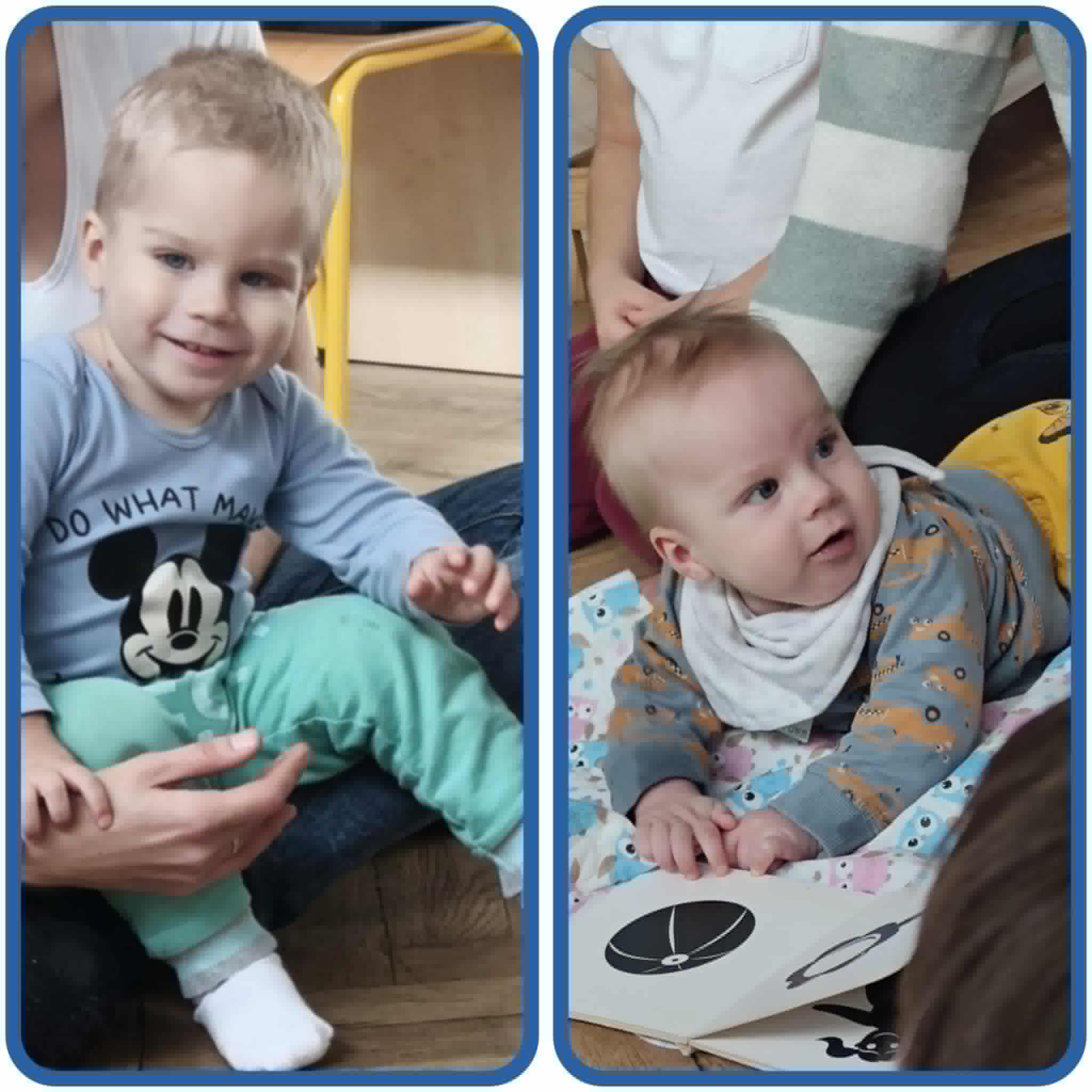 Jak zbliżające się Helloween to i książka o straszeniu - na wesoło oczywiście. Wszyscy z uwagą słuchali historię czytaną przez naszego gościa. W spotkaniu brał udział także brat Kacperka - Tobiasz. Kiedy był u nas na czytaniu ostatni raz, był dzidziusiem i oglądał czarno białe książeczki. Teraz pokazał dzieciom książeczkę sensoryczną, która wszystkich również bardzo zainteresowała.