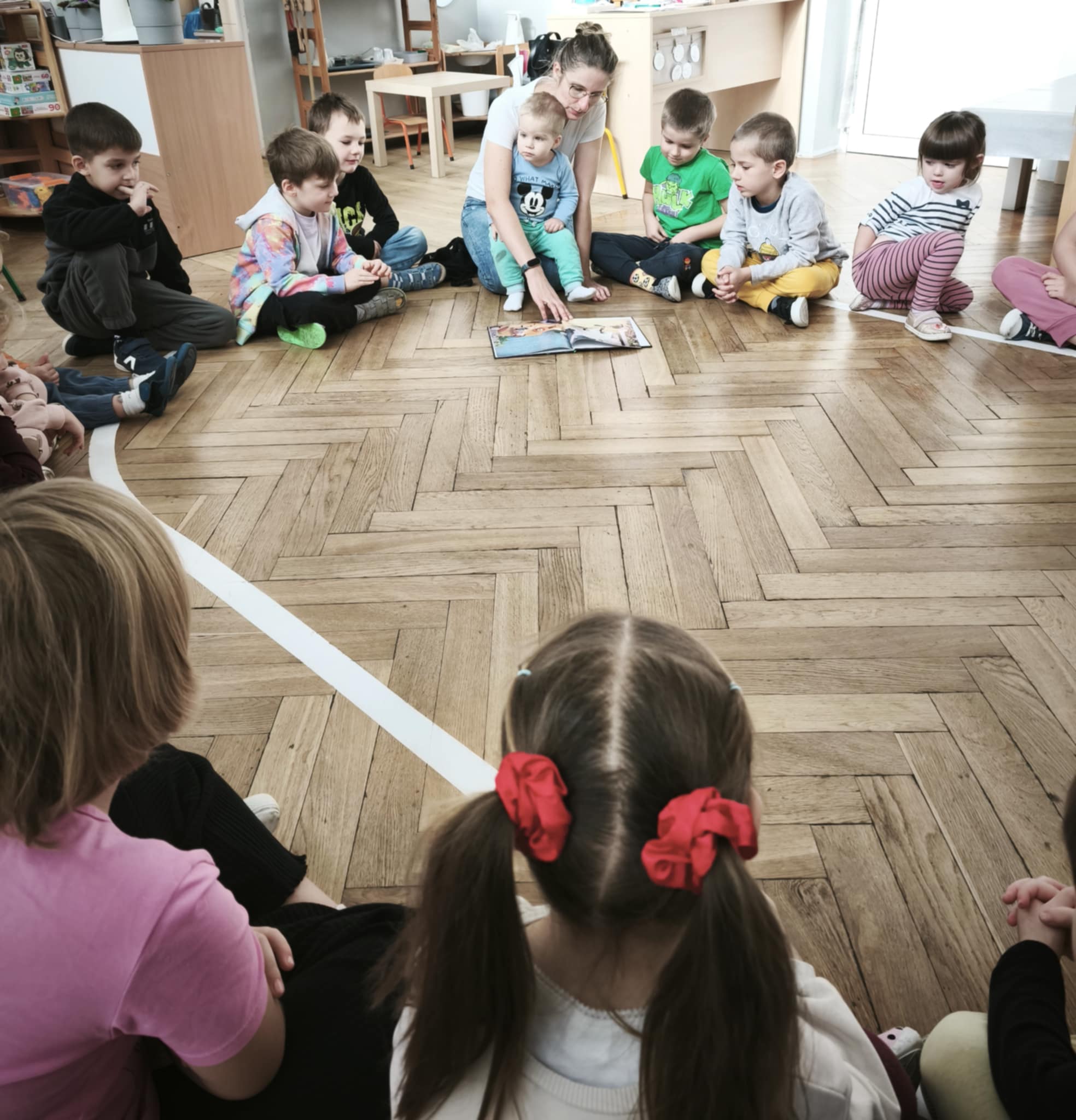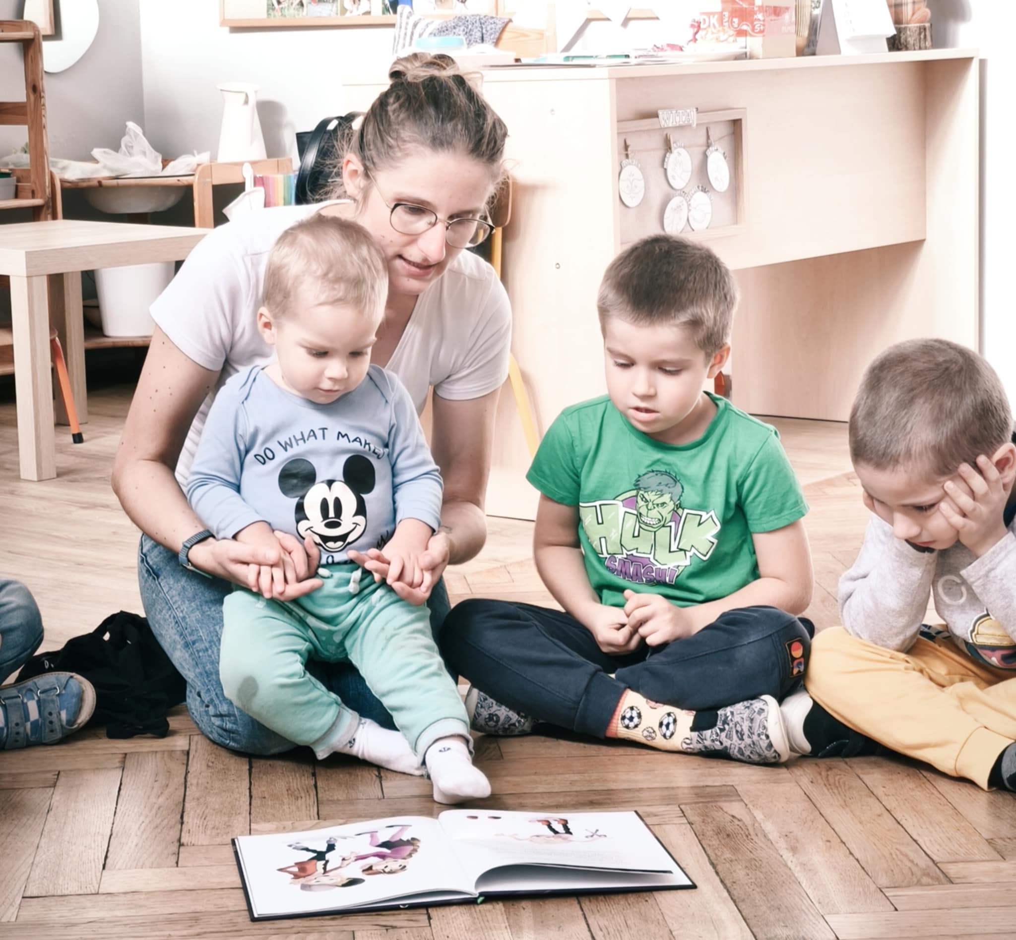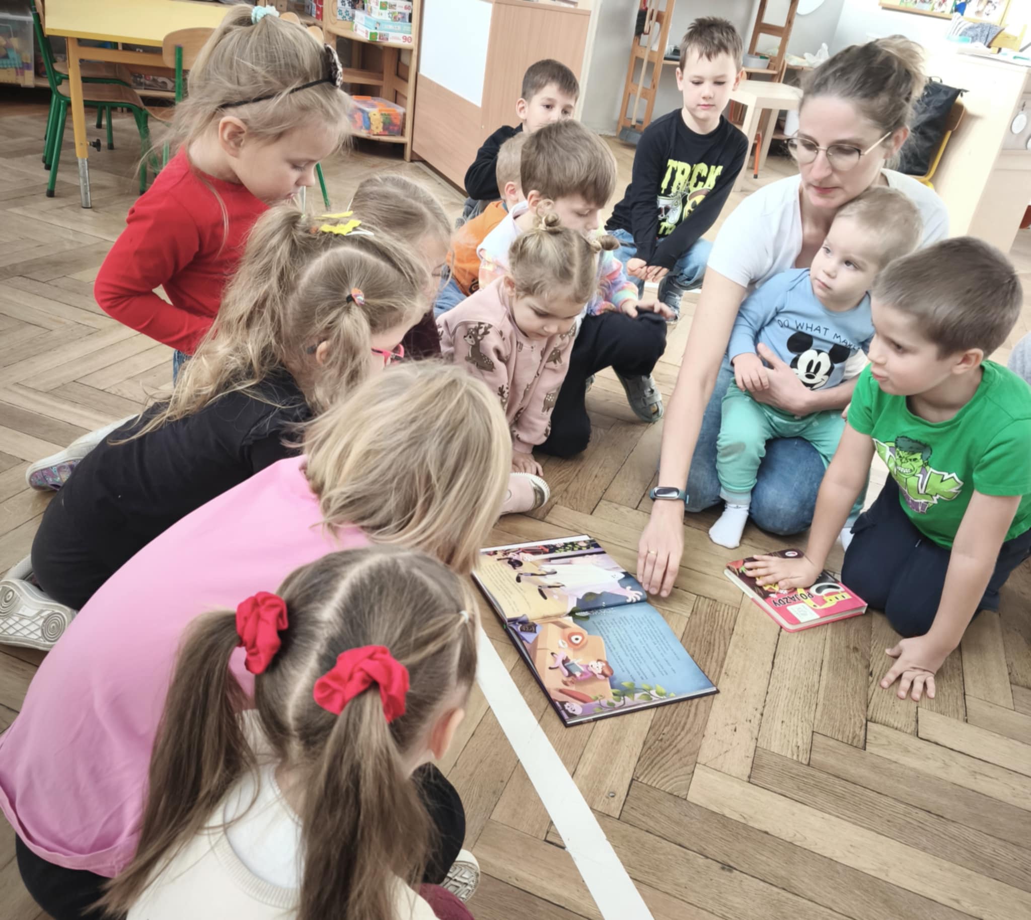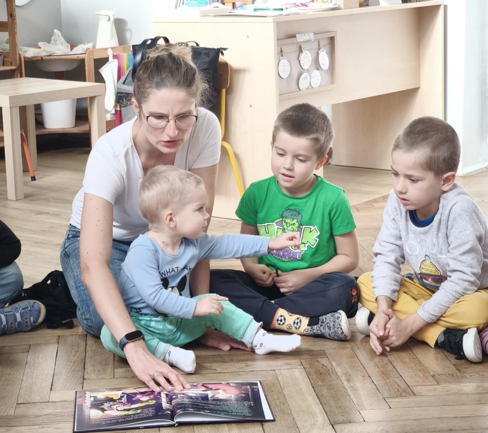Jak zbliżające się Helloween to i książka o straszeniu - na wesoło oczywiście. Wszyscy z uwagą słuchali historię czytaną przez naszego gościa. W spotkaniu brał udział także brat Kacperka - Tobiasz. Kiedy był u nas na czytaniu ostatni raz, był dzidziusiem i oglądał czarno białe książeczki. Teraz pokazał dzieciom książeczkę sensoryczną, która wszystkich również bardzo zainteresowała.