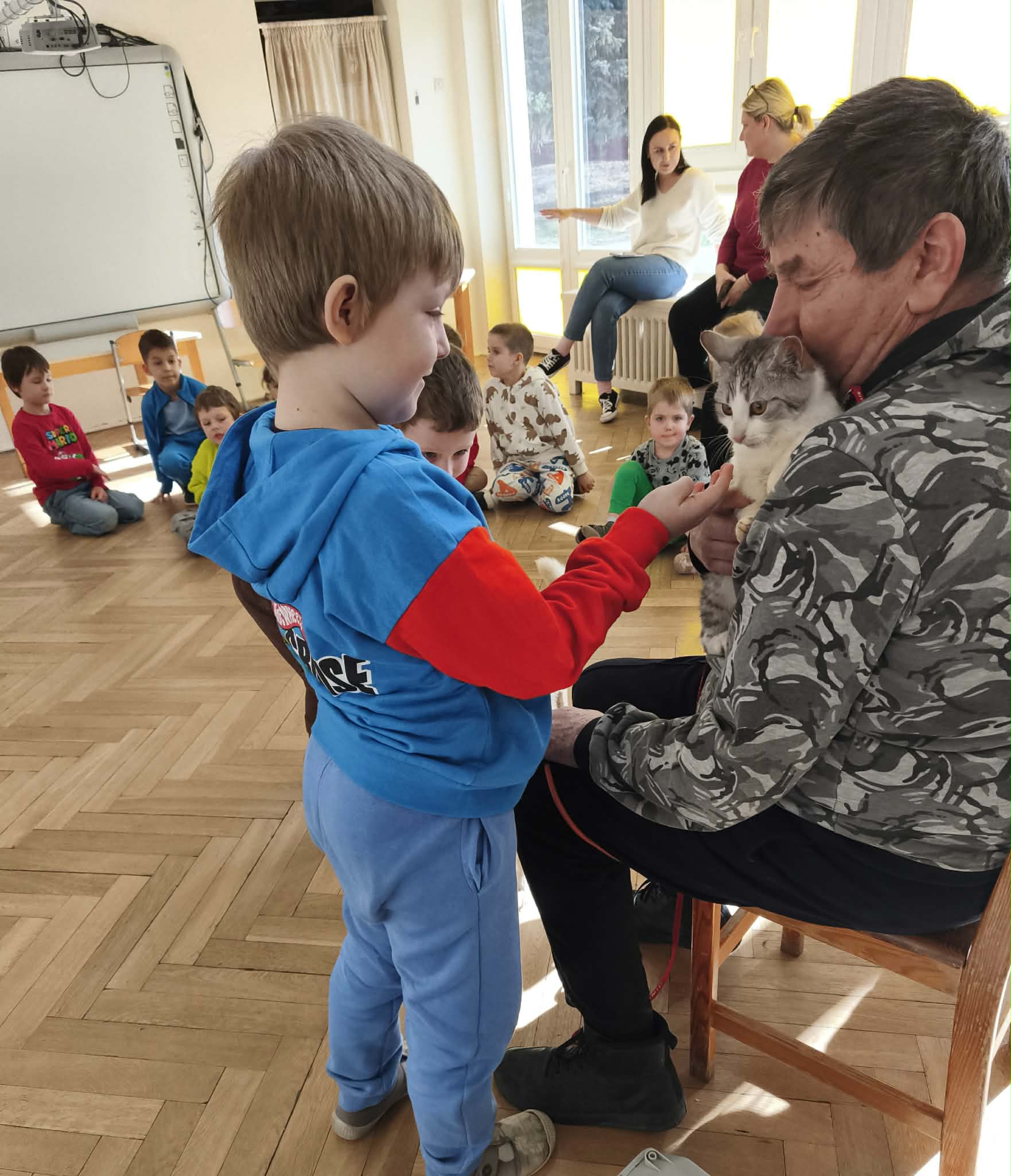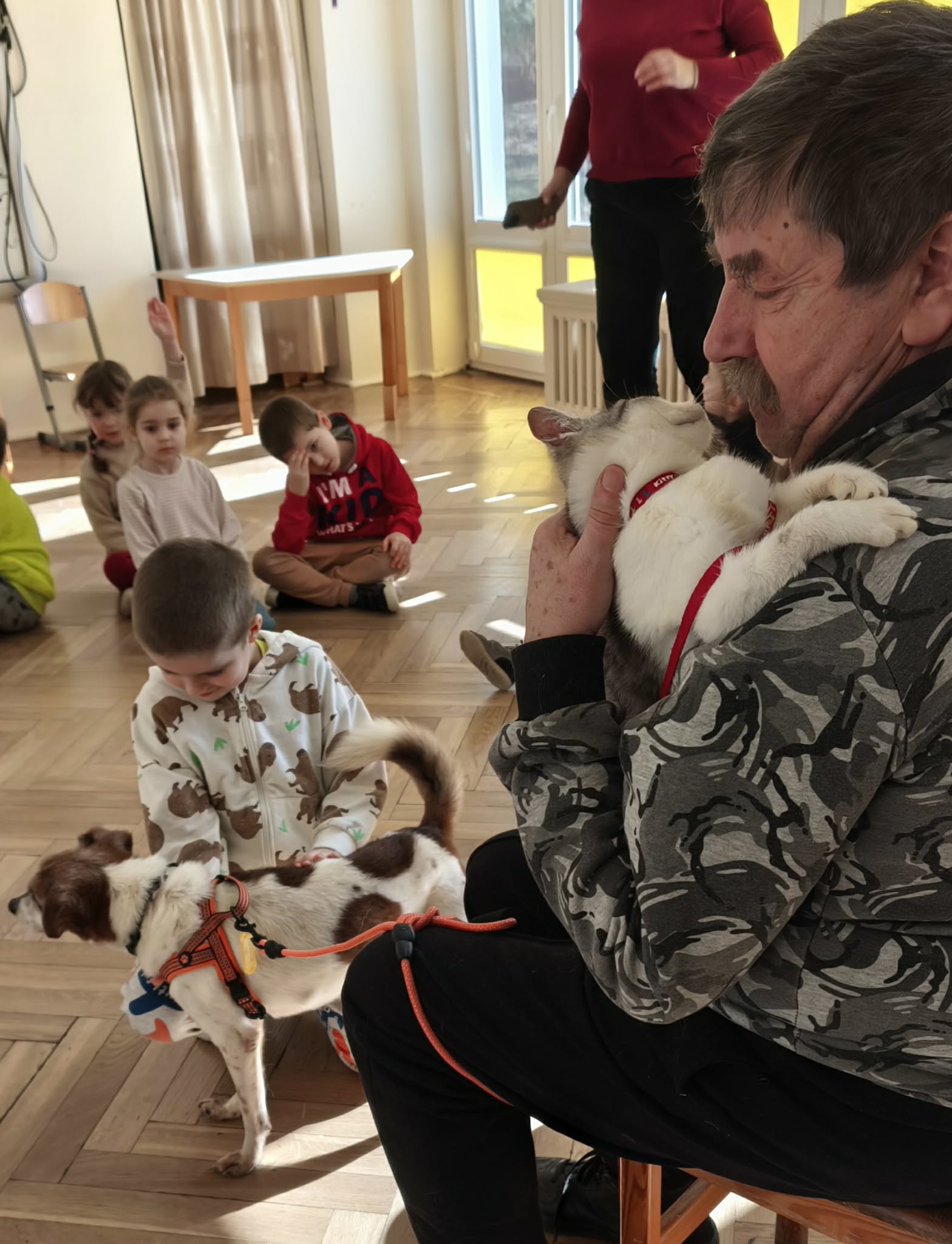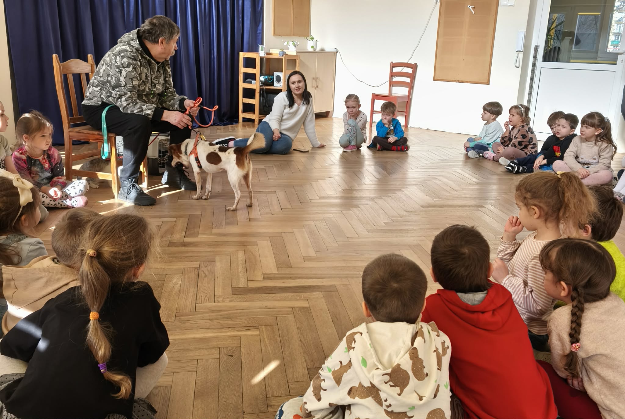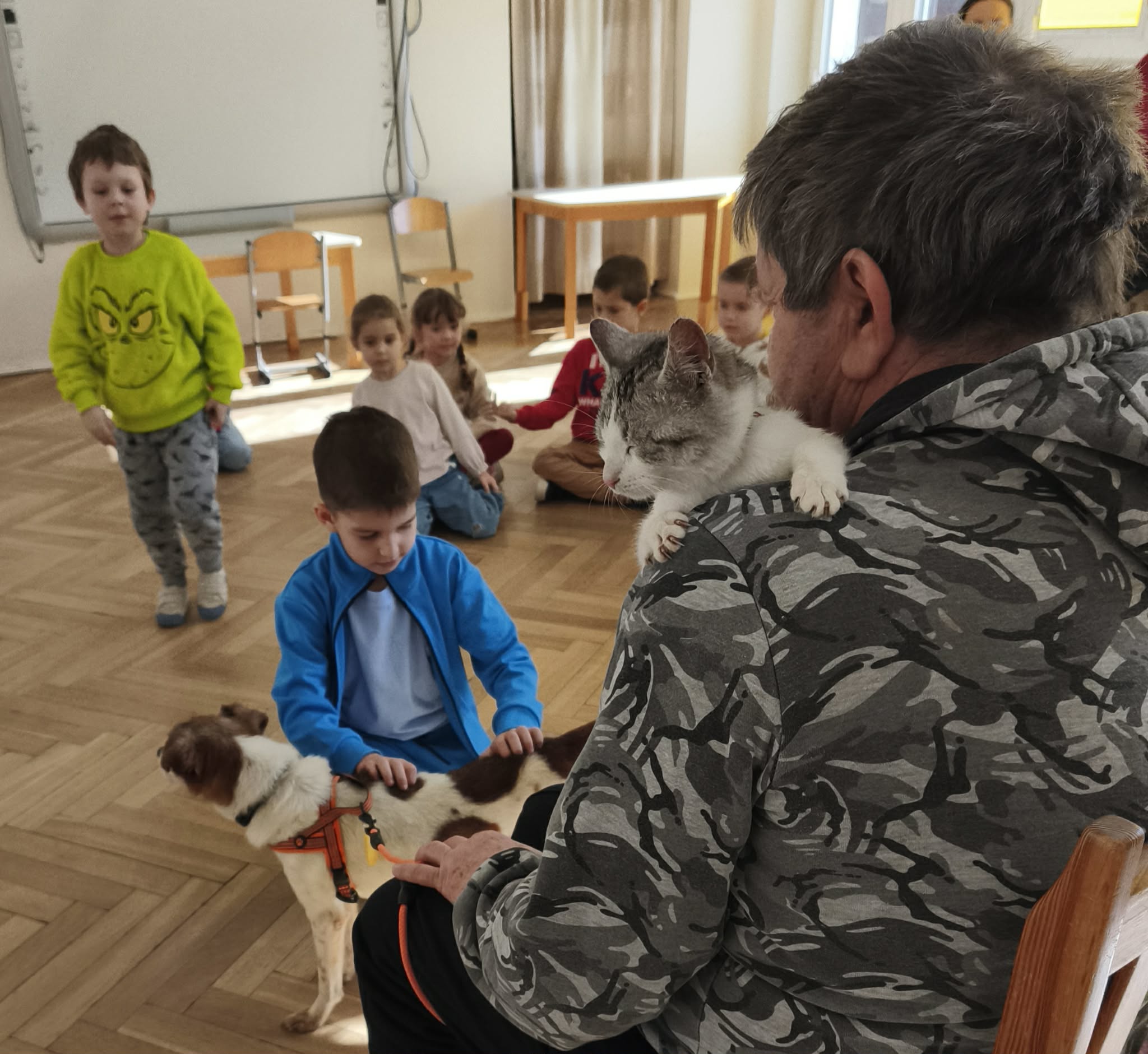 W podziękowaniu za zbiórkę zorganizowaną w naszym przedszkolu odwiedzili nas wyjątkowi goście - Dżeki i jego przyjaciółka mała kicia. Fundacja Azyl powstała z inicjatywy kilku osób i nadal jest niewielką organizacją pomagającą zwierzętom. Ich serca otwarte są nie tylko na psy ale również na dzikie zwierzęta: bociany, zające, .gołębie itp. Szukają właścicieli psów, szukają nowych domów dla mieszkańców azylu, leczą, wspierają. Przybyłe do nas zwierzęta również są do adopcji. Mogły przebywać wśród dzieci ponieważ wykazują się spokojem, opanowaniem i łagodnością. Jeśli ktoś z Państwa myśli o kolejnym członku rodziny warto przyjrzeć się pensjonariuszom tej fundacji.