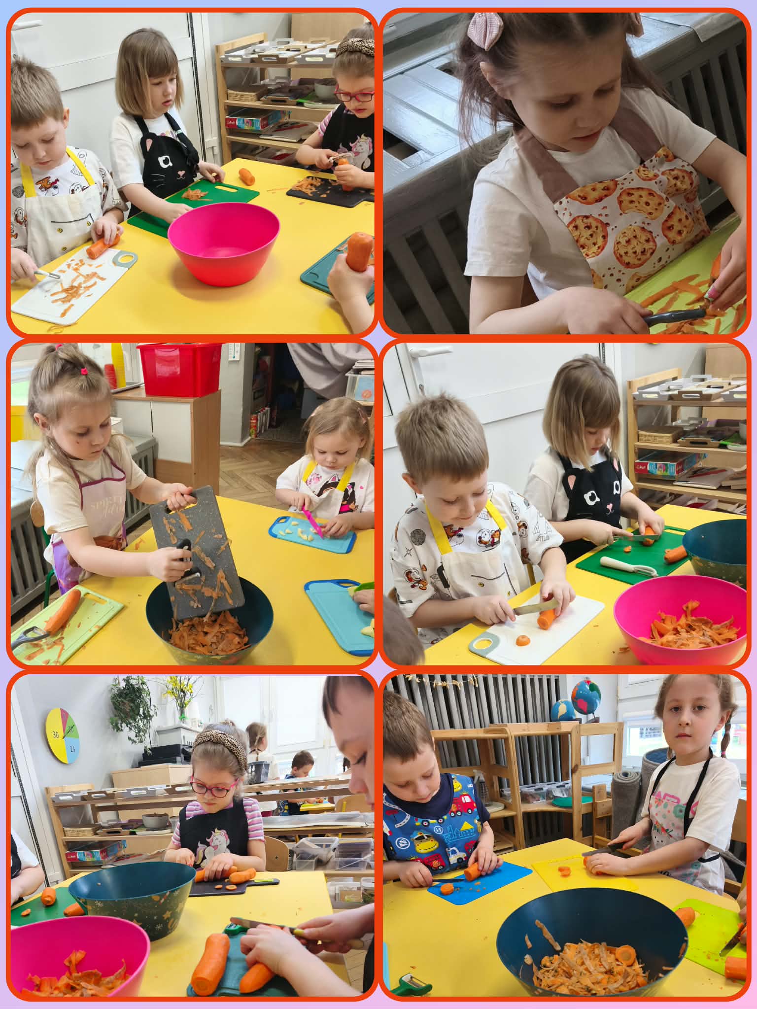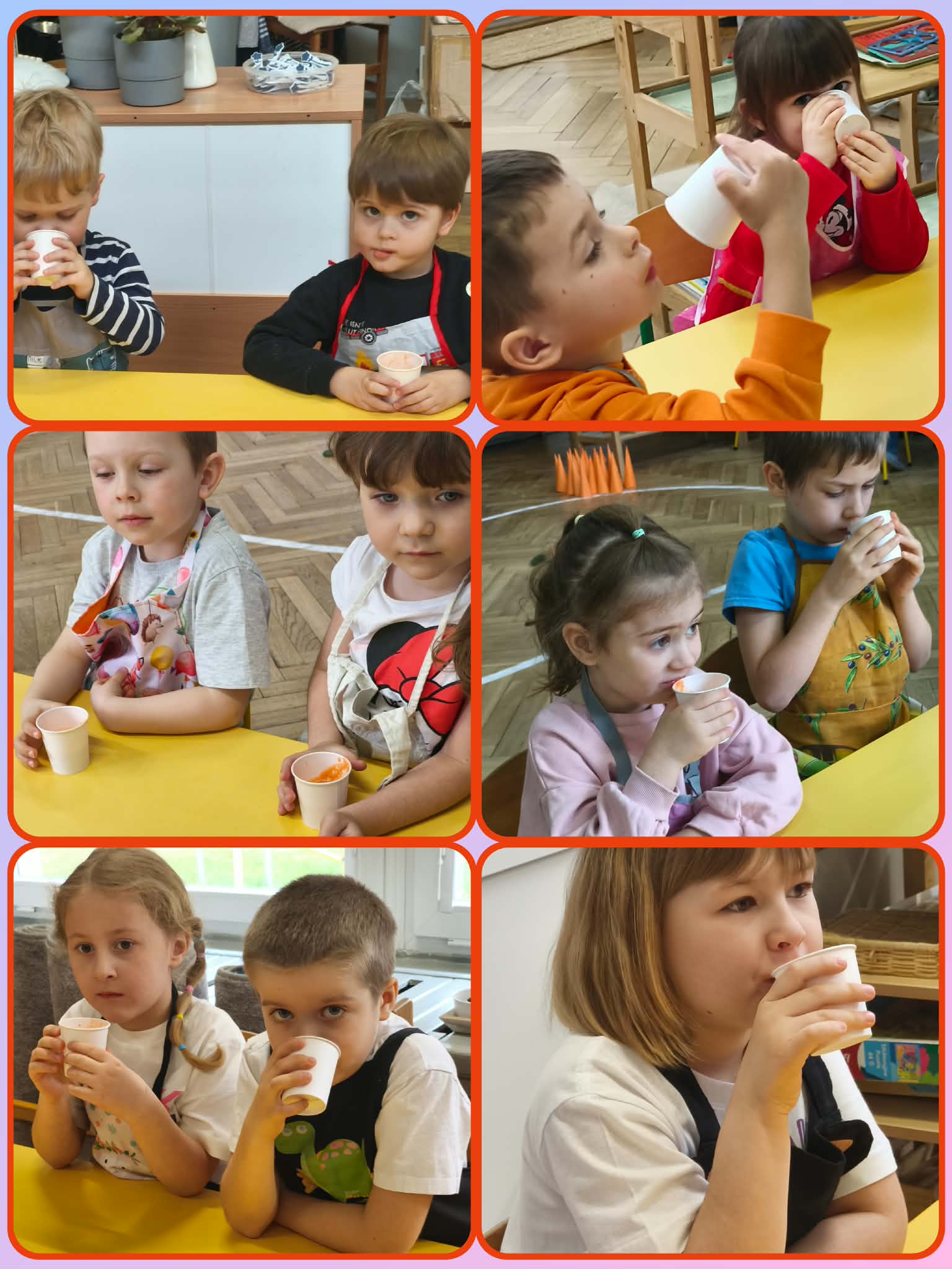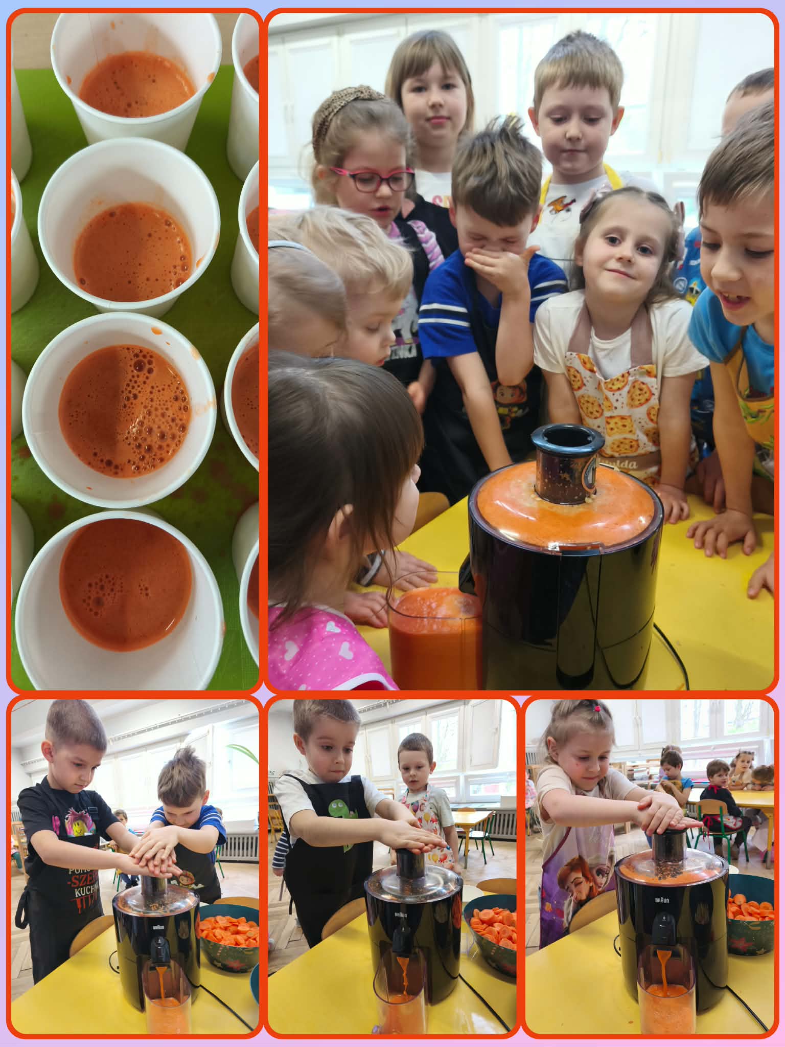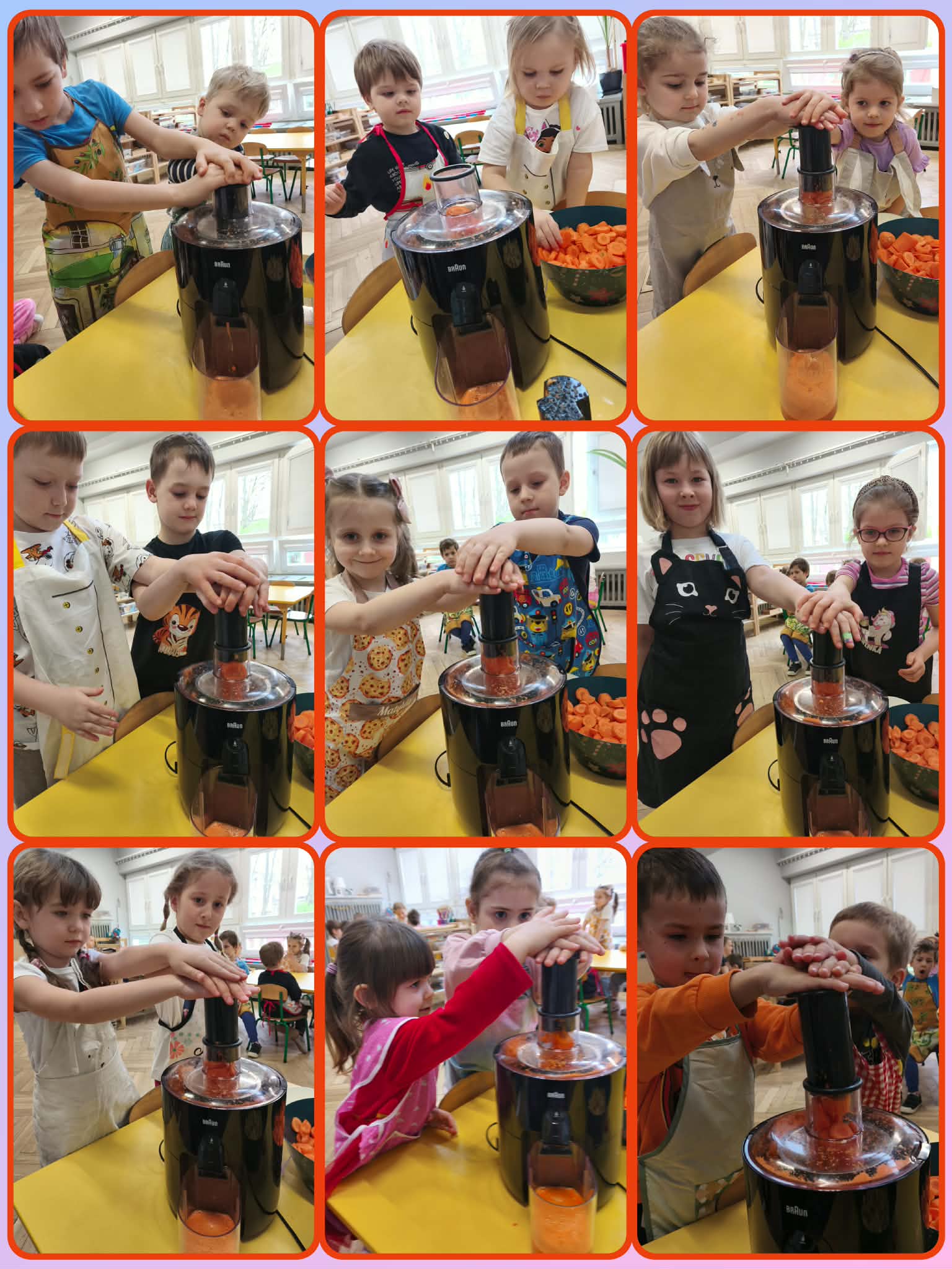 Podczas kolejnych zajęć kulinarnych dzieci poznały sokowirówkę. Z zaciekawieniem pytały o jej działanie i wykorzystanie w kuchni. Ponieważ zaplanowane było przygotowanie soku marchewkowo - jabłkowego dzieci zabrały się do pracy. Obieranie warzyw większości starszych dzieci nie sprawia już problemu, młodsze dzieci z zaangażowaniem kroiły jabłka oraz marchewki. Pomoc w takich kuchennych obowiązkach daje dużo satysfakcji i radości z samego działania. Wszystkie przygotowane i umyte marchewki i jabłka trafiły do sokowirówki, było to ciekawe doświadczenie. Sok wyszedł wyśmienity i była to iście królewska degustacja.