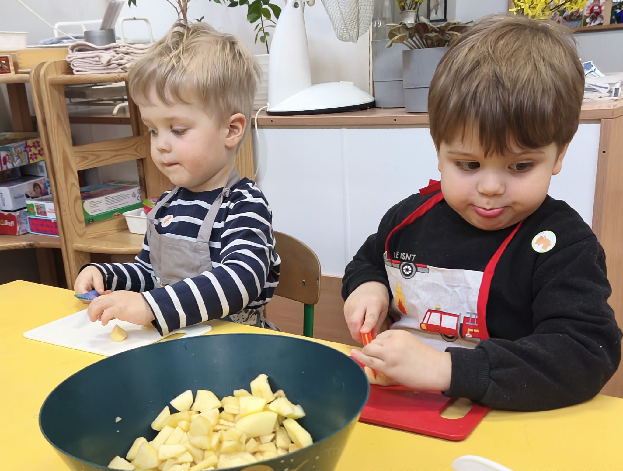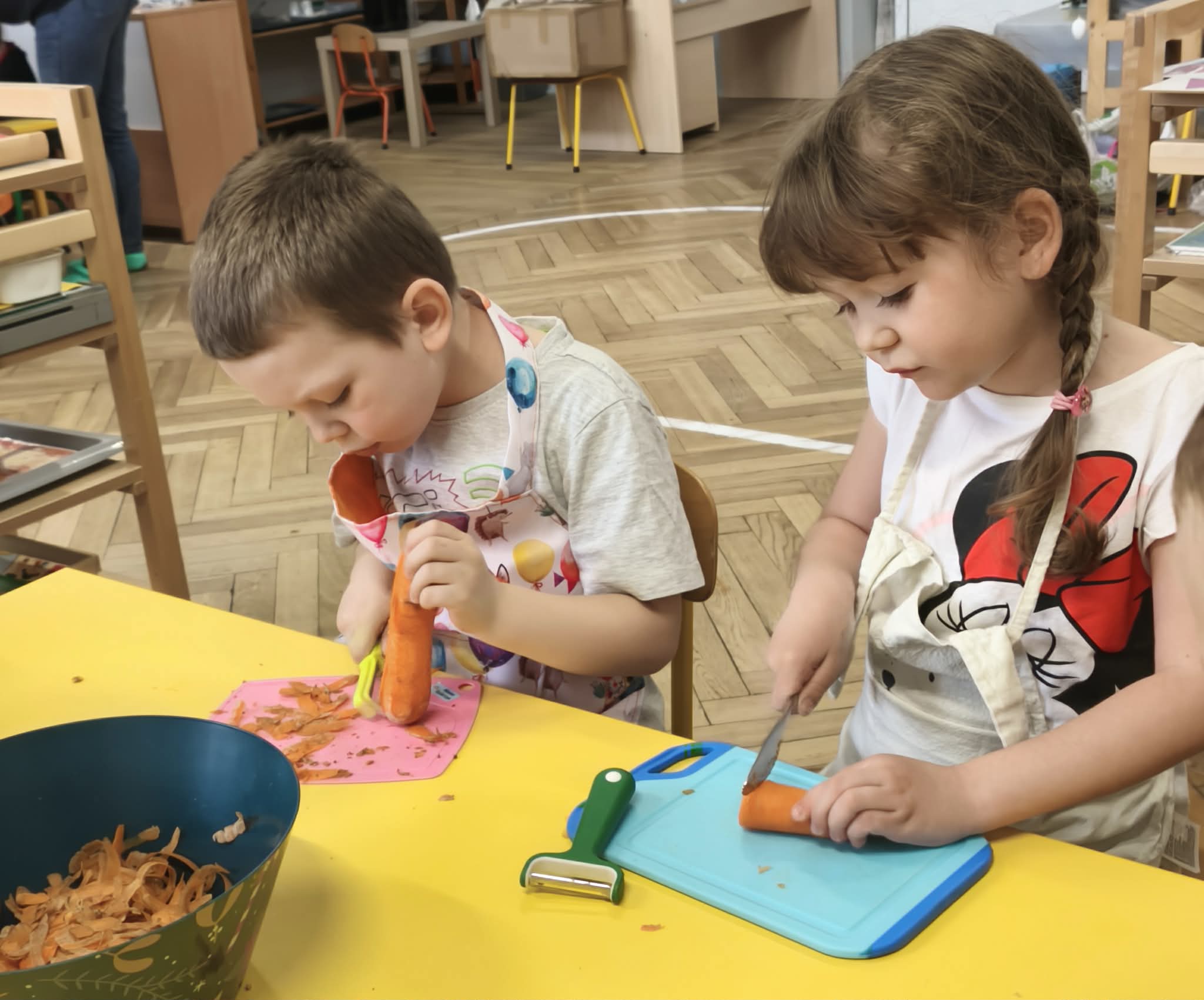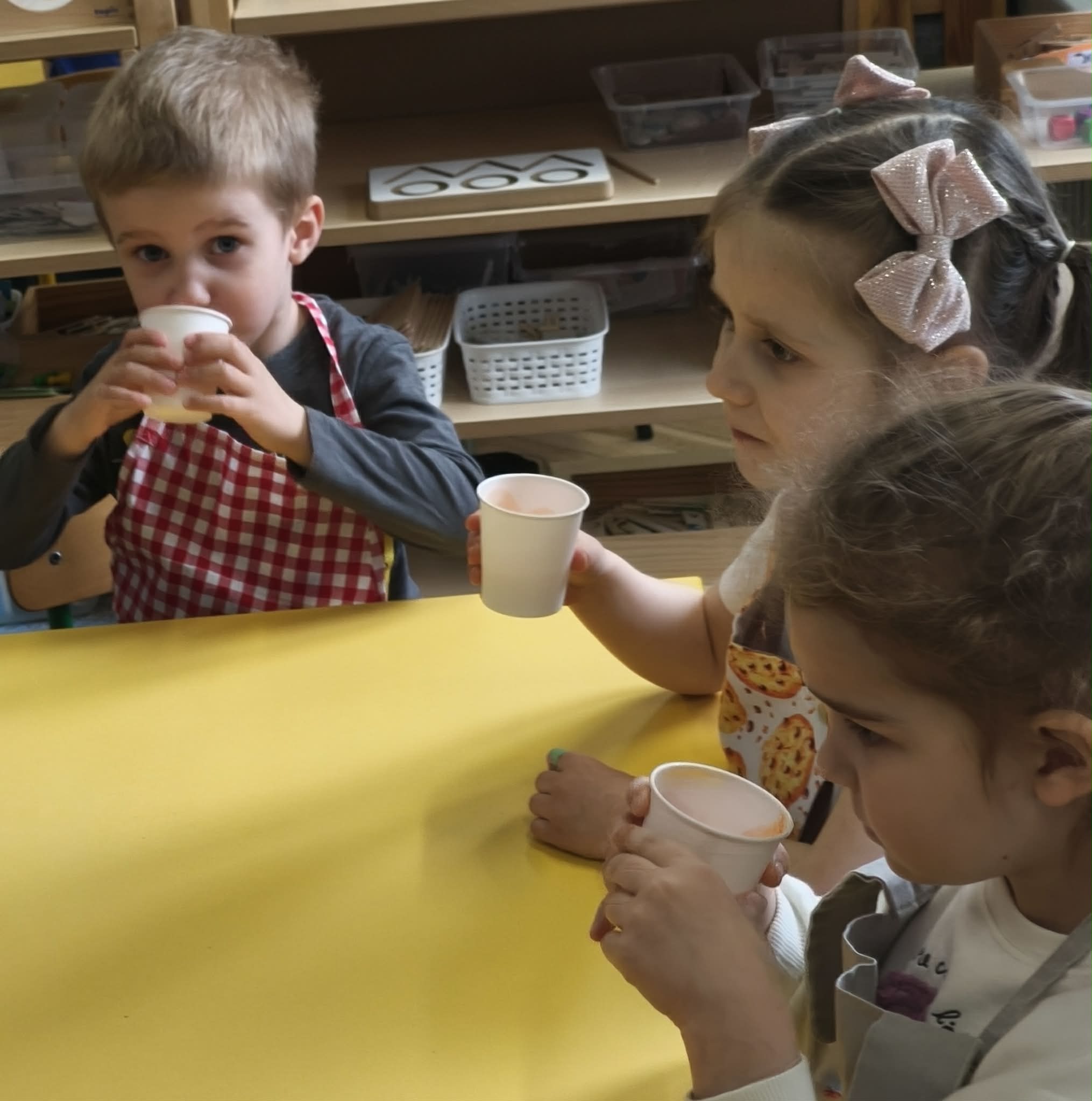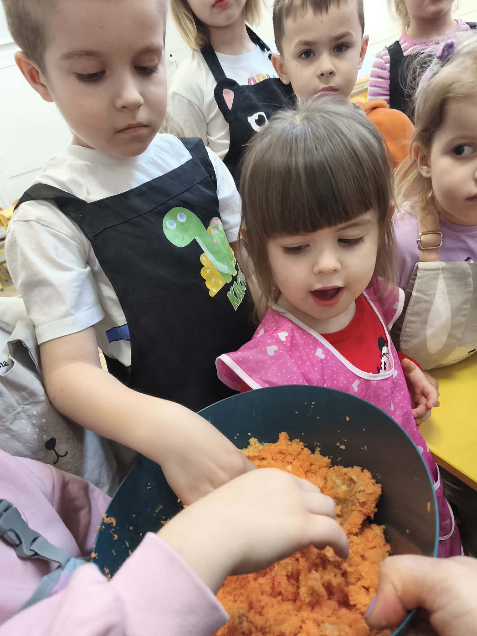 Podczas kolejnych zajęć kulinarnych dzieci poznały sokowirówkę. Z zaciekawieniem pytały o jej działanie i wykorzystanie w kuchni. Ponieważ zaplanowane było przygotowanie soku marchewkowo - jabłkowego dzieci zabrały się do pracy. Obieranie warzyw większości starszych dzieci nie sprawia już problemu, młodsze dzieci z zaangażowaniem kroiły jabłka oraz marchewki. Pomoc w takich kuchennych obowiązkach daje dużo satysfakcji i radości z samego działania. Wszystkie przygotowane i umyte marchewki i jabłka trafiły do sokowirówki, było to ciekawe doświadczenie. Sok wyszedł wyśmienity i była to iście królewska degustacja.