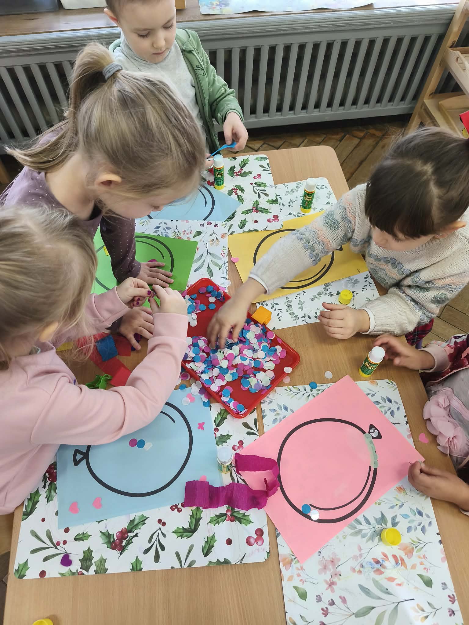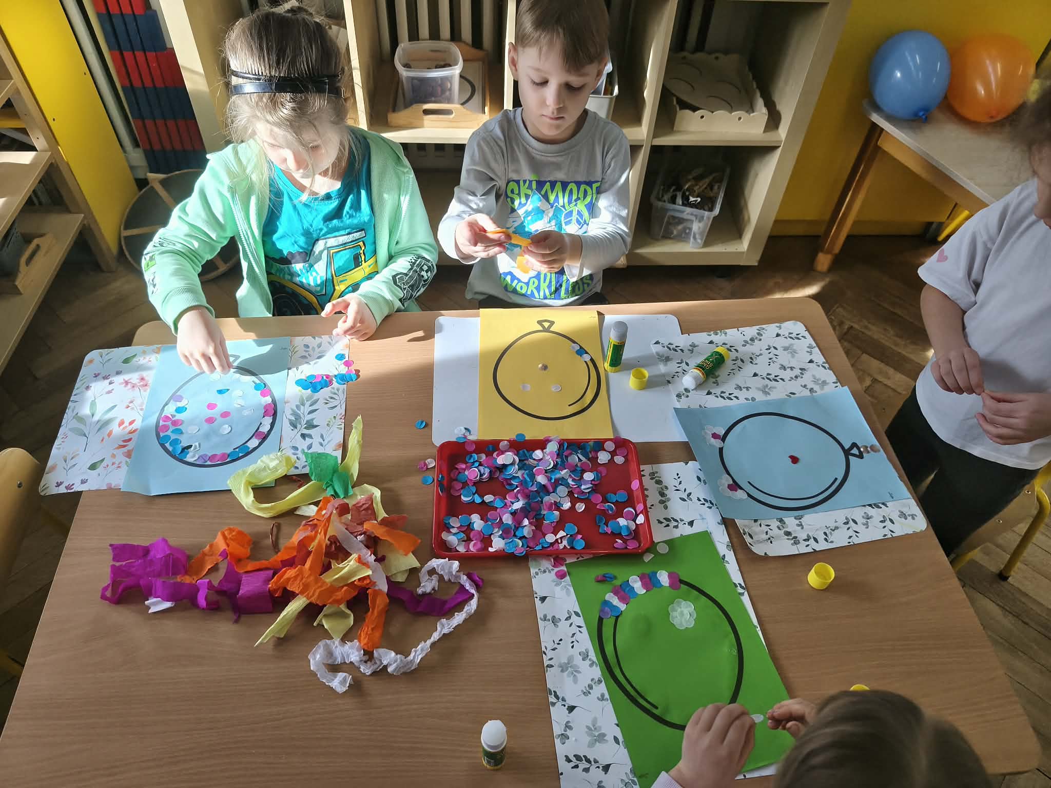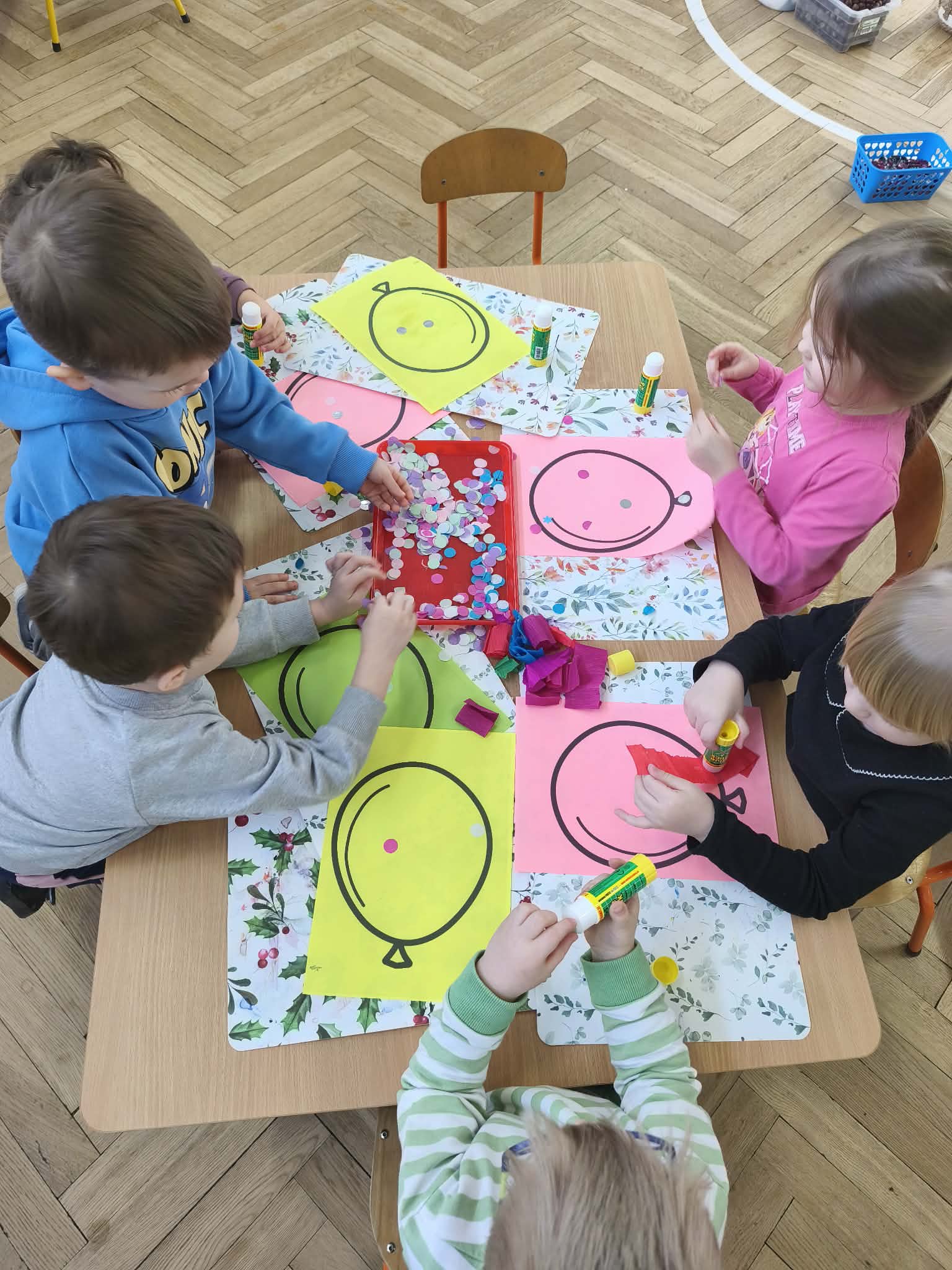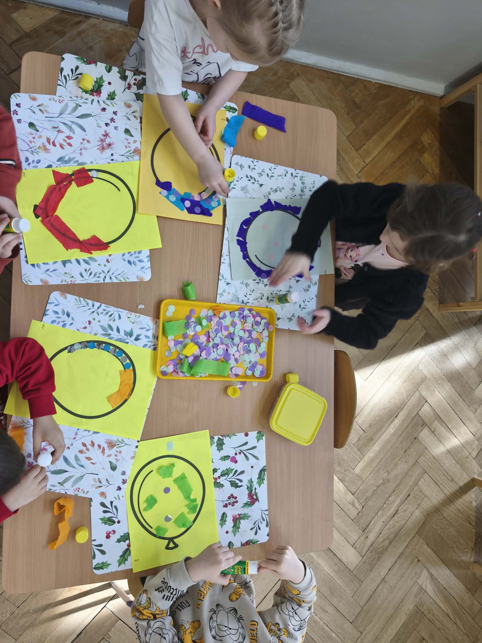 W ramach rozmów o karnawale dzieci wzięły udział w zajęciach, w których głównymi bohaterami były balony. Dzieci uczestniczyły w radosnych zabawach ruchowych, wykazały się ogromną wyobraźnią, tworząc kreatywne konstrukcje i kompozycje z wykorzystaniem guzików, drewnianych krążków, klocków oraz kasztanów. Zwieńczeniem zabaw były barwne prace plastyczne – dzieci stworzyły balony, wykorzystując kolorowe kółeczka konfetti. To był dzień pełen twórczej energii i ćwiczenia rąk.