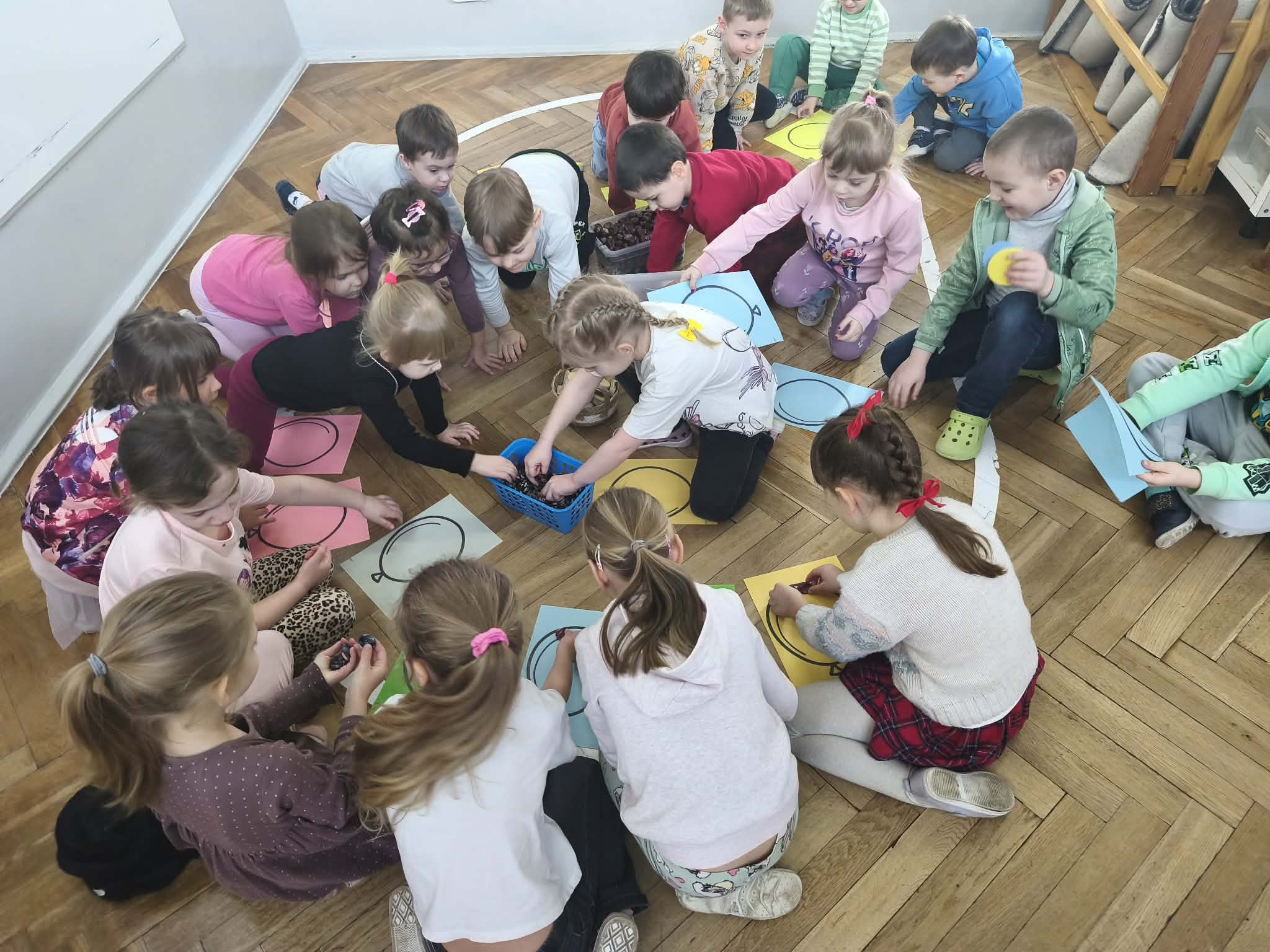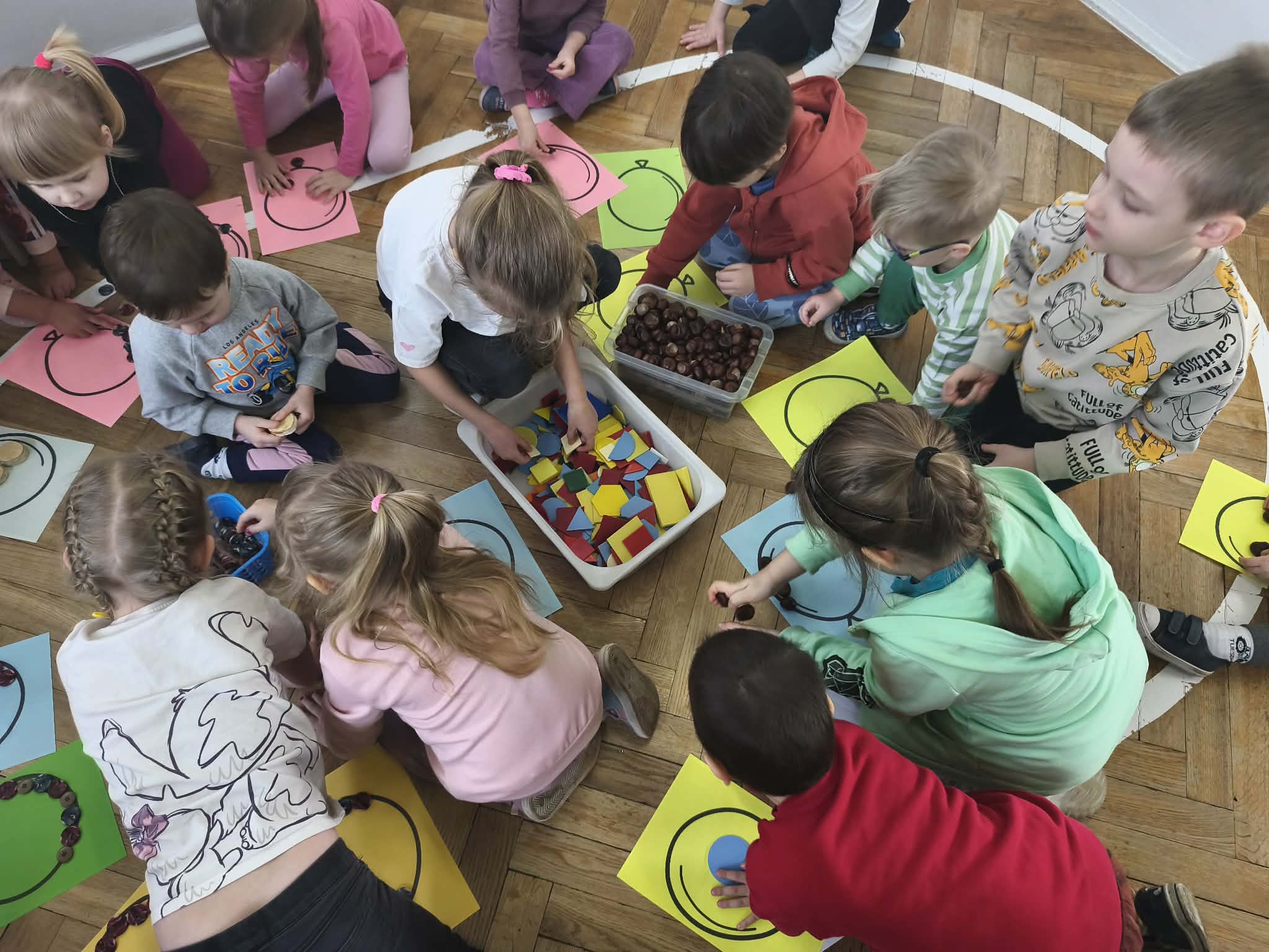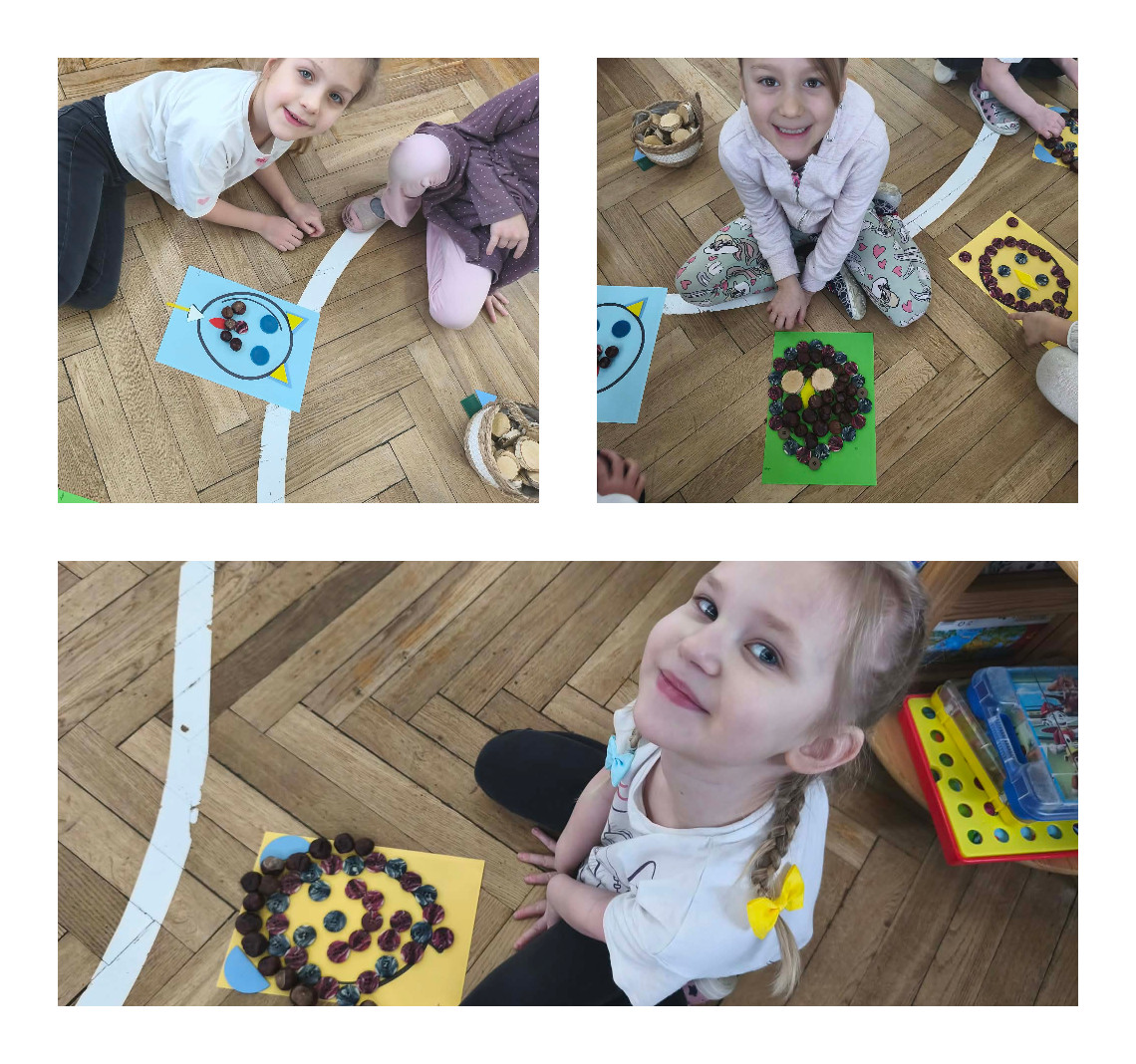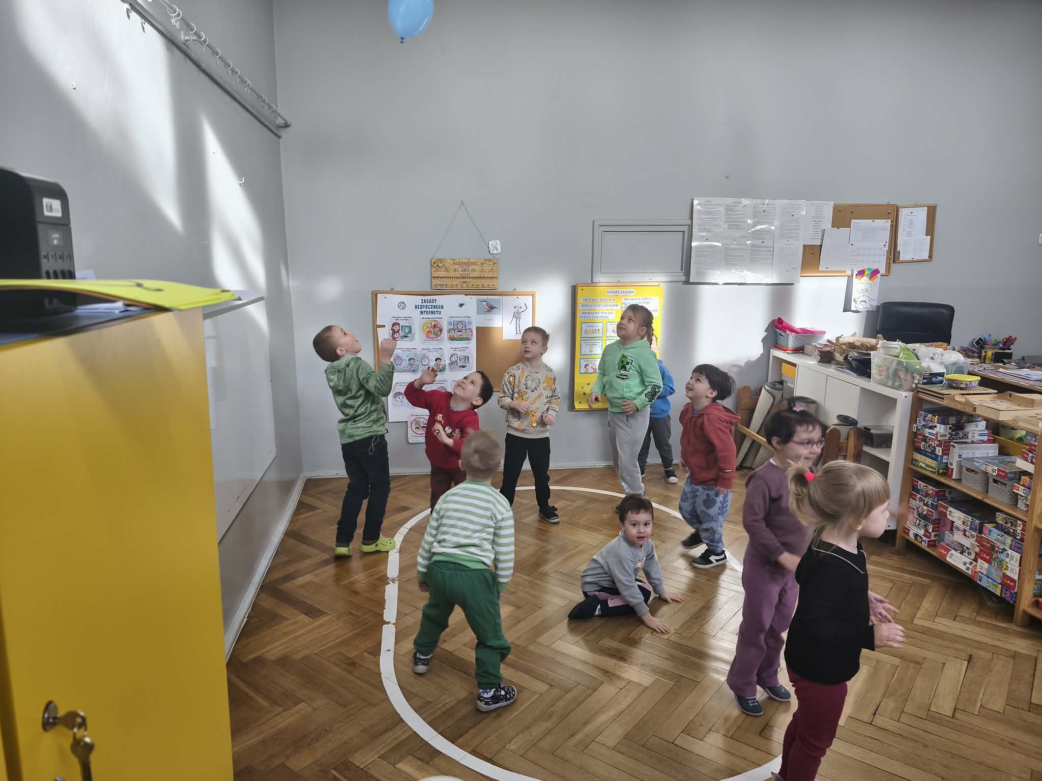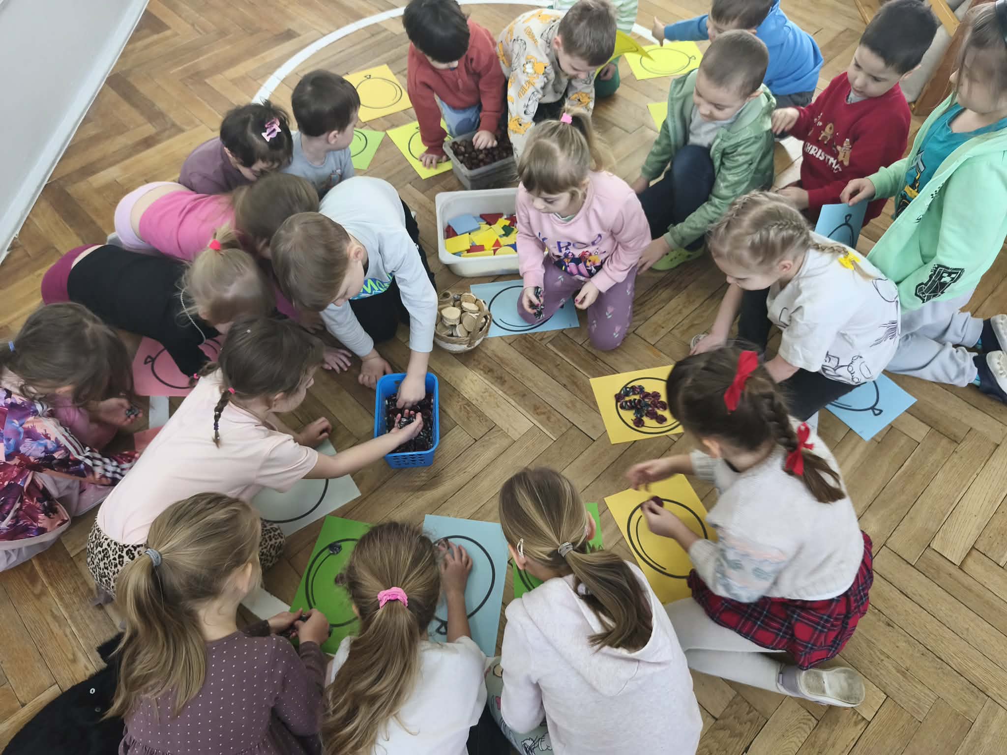 W ramach rozmów o karnawale dzieci wzięły udział w zajęciach, w których głównymi bohaterami były balony. Dzieci uczestniczyły w radosnych zabawach ruchowych, wykazały się ogromną wyobraźnią, tworząc kreatywne konstrukcje i kompozycje z wykorzystaniem guzików, drewnianych krążków, klocków oraz kasztanów. Zwieńczeniem zabaw były barwne prace plastyczne – dzieci stworzyły balony, wykorzystując kolorowe kółeczka konfetti. To był dzień pełen twórczej energii i ćwiczenia rąk.