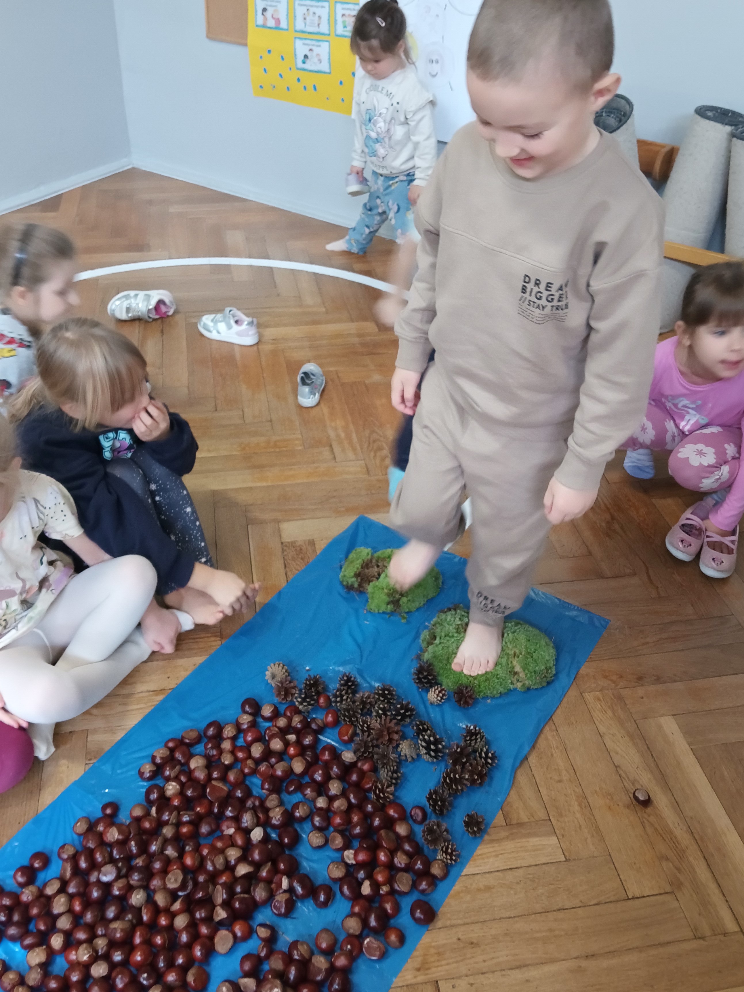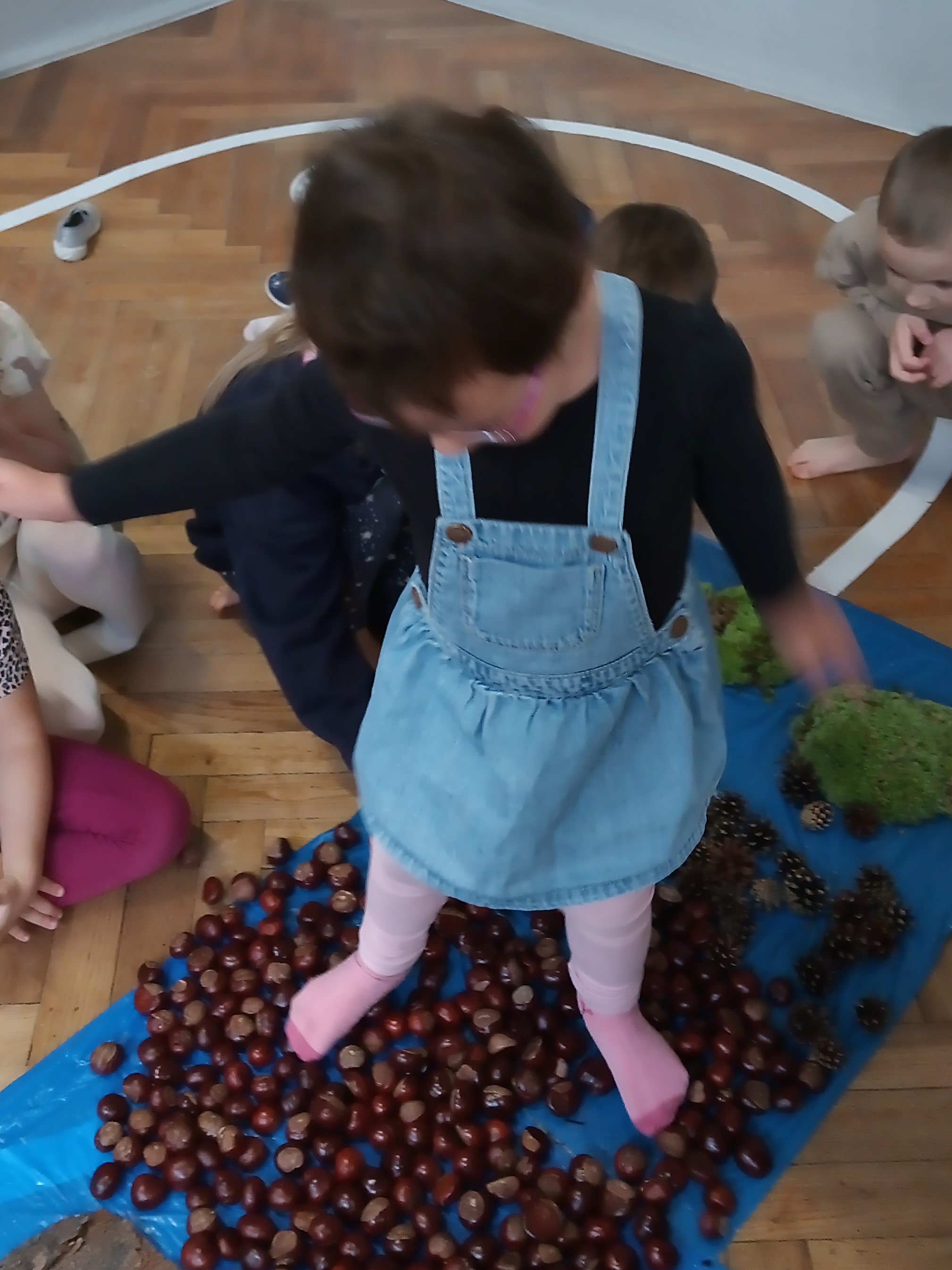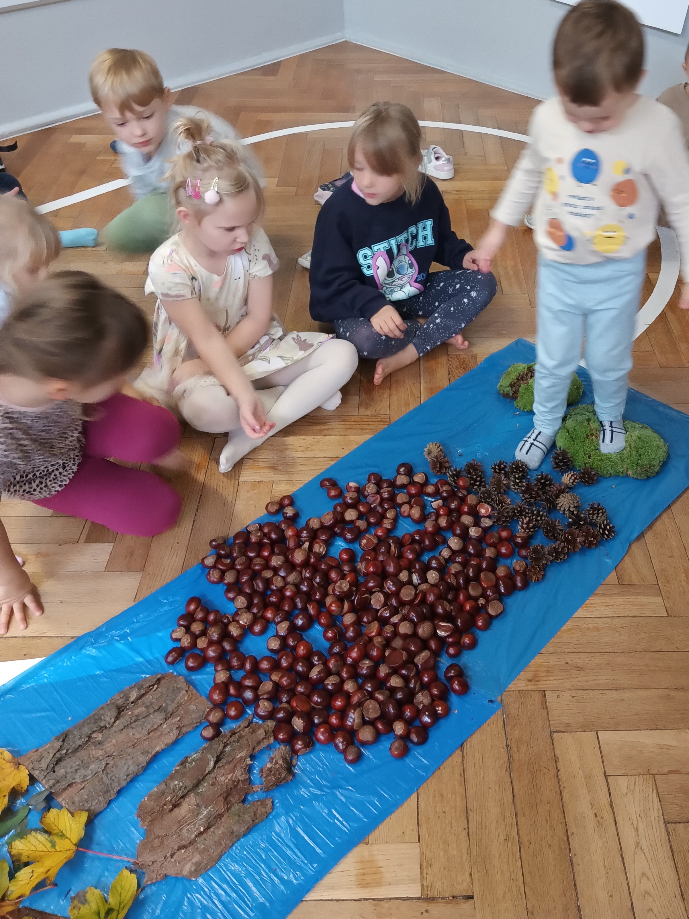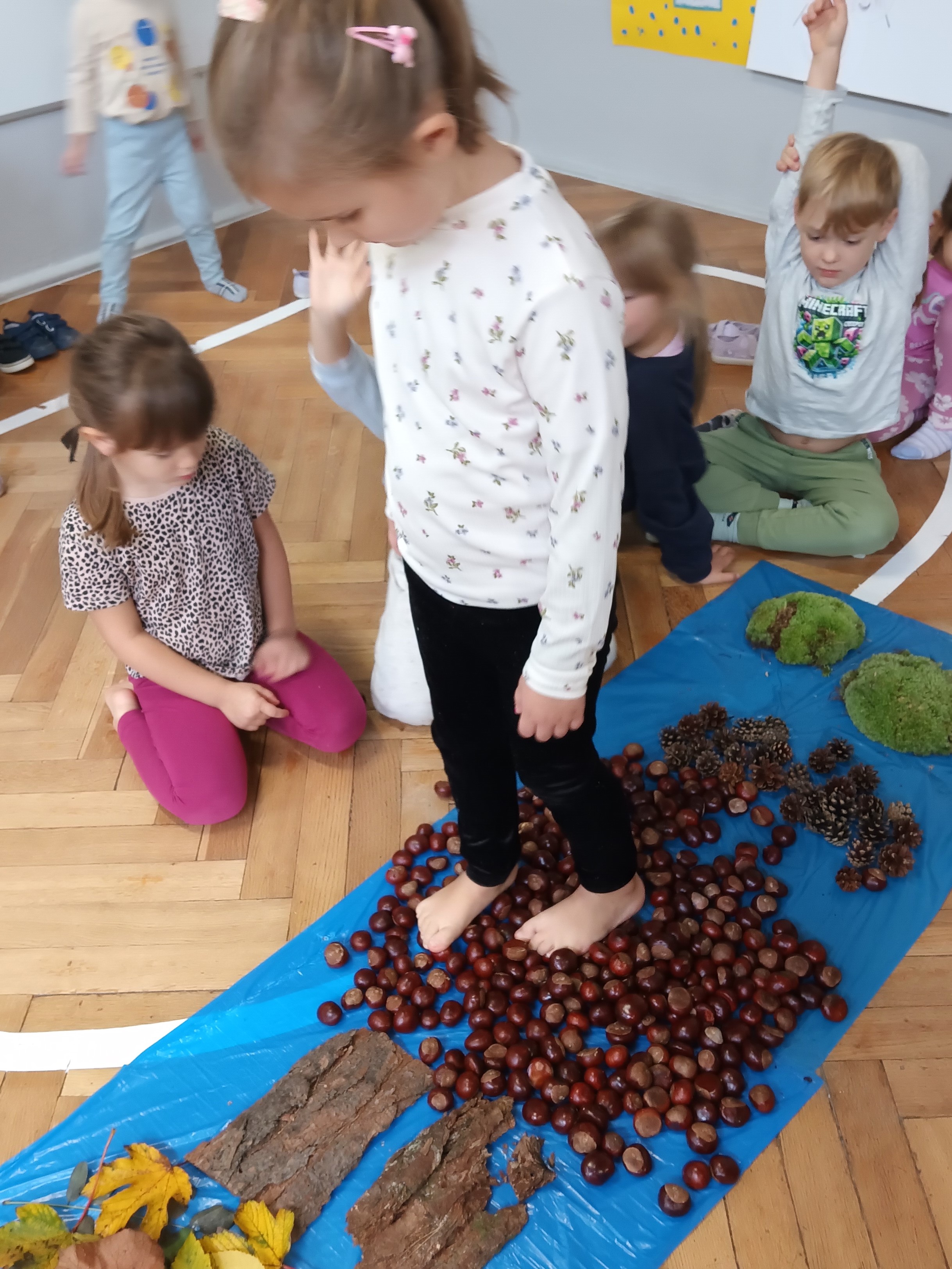 W środę mieliśmy okazję poznać las wieloma zmysłami. Oglądaliśmy, wąchaliśmy, dotykaliśmy darów lasu- mech, szyszki, kasztany, liście, korę drzew. Na zakończenie mogliśmy przejść leśną ścieżką gołą stopą (niektórzy w skarpetach).