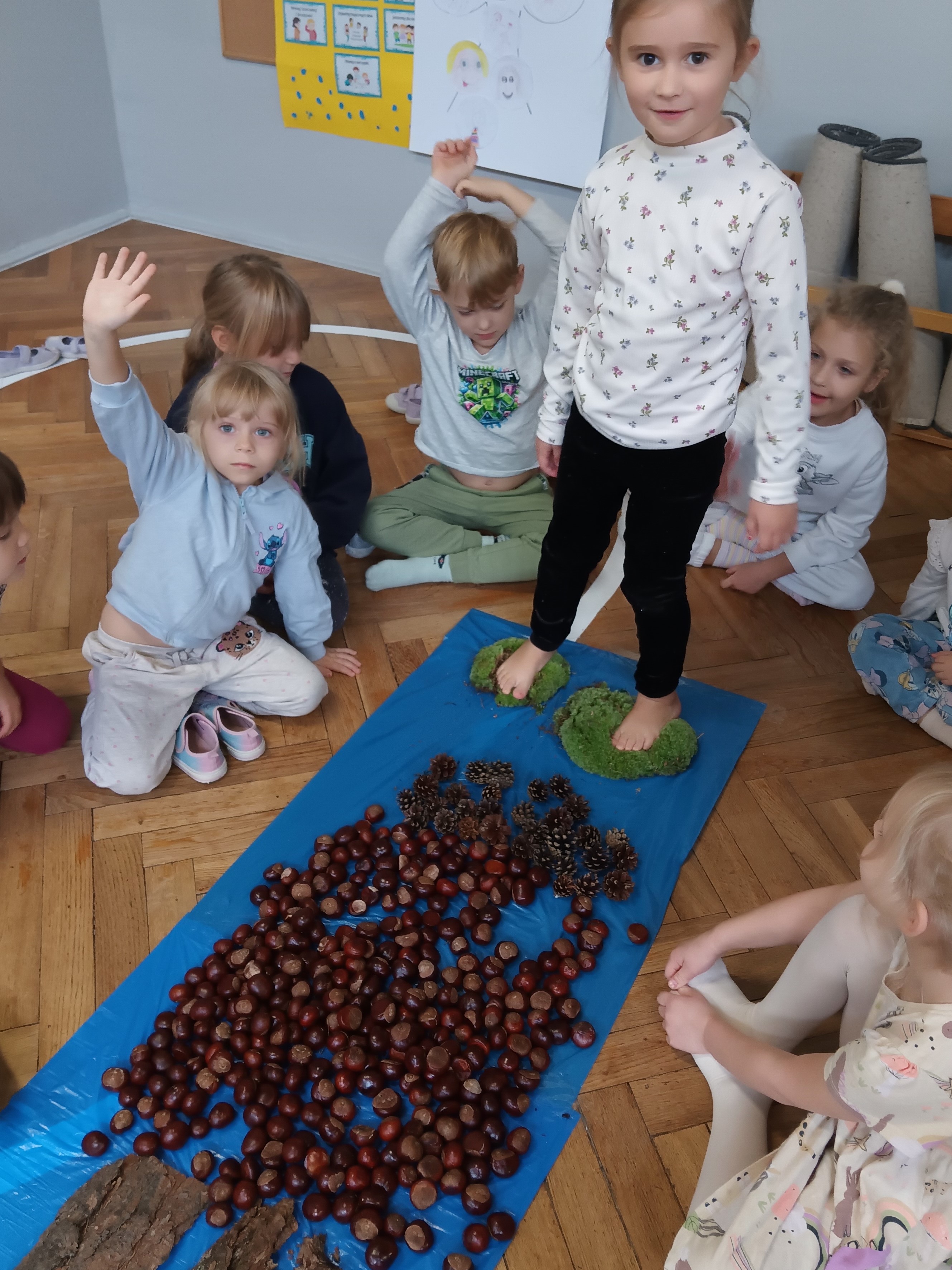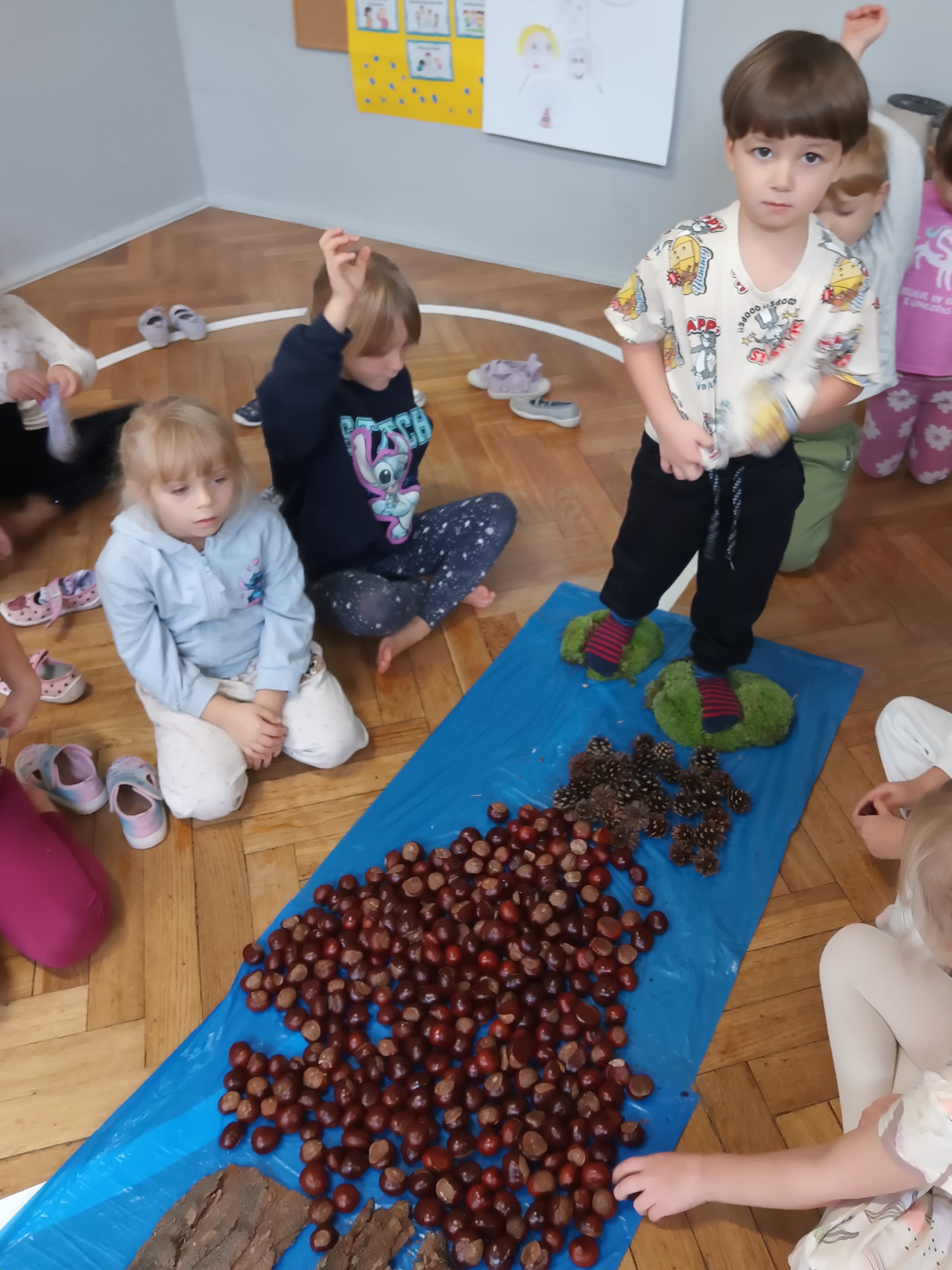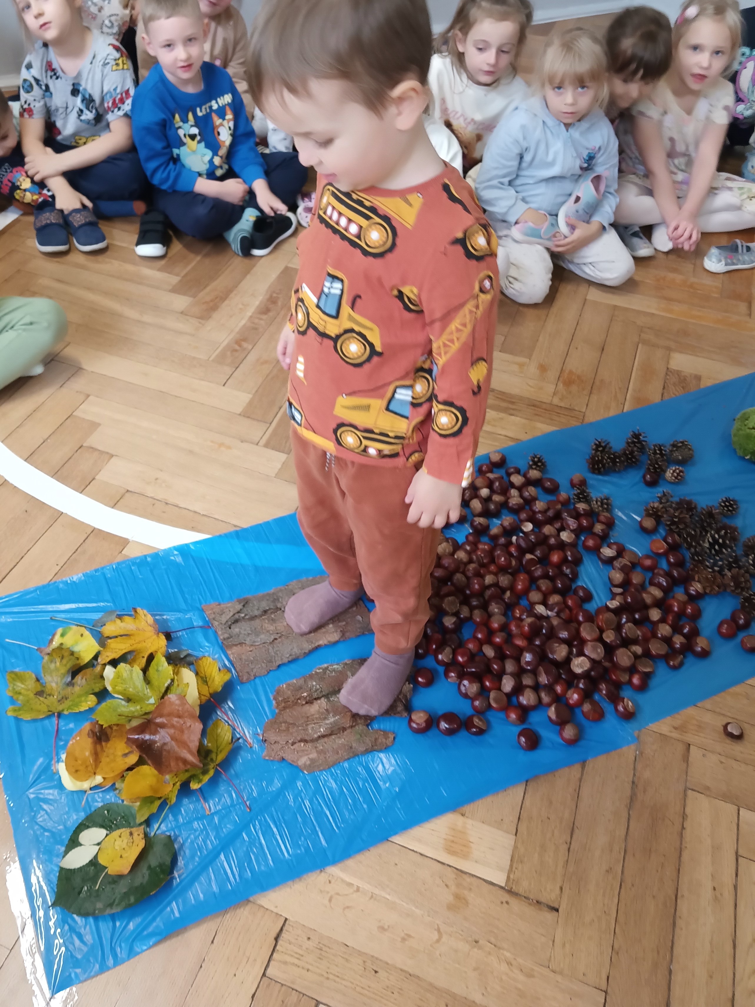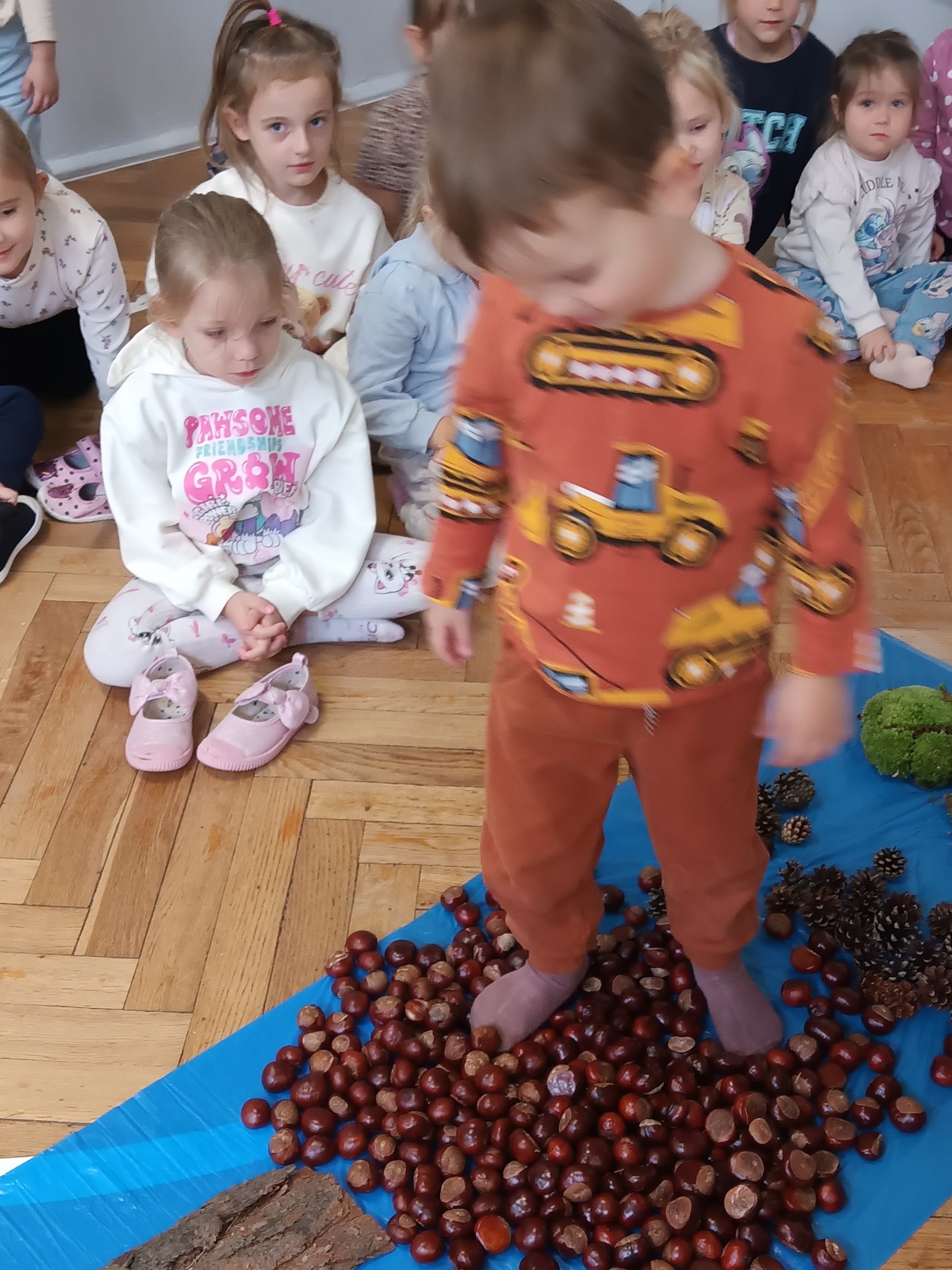 W środę mieliśmy okazję poznać las wieloma zmysłami. Oglądaliśmy, wąchaliśmy, dotykaliśmy darów lasu- mech, szyszki, kasztany, liście, korę drzew. Na zakończenie mogliśmy przejść leśną ścieżką gołą stopą (niektórzy w skarpetach).