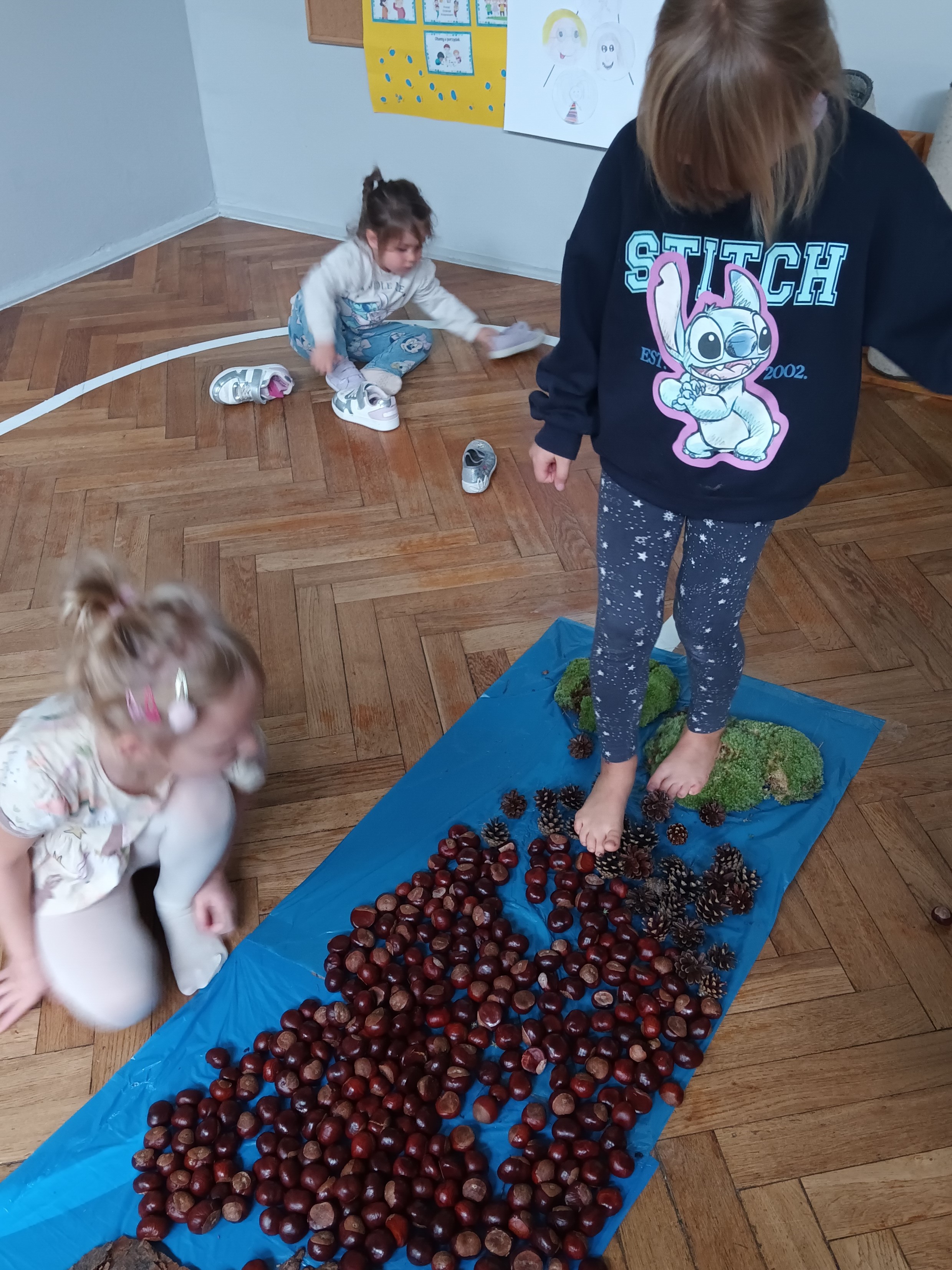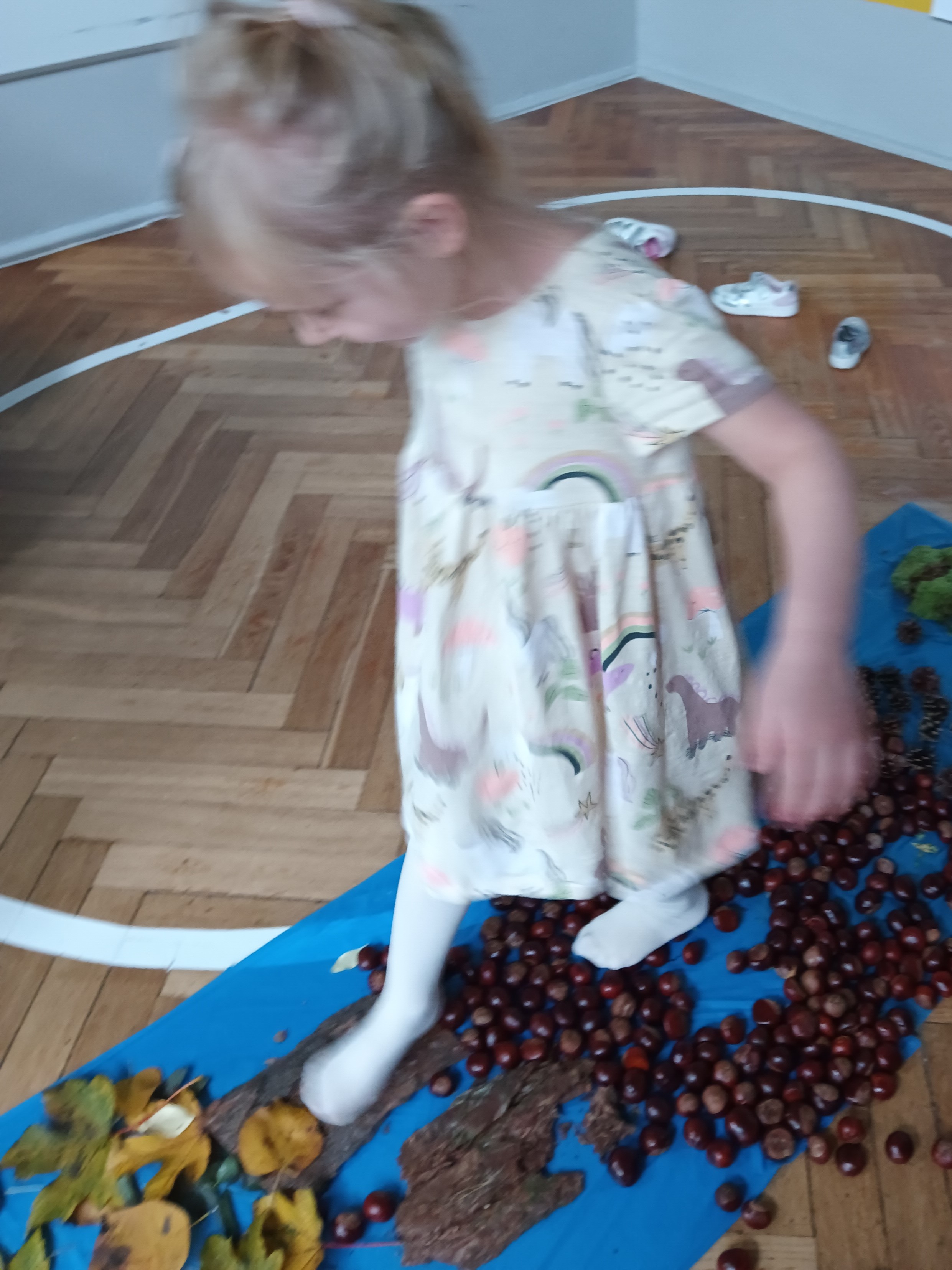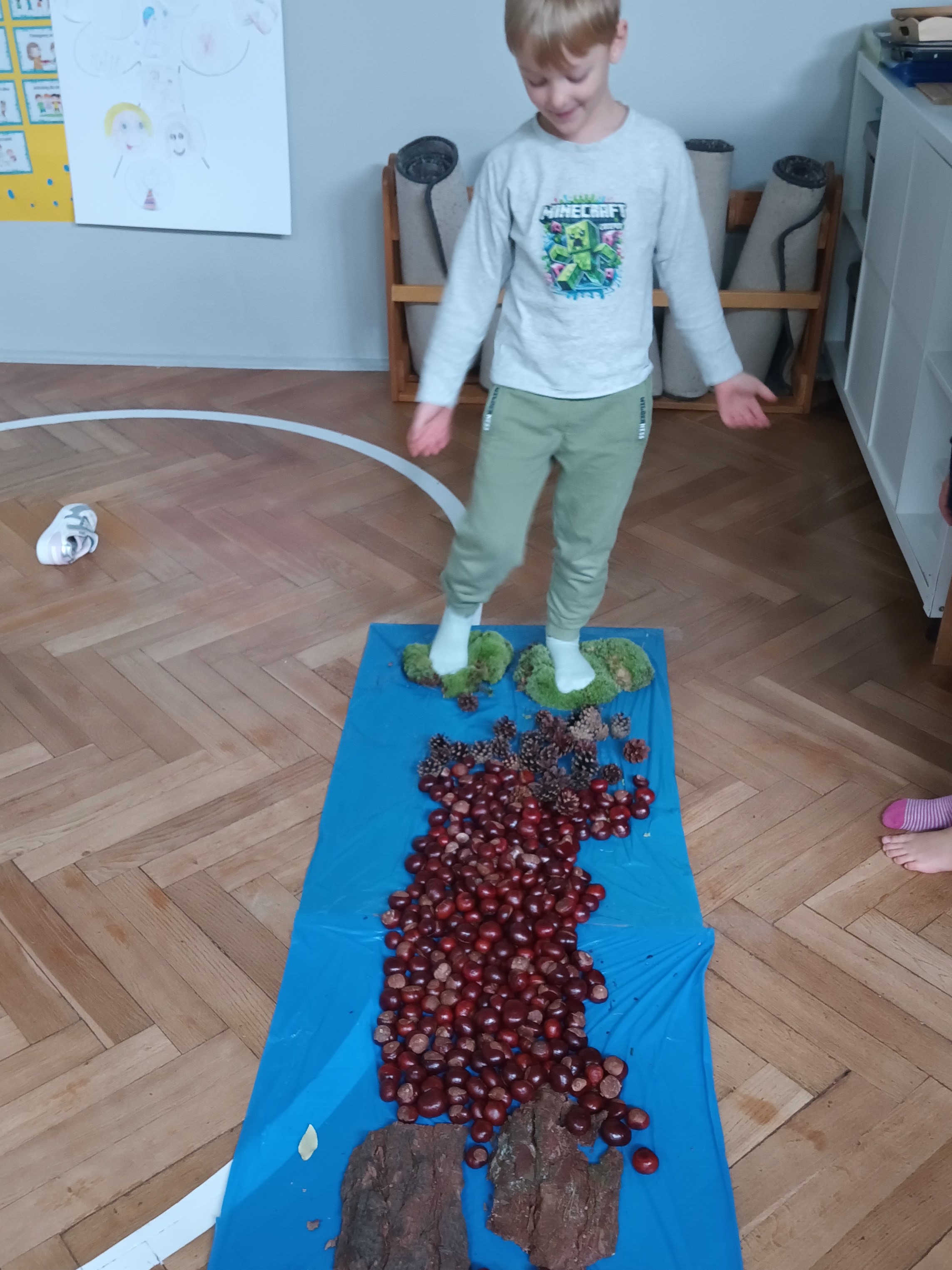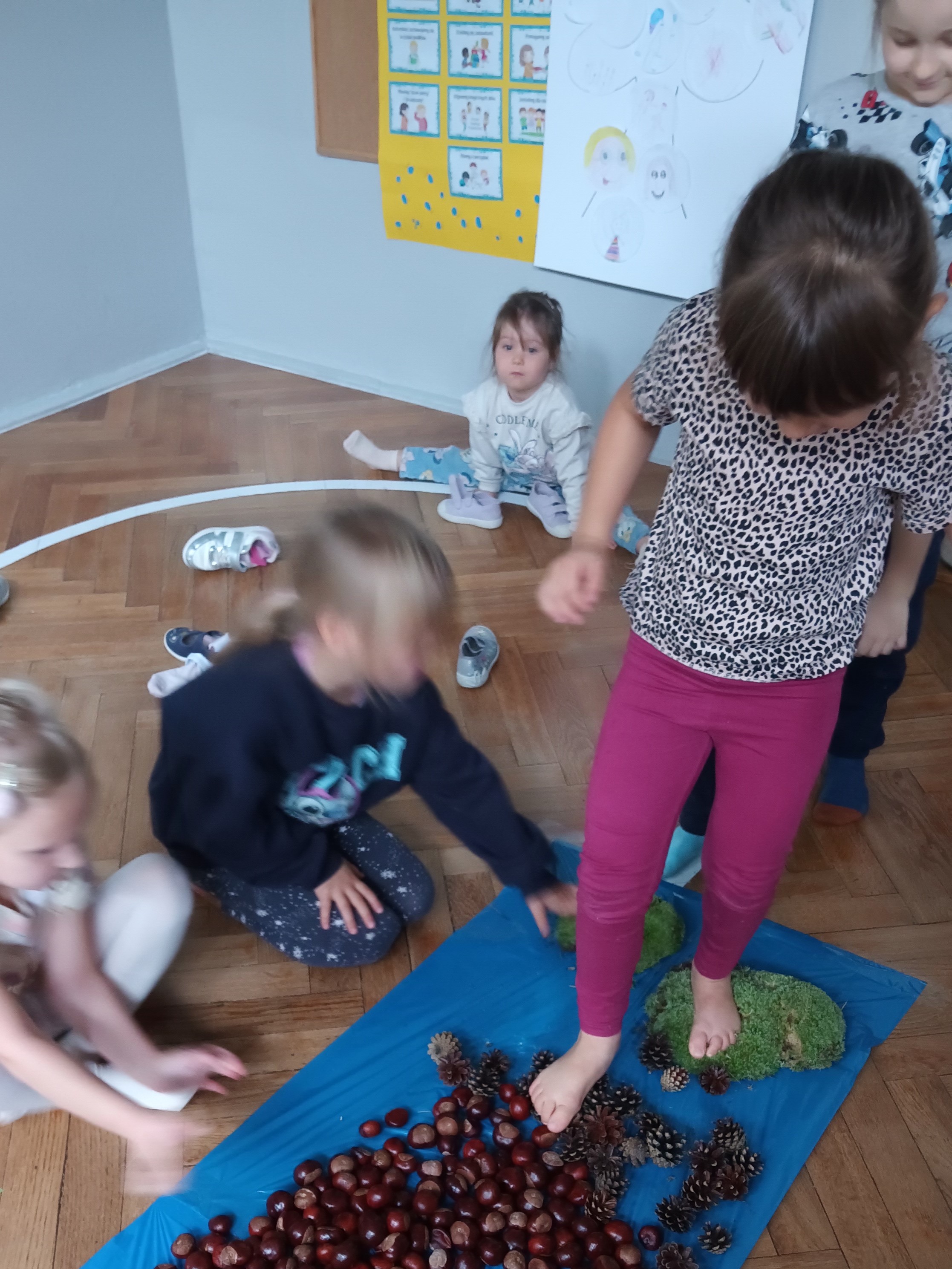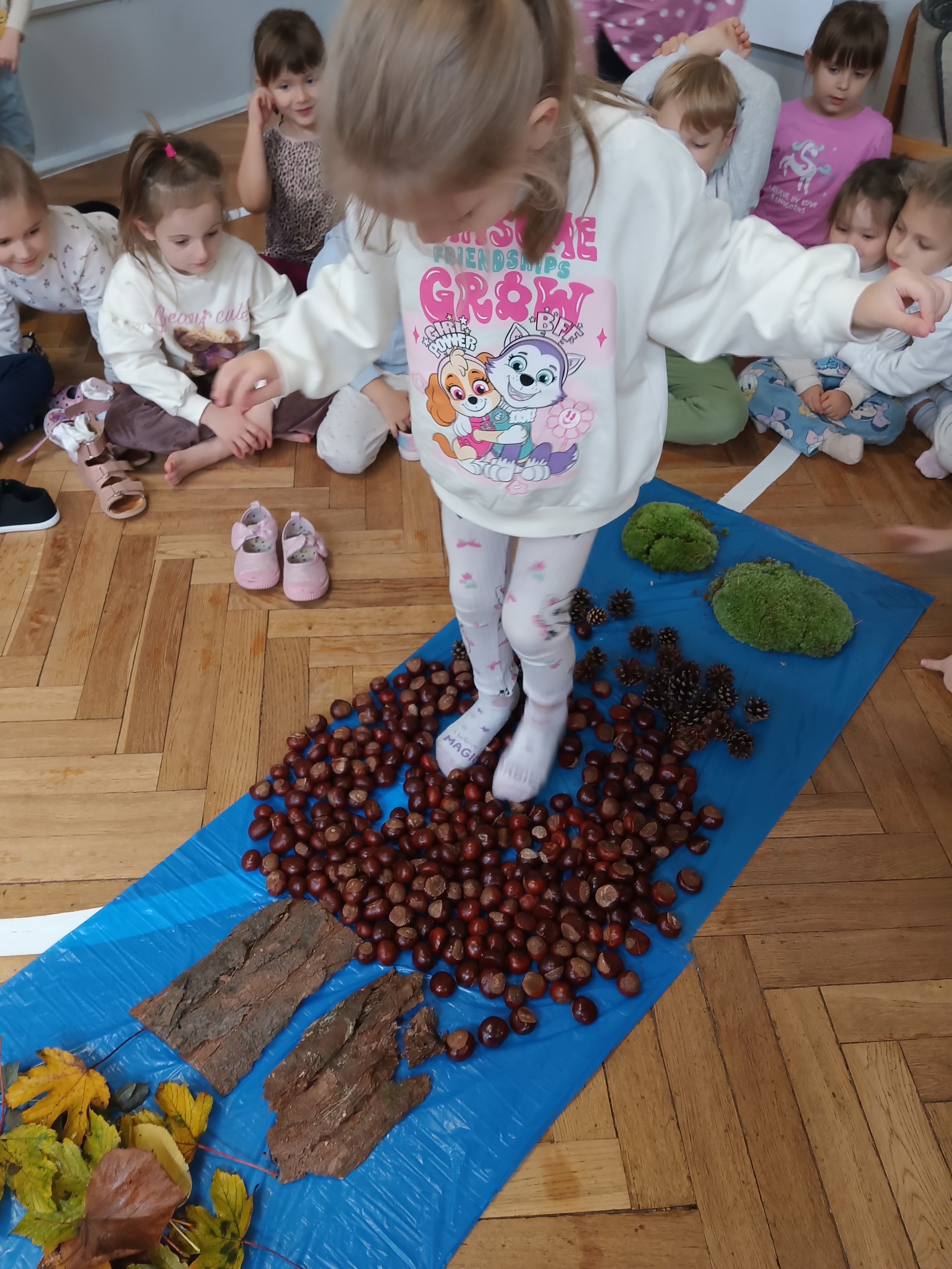 W środę mieliśmy okazję poznać las wieloma zmysłami. Oglądaliśmy, wąchaliśmy, dotykaliśmy darów lasu- mech, szyszki, kasztany, liście, korę drzew. Na zakończenie mogliśmy przejść leśną ścieżką gołą stopą (niektórzy w skarpetach).