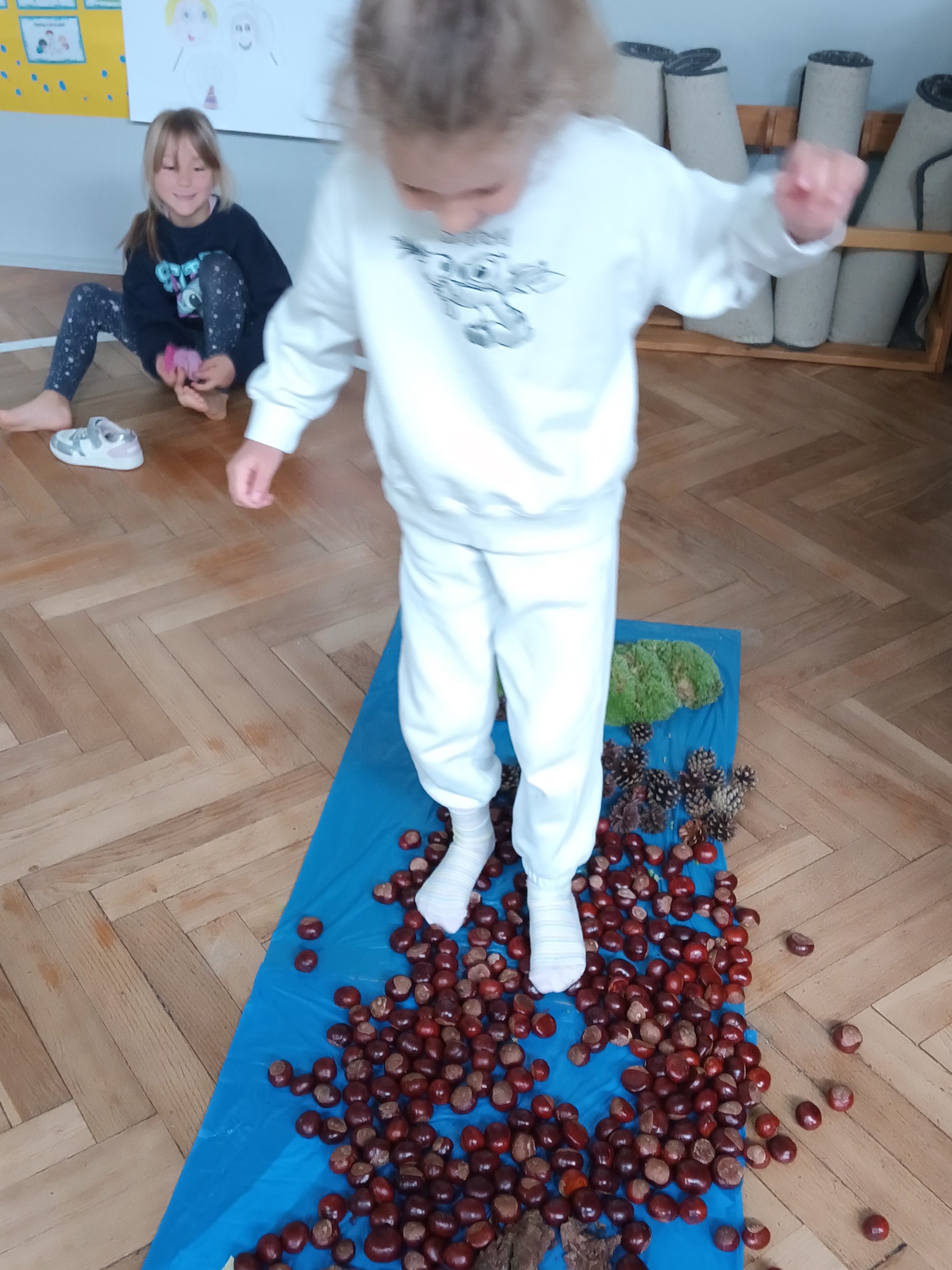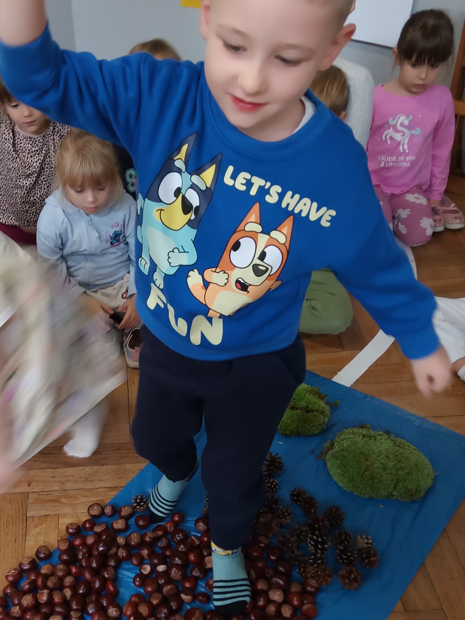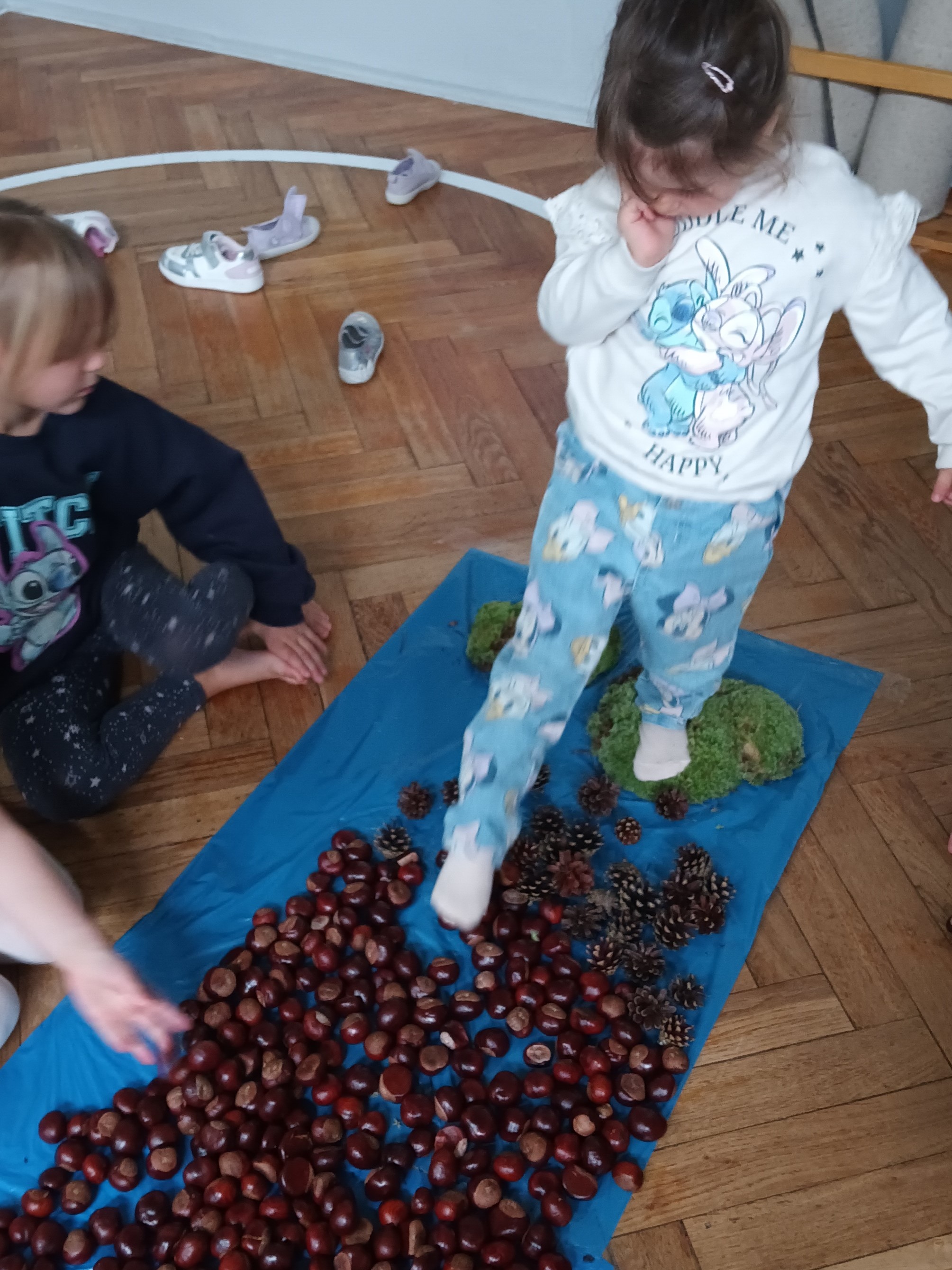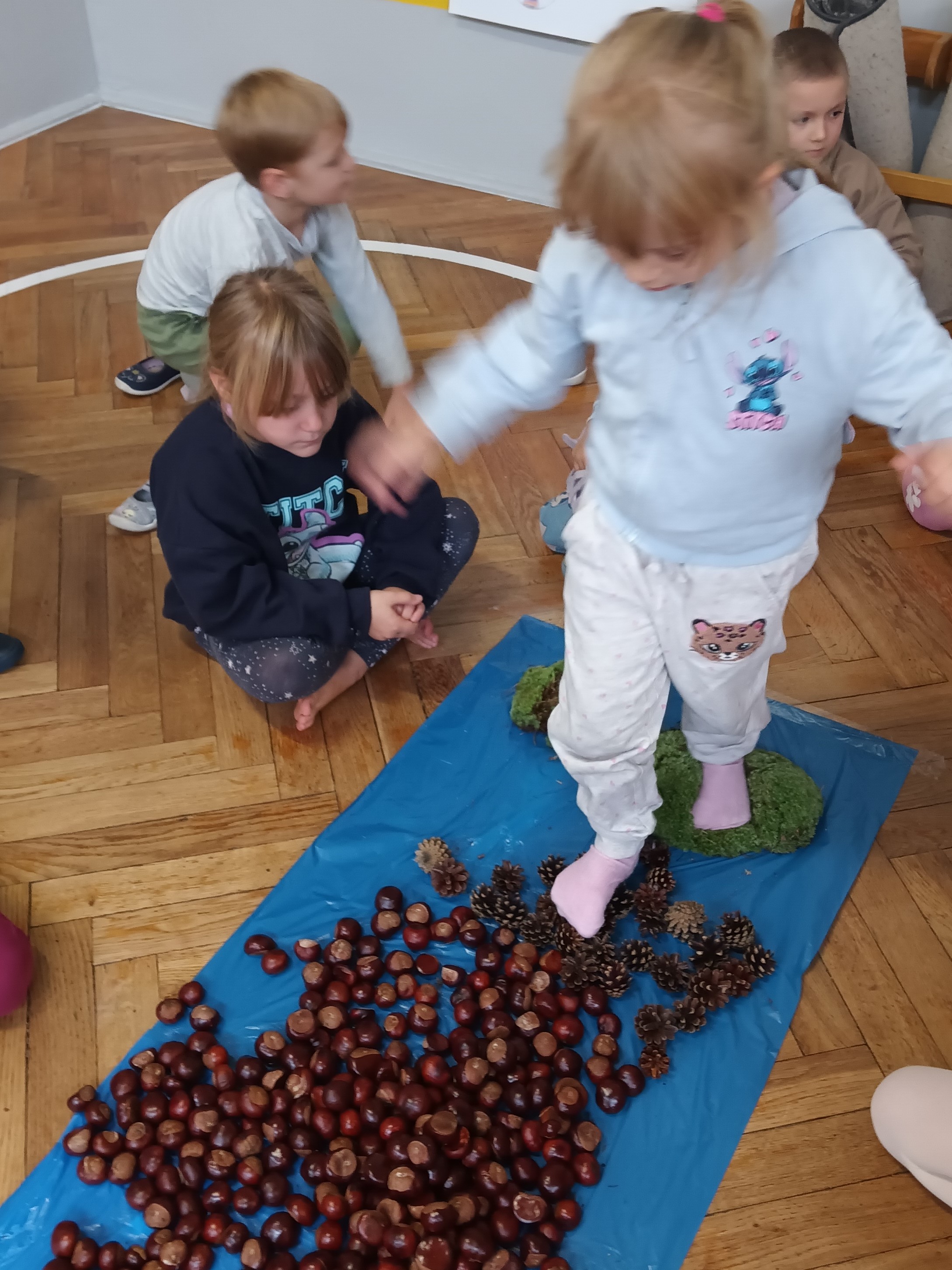 W środę mieliśmy okazję poznać las wieloma zmysłami. Oglądaliśmy, wąchaliśmy, dotykaliśmy darów lasu- mech, szyszki, kasztany, liście, korę drzew. Na zakończenie mogliśmy przejść leśną ścieżką gołą stopą (niektórzy w skarpetach).