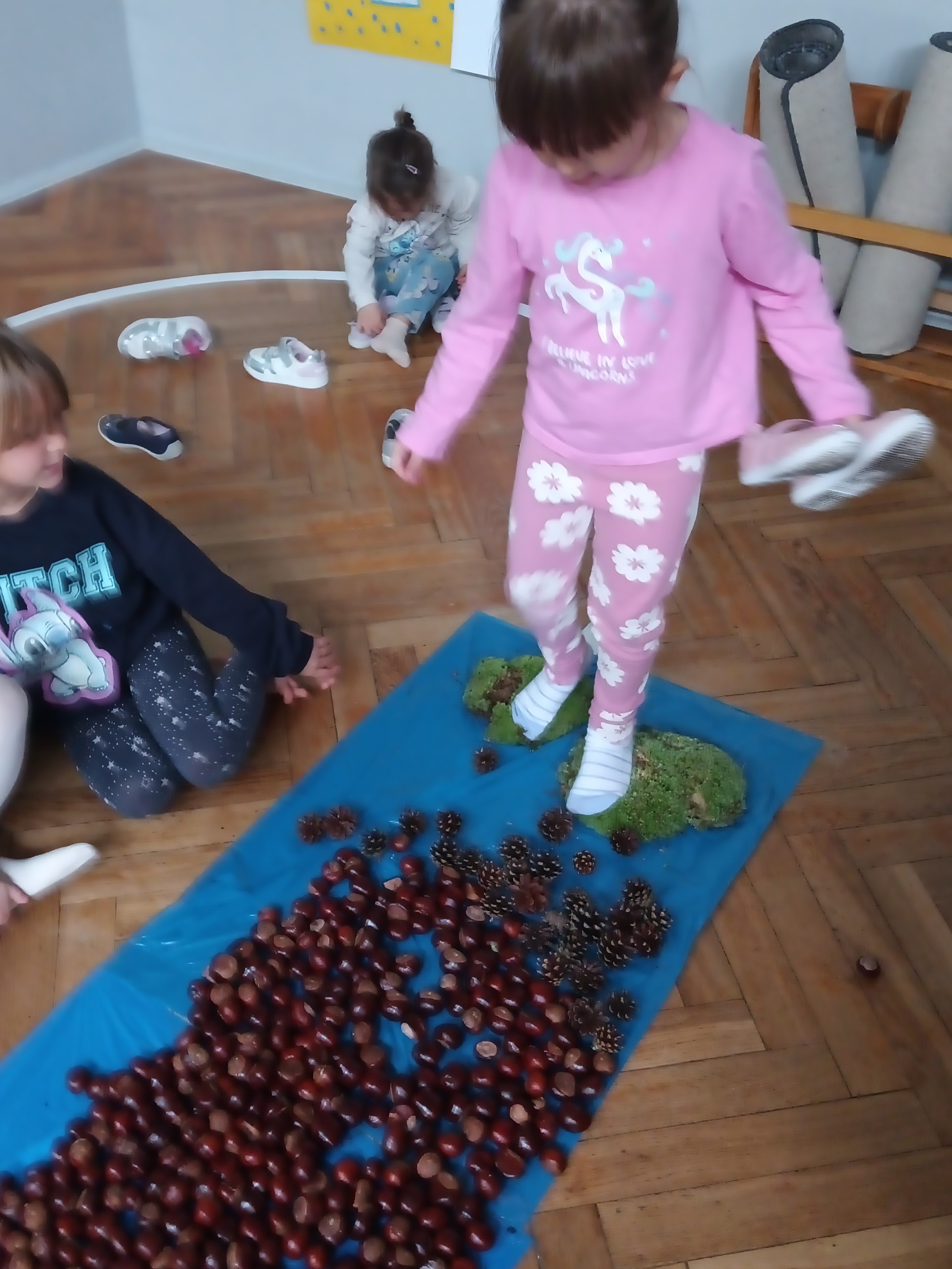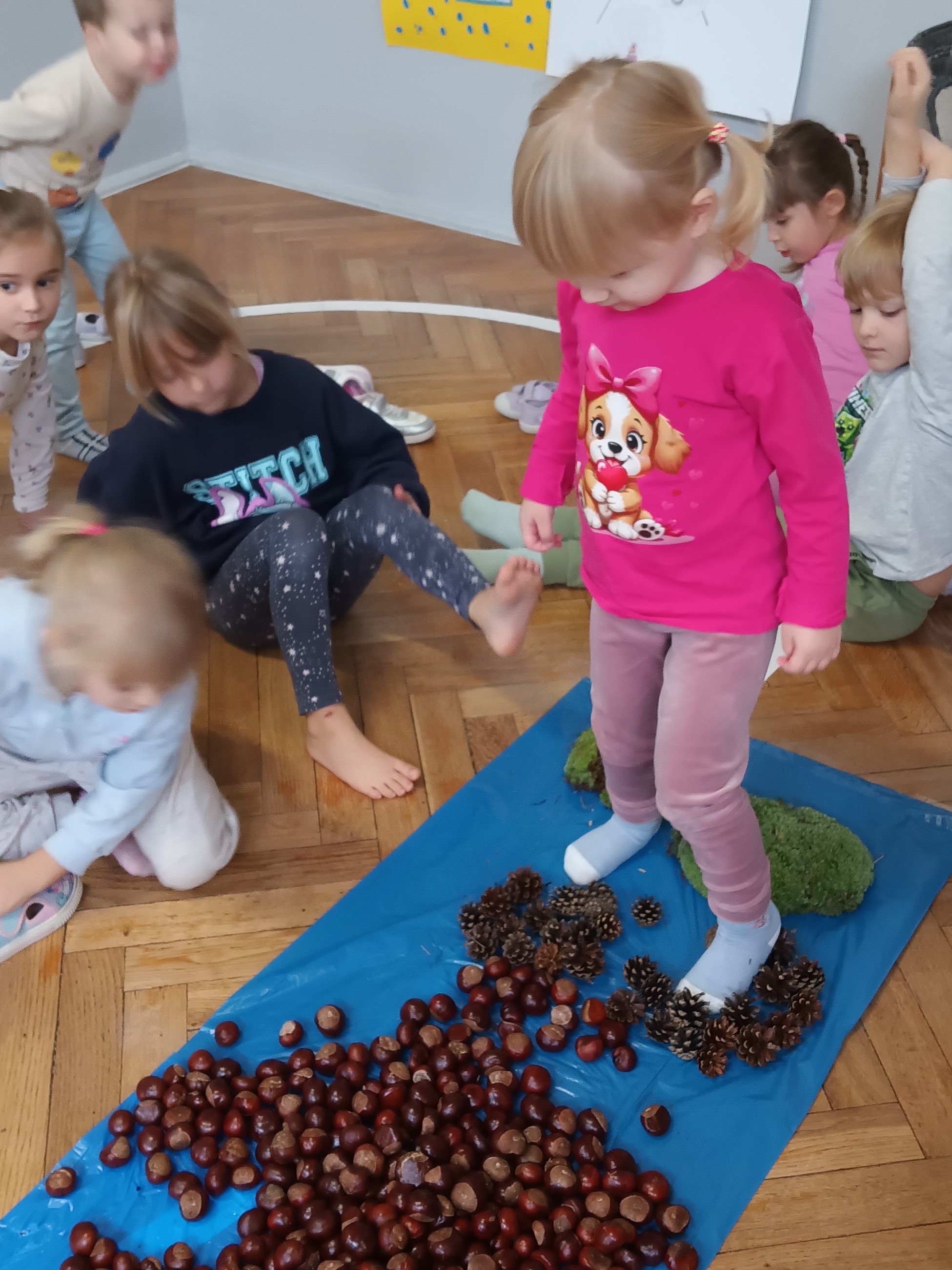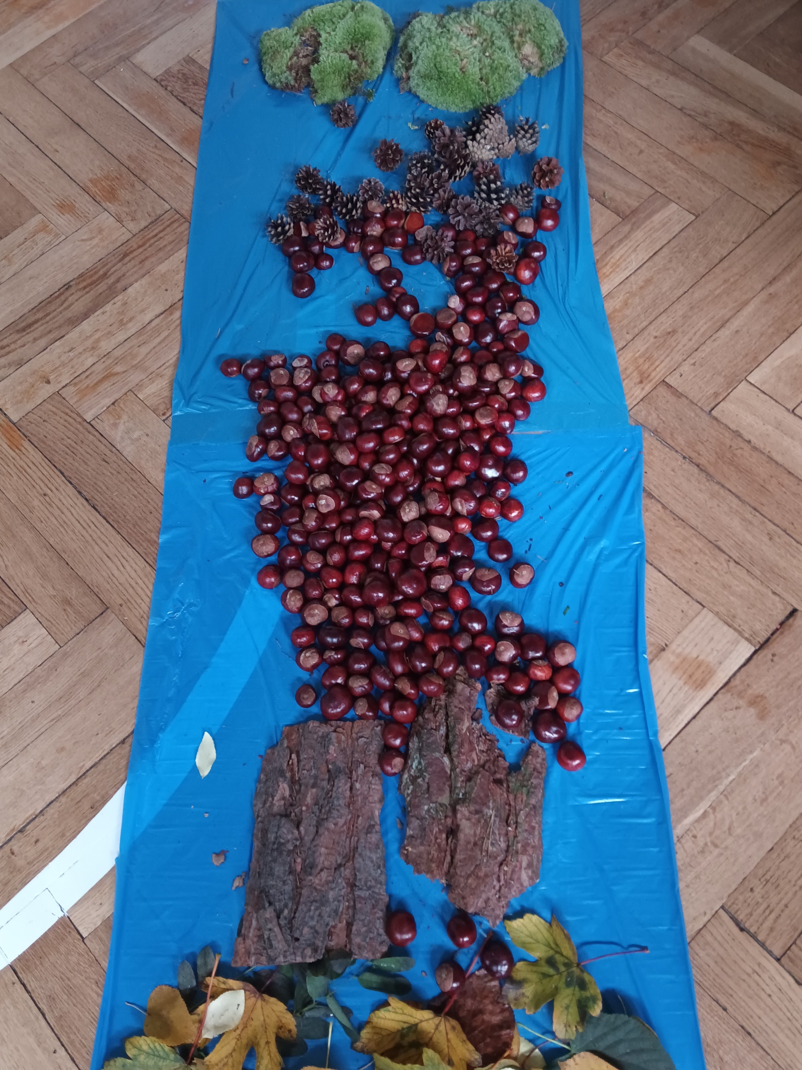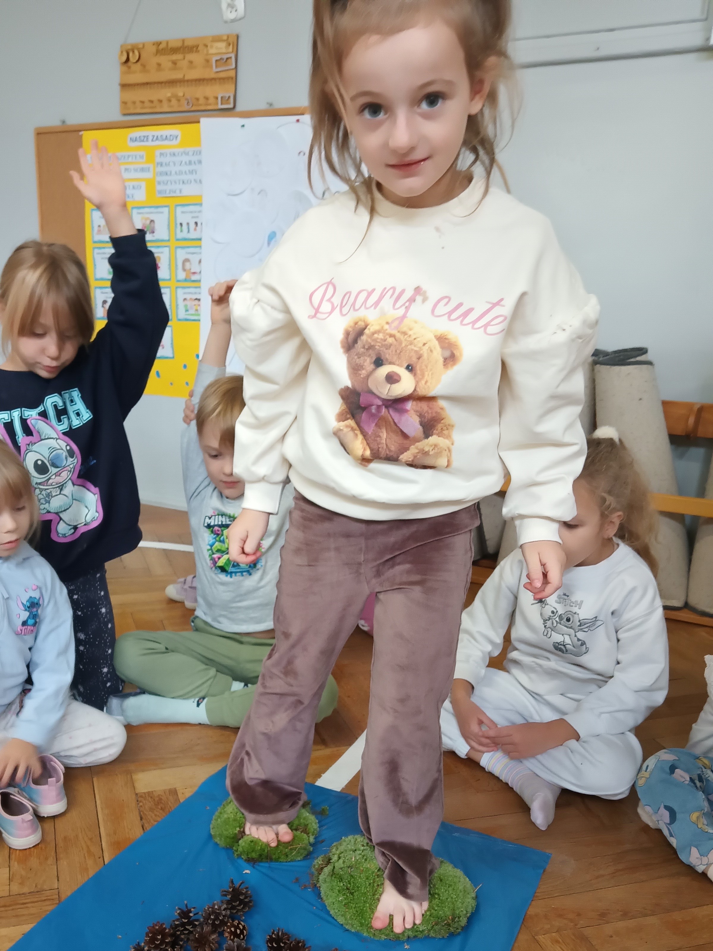 W środę mieliśmy okazję poznać las wieloma zmysłami. Oglądaliśmy, wąchaliśmy, dotykaliśmy darów lasu- mech, szyszki, kasztany, liście, korę drzew. Na zakończenie mogliśmy przejść leśną ścieżką gołą stopą (niektórzy w skarpetach).