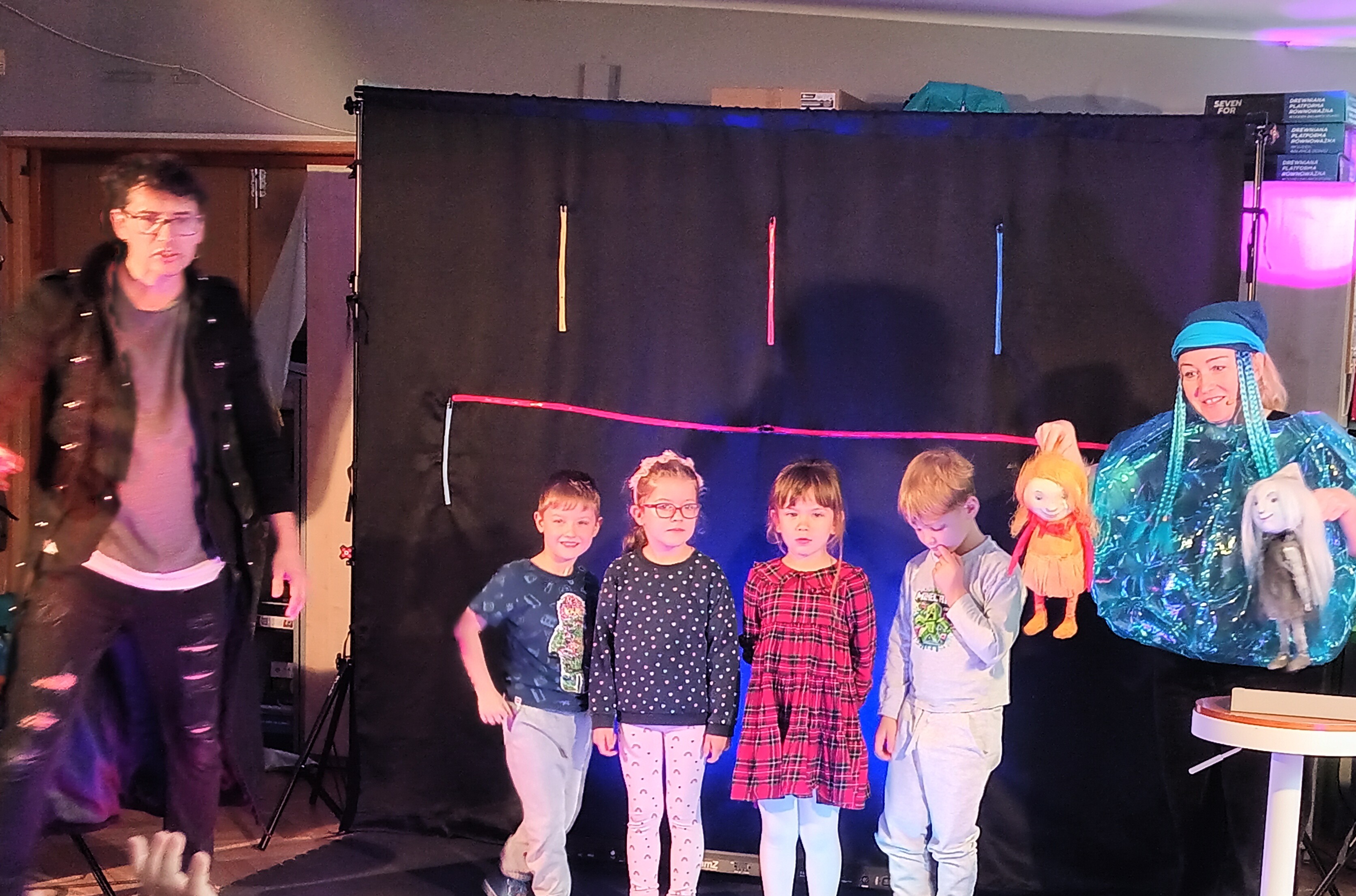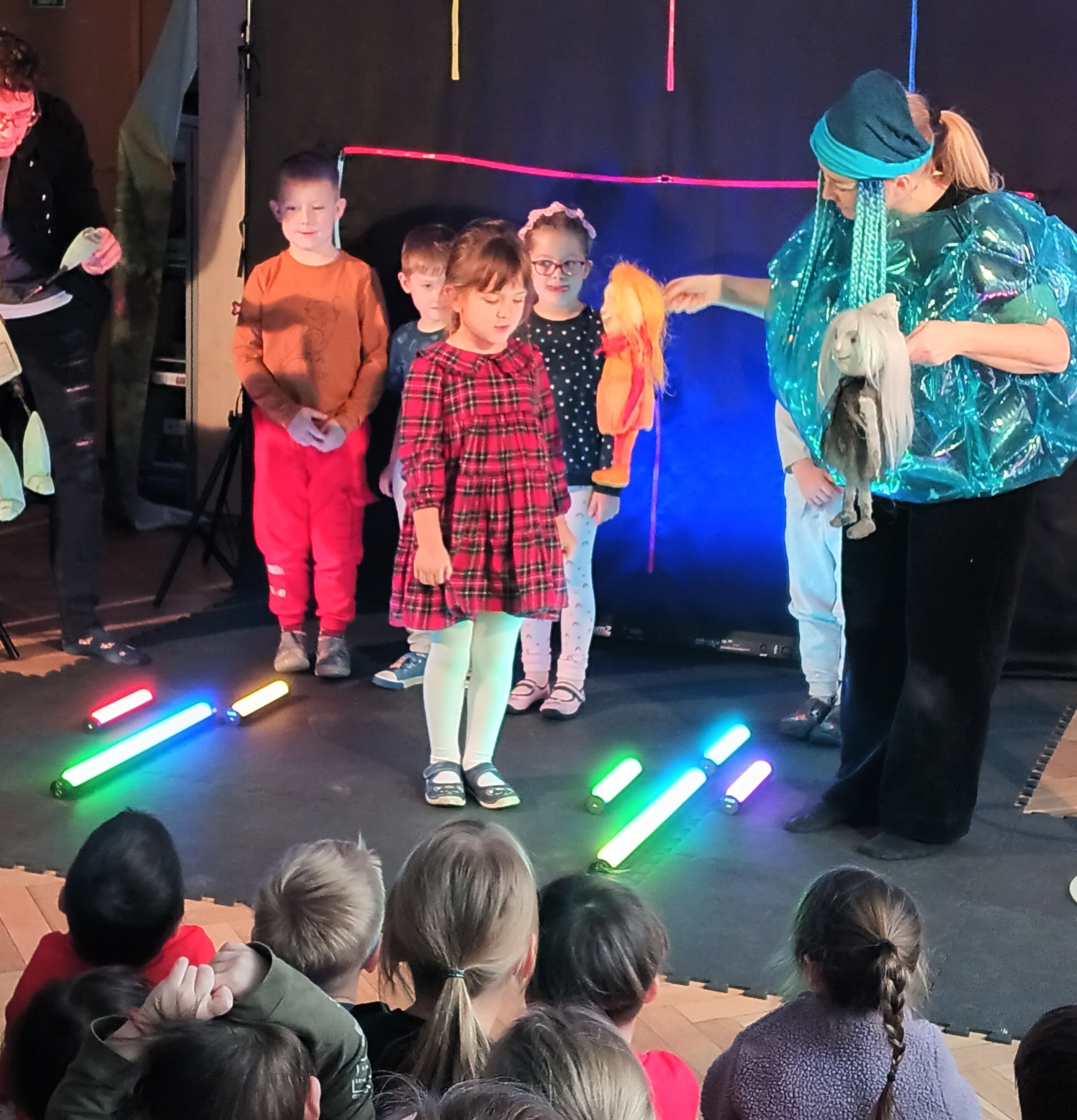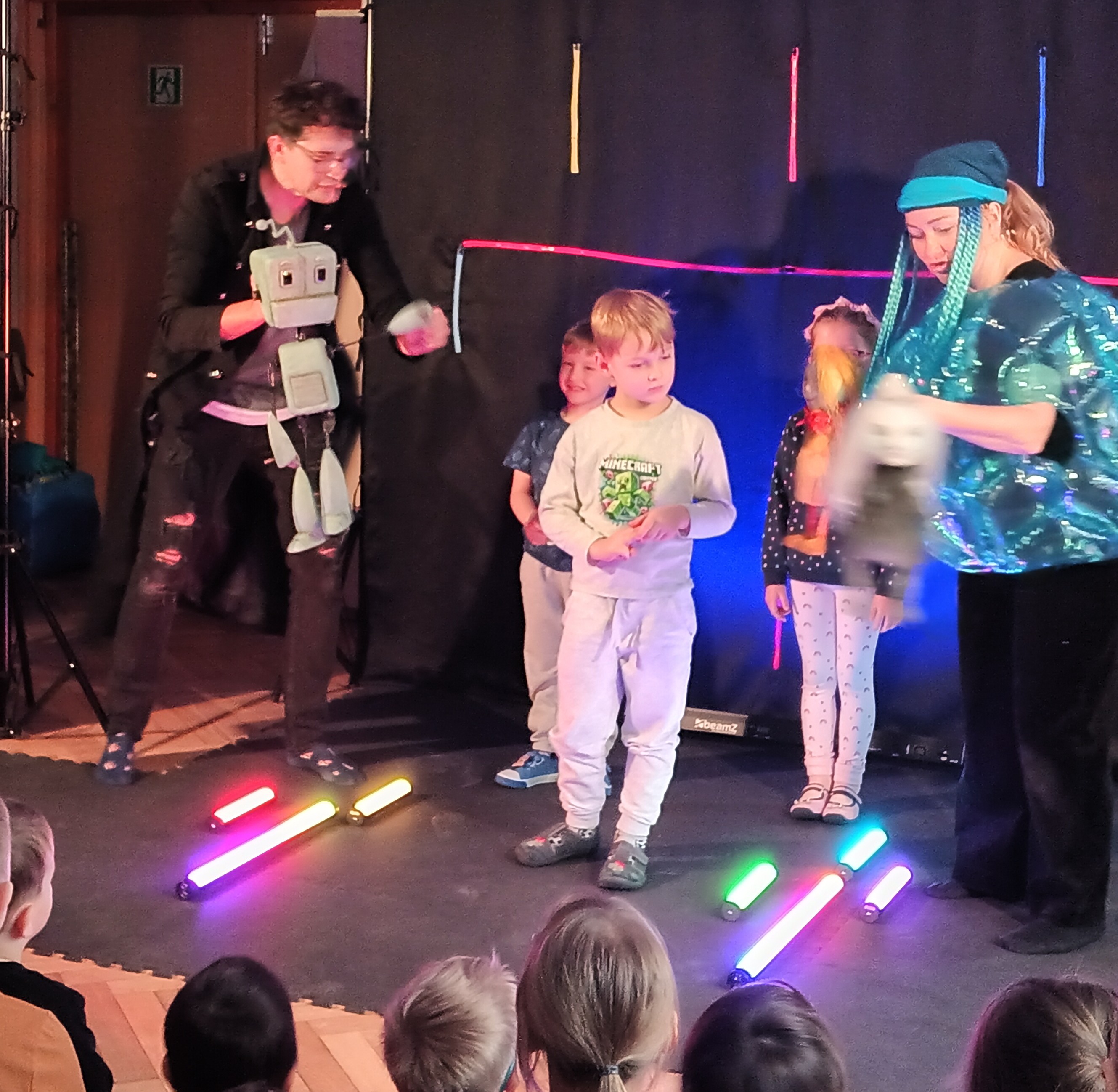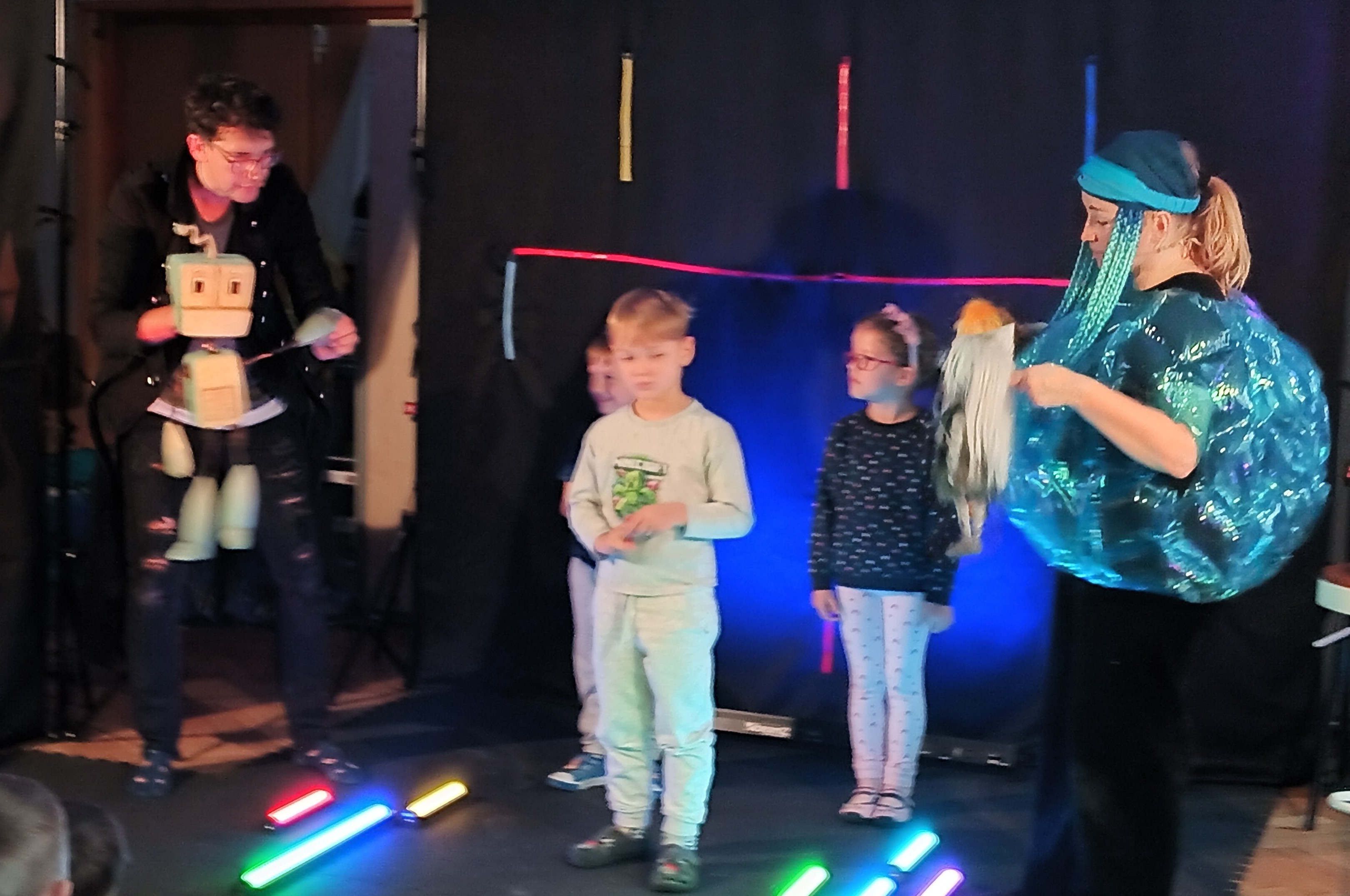 Również w poniedziałek oglądaliśmy przedstawienie teatralne pt. "Żelka, Pan Wykałaczka i Robot". Mali widzowie pomagali bohaterom oswoić złość i dawali pomysły jak sobie z nią radzić.
