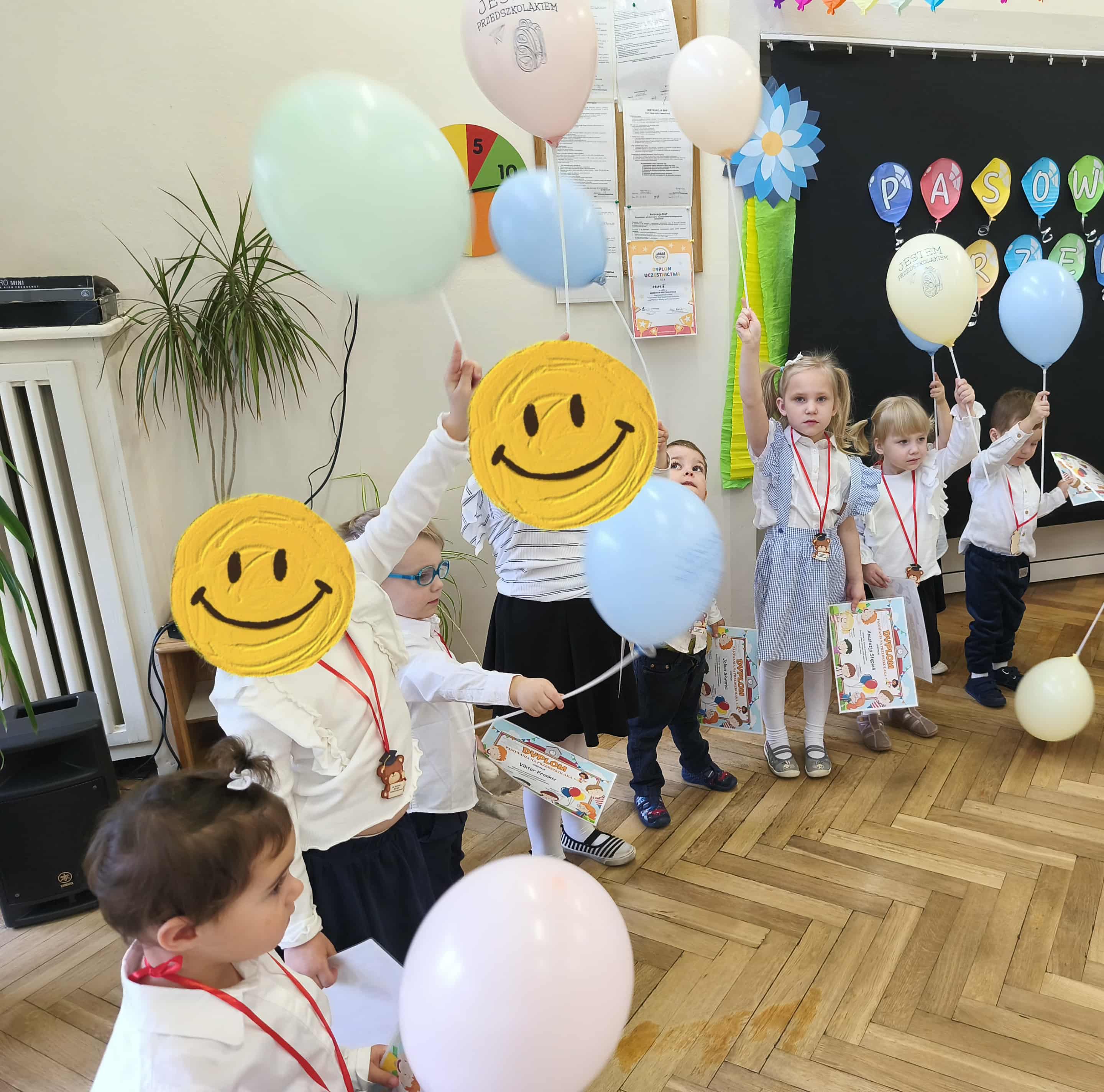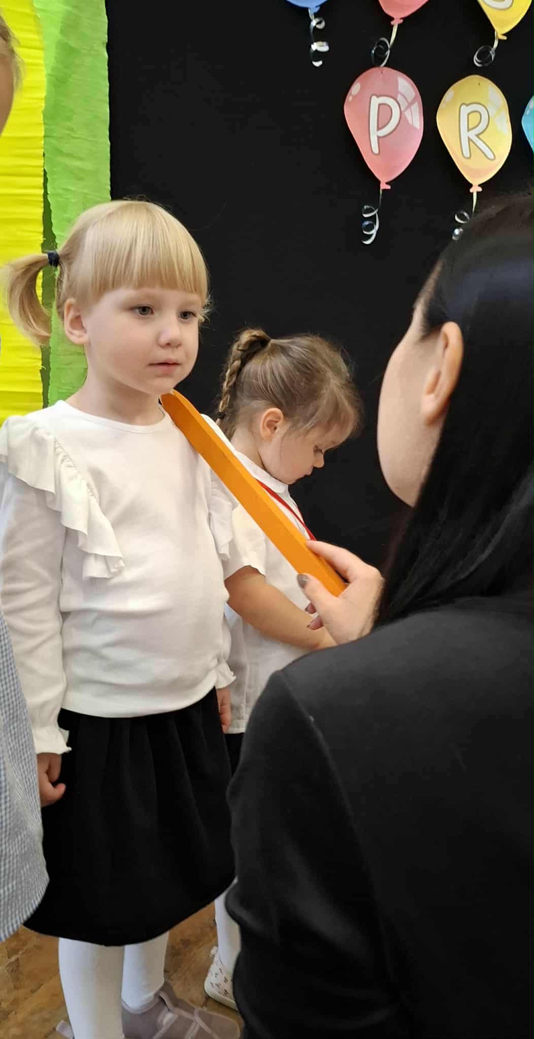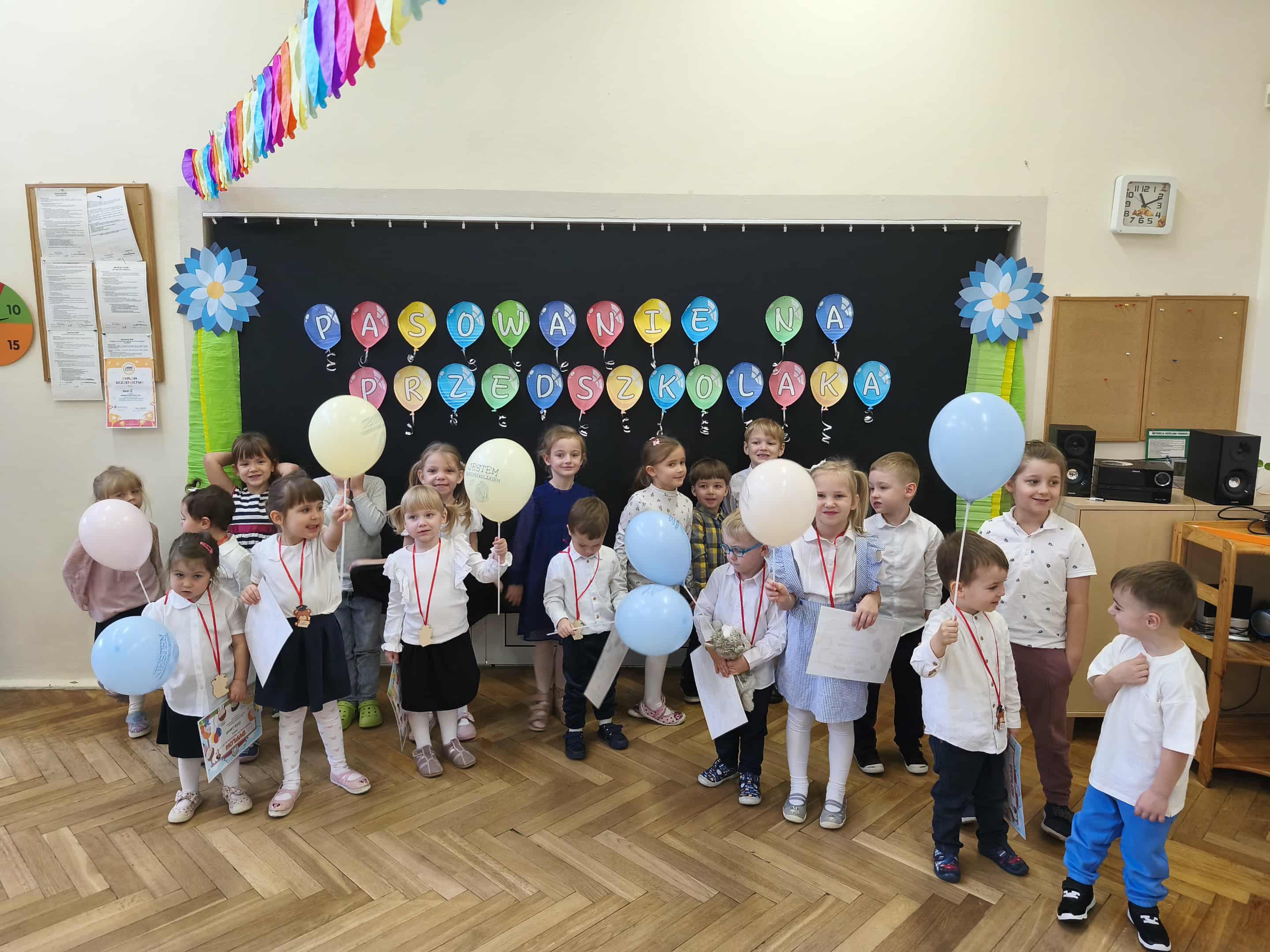 i koleżankami, słuchać pani i pomagać innym, będzie dzielnym przedszkolakiem. Następnie dzieci pasowane zaśpiewały piosenkę „Jestem przedszkolakiem”. Po części artystycznej nastąpił akt pasowania, czyli dotknięcia ramienia każdego przedszkolaka ogromną kredką przez panią Dyrektor. Na pamiątkę tego ważnego wydarzenia każdy przedszkolak otrzymał dyplom pasowania, medal z misiem oraz kolorowy balon.