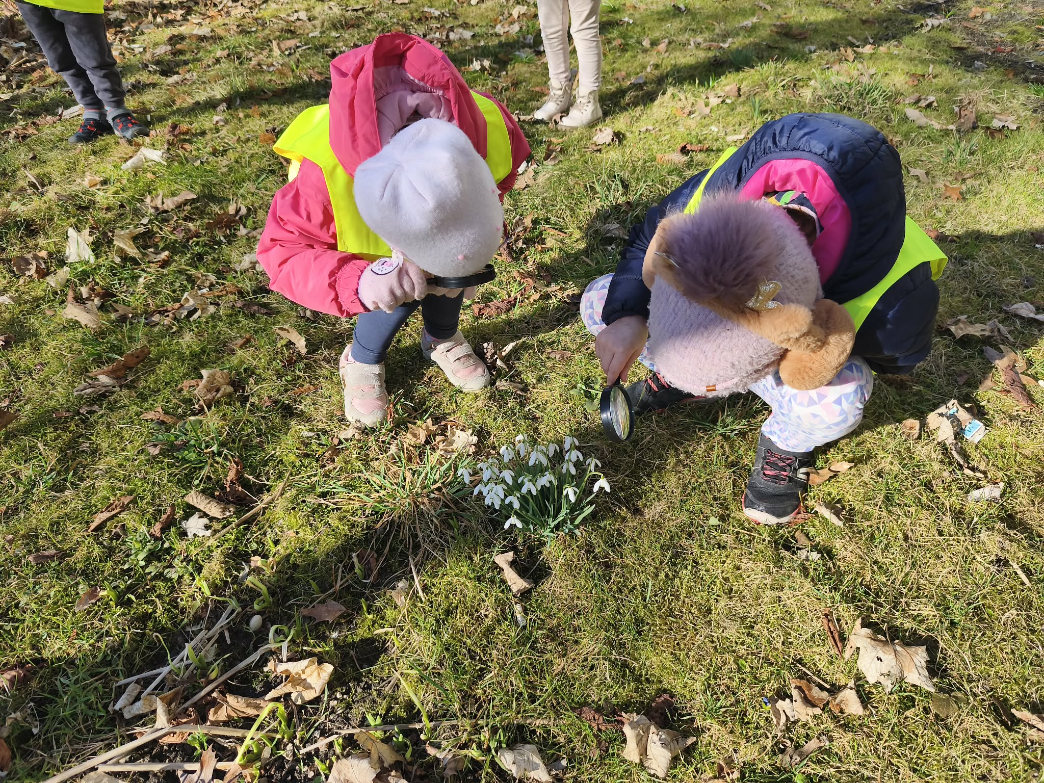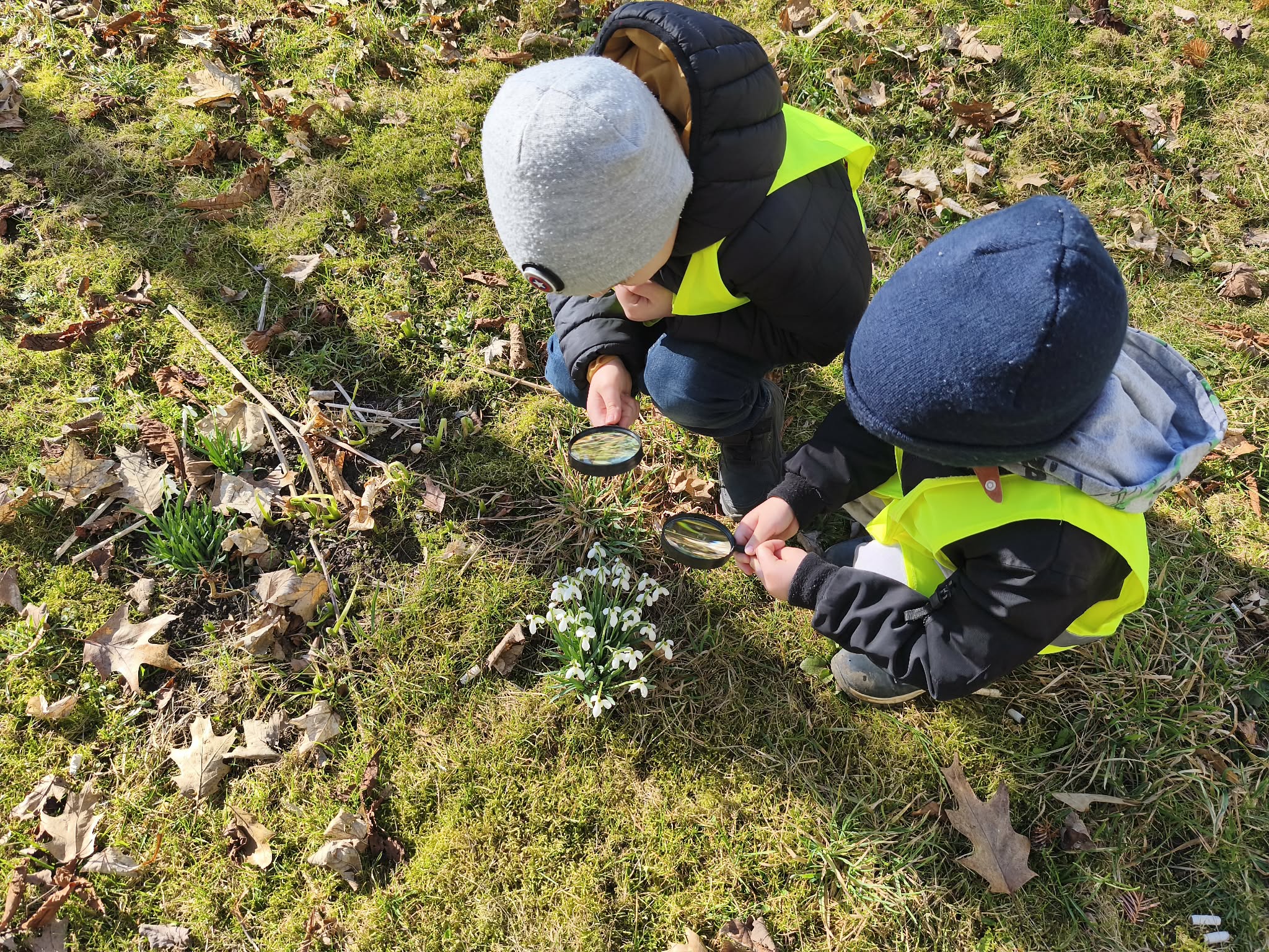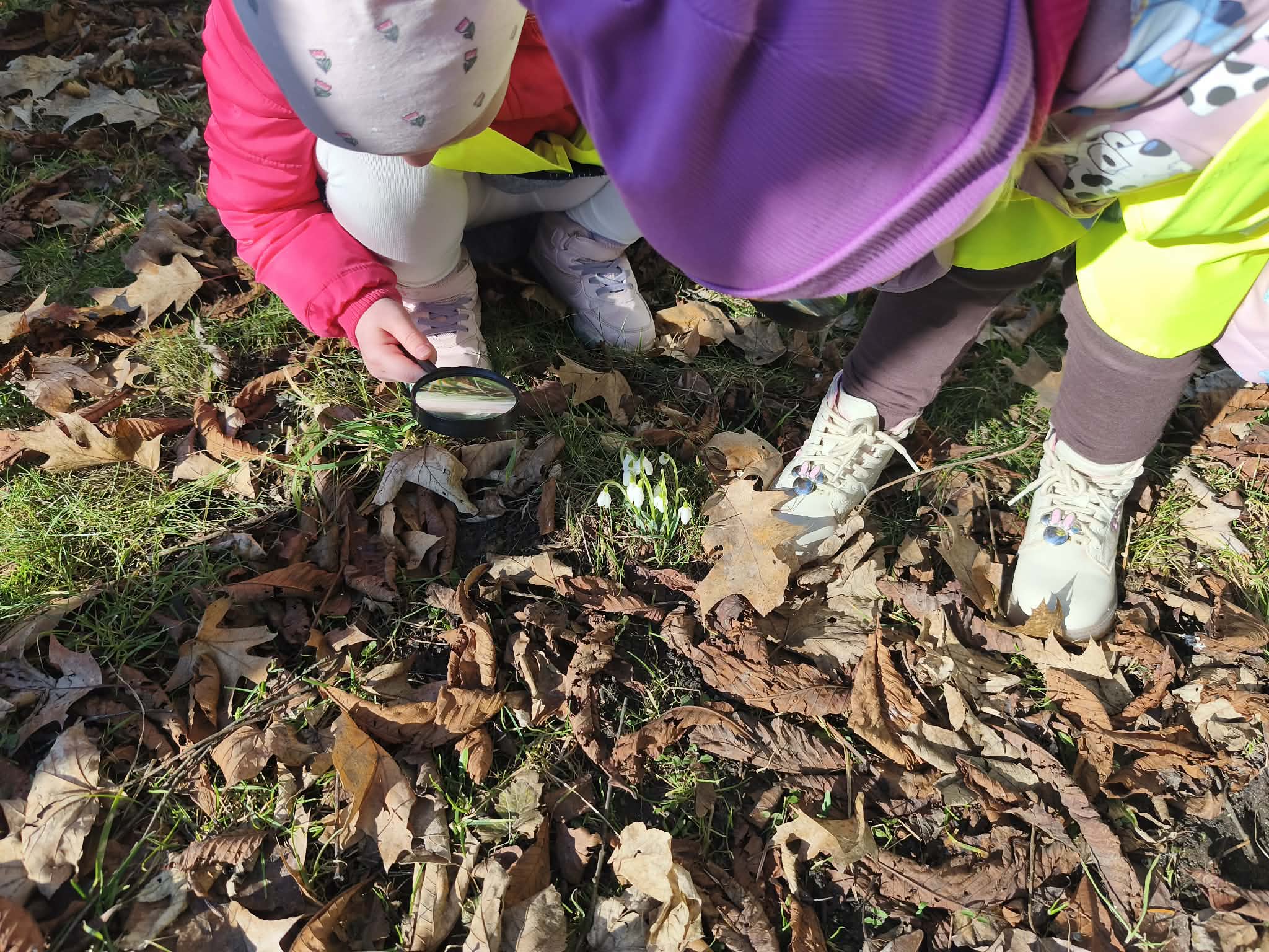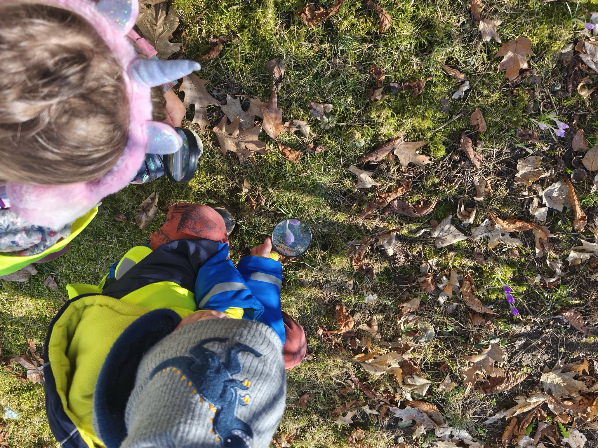 Szukając źródeł dymu, naszą uwagę przyciągnęły pierwsze, radosne oznaki wiosny. Pod lupą oglądaliśmy delikatne przebiśniegi i kolorowe krokusy, a na drzewach wypatrzyliśmy już puszyste pąki magnolii.