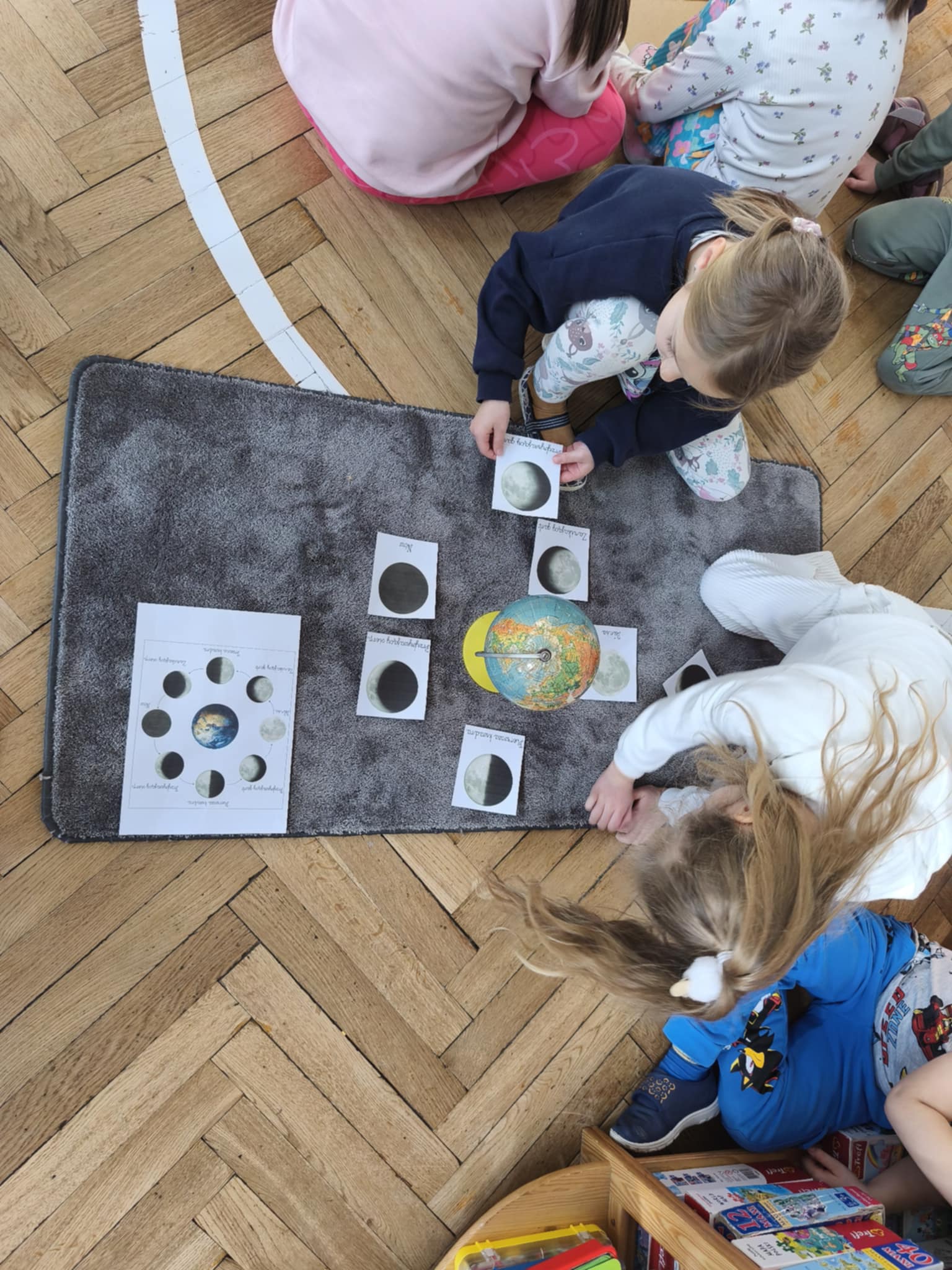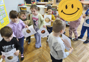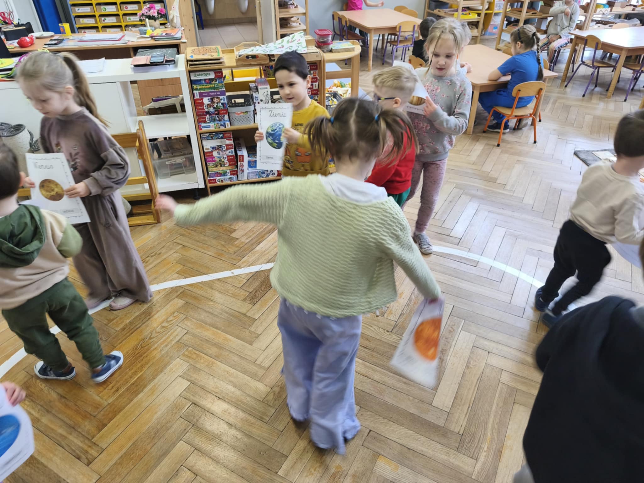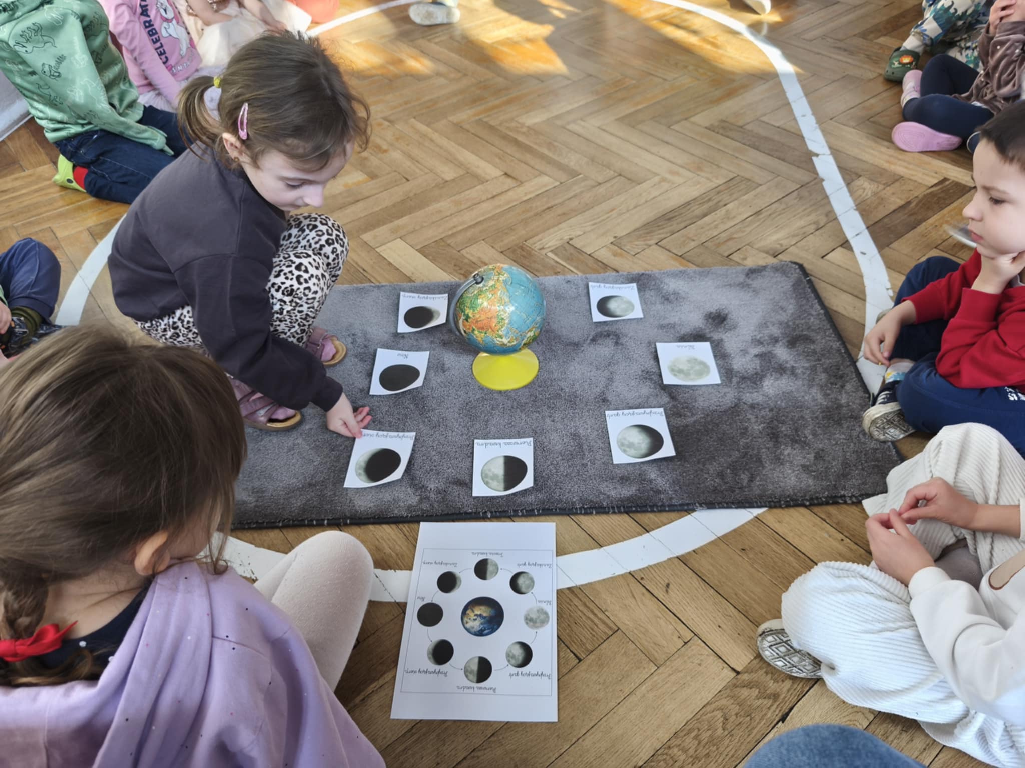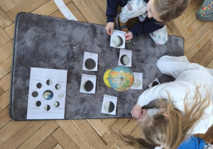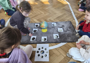 Podczas zajęć obejrzeliśmy film o Księżycu, aby sprawdzić, dlaczego co noc wygląda inaczej. Dowiedzieliśmy się, że księżyc jednocześnie obraca się wokół własnej osi i wokół Słońca także. Zdobyte informacje przelaliśmy na talerzyki papierowe, wykonując pracę plastyczną pt. „Dzień i noc”, pokazując, jak zmienia się niebo nad nami. Całość dopełniły wesołe zabawy i wspólne śpiewanie piosenki o Układzie Słonecznym, która pomogła nam zapamiętać kosmicznych sąsiadów.