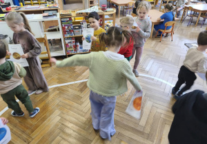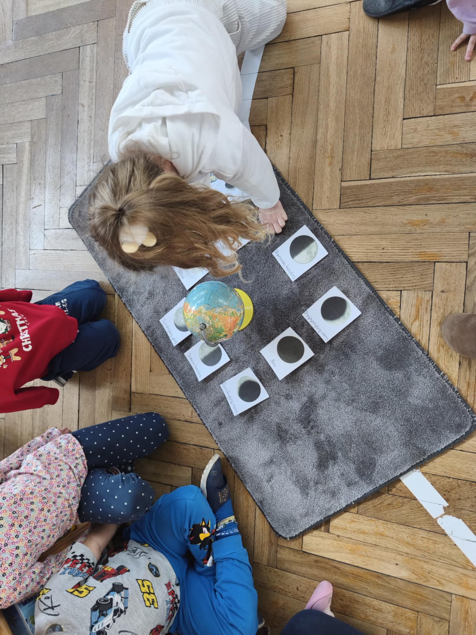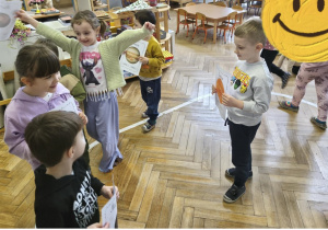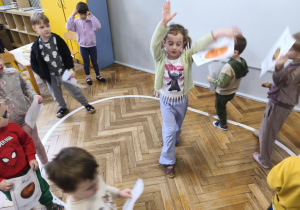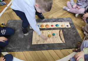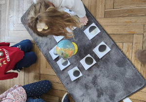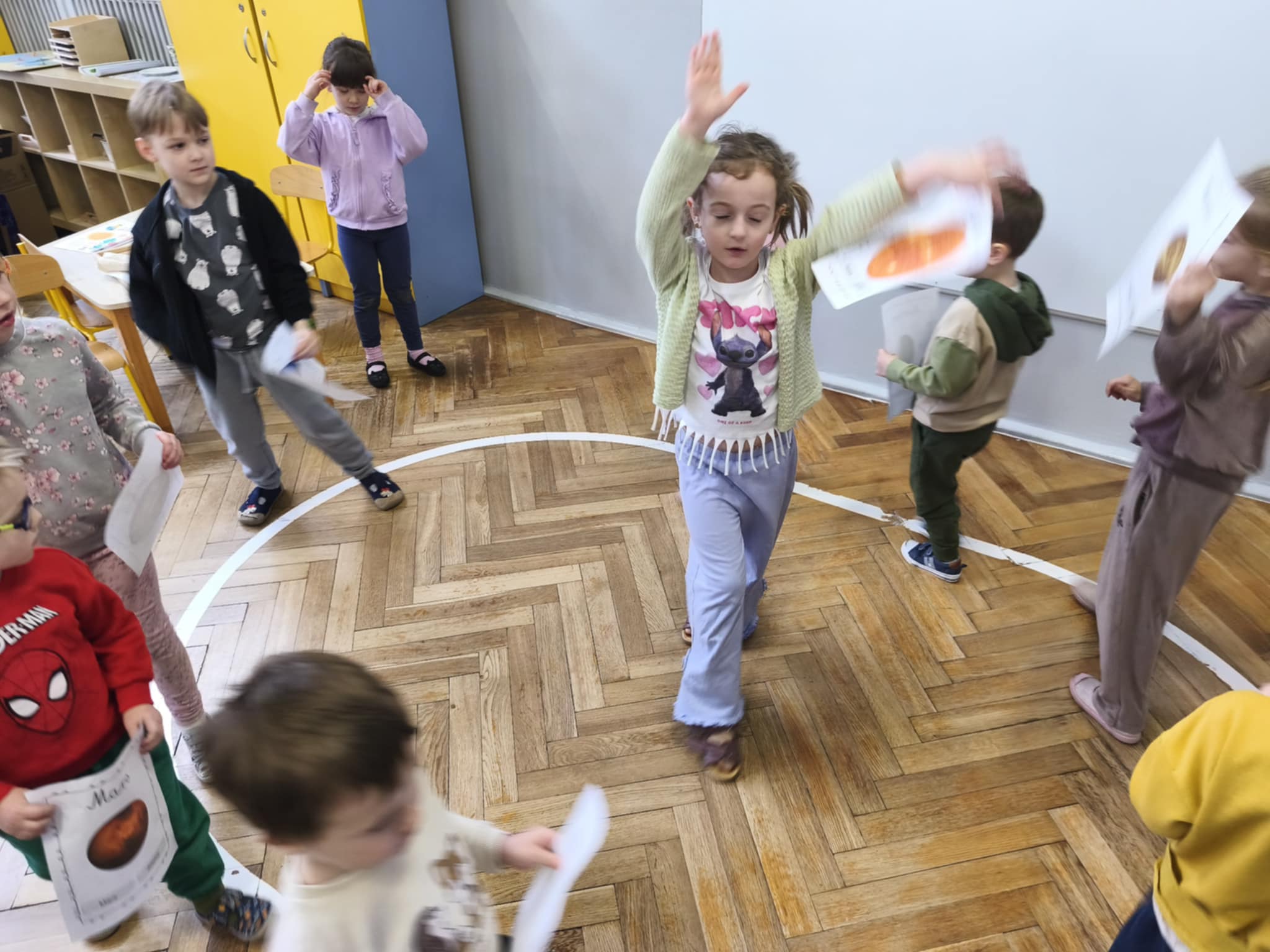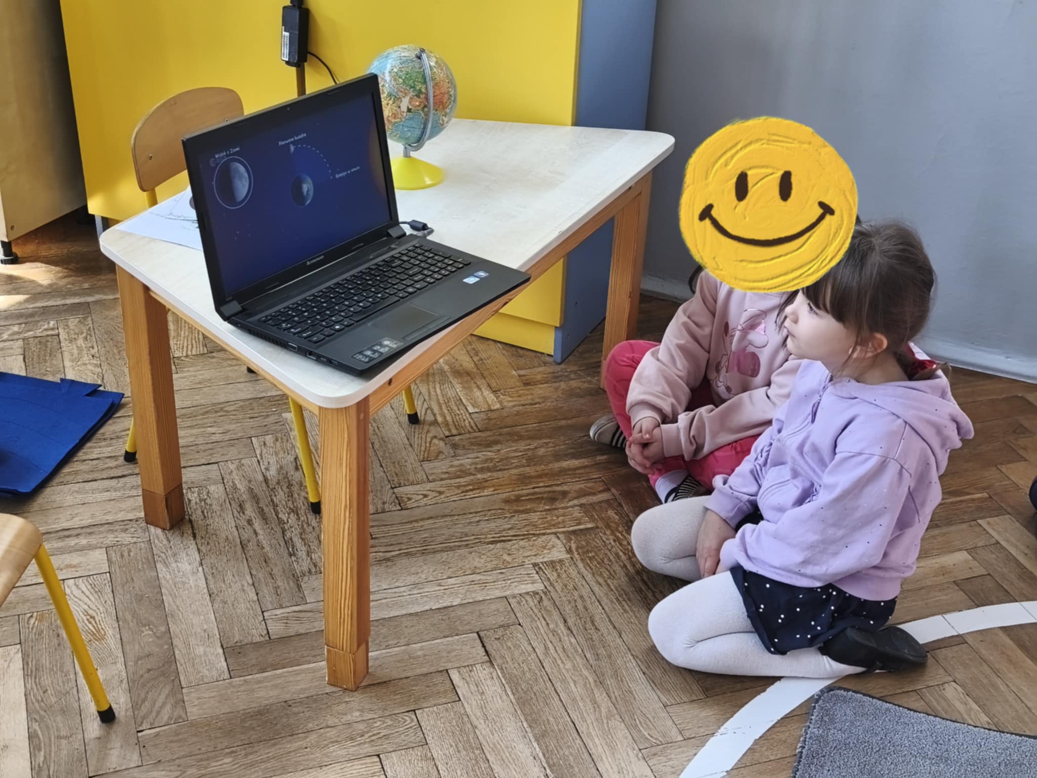 Podczas zajęć obejrzeliśmy film o Księżycu, aby sprawdzić, dlaczego co noc wygląda inaczej. Dowiedzieliśmy się, że księżyc jednocześnie obraca się wokół własnej osi i wokół Słońca także. Zdobyte informacje przelaliśmy na talerzyki papierowe, wykonując pracę plastyczną pt. „Dzień i noc”, pokazując, jak zmienia się niebo nad nami. Całość dopełniły wesołe zabawy i wspólne śpiewanie piosenki o Układzie Słonecznym, która pomogła nam zapamiętać kosmicznych sąsiadów.