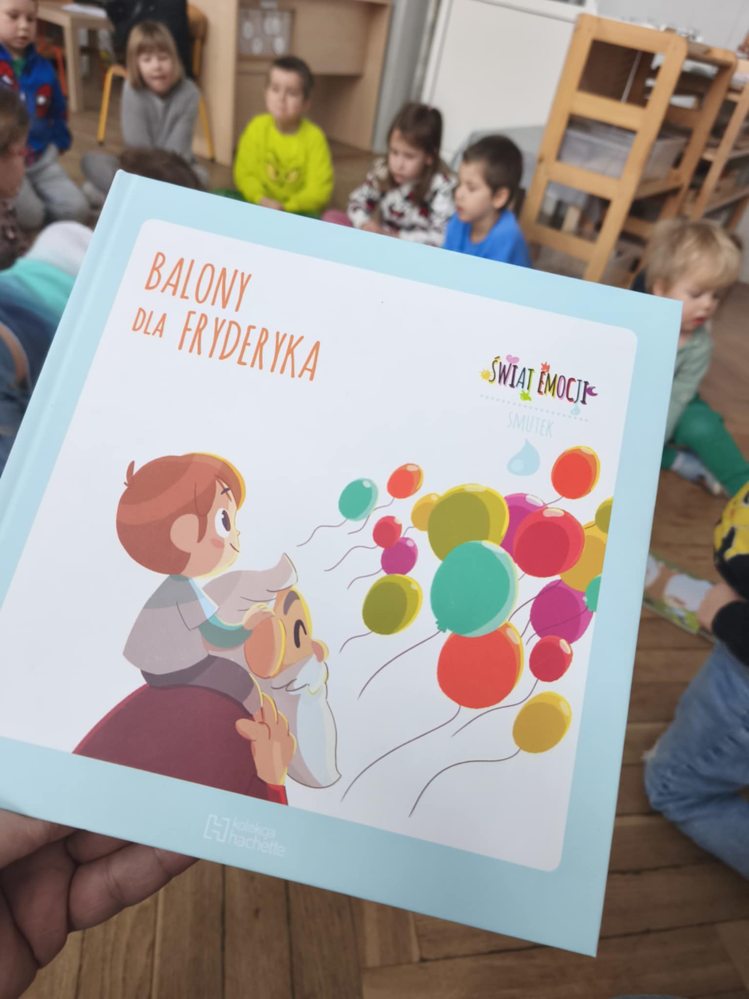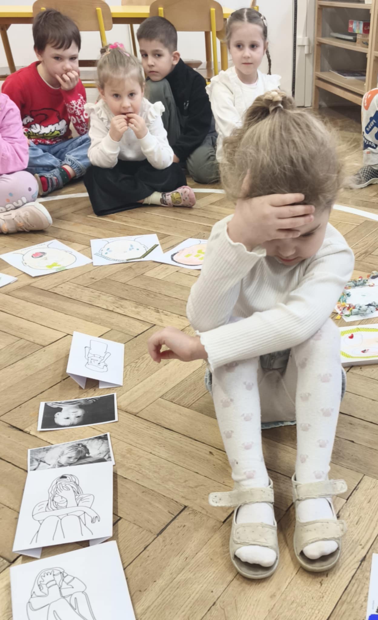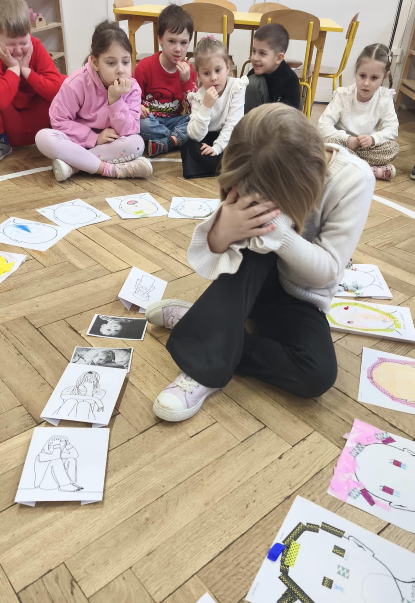 Podczas zajęć dzieci uczyły się akceptacji uczucia smutku, radzenia sobie z nim. W oparciu o bajki terapeutyczne, rozmawialiśmy o tym skąd bierze się smutek, kiedy go dzieci odczuwają i co wtedy dzieje się z naszym ciałem. Udało się nam również porozmawiać o sposobach na poprawę nastroju, dzieci dawały propozycje z własnego doświadczenia a ponieważ jesteśmy rożni to każdy miał inne sposoby na radzenie sobie ze smutkiem. Przeobraziliśmy nawet łzę w cos śmiesznego co też może być jednym z takich sposobów.