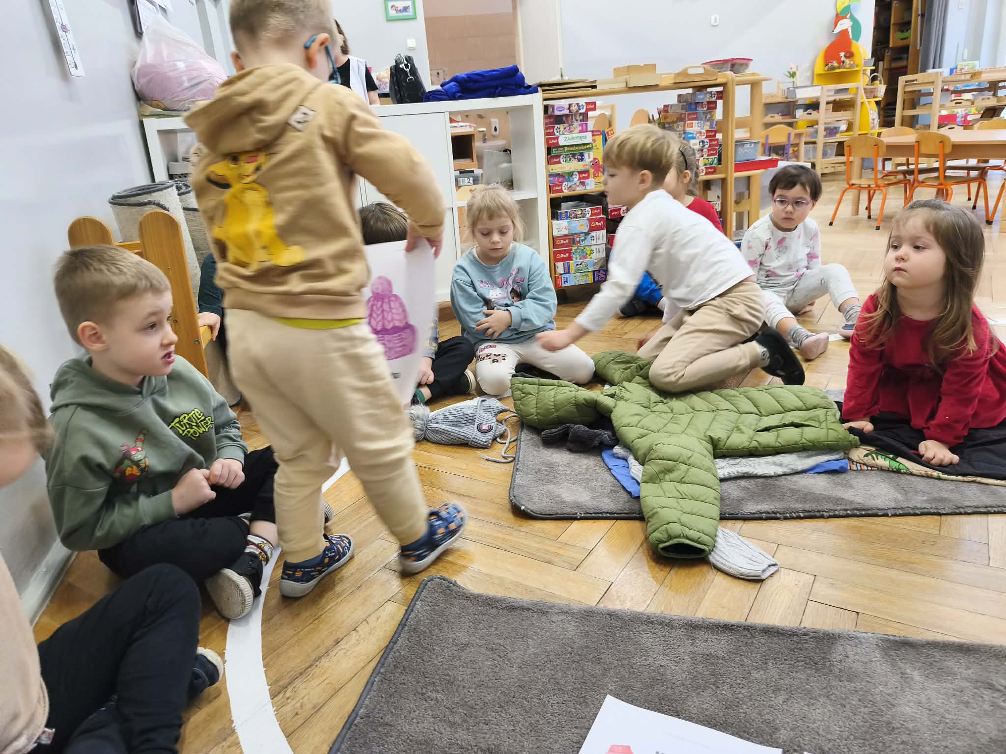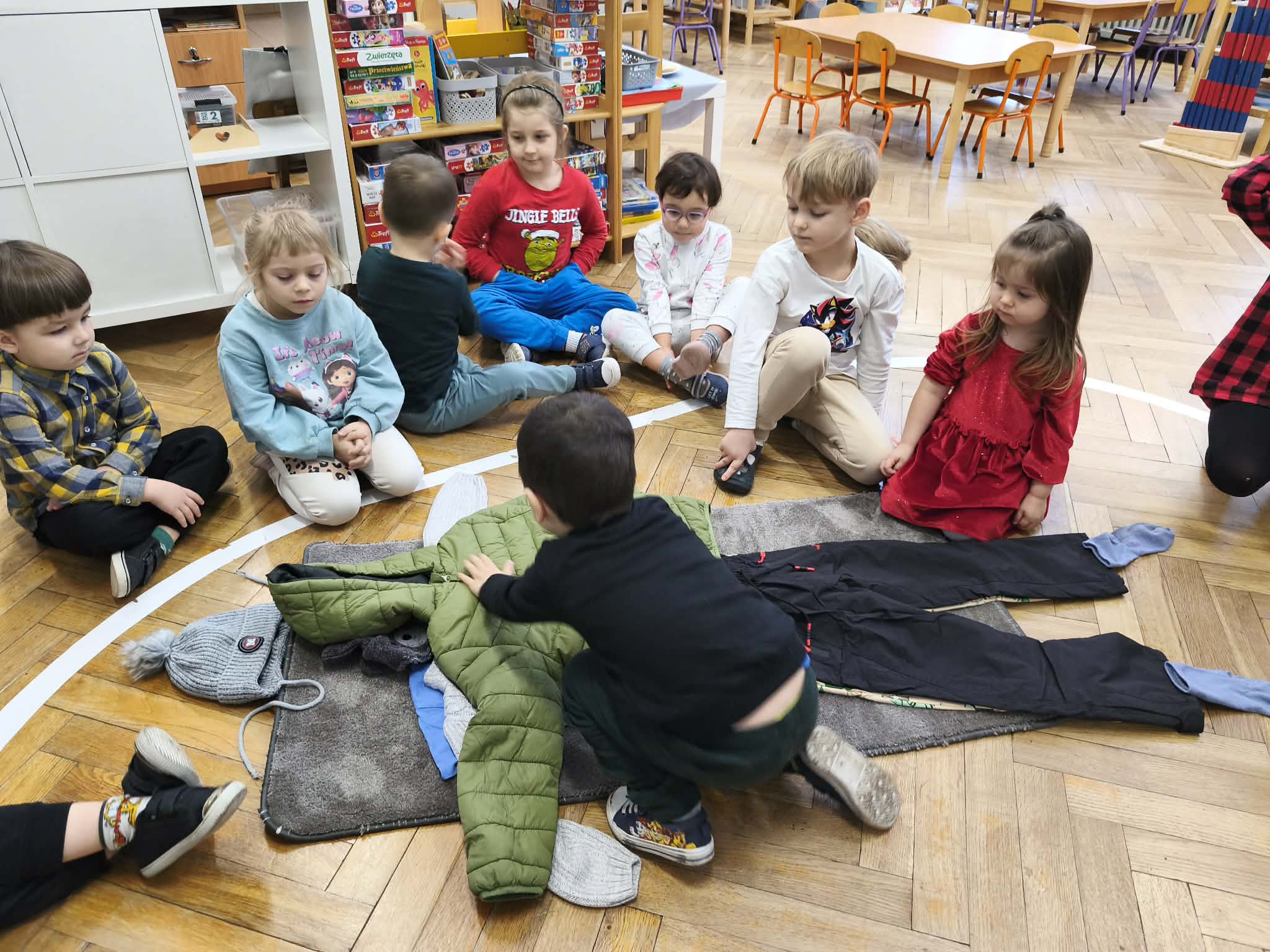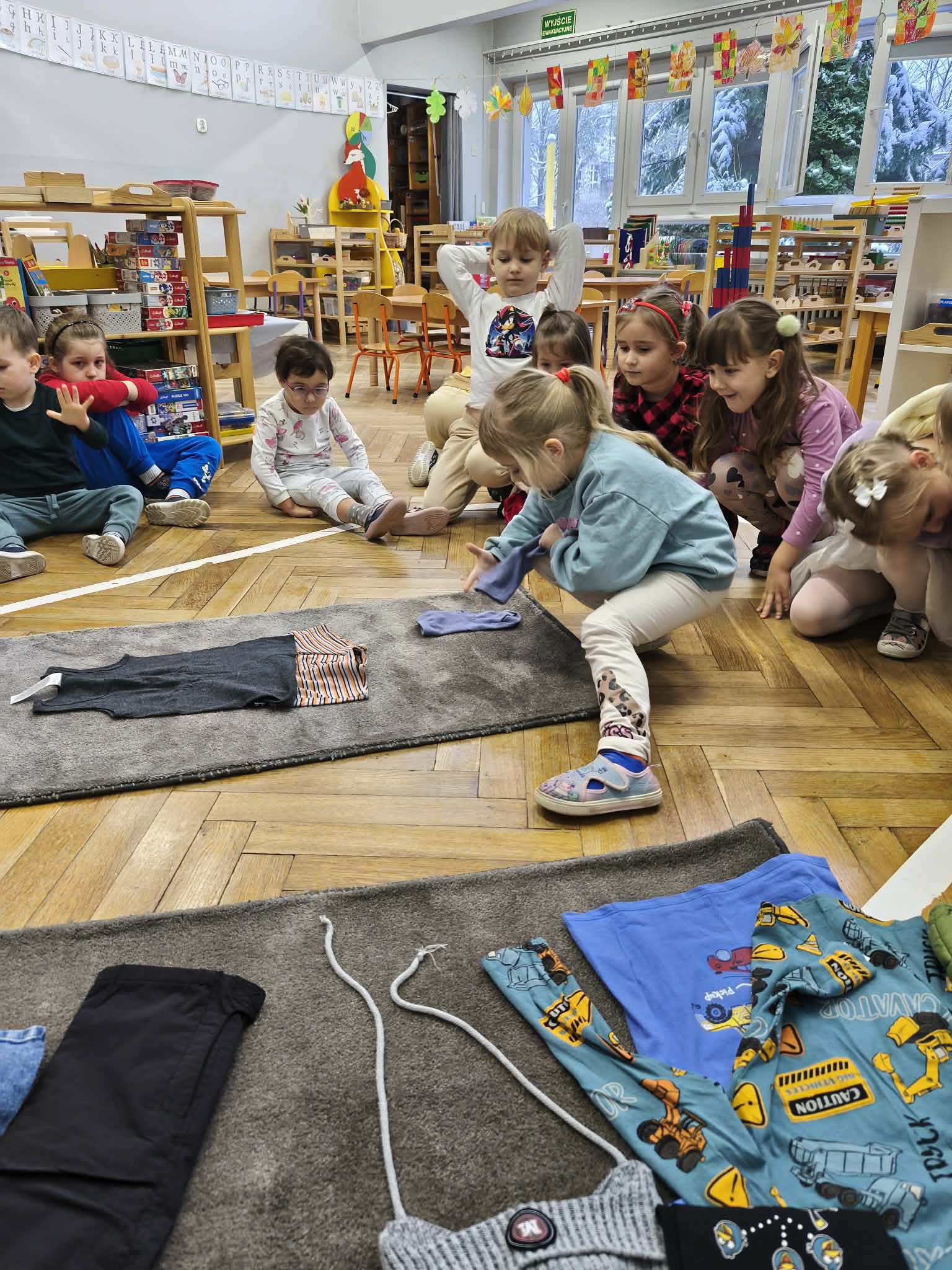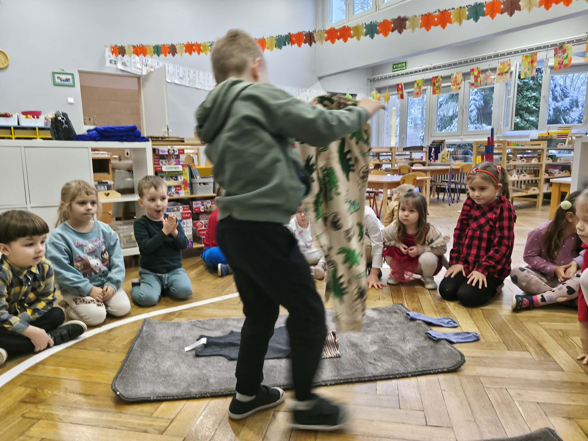 W piątek udało nam się ubrać naszego niewidzialnego gościa - Tadka. Nazywaliśmy poszczególne części garderoby, ćwiczyliśmy przy tym podział wyrazów na sylaby i głoski.