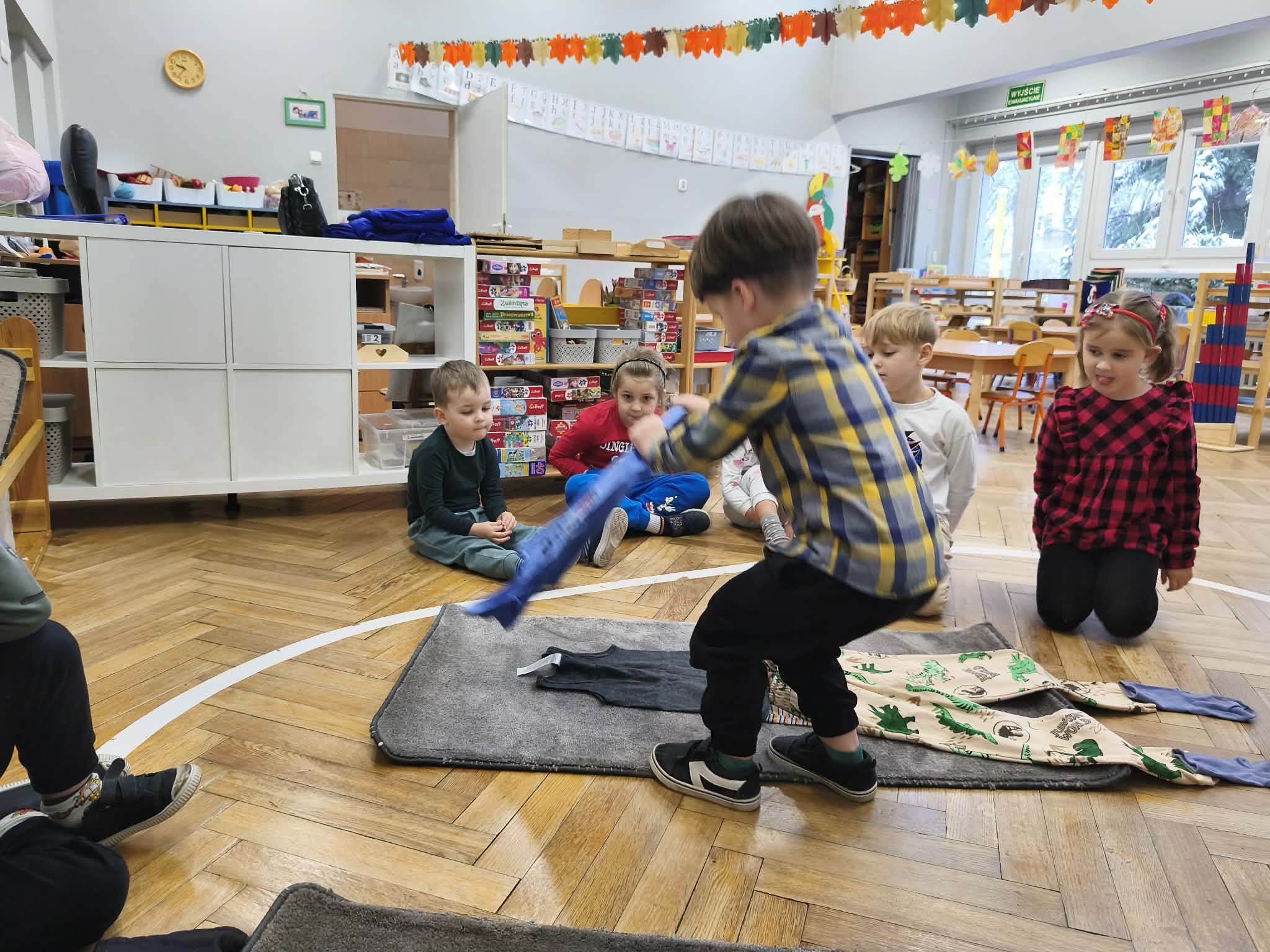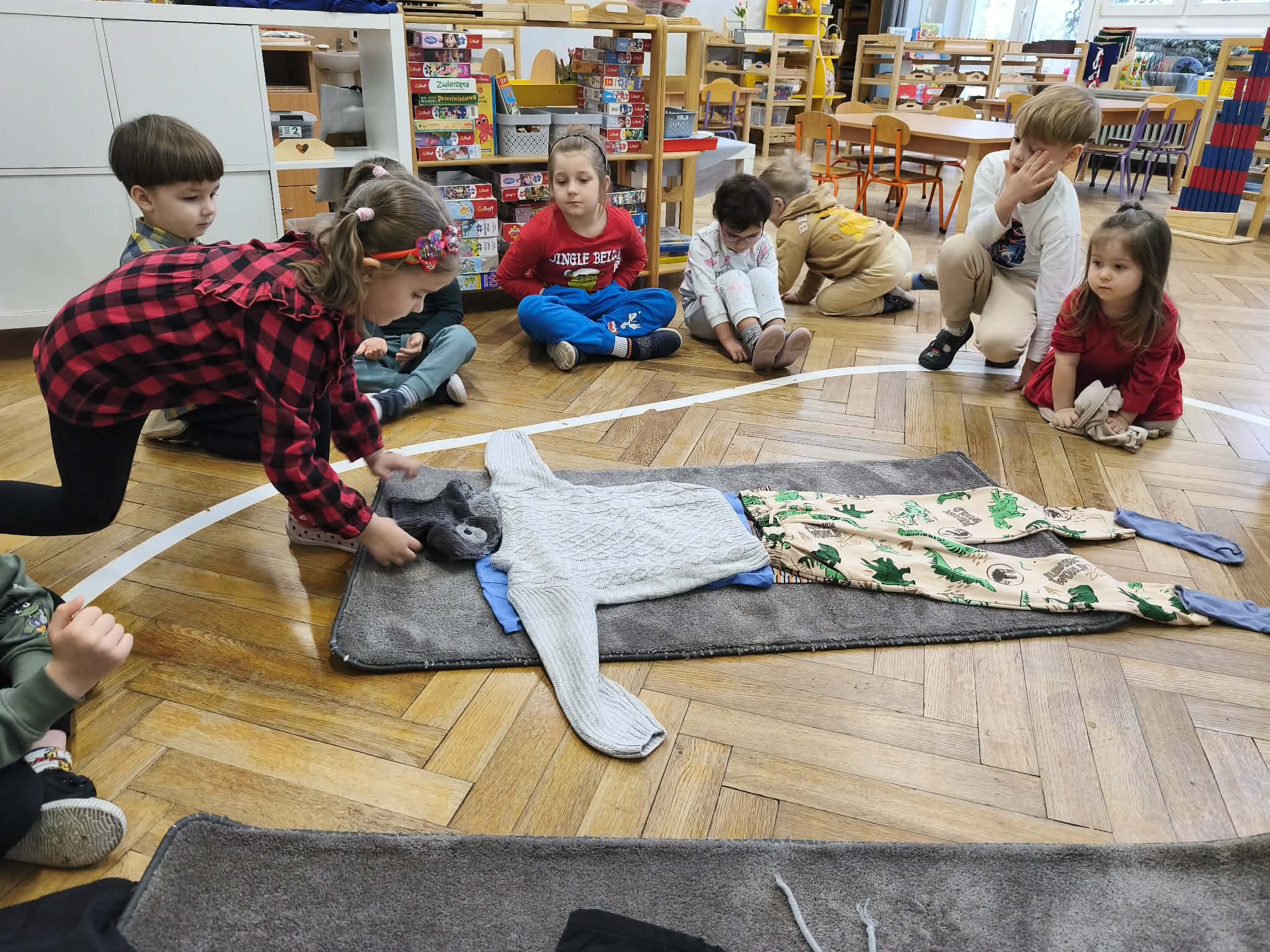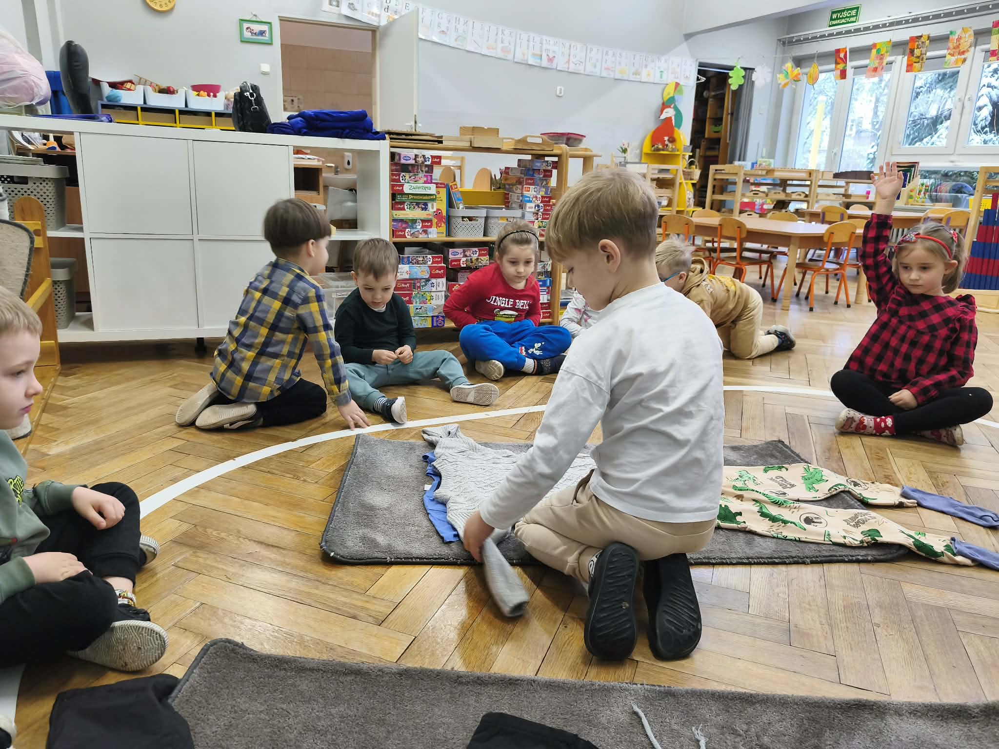 W piątek udało nam się ubrać naszego niewidzialnego gościa - Tadka. Nazywaliśmy poszczególne części garderoby, ćwiczyliśmy przy tym podział wyrazów na sylaby i głoski.